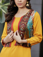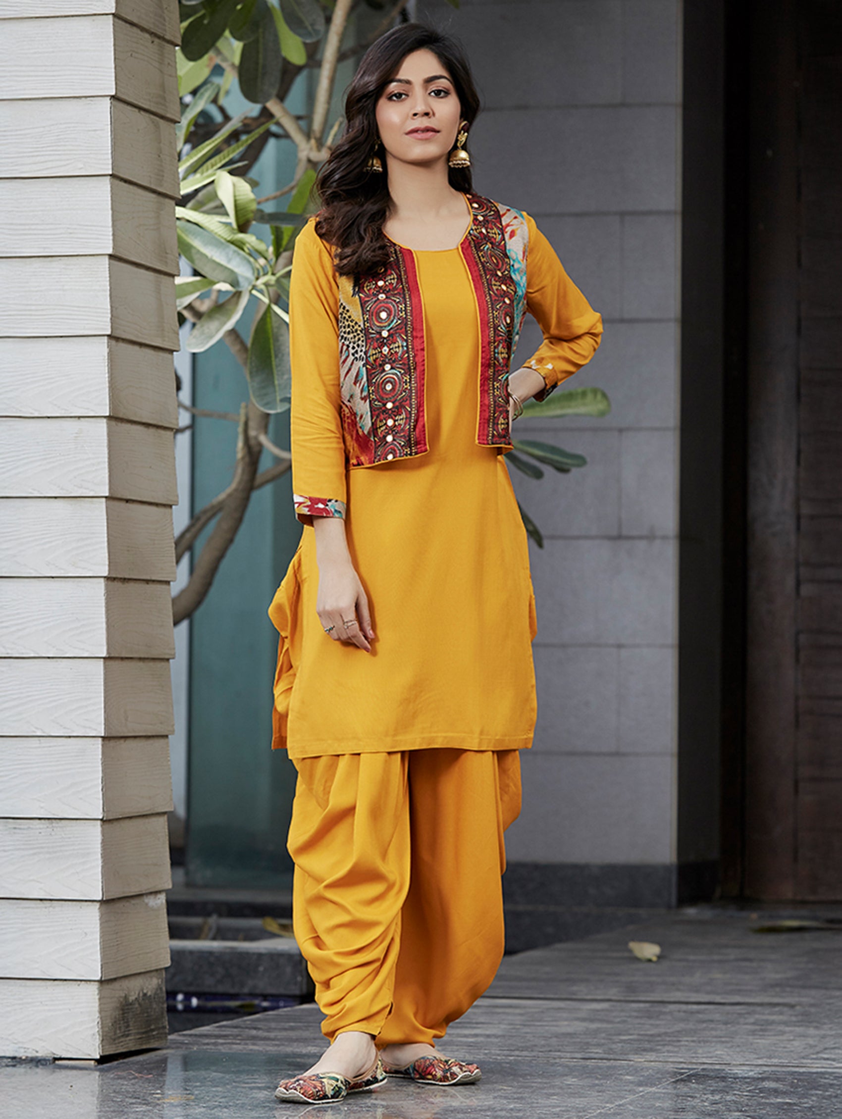 Make a bold ethnic statement with this Mustard Printed Jacket Style Kurta Set, a perfect blend of traditional elegance and contemporary fusion wear. Crafted in liva-certified viscose rayon, the set features a solid short kurta, paired with comfort-fit dhoti styled pants and finished with a contrast multicolour printed short jacket that instantly elevates the look.
