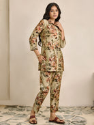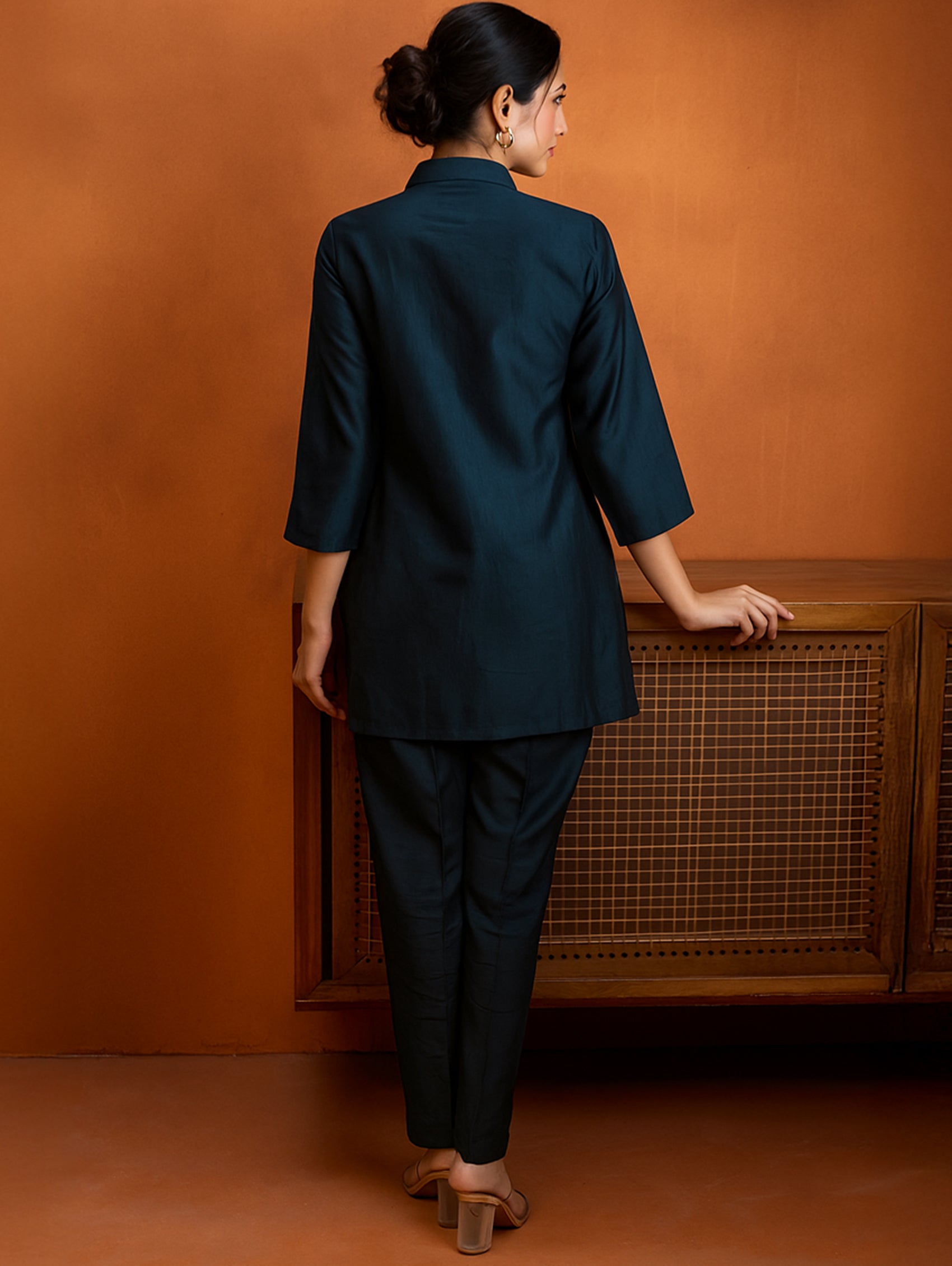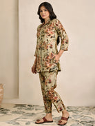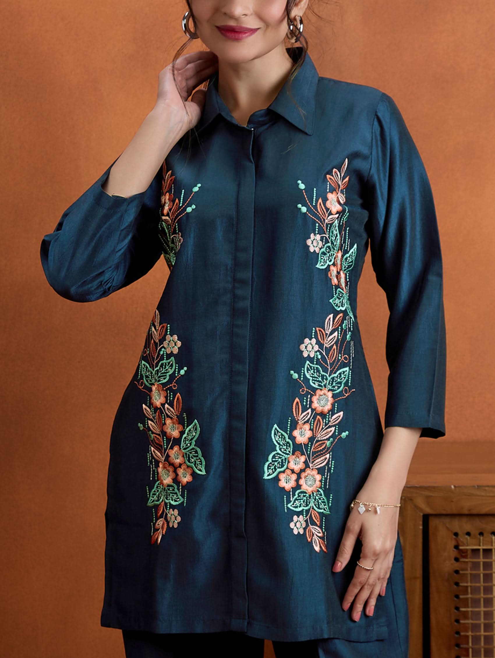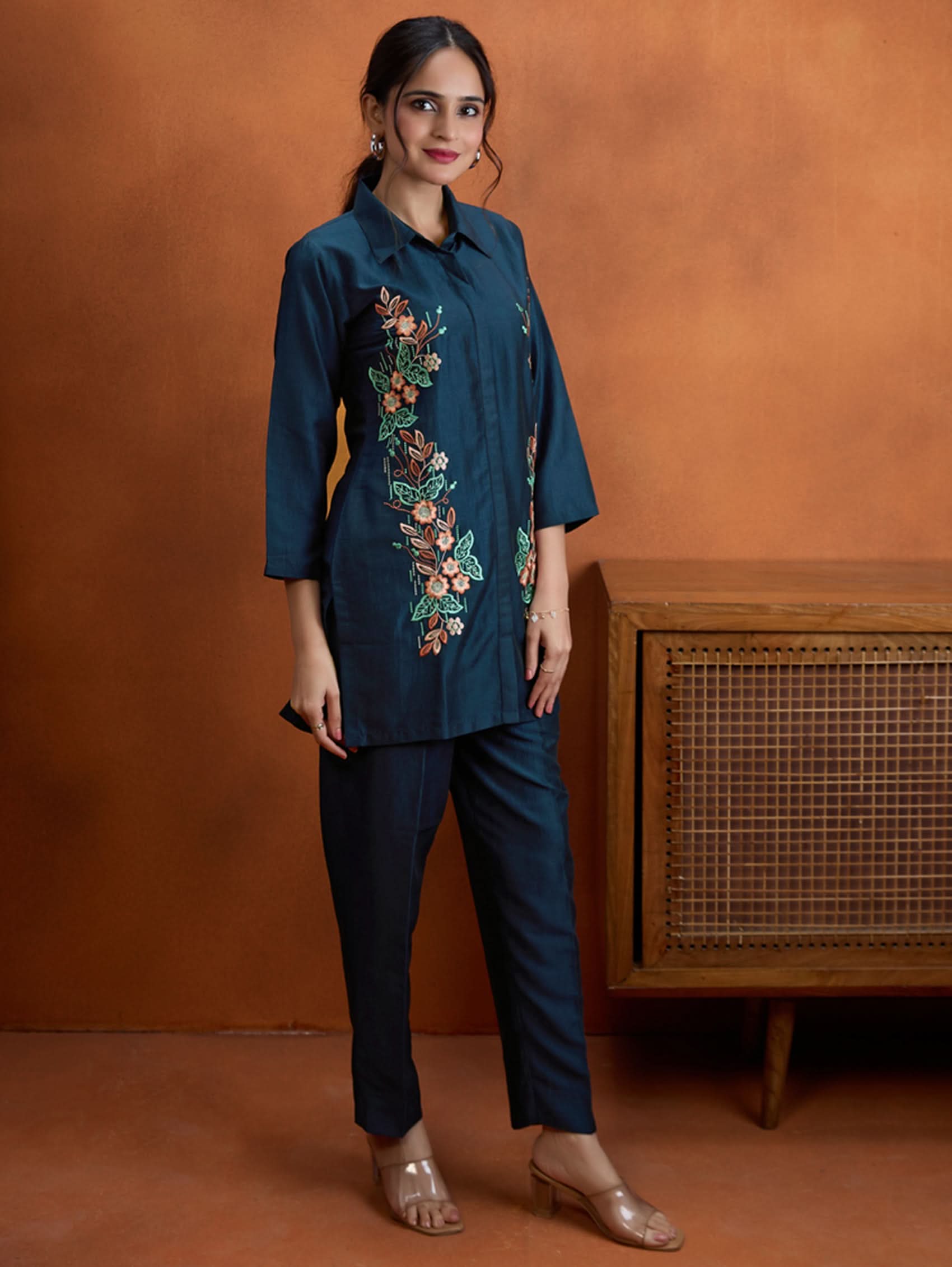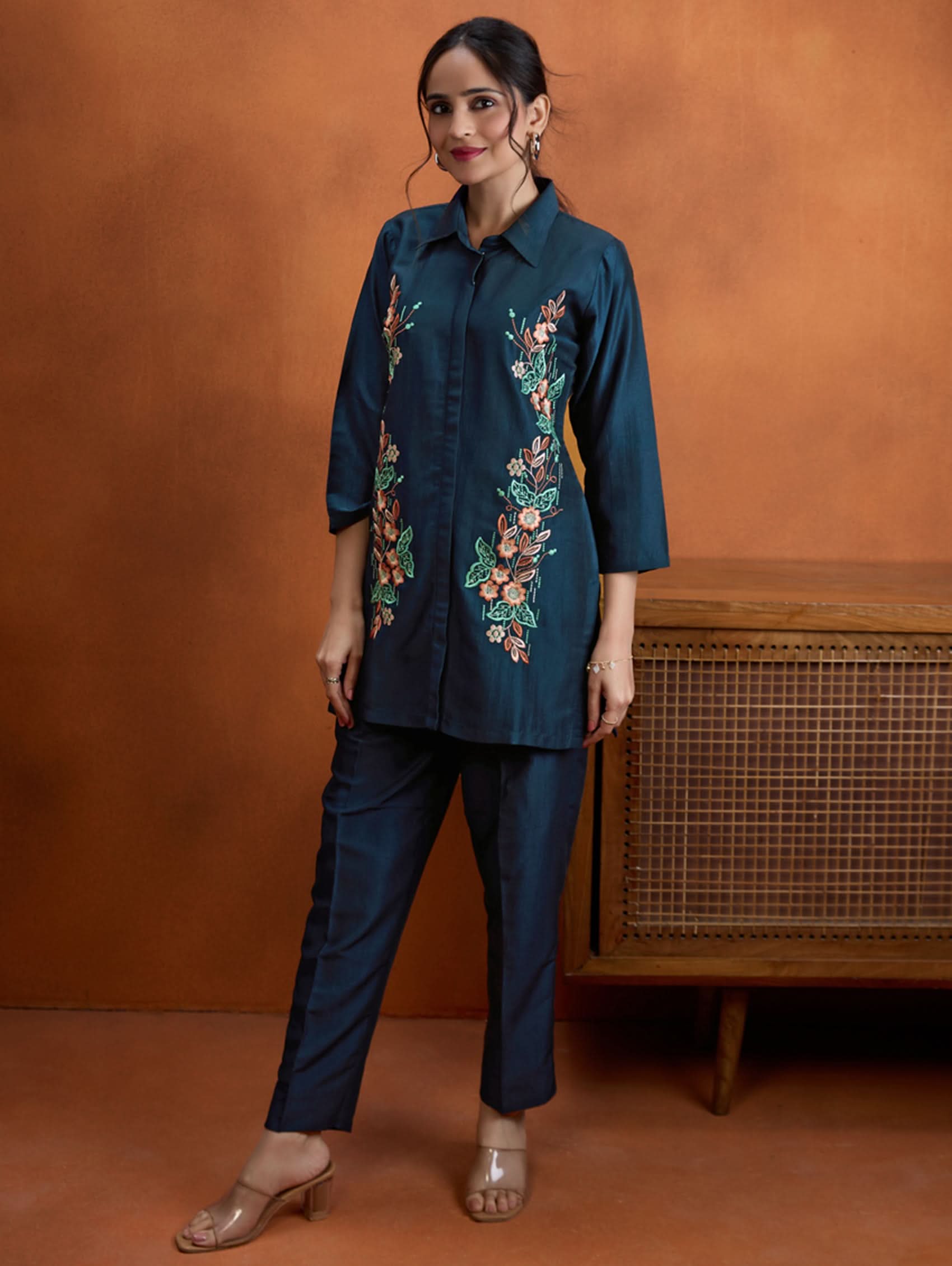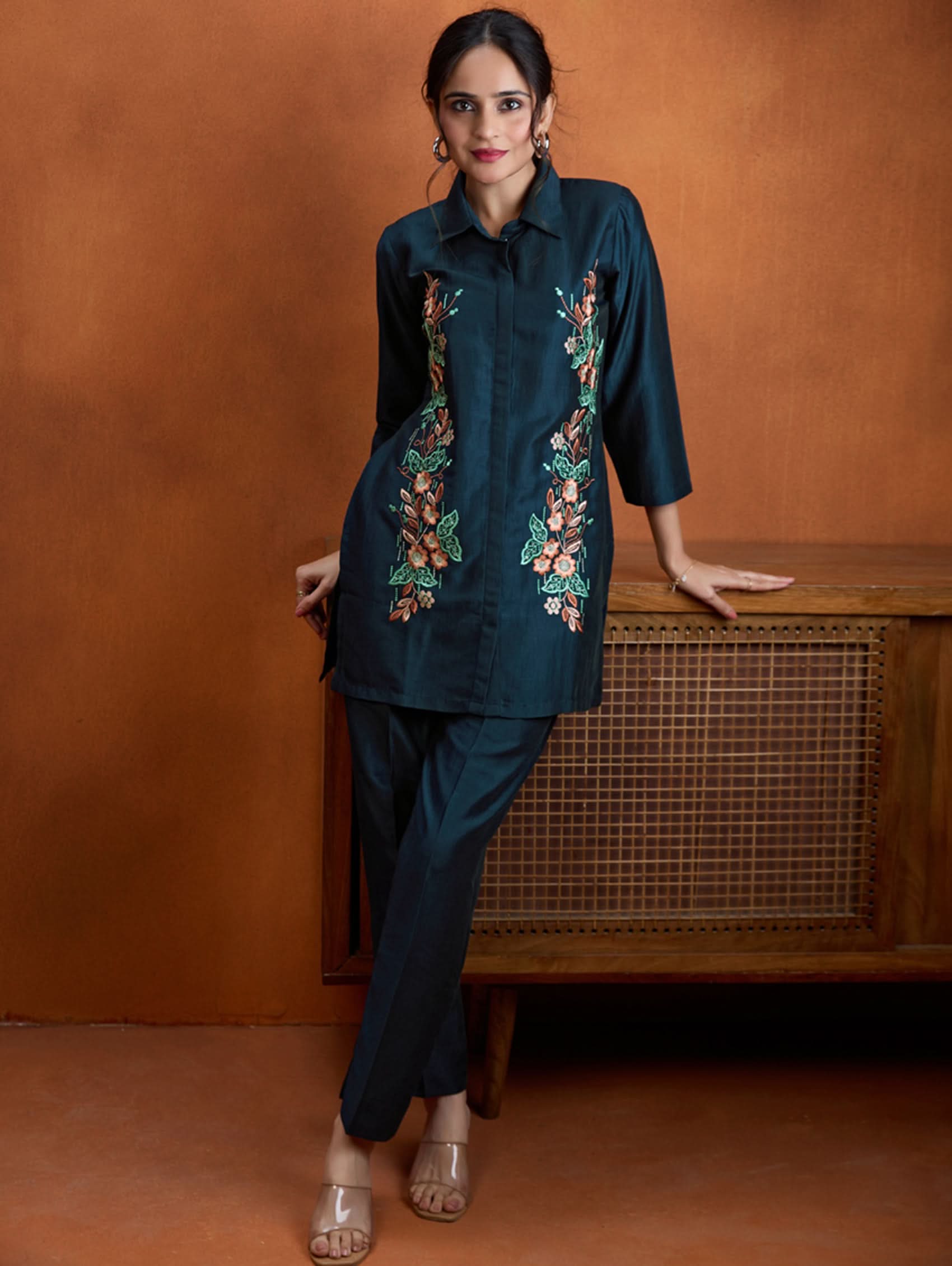 Enhance your wardrobe with this digitally printed shimmer silk co-ord set that blends style and comfort. The set features a short kurti with a revere collar and three-quarter sleeves, highlighted by delicate hand-embroidered buttons. It pairs perfectly with regular pants designed for comfort, including a partially elasticated waistband and spacious pockets. Whether for casual gatherings or festive occasions, this ensemble brings effortless elegance and versatility to your look.