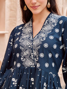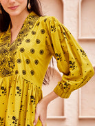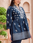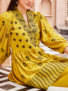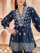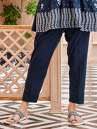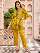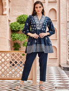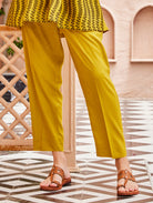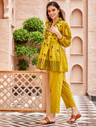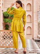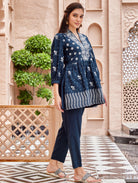 Our ethnic co-ord set features a flared short kurti with a V-neckline, three-quarter sleeves, and regular solid-coloured pants with a partially elasticated waistband and roomy pockets. This comfortable style is ideal for effortless everyday wear.