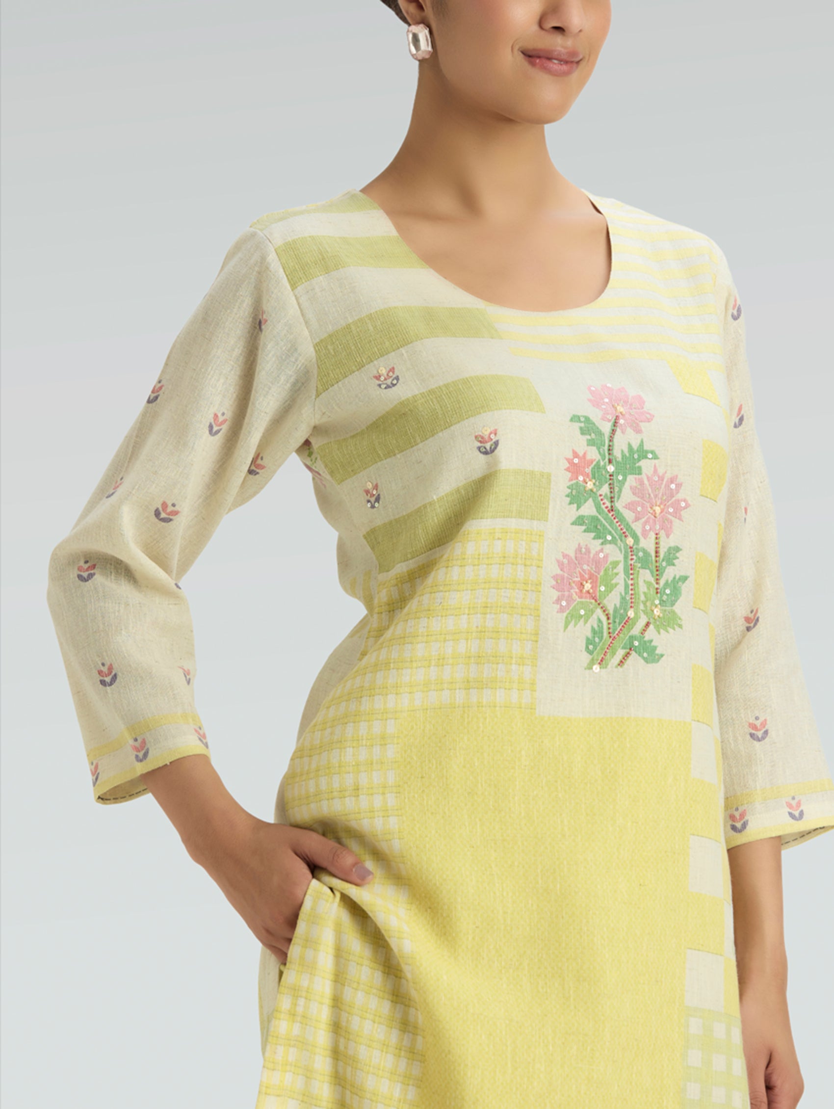 • Kurta with round-neckline, three-fourth sleeves, and side slits open