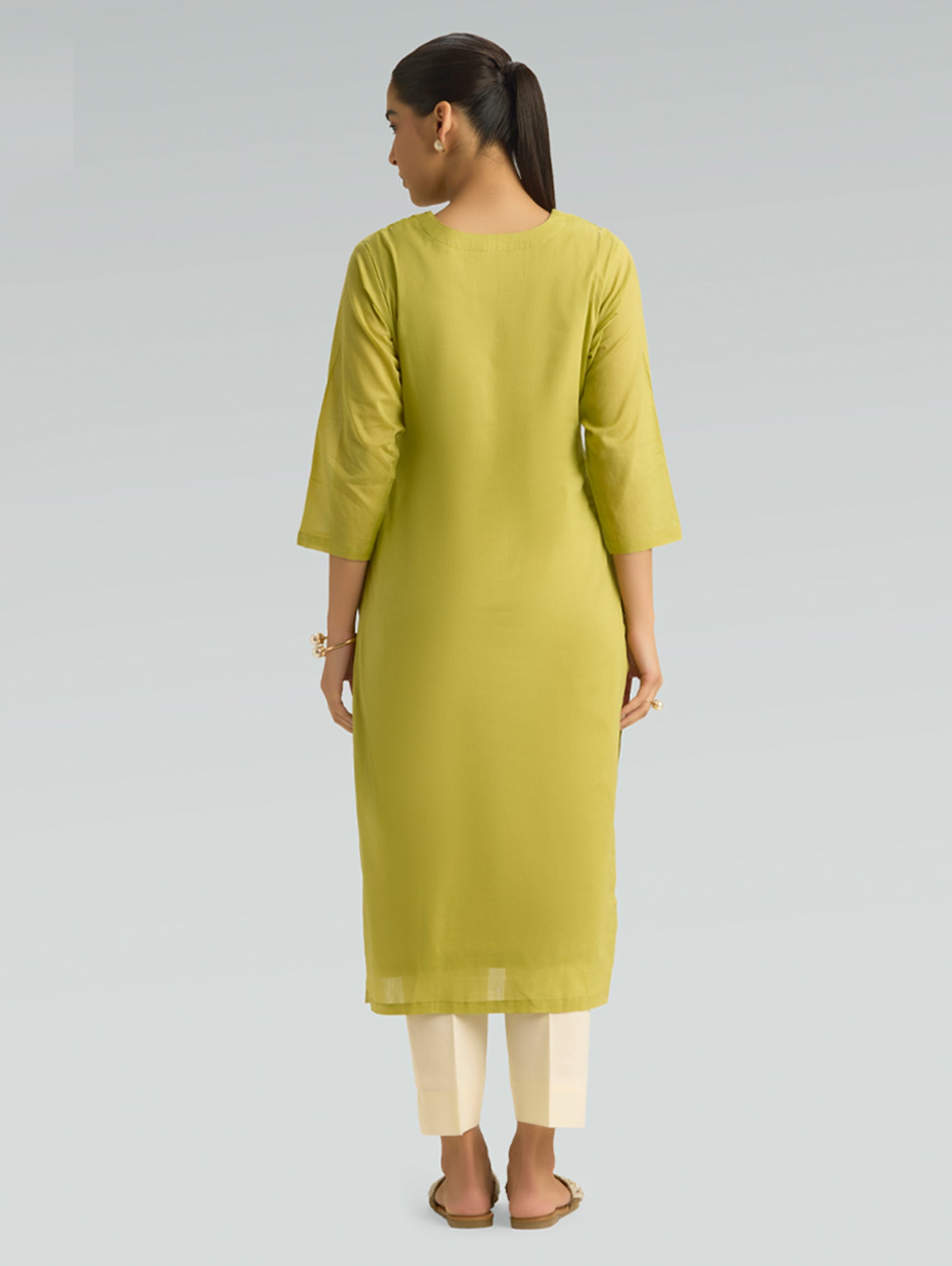 Discover timeless sophistication in this pure cotton mul kurta, designed for effortless everyday wear. Featuring intricate computerised thread embroidery at the notched round neckline, three-fourth sleeves, and practical side slits for enhanced mobility. The lightweight, breathable fabric ensures all-day comfort and coolness, while the thoughtful construction delivers a graceful, flattering fit. A versatile staple that seamlessly transitions from casual outings to relaxed gatherings.
