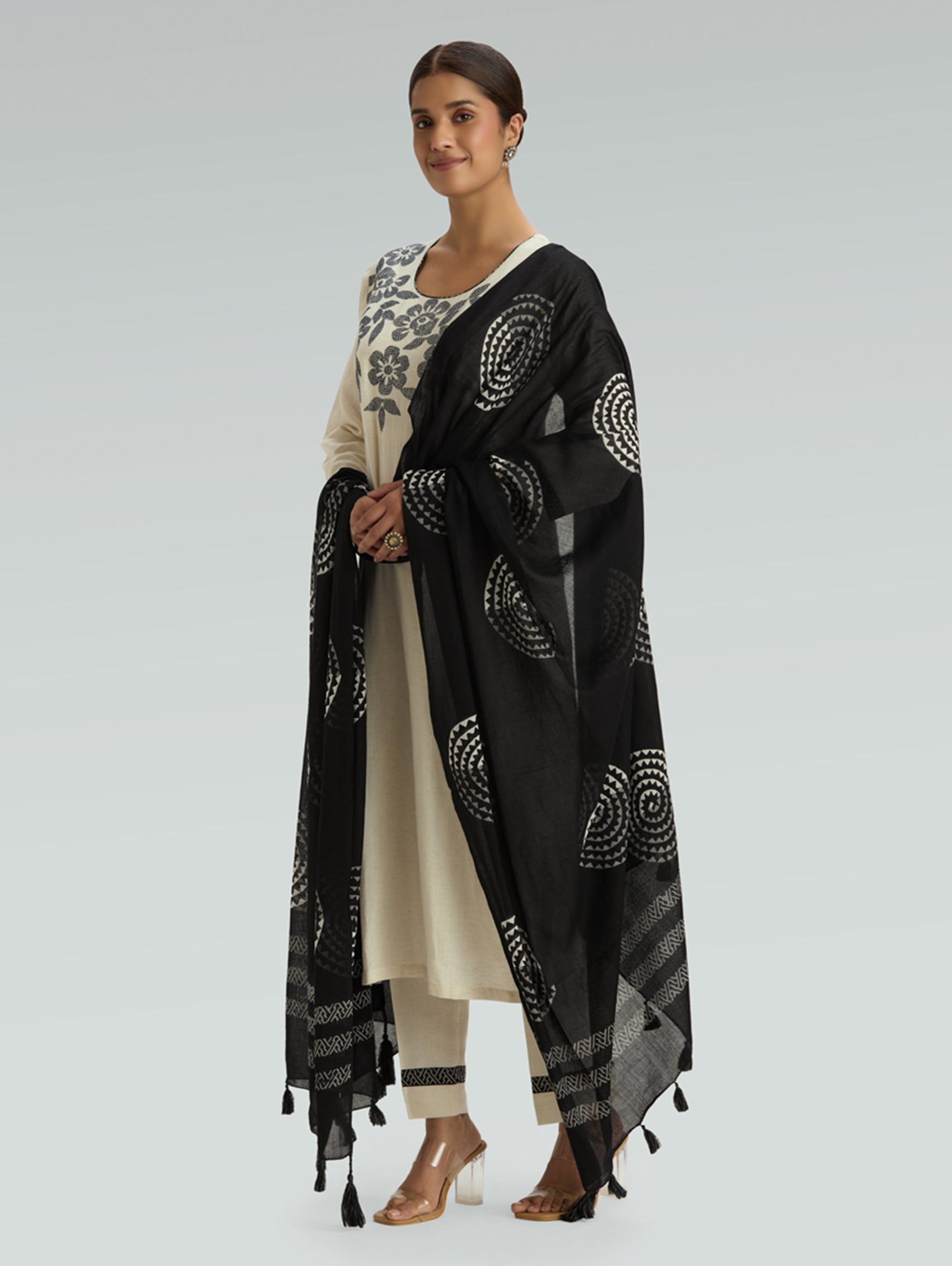Soft Beige Embellished Digitally Printed Cotton Flex Suit Set with Dupatta
