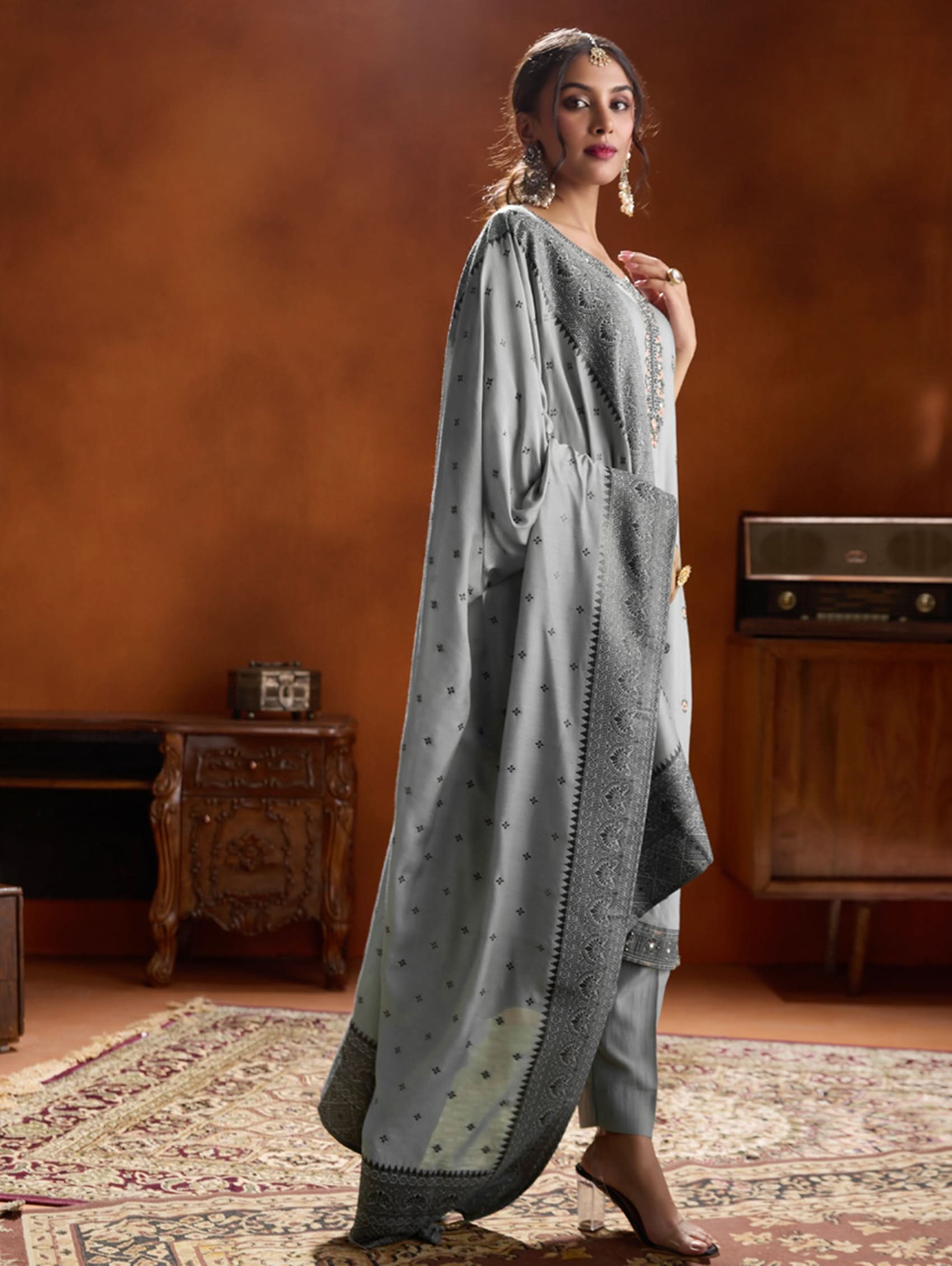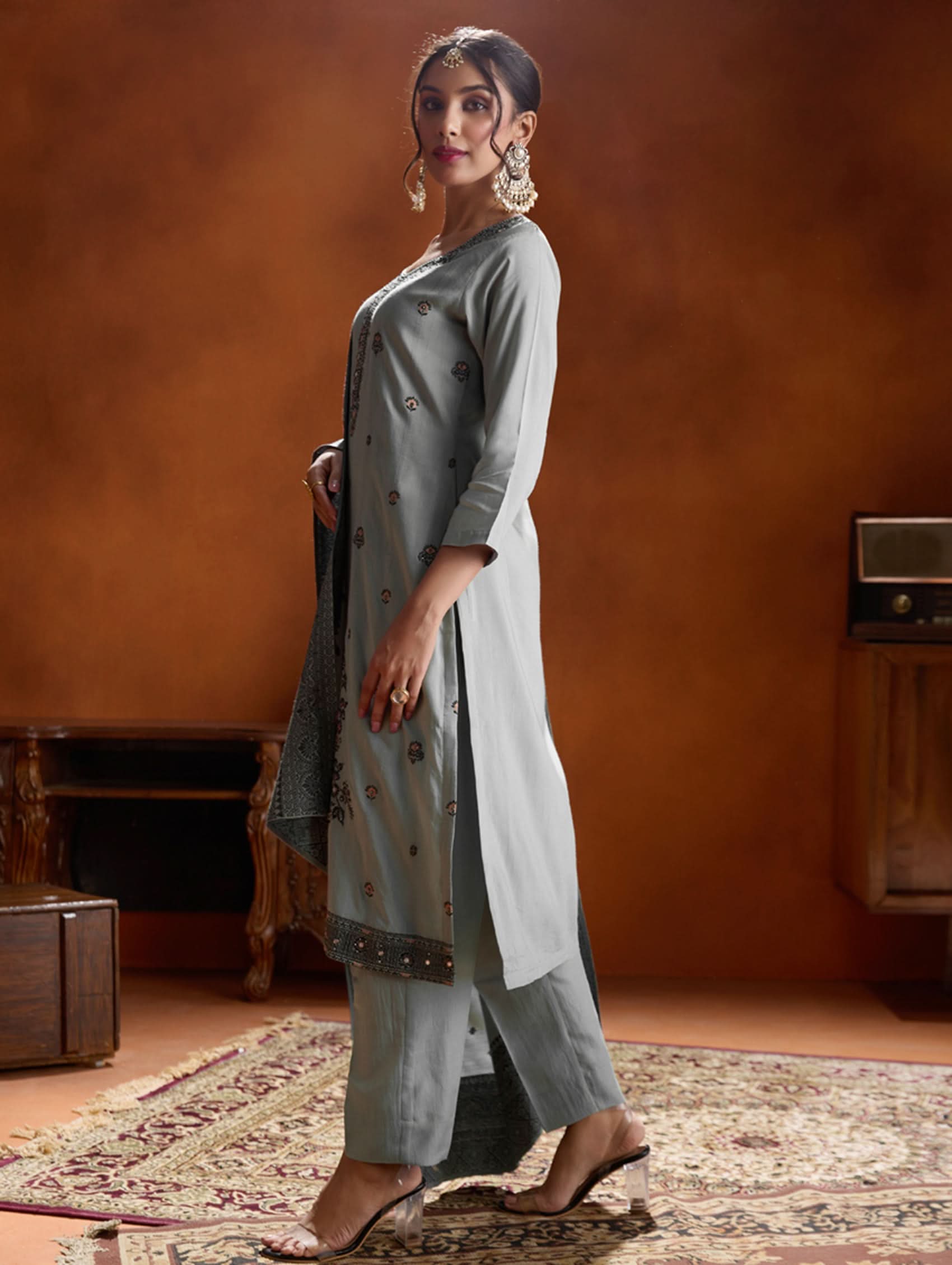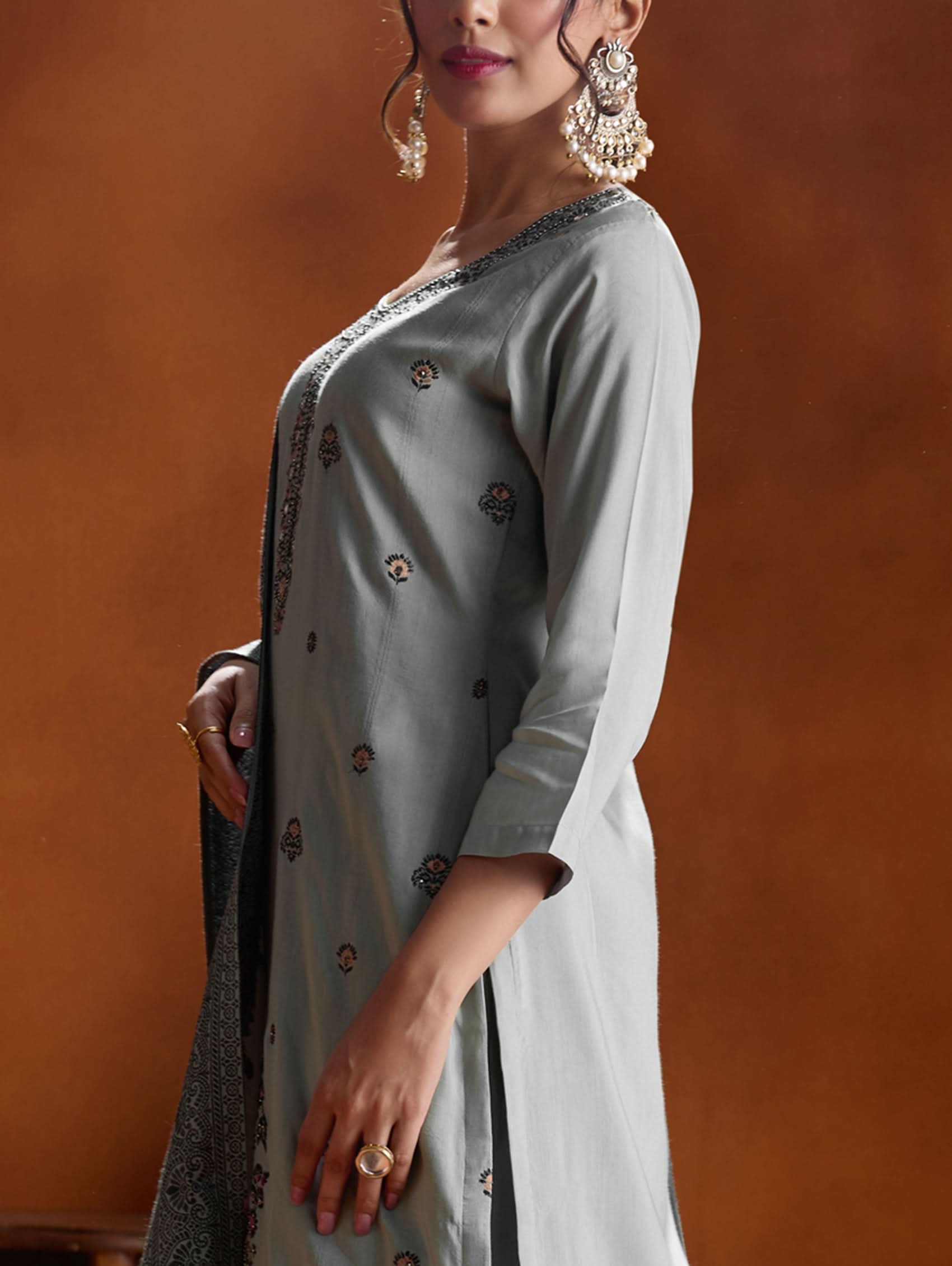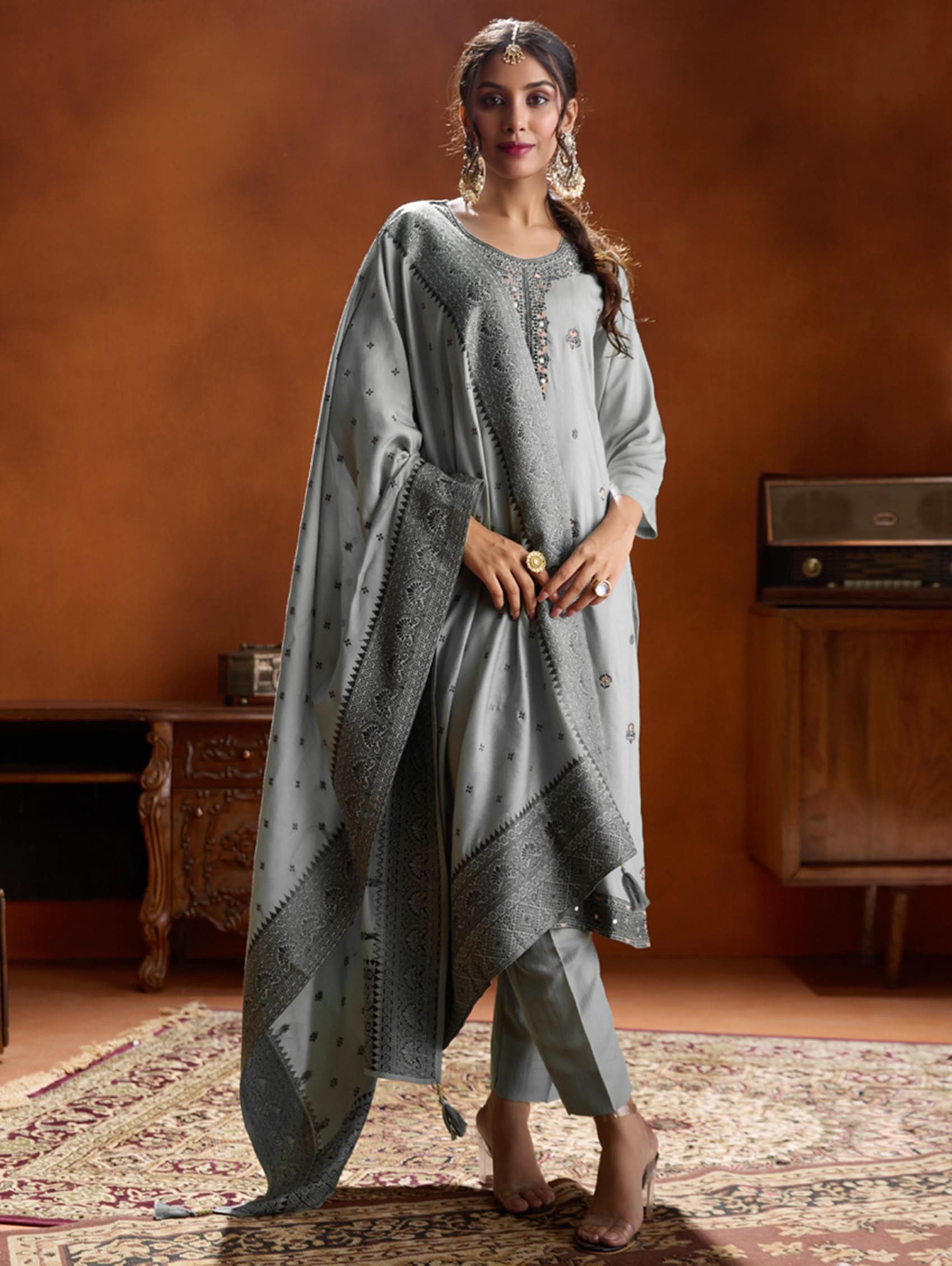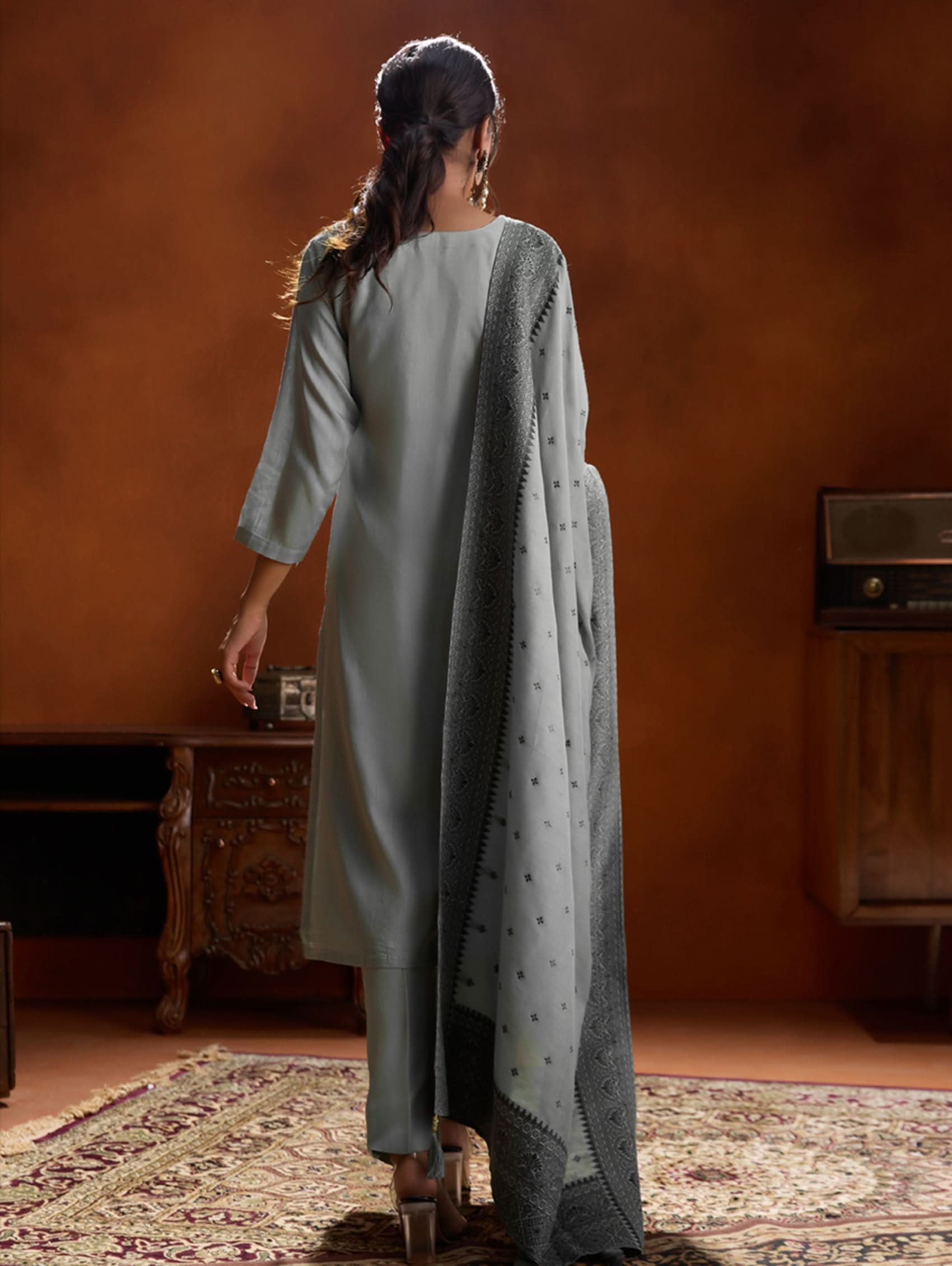A straight-fit suit set from our latest festive collection. The set combines a kurta in Silk, silk pants, and a jacquard weave dupatta. Kurta comes accentuated with computerised embroidery and hand embroidery.