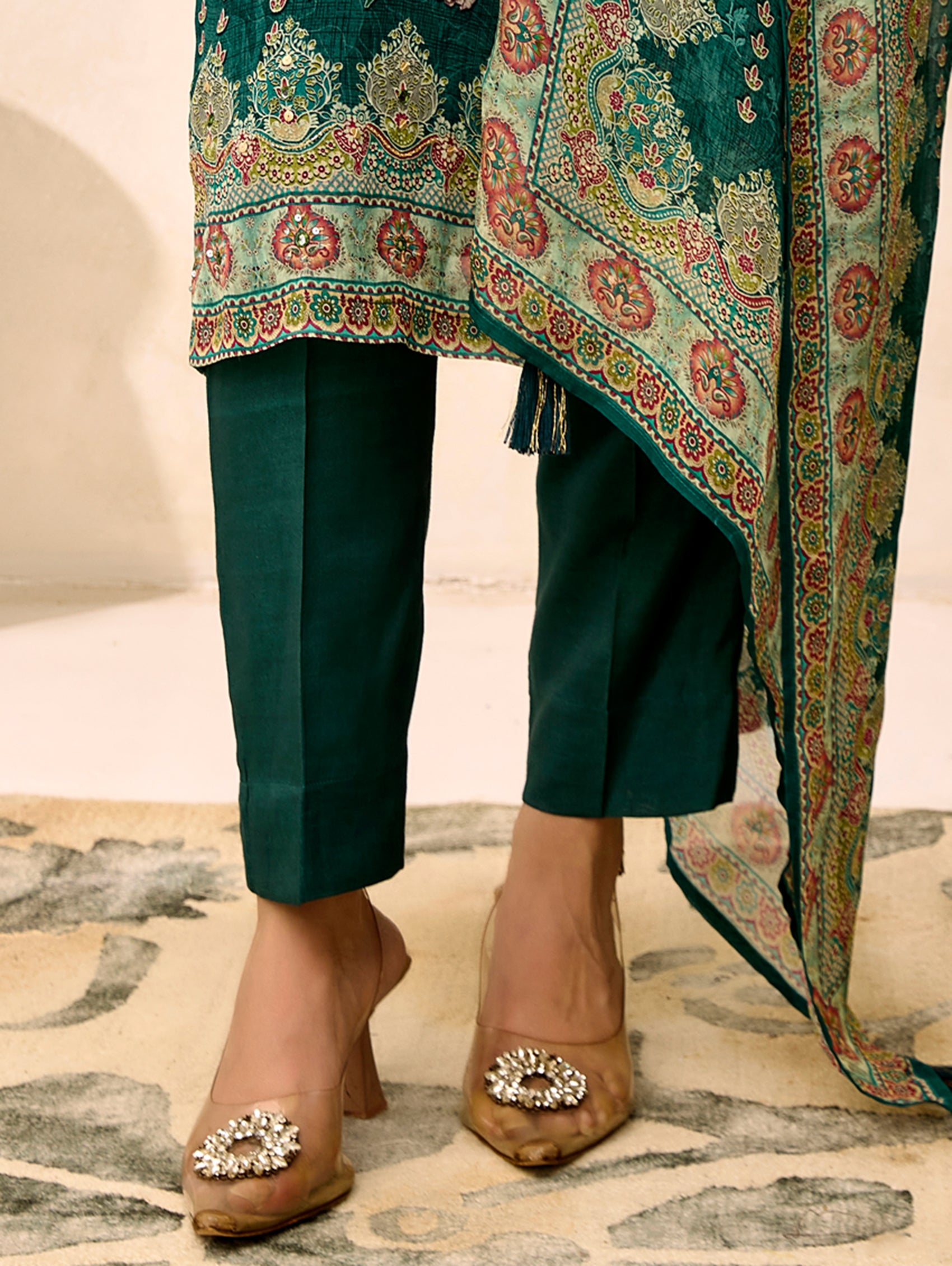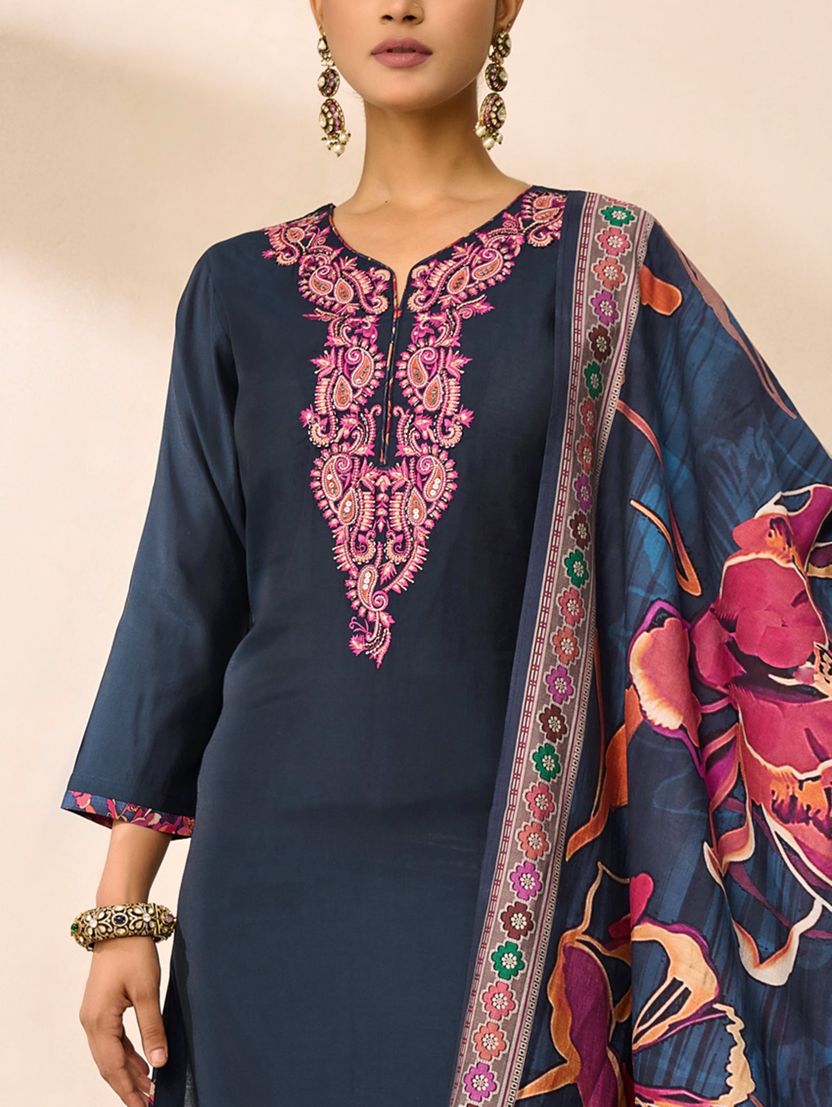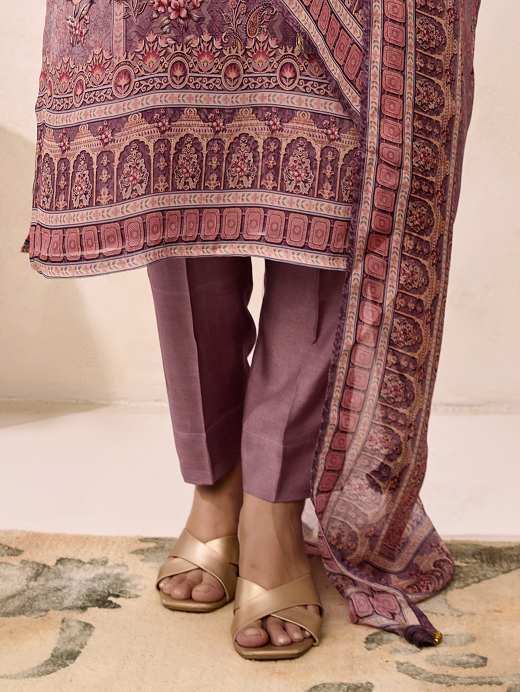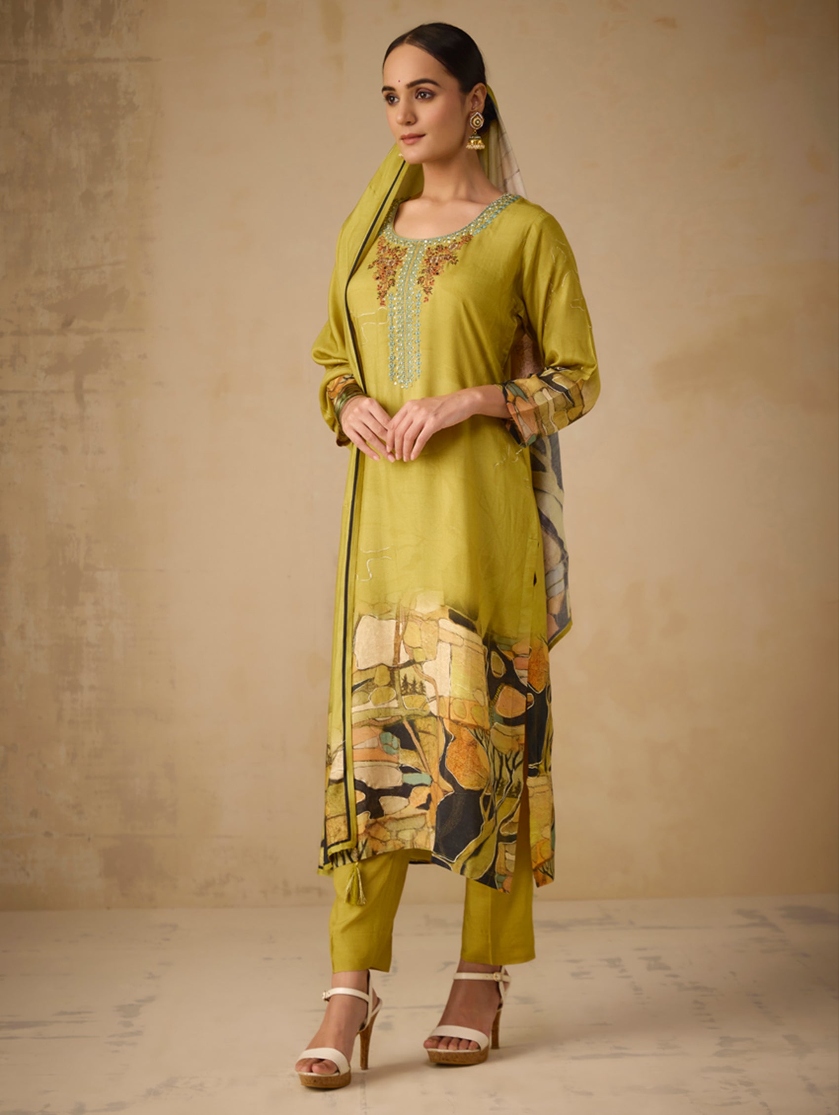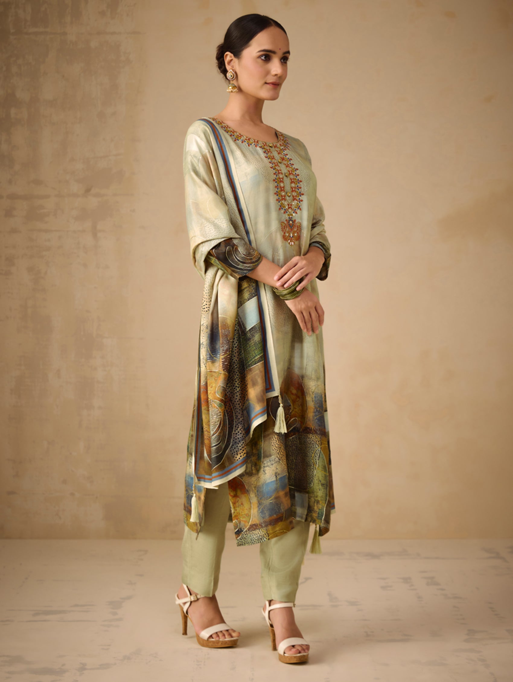 A straight-fit suit set from our latest collection. The set combines a digitally printed silk kurta with computerized thread embroidery, hand embroidery, straight pants, and a digitally printed silk dupatta.