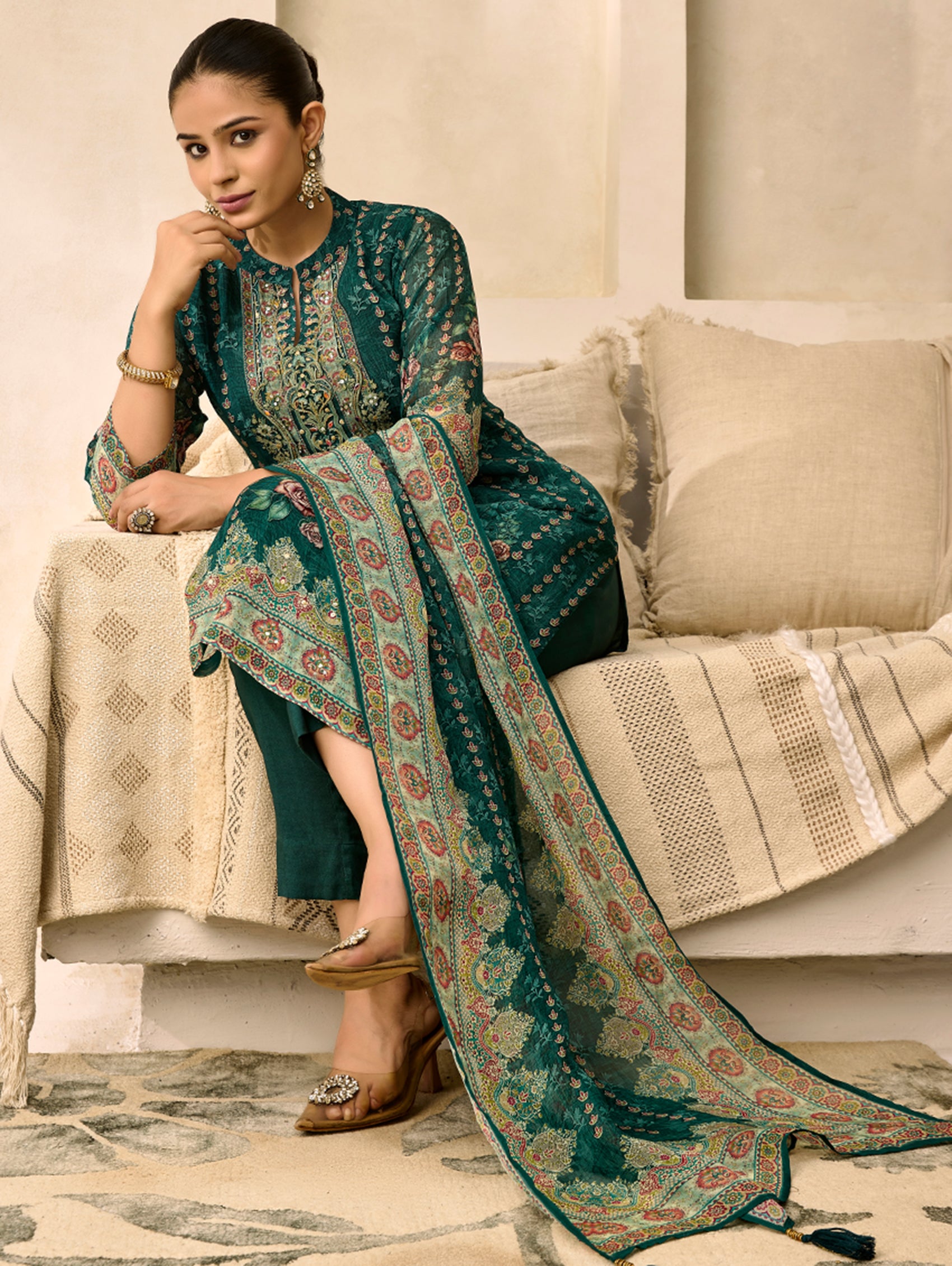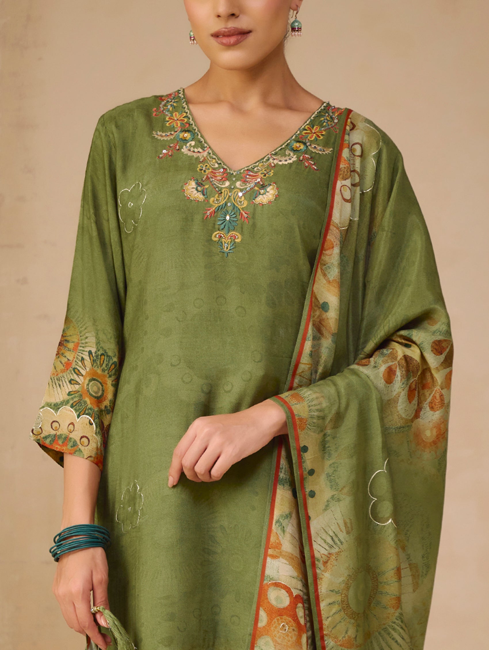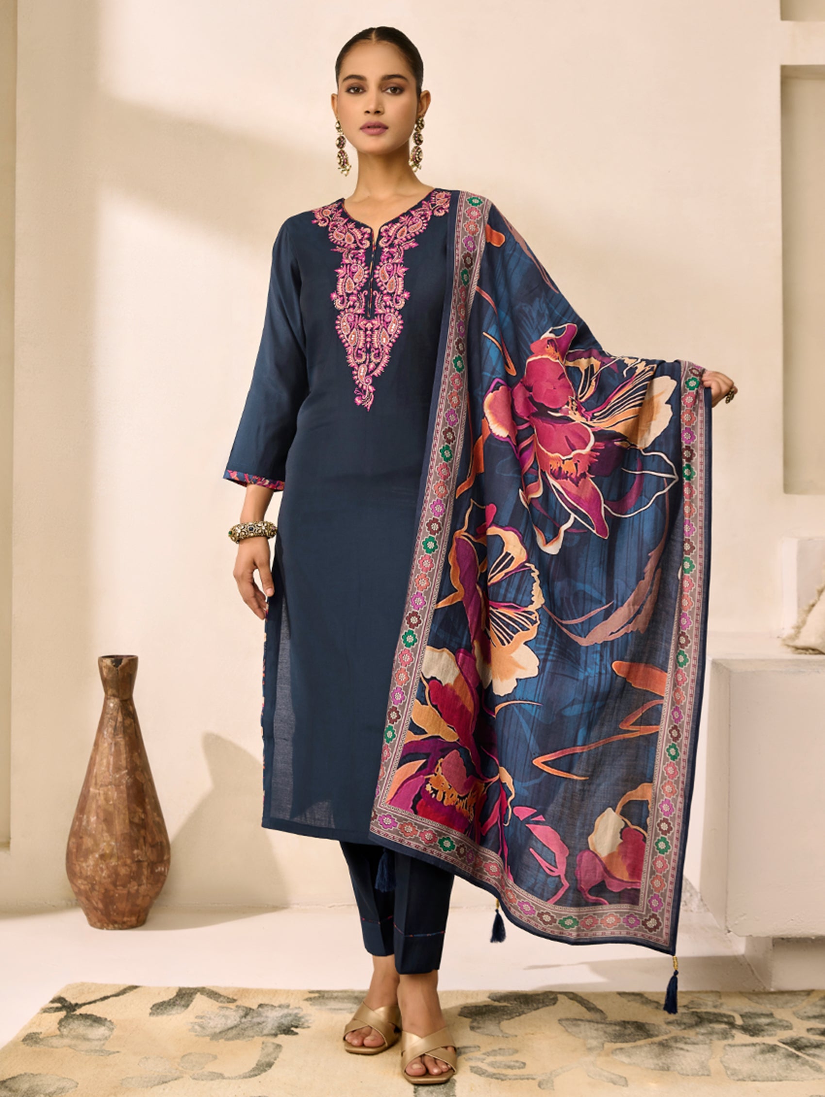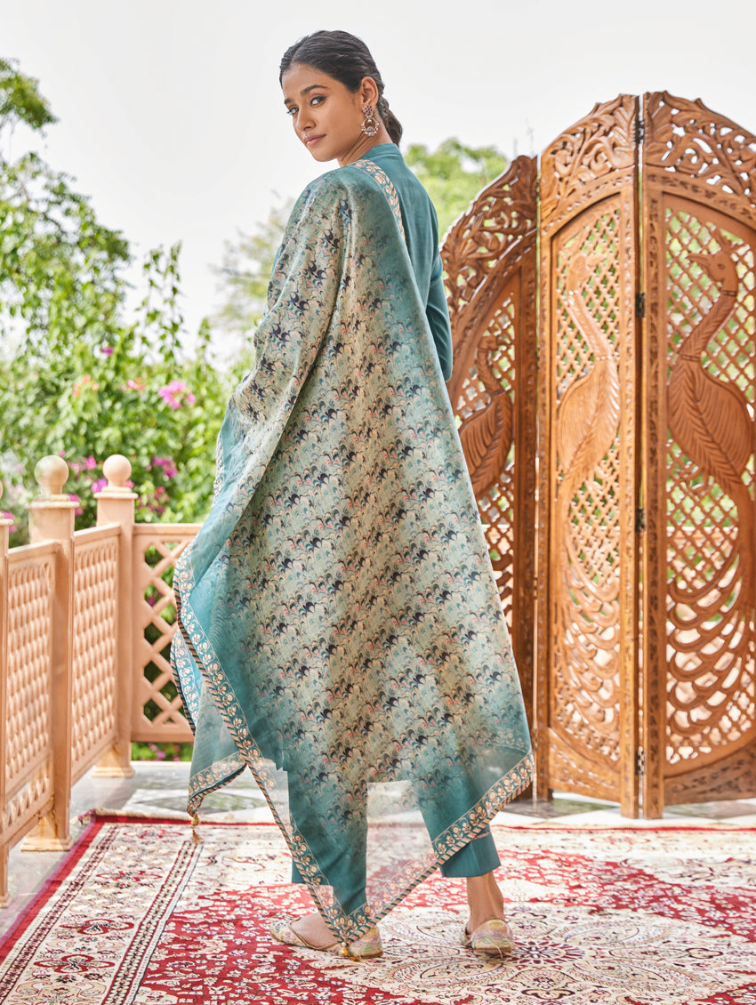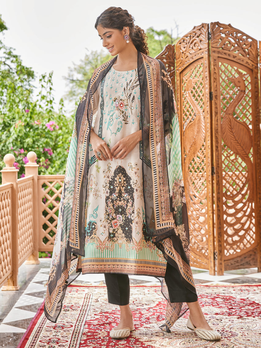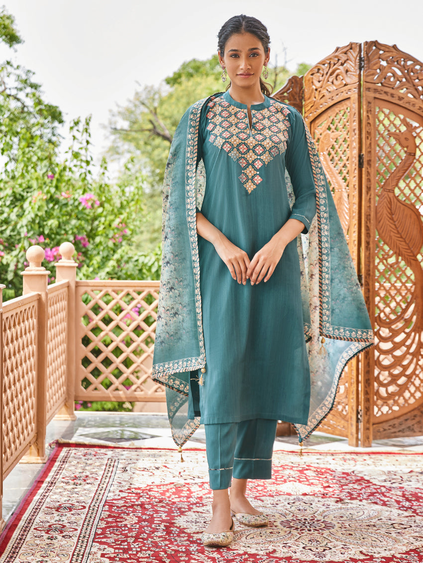 A straight-fit suit set from our latest collection. The set combines a digitally printed silk kurta with computerized thread embroidery, hand embroidery, straight pants, and a digitally printed silk dupatta.
