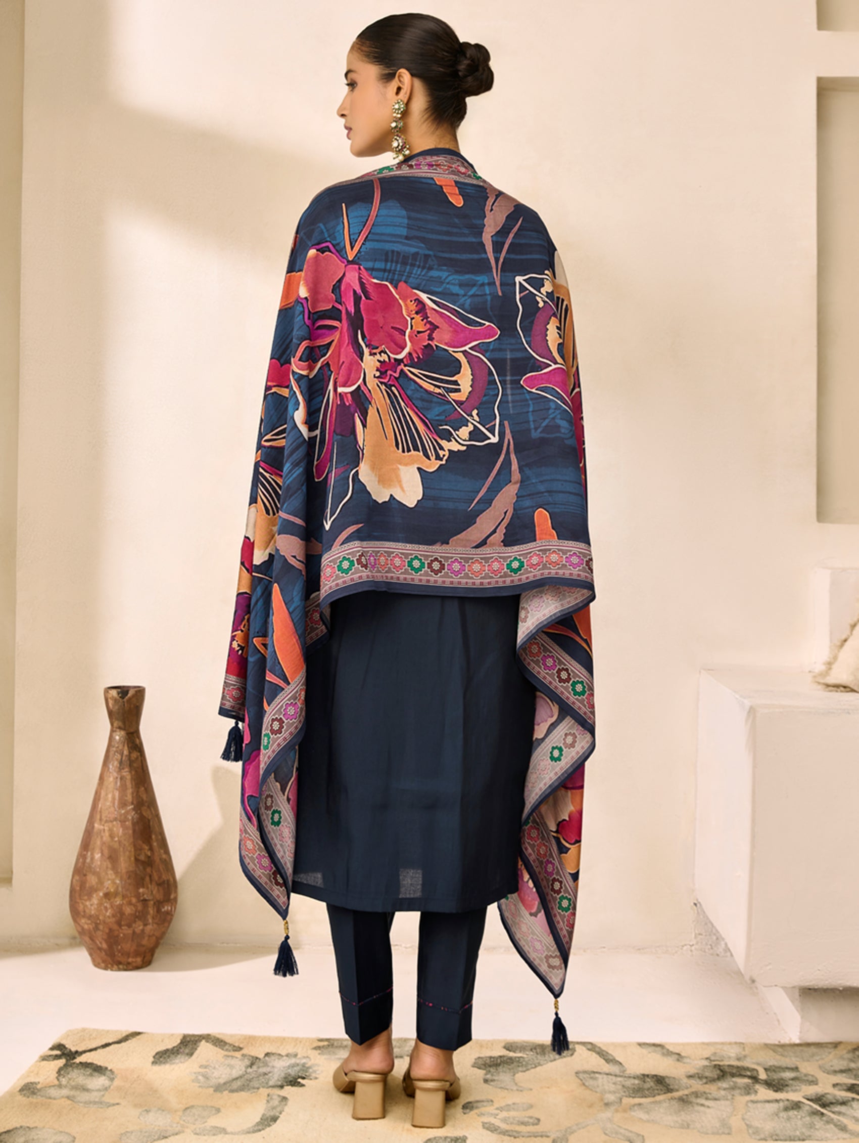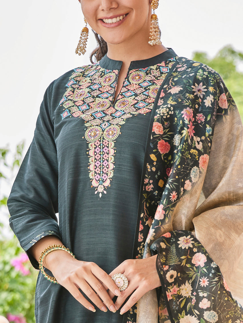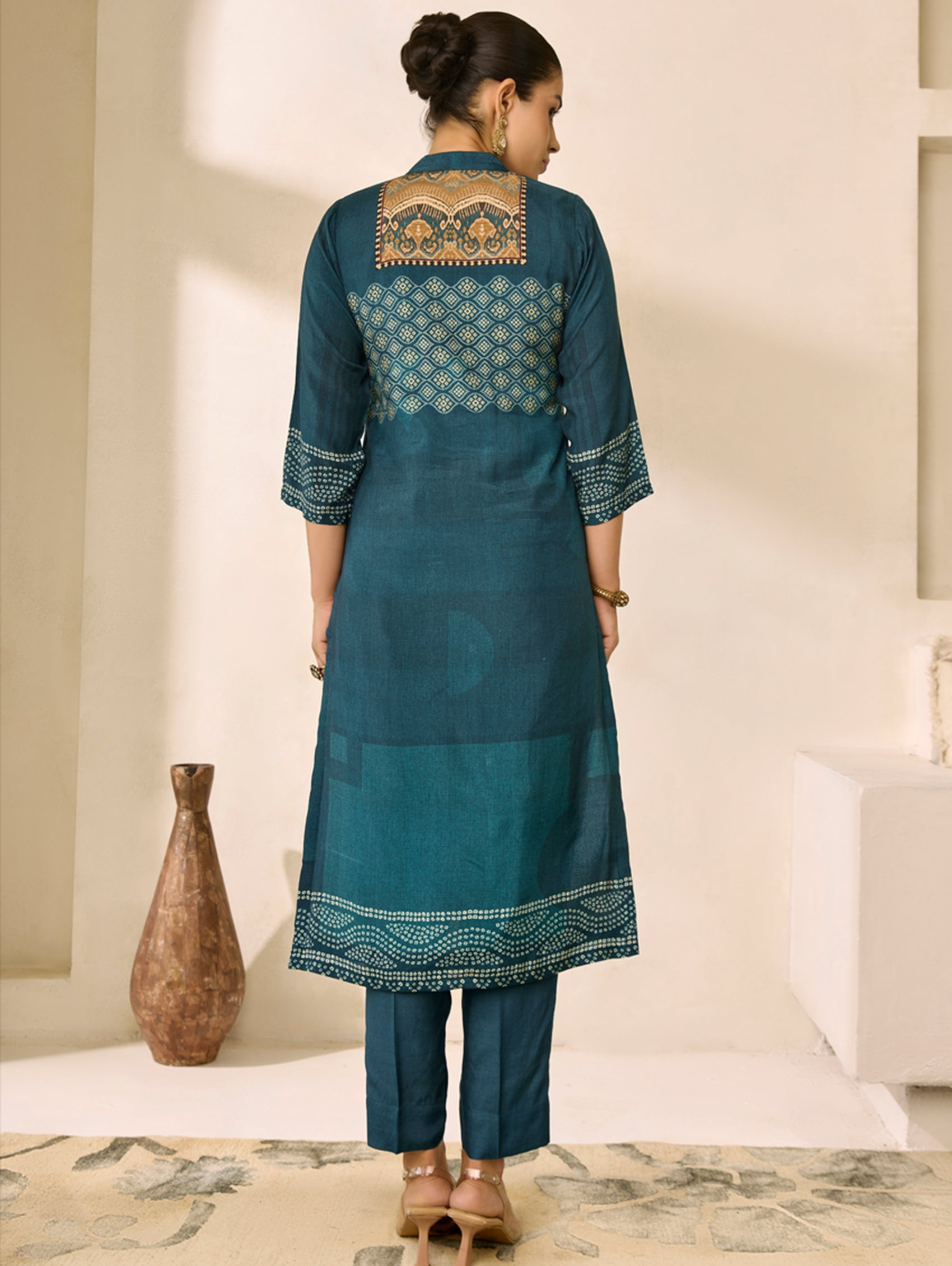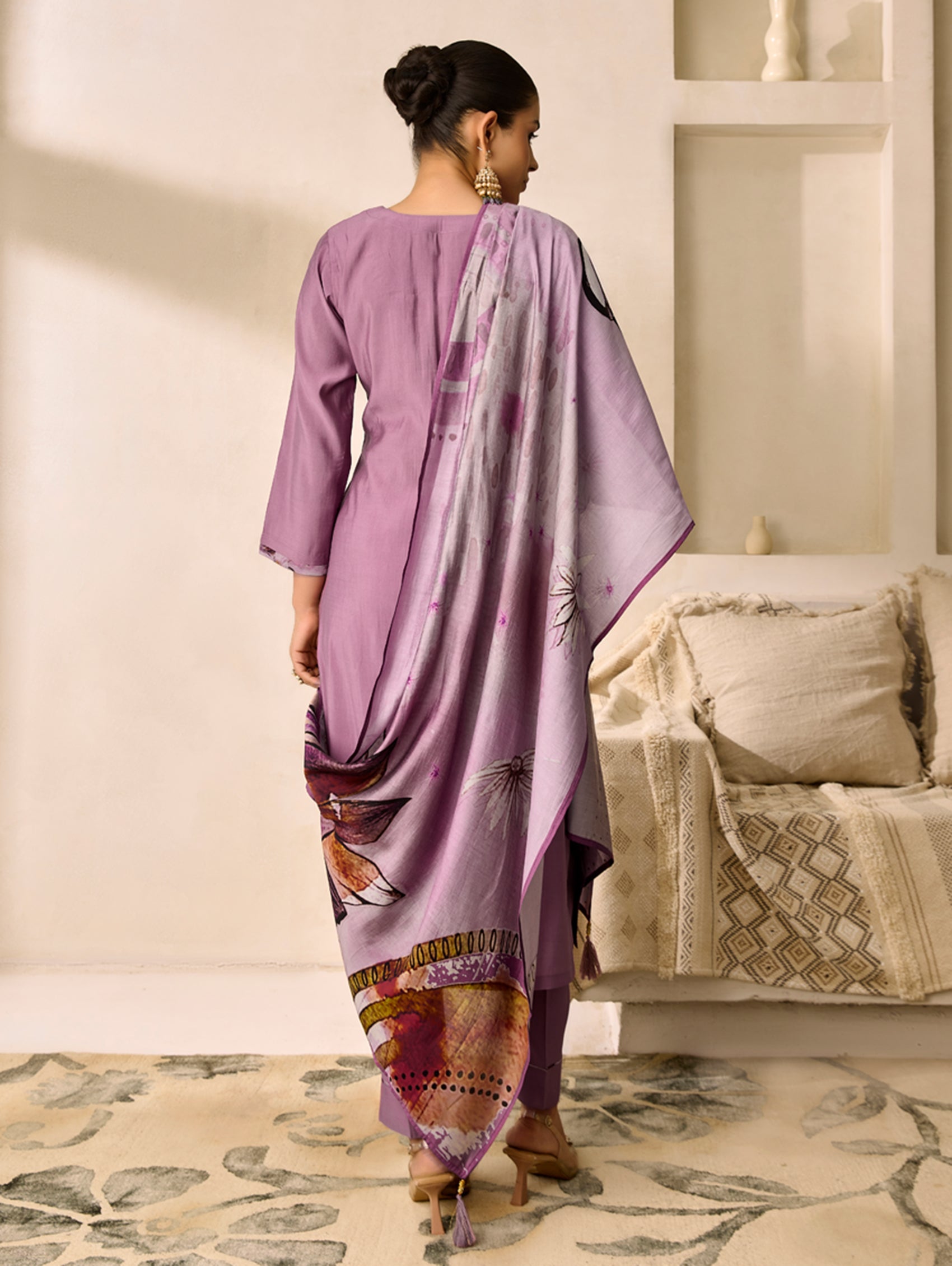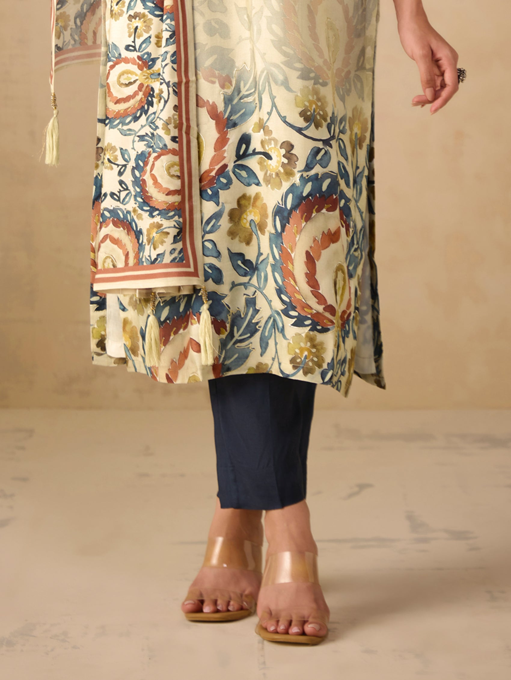 A straight-fit suit set from our latest collection. The set combines a digitally printed silk kurta with computerized thread embroidery, hand embroidery, straight pants, and a digitally printed silk dupatta.