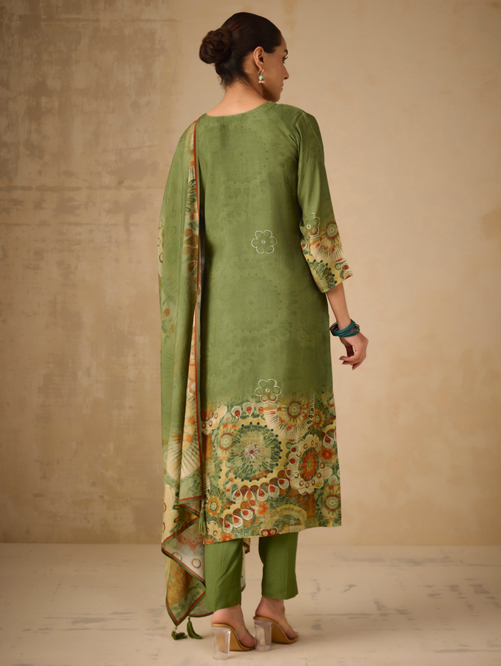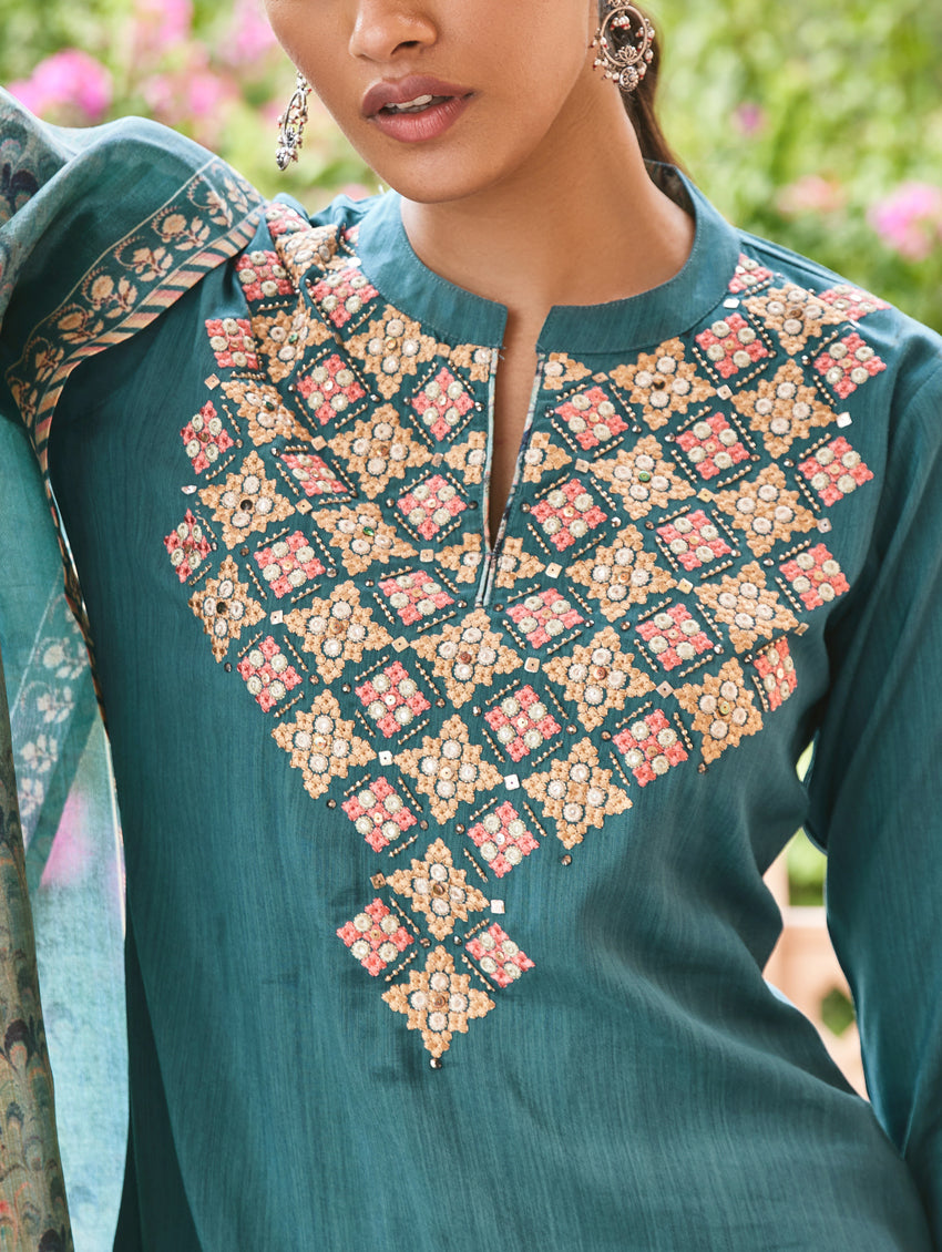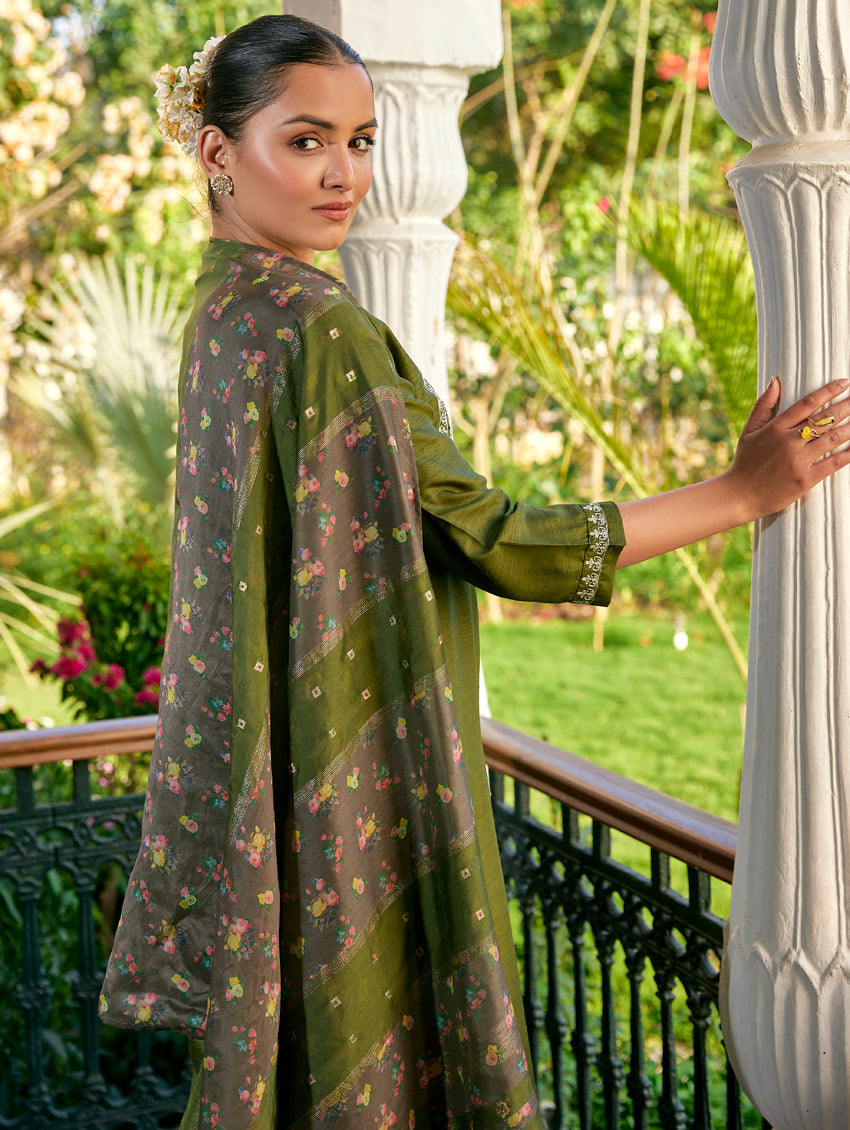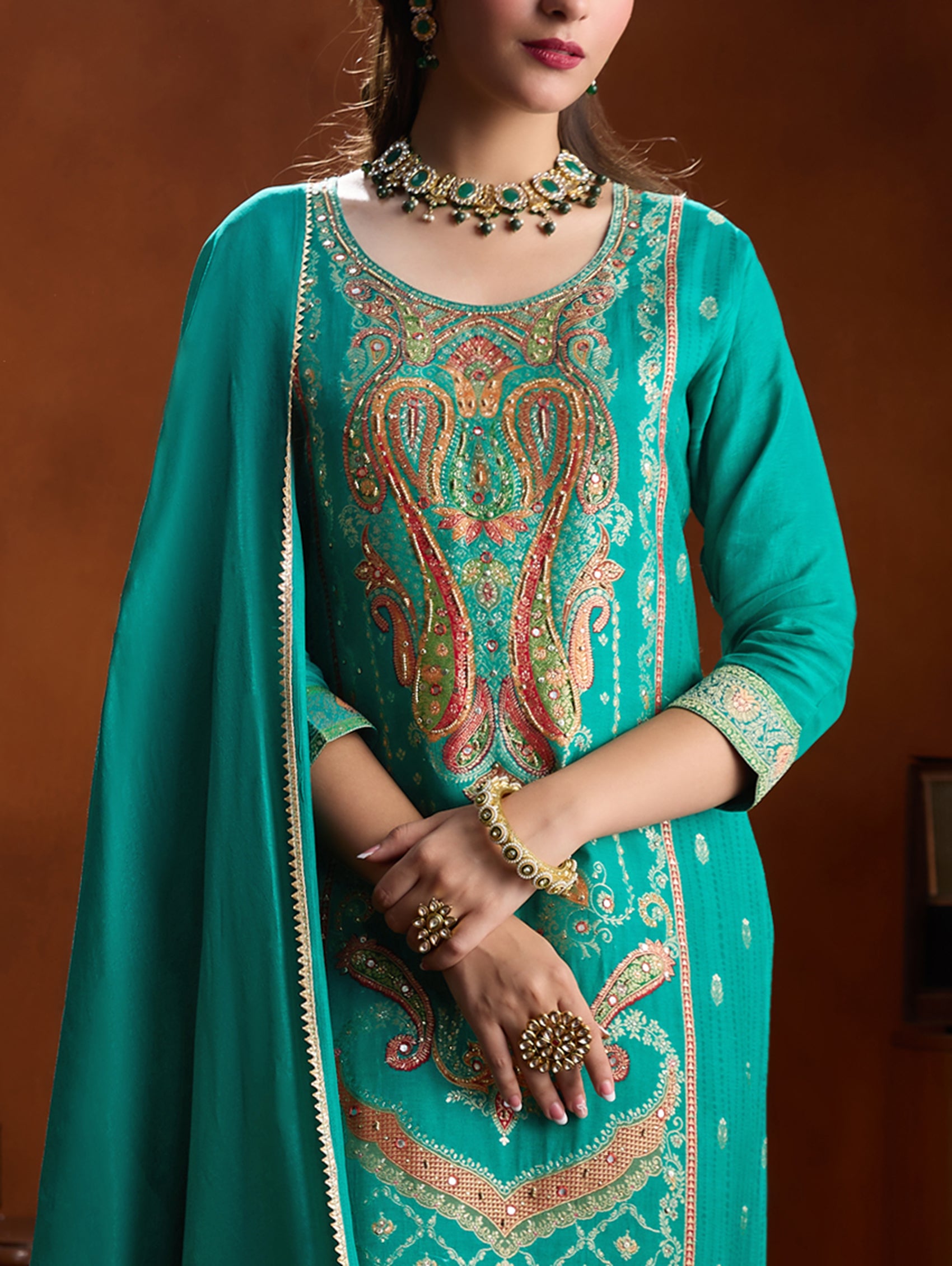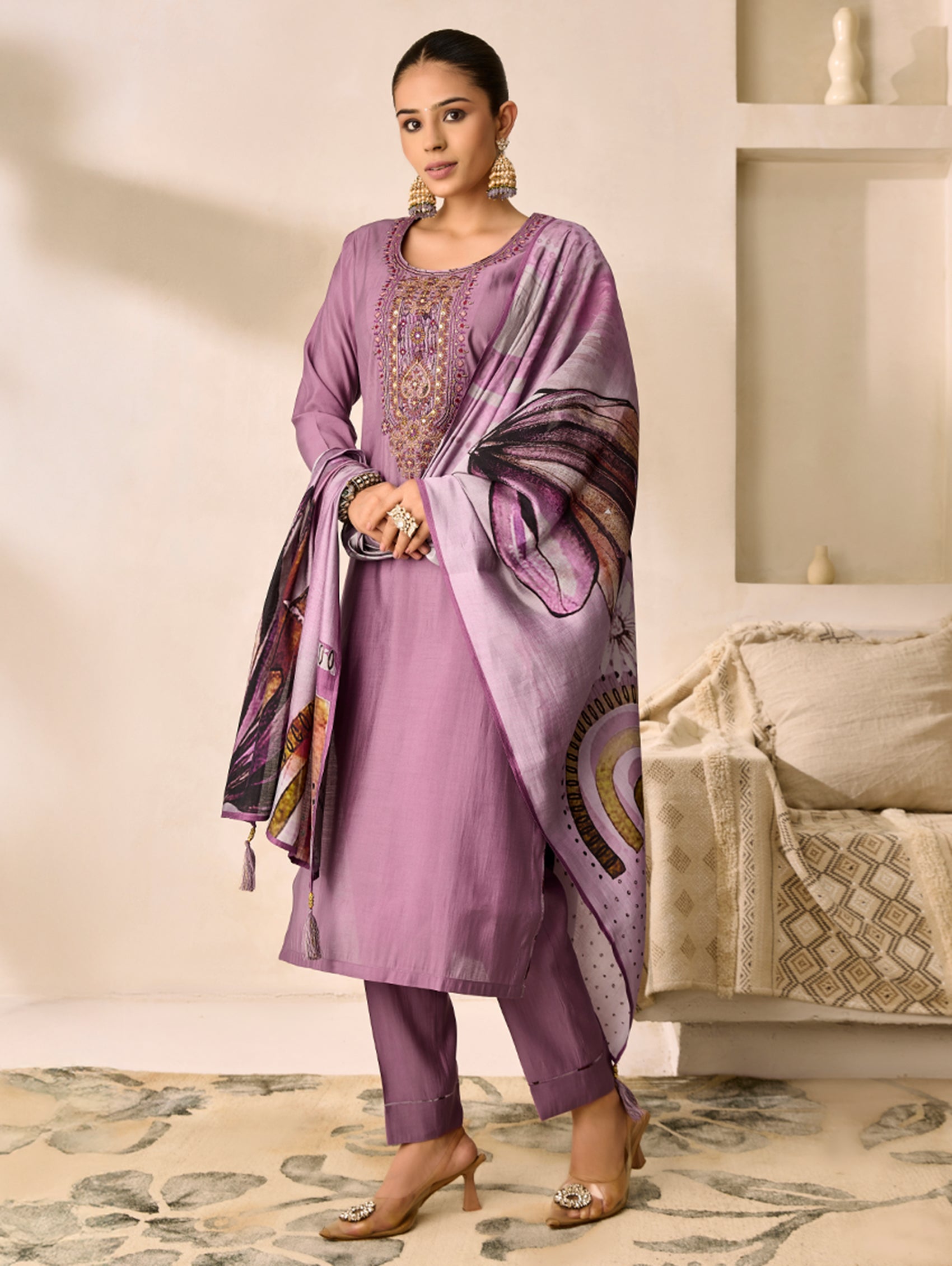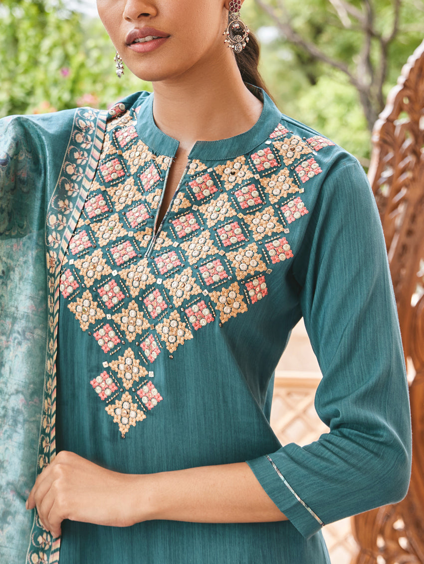 A straight-fit suit set from our latest collection. The set combines a digitally printed silk kurta with computerized thread embroidery, hand embroidery, straight pants, and a digitally printed silk dupatta.