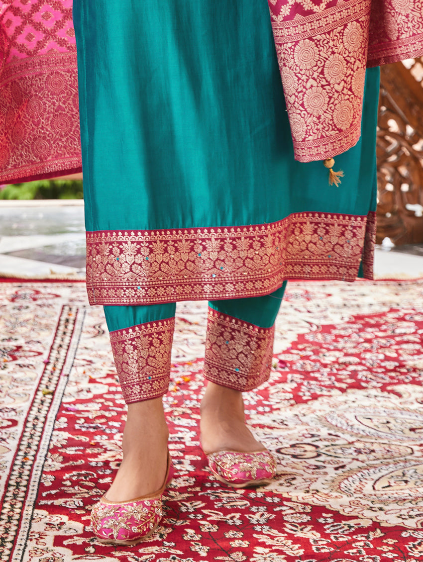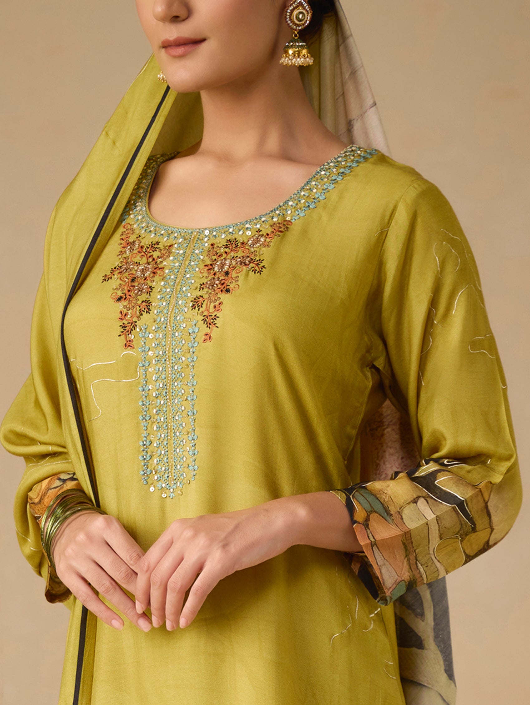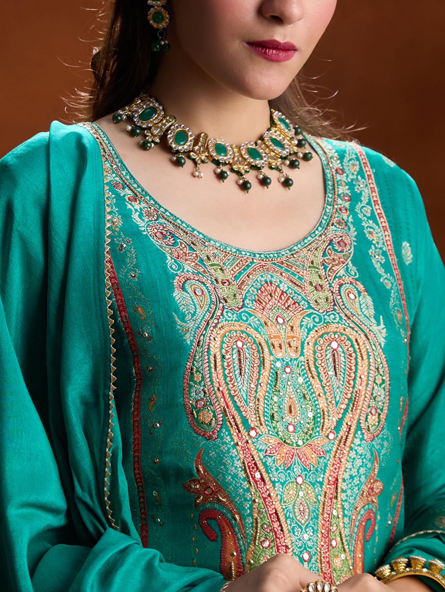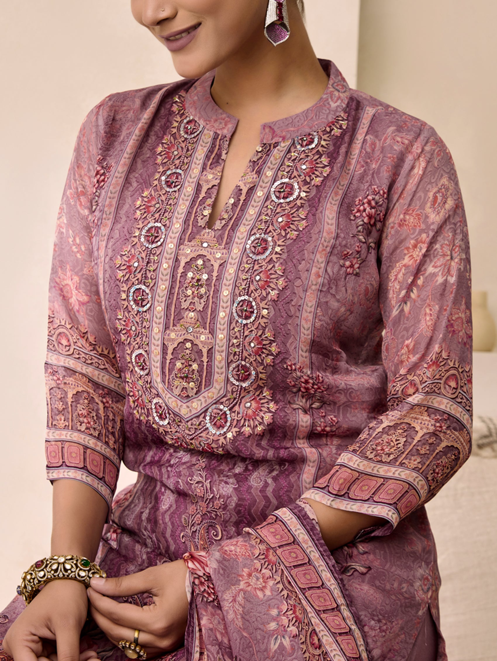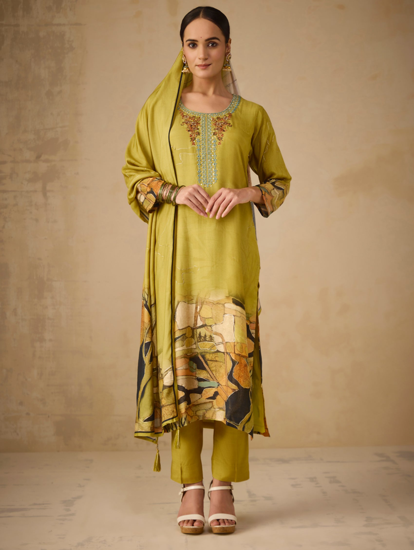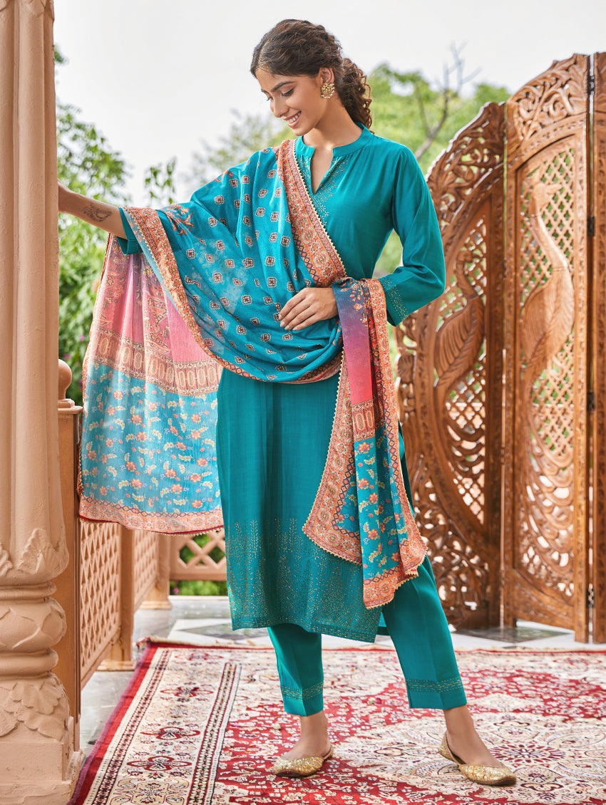 A straight-fit suit set from our latest collection. The set combines a digitally printed silk kurta with computerized thread embroidery, hand embroidery, straight pants, and a digitally printed silk dupatta.