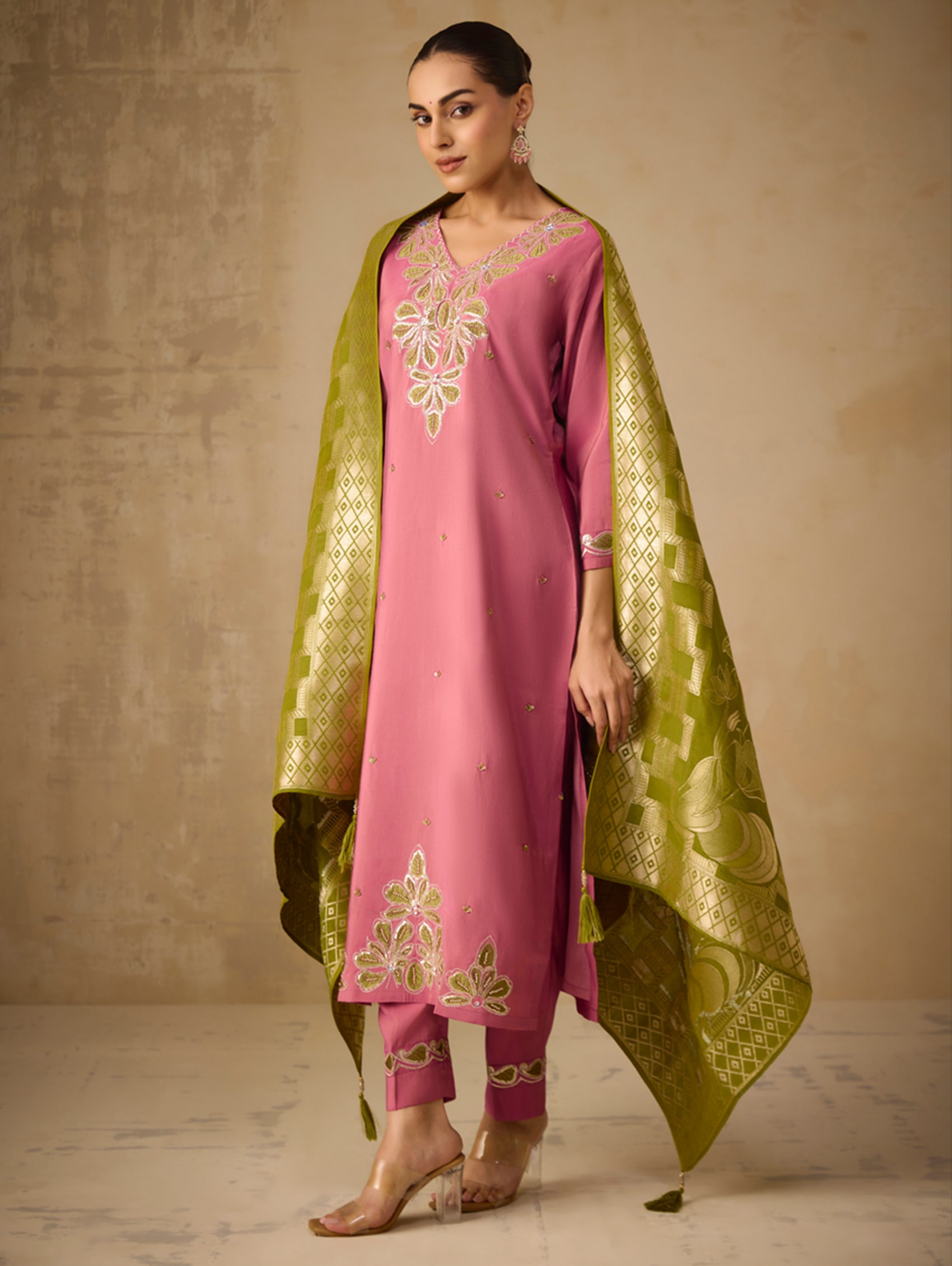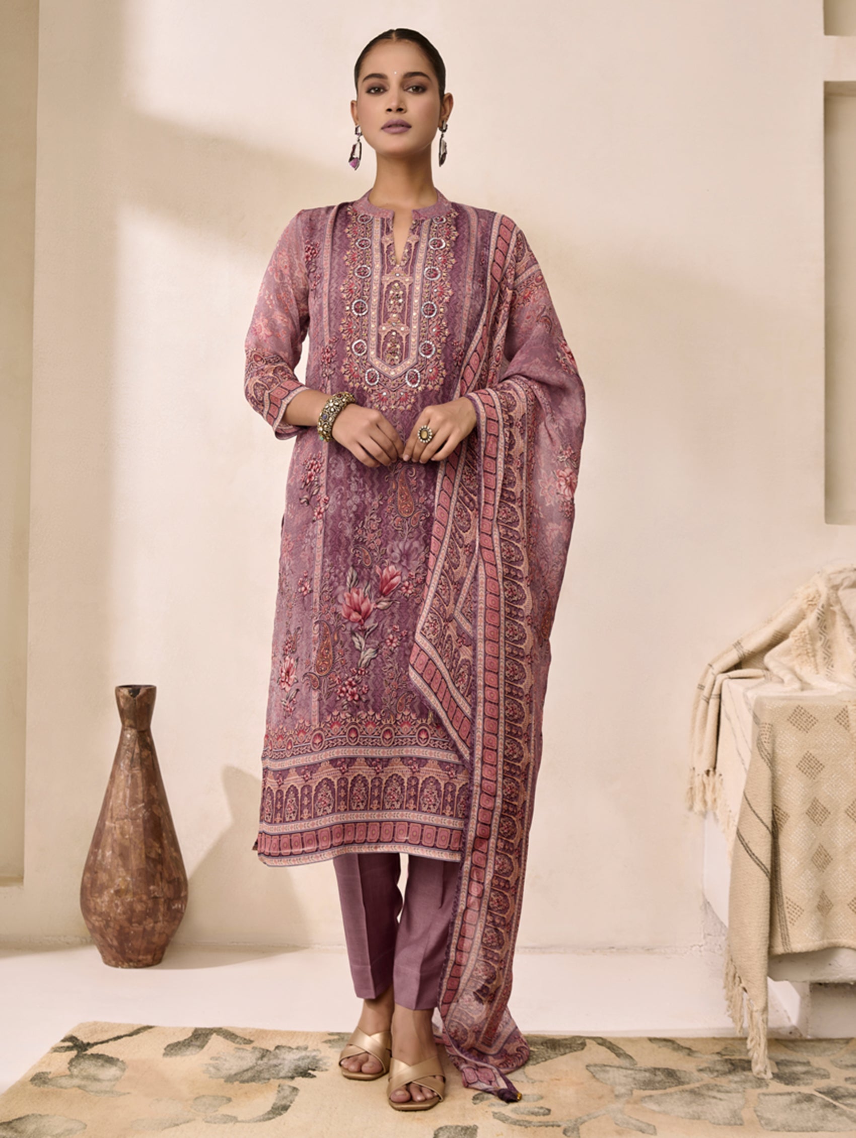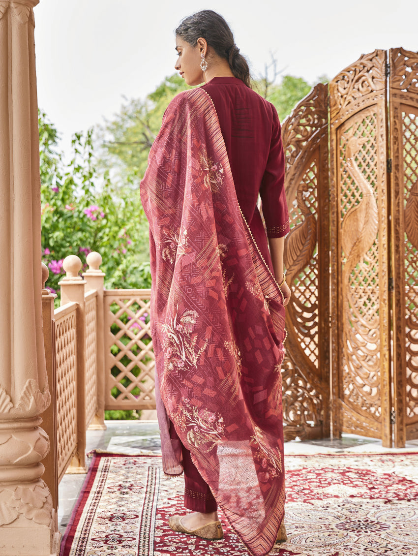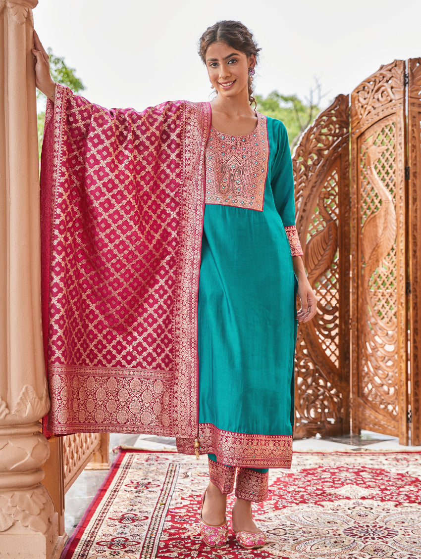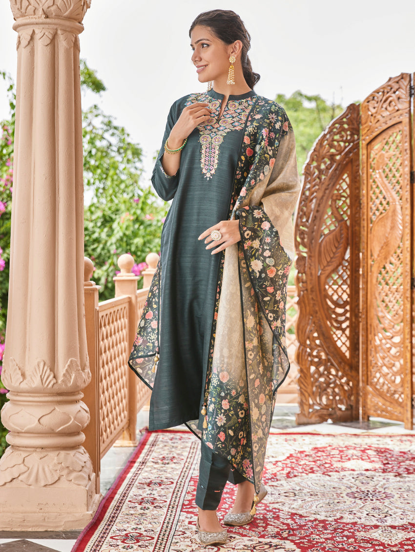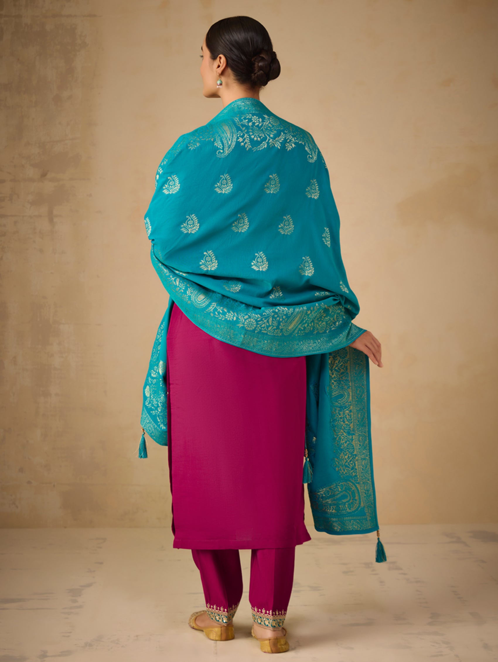 A straight-fit suit set from our latest collection. The set combines a digitally printed silk kurta with computerized thread embroidery, hand embroidery, straight pants, and a digitally printed silk dupatta.