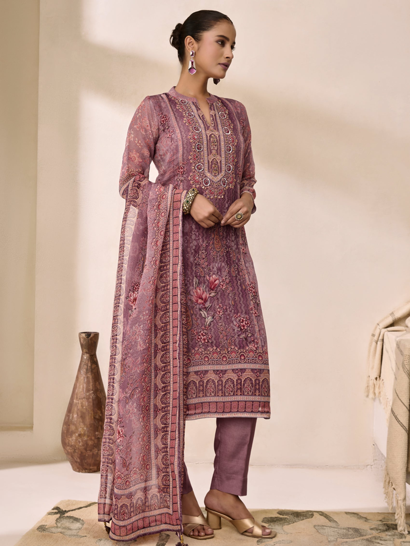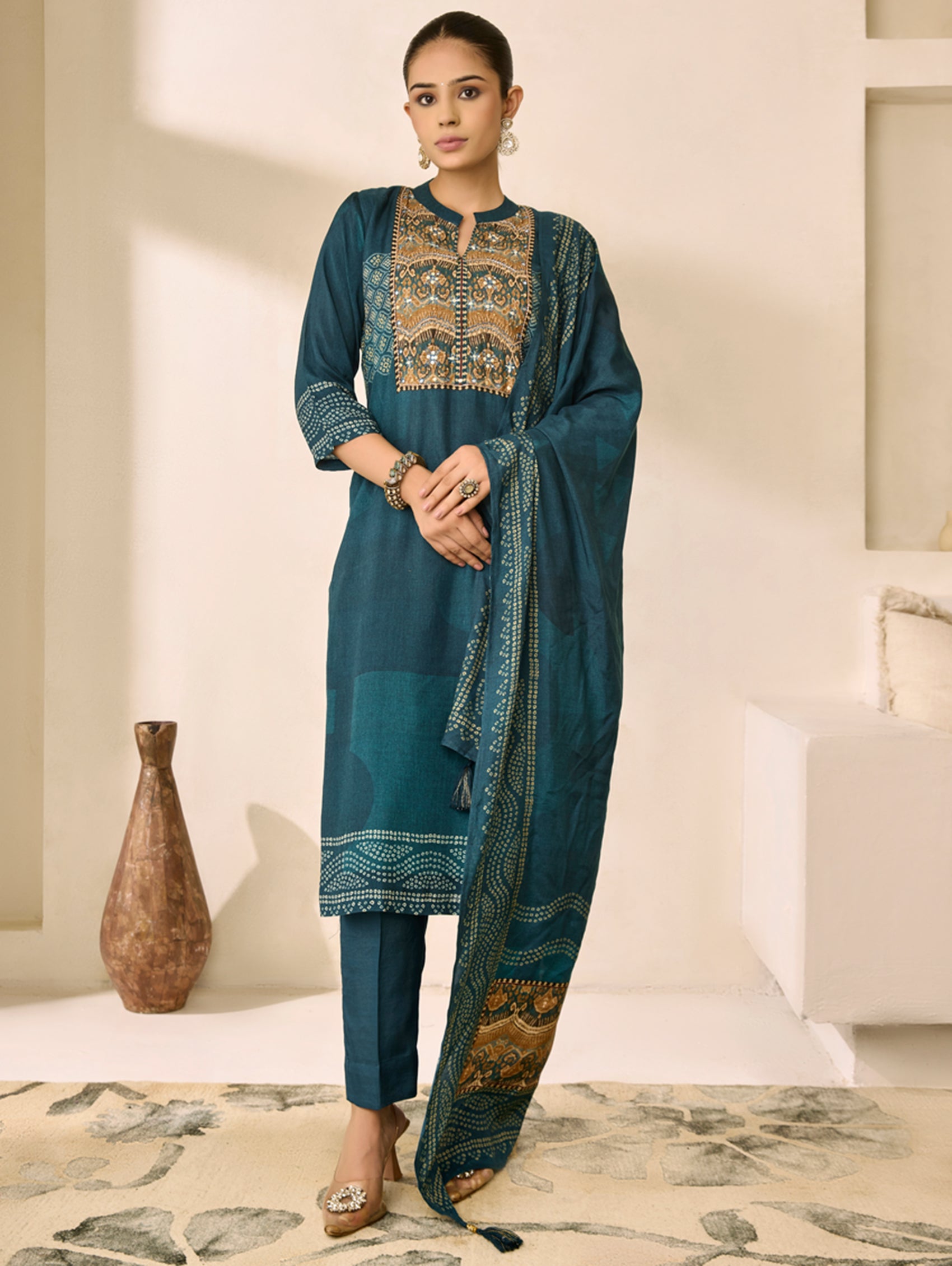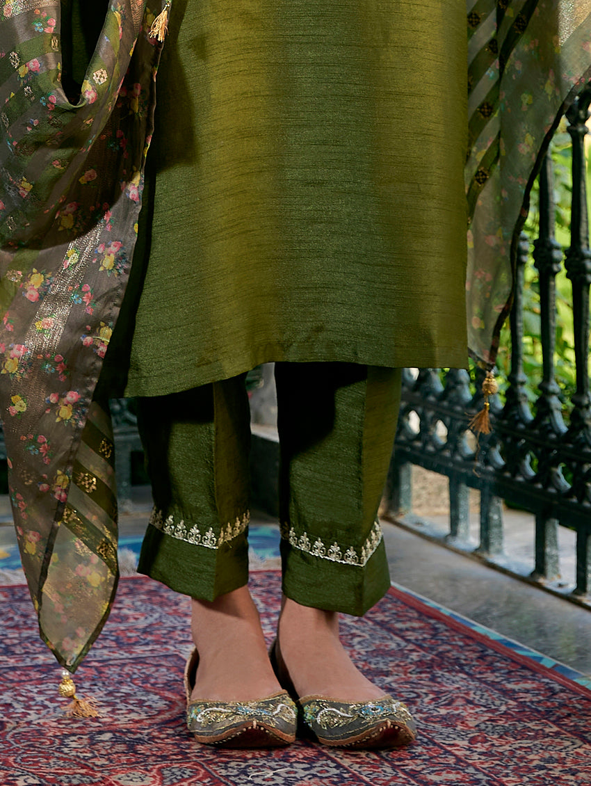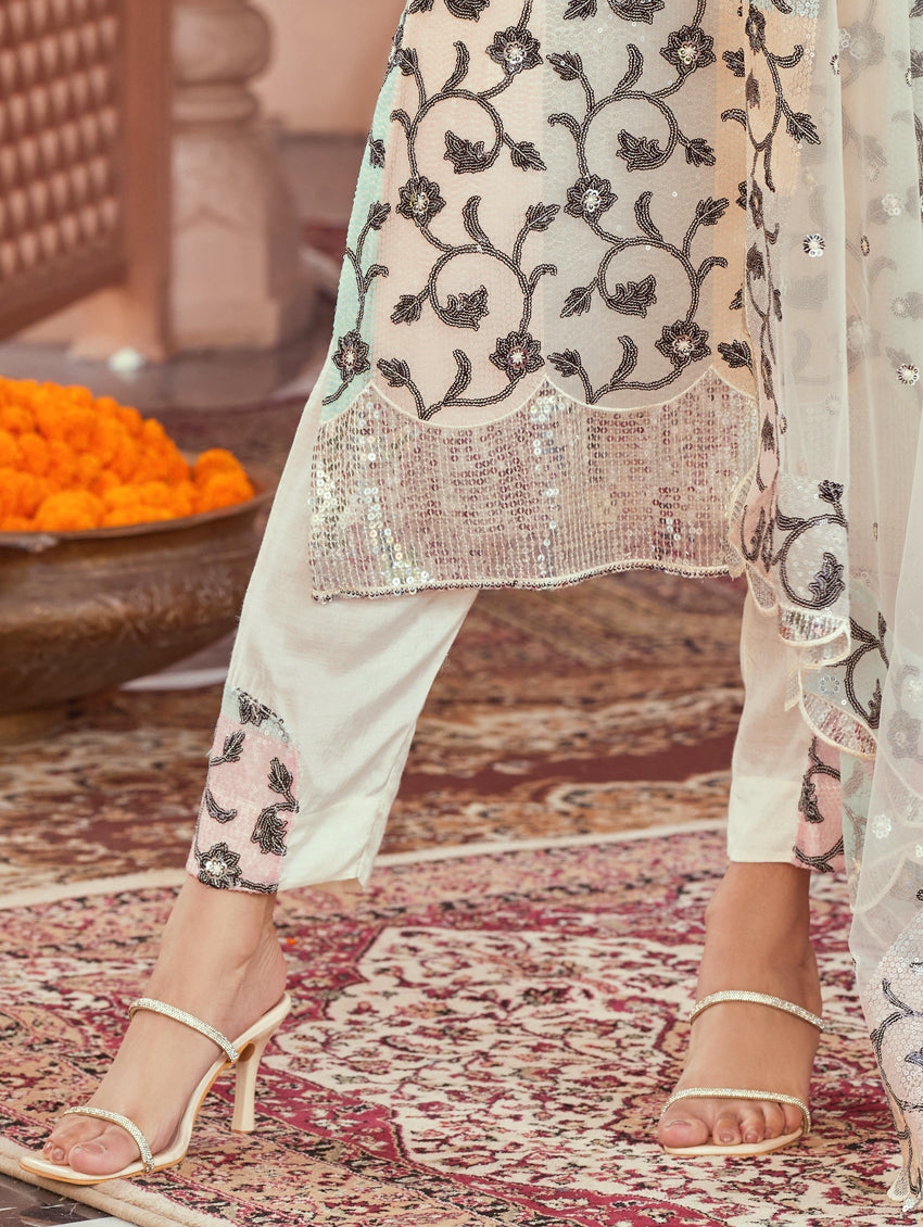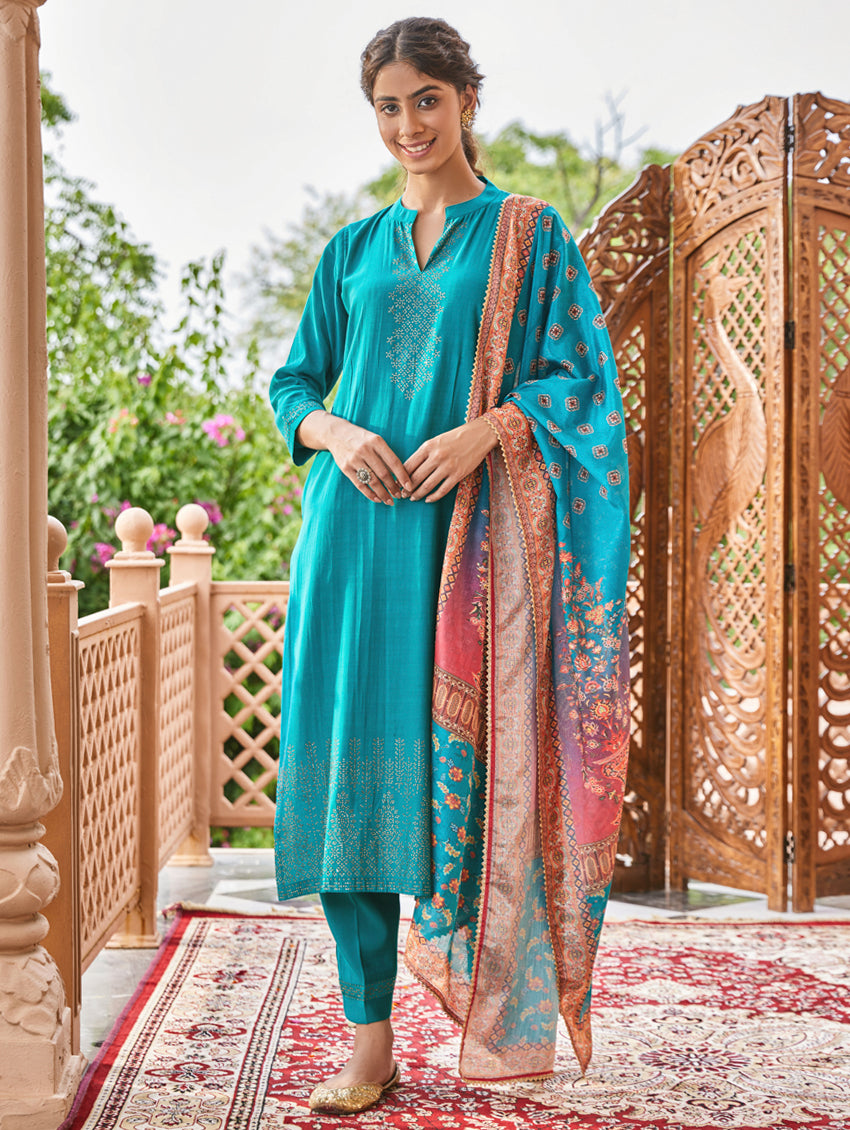 A straight-fit suit set from our latest collection. The set combines a digitally printed silk kurta with computerized thread embroidery, hand embroidery, straight pants, and a digitally printed silk dupatta.