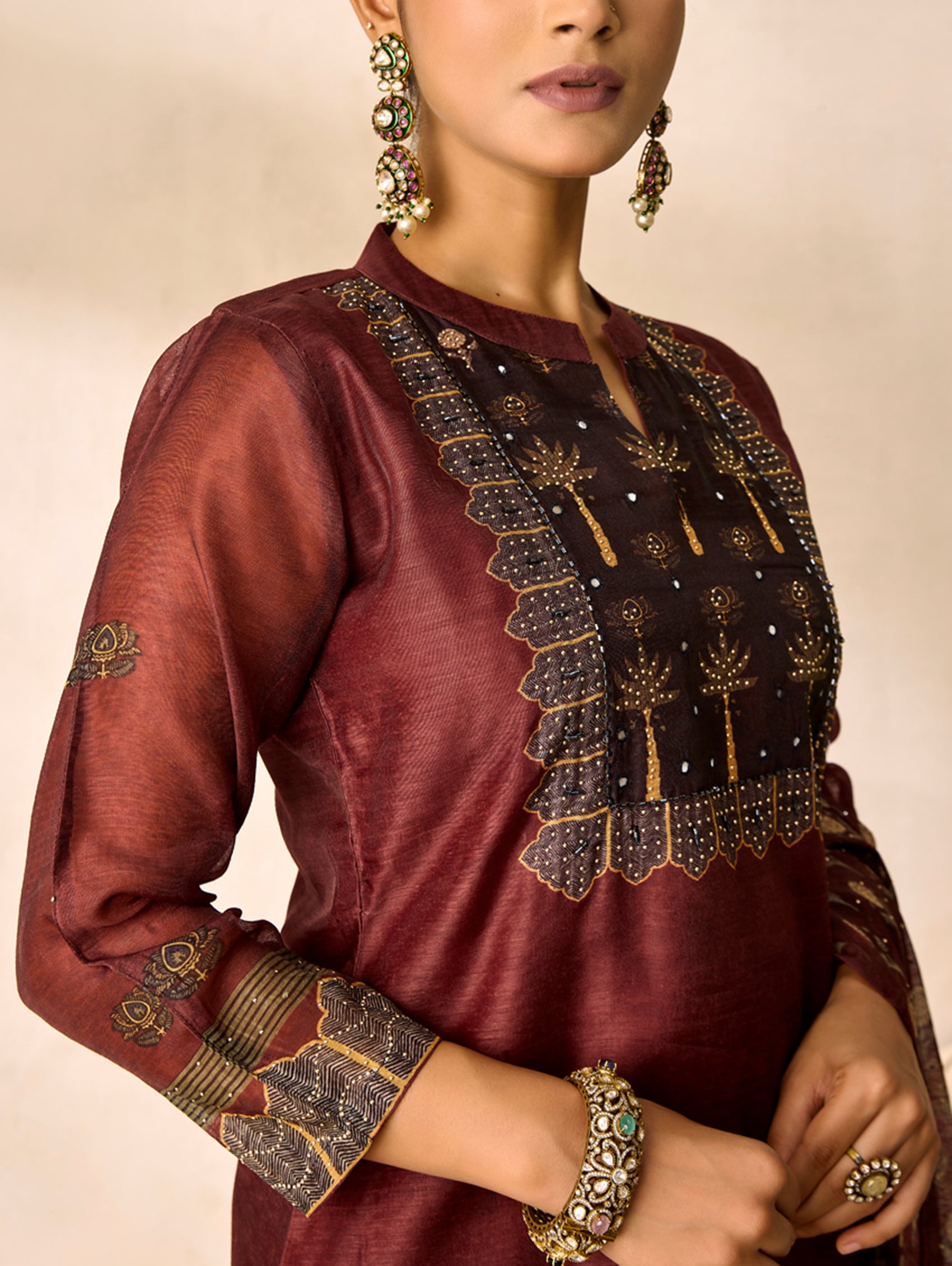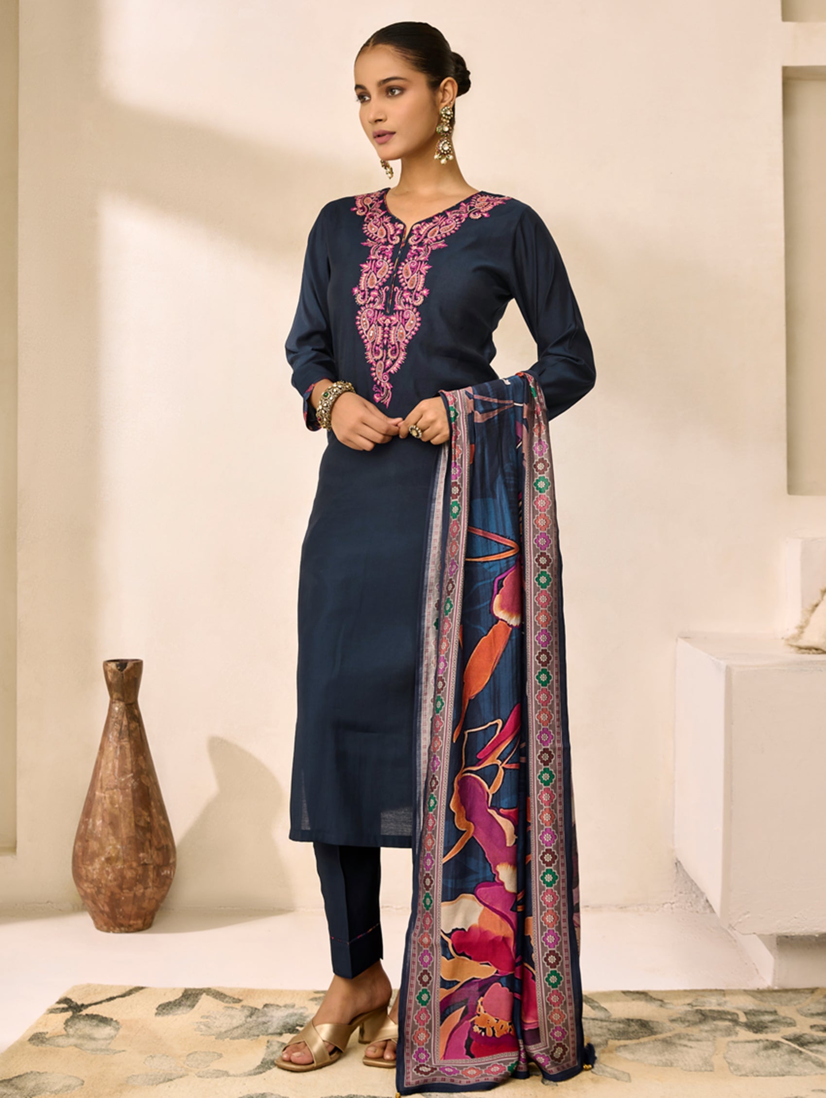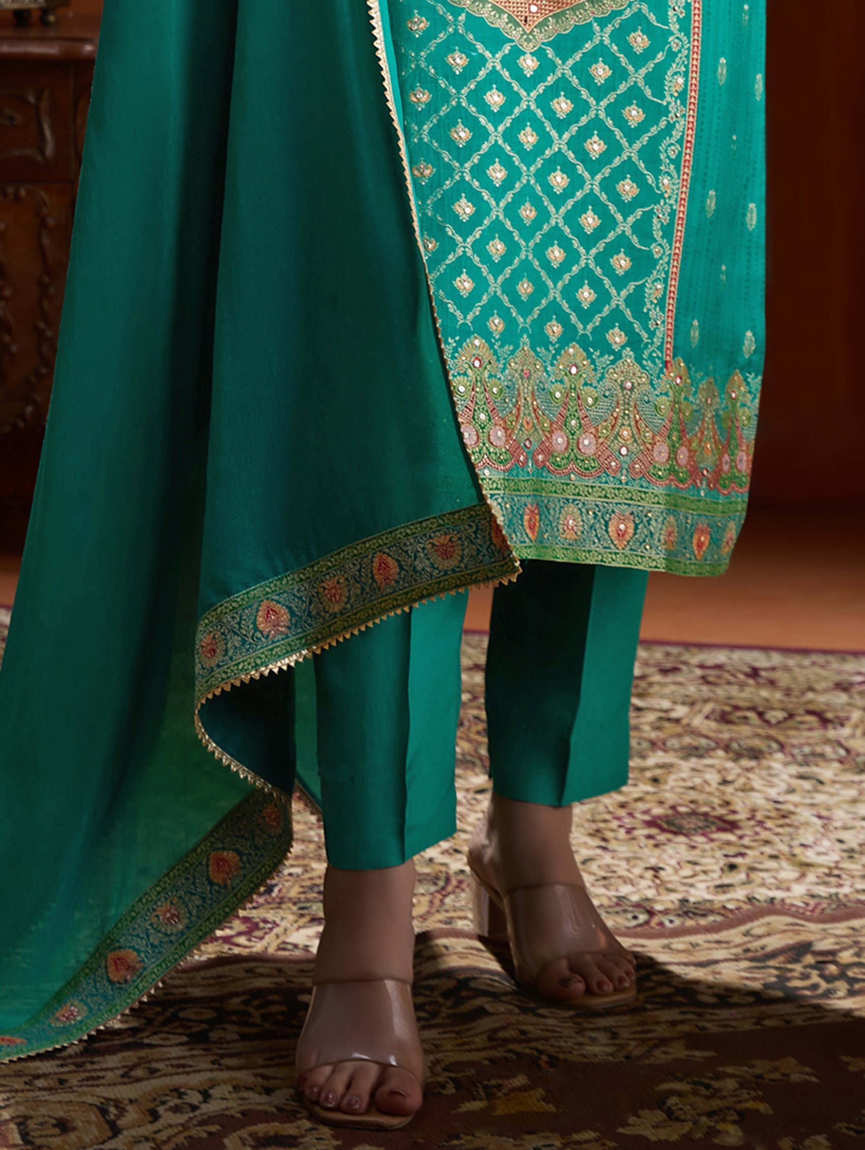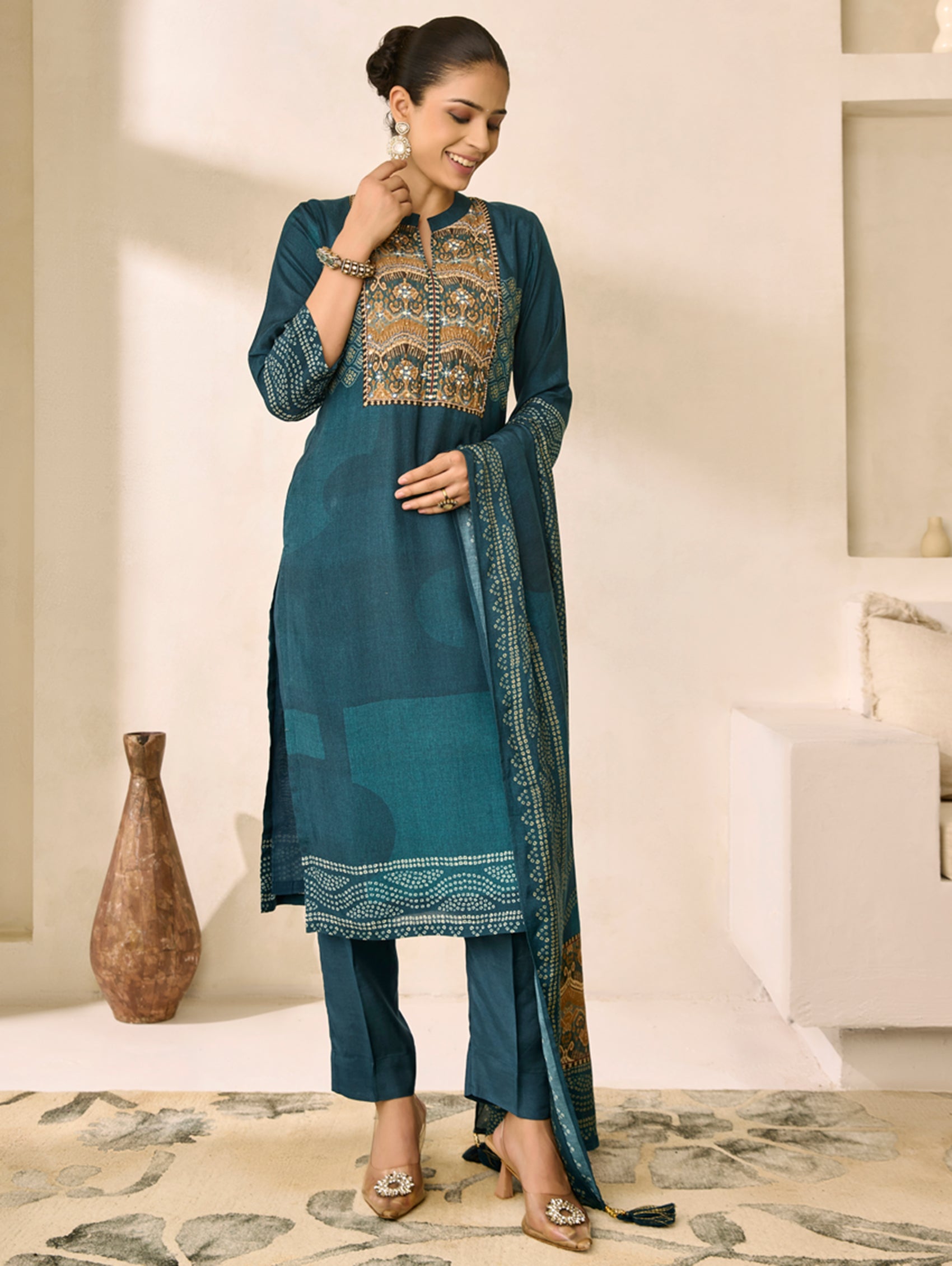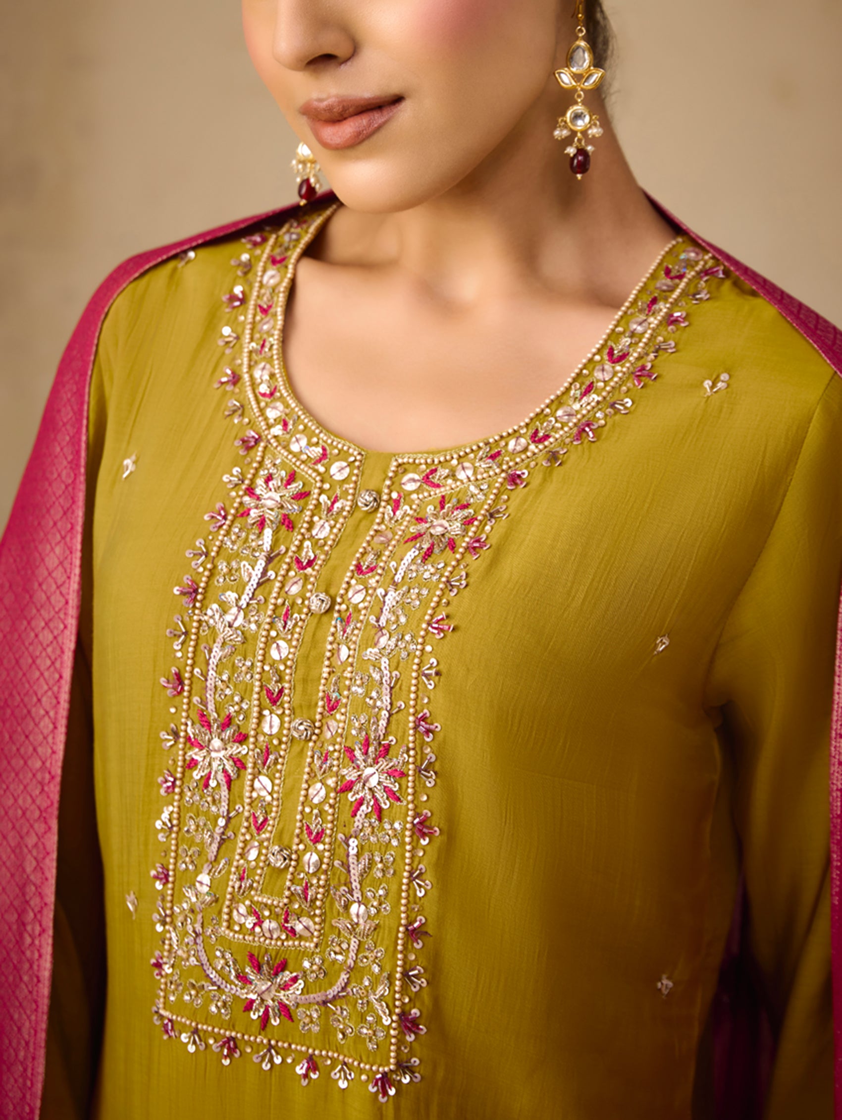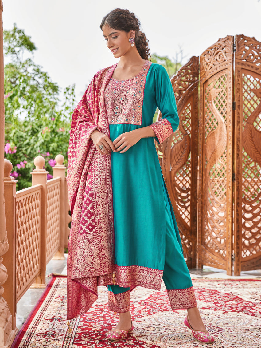 A straight-fit suit set from our latest collection. The set combines a digitally printed silk kurta with computerized thread embroidery, hand embroidery, straight pants, and a digitally printed silk dupatta.