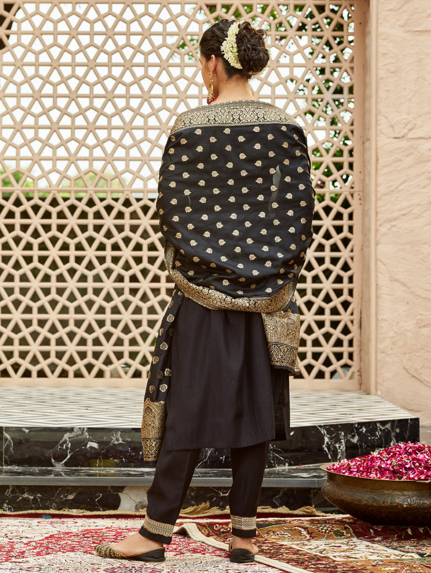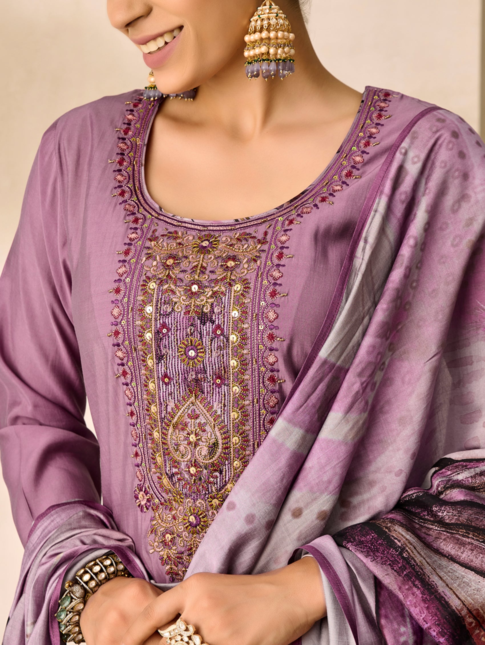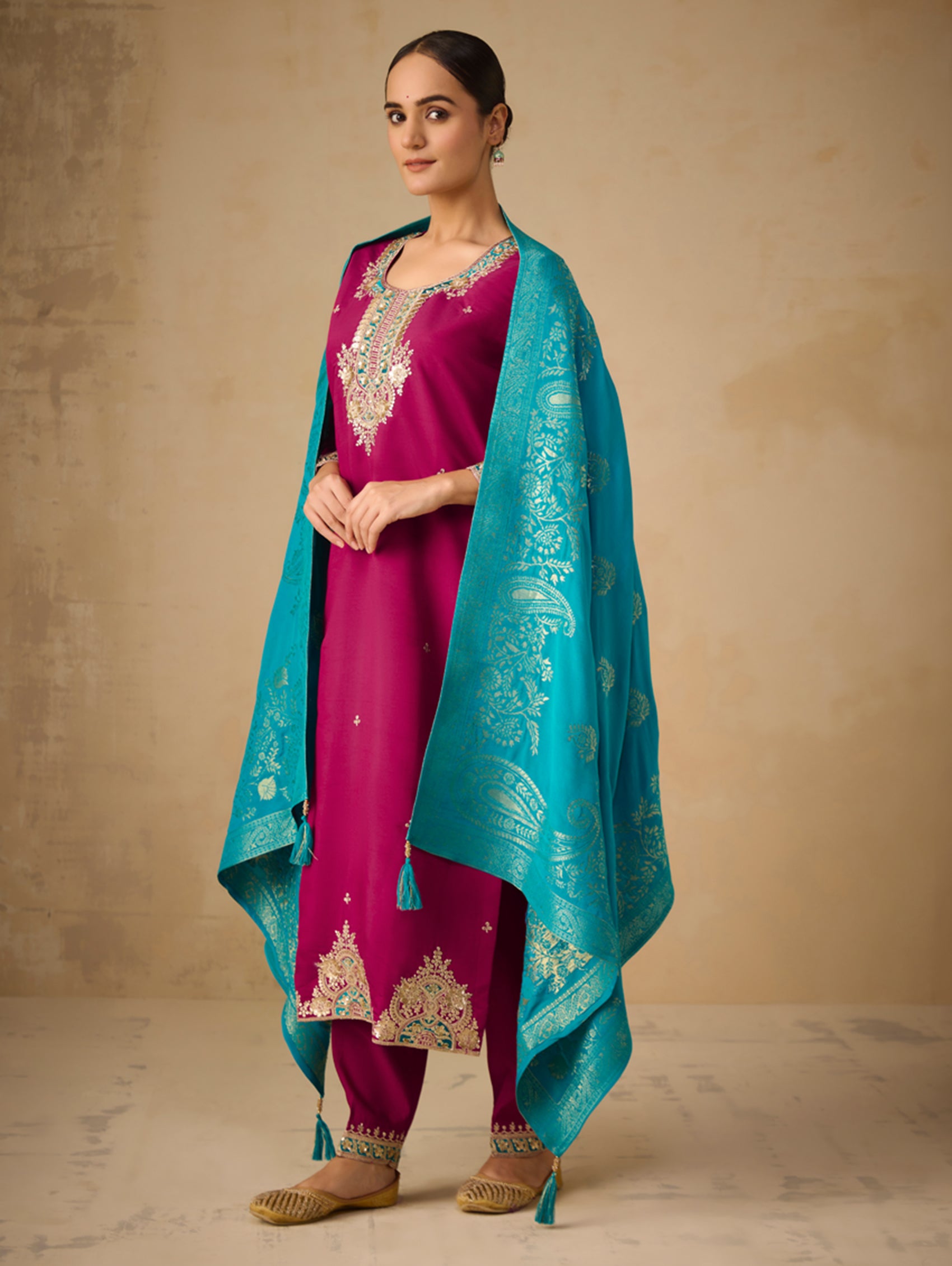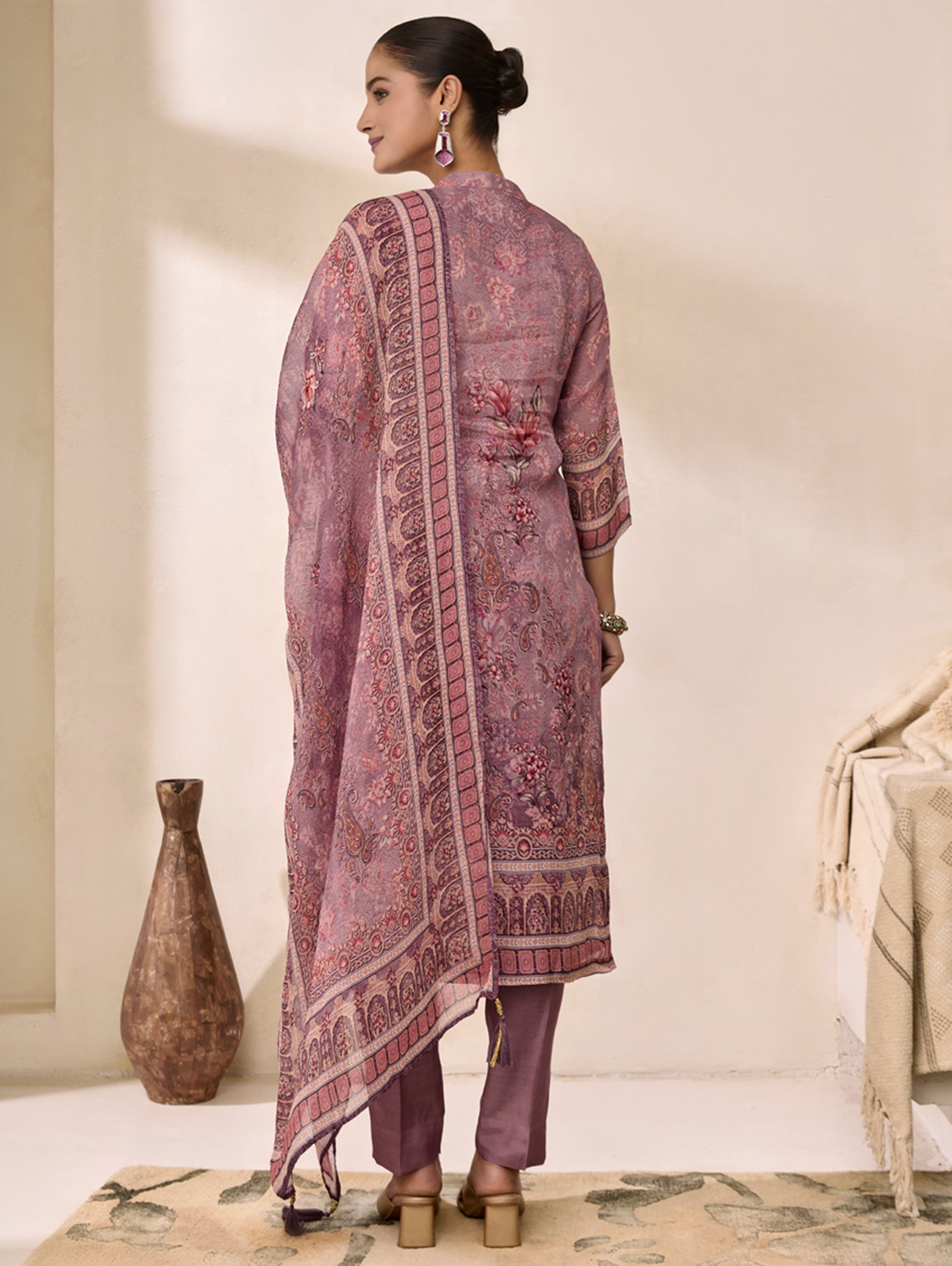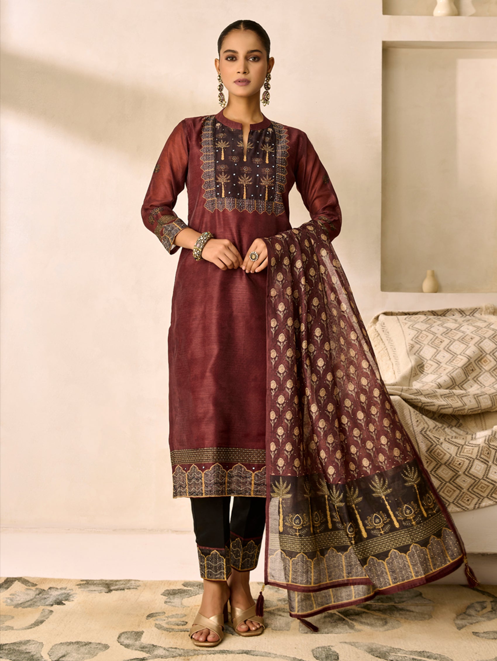 A straight-fit suit set from our latest collection. The set combines a digitally printed silk kurta with computerized thread embroidery, hand embroidery, straight pants, and a digitally printed silk dupatta.