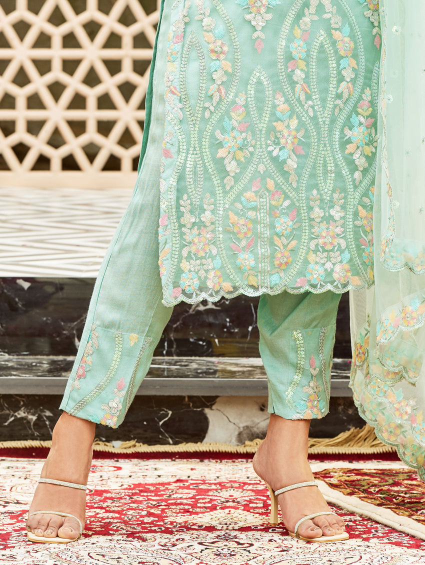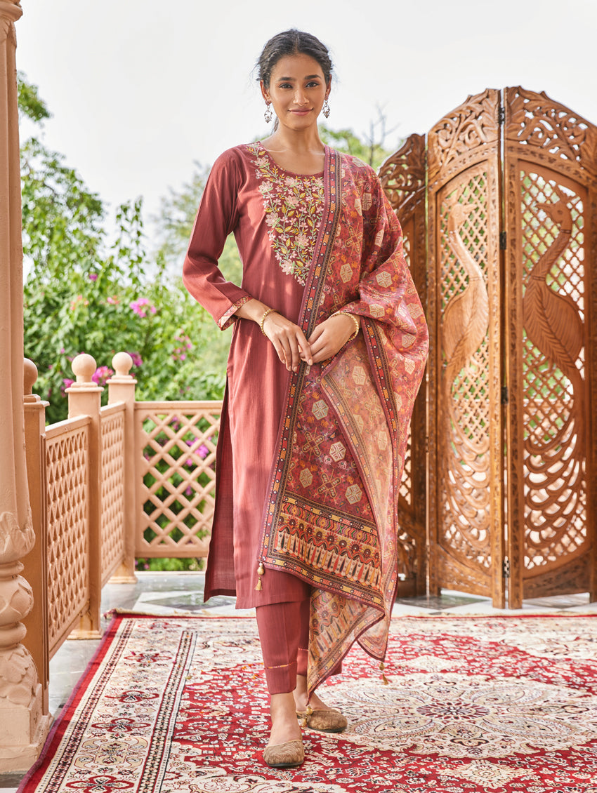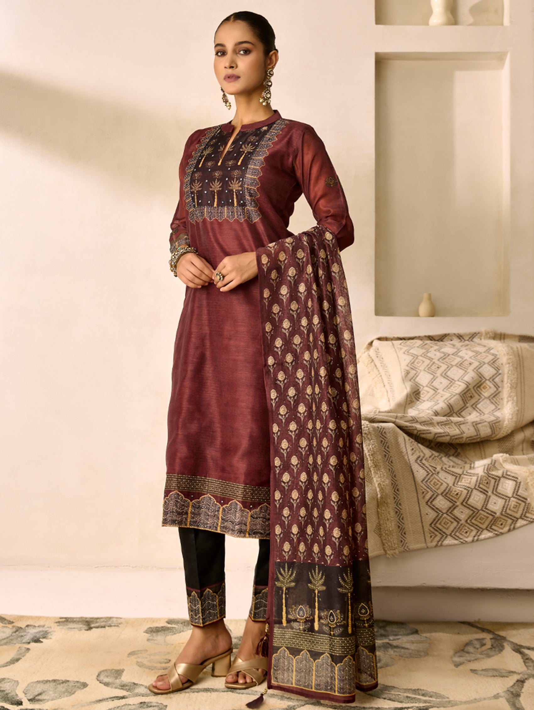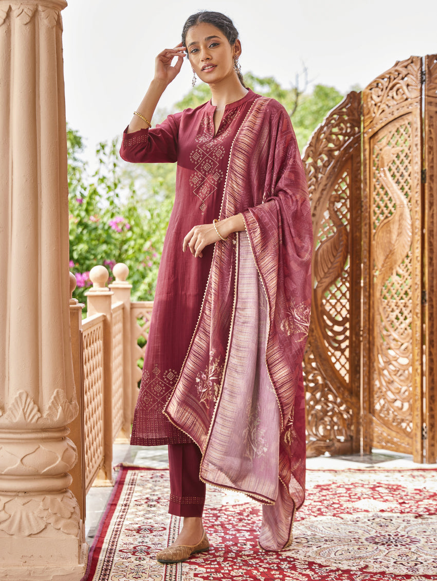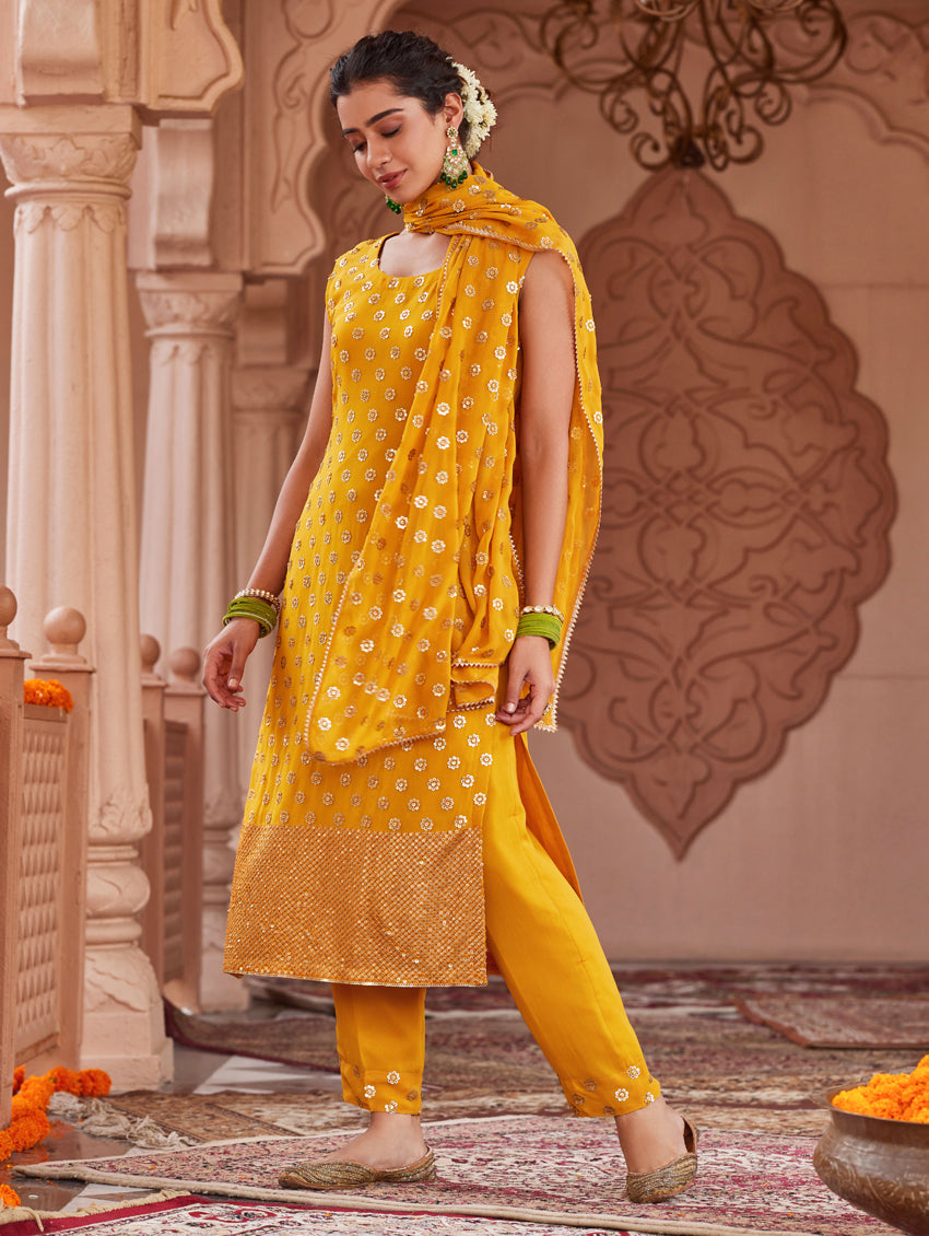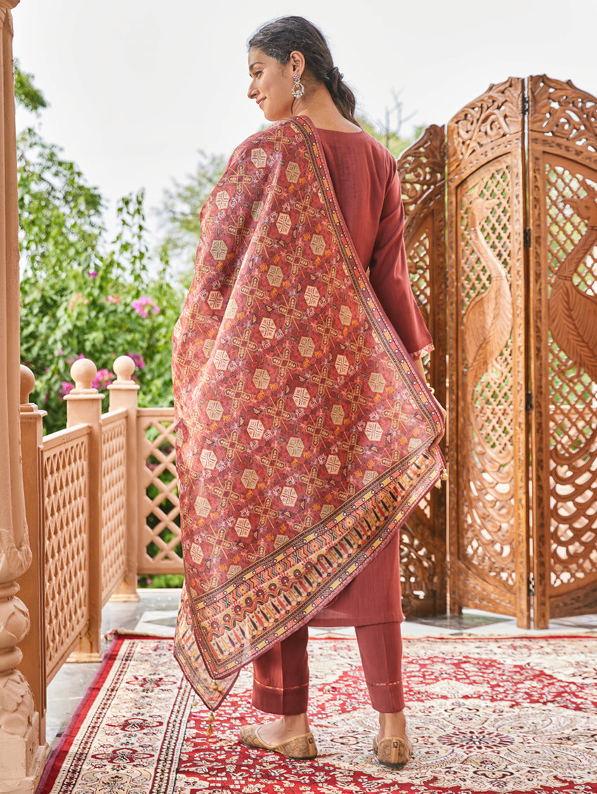 A straight-fit suit set from our latest collection. The set combines a digitally printed silk kurta with computerized thread embroidery, hand embroidery, straight pants, and a digitally printed silk dupatta.