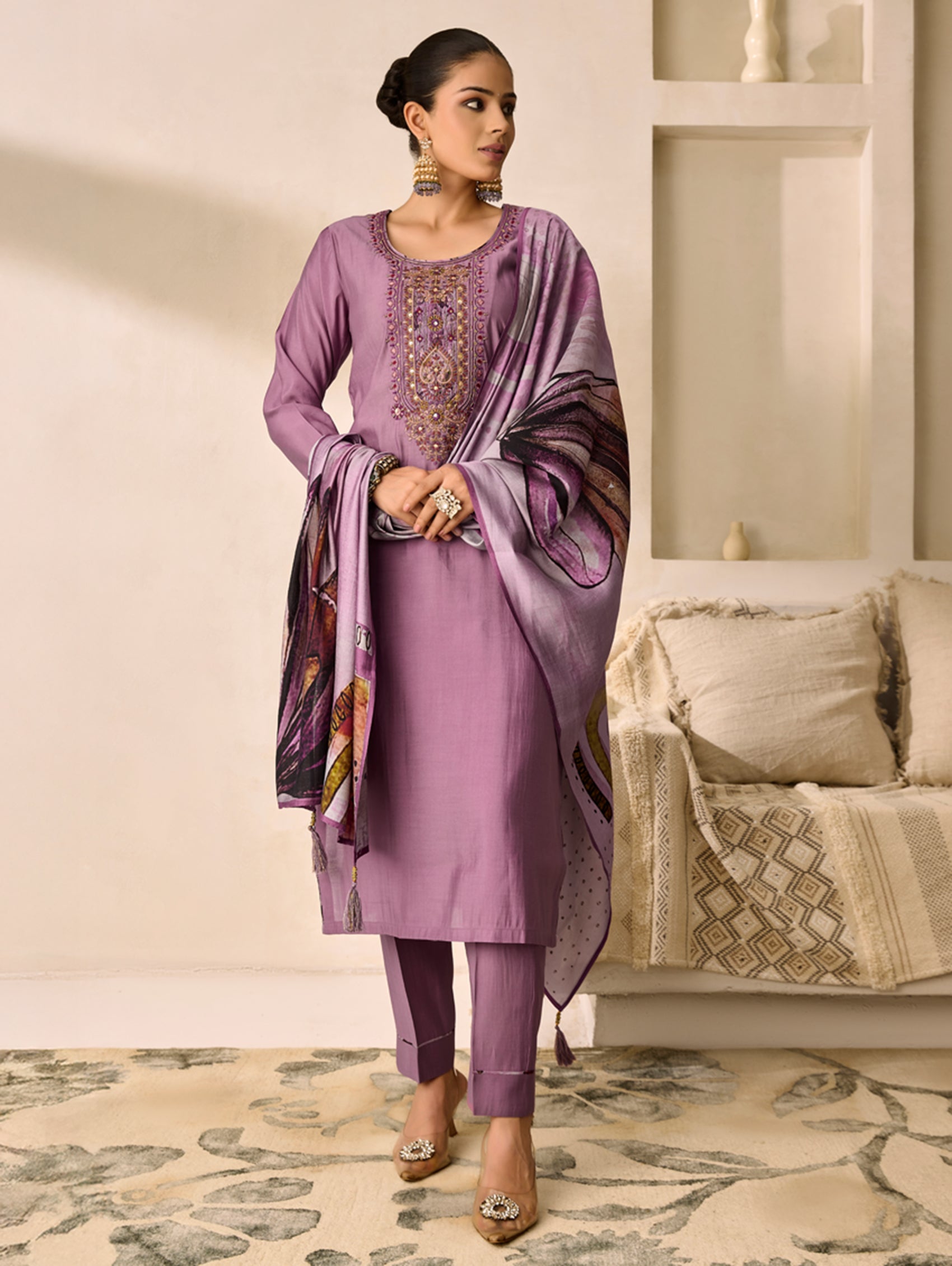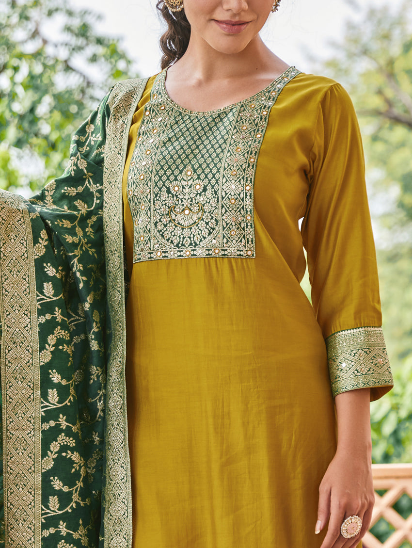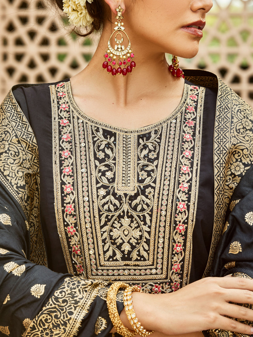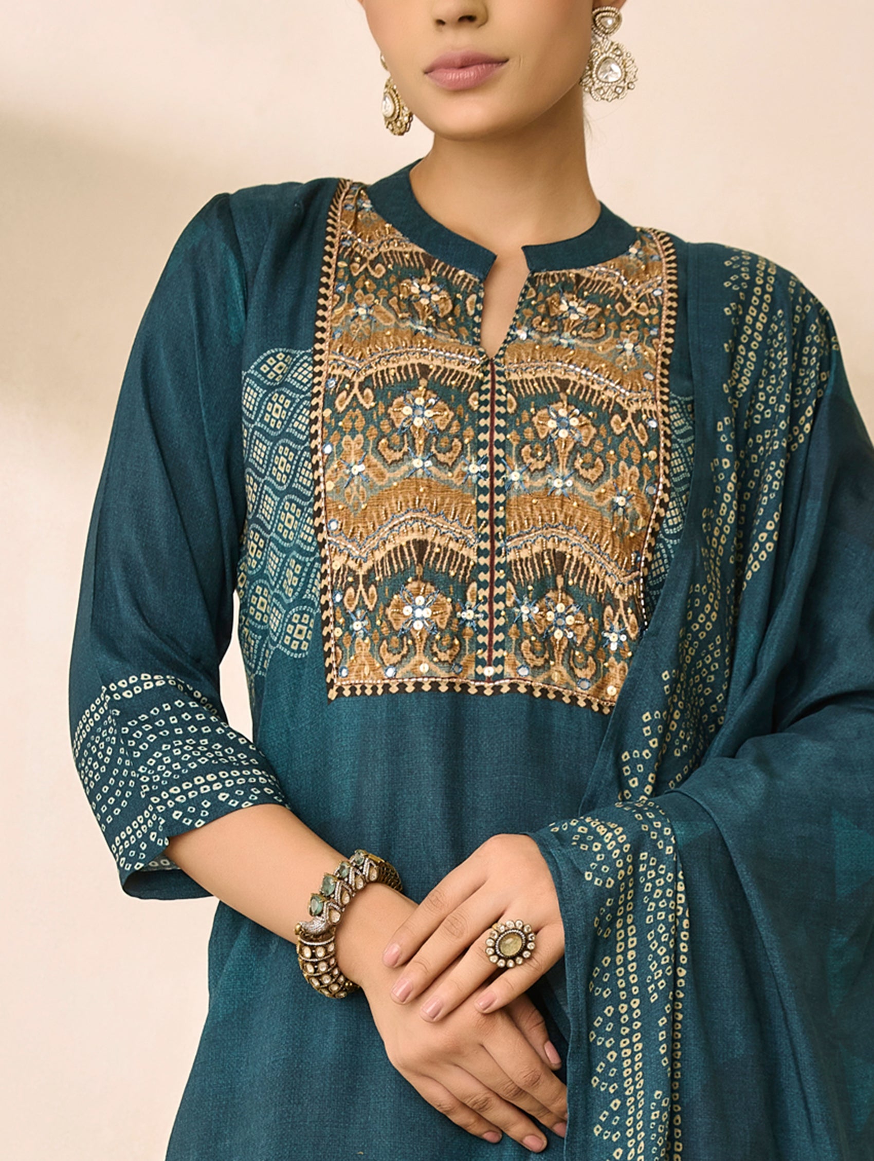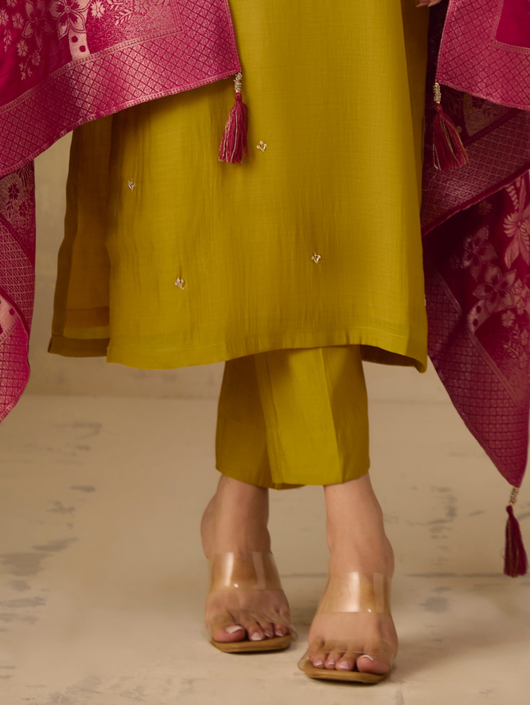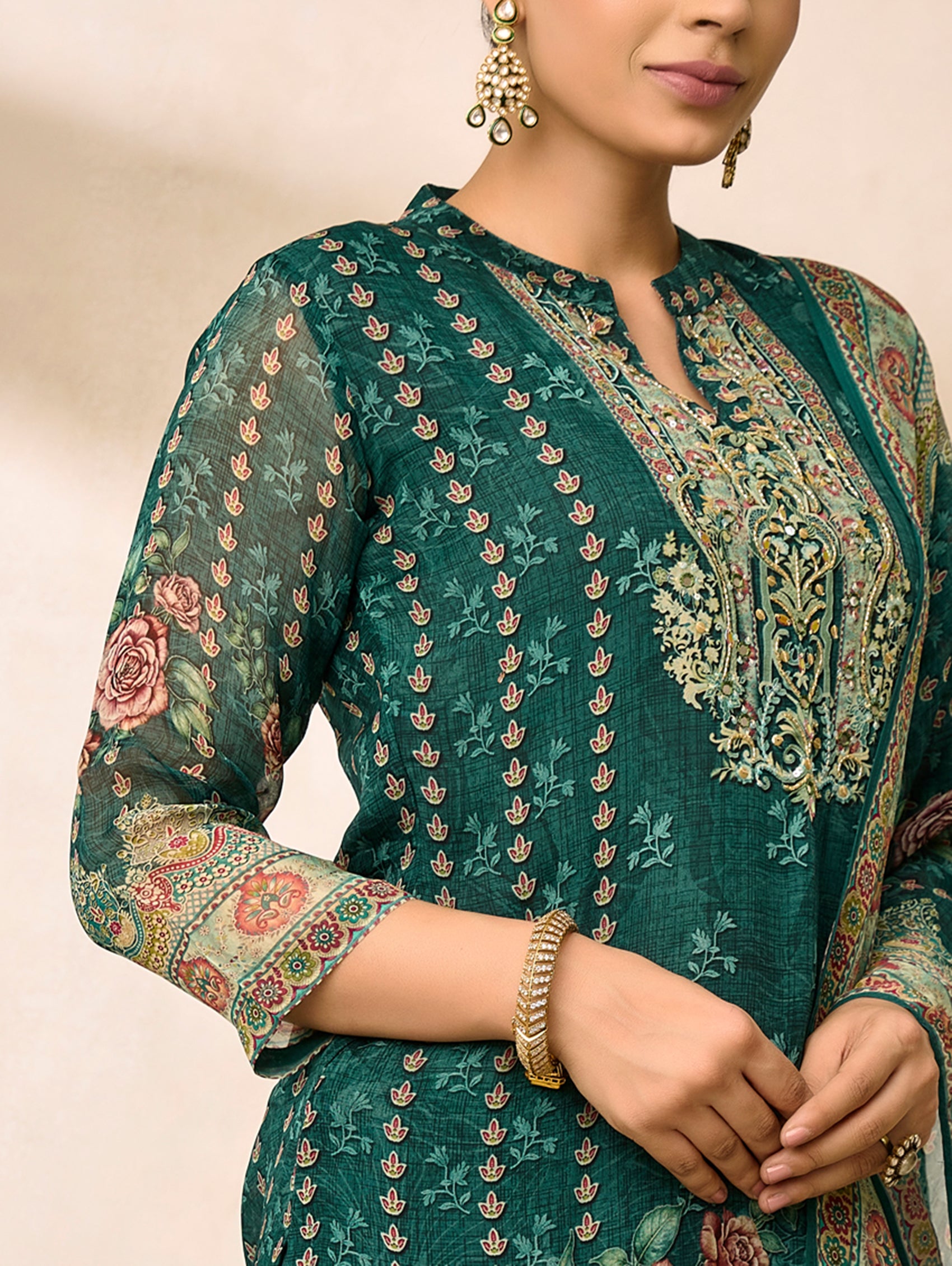A straight-fit suit set from our latest collection. The set combines a digitally printed silk kurta with computerized thread embroidery, hand embroidery, straight pants, and a digitally printed silk dupatta.
