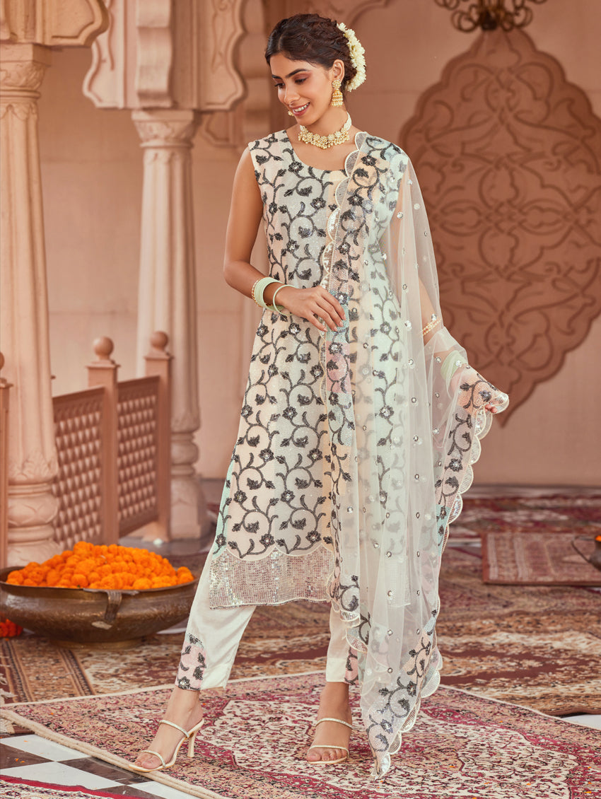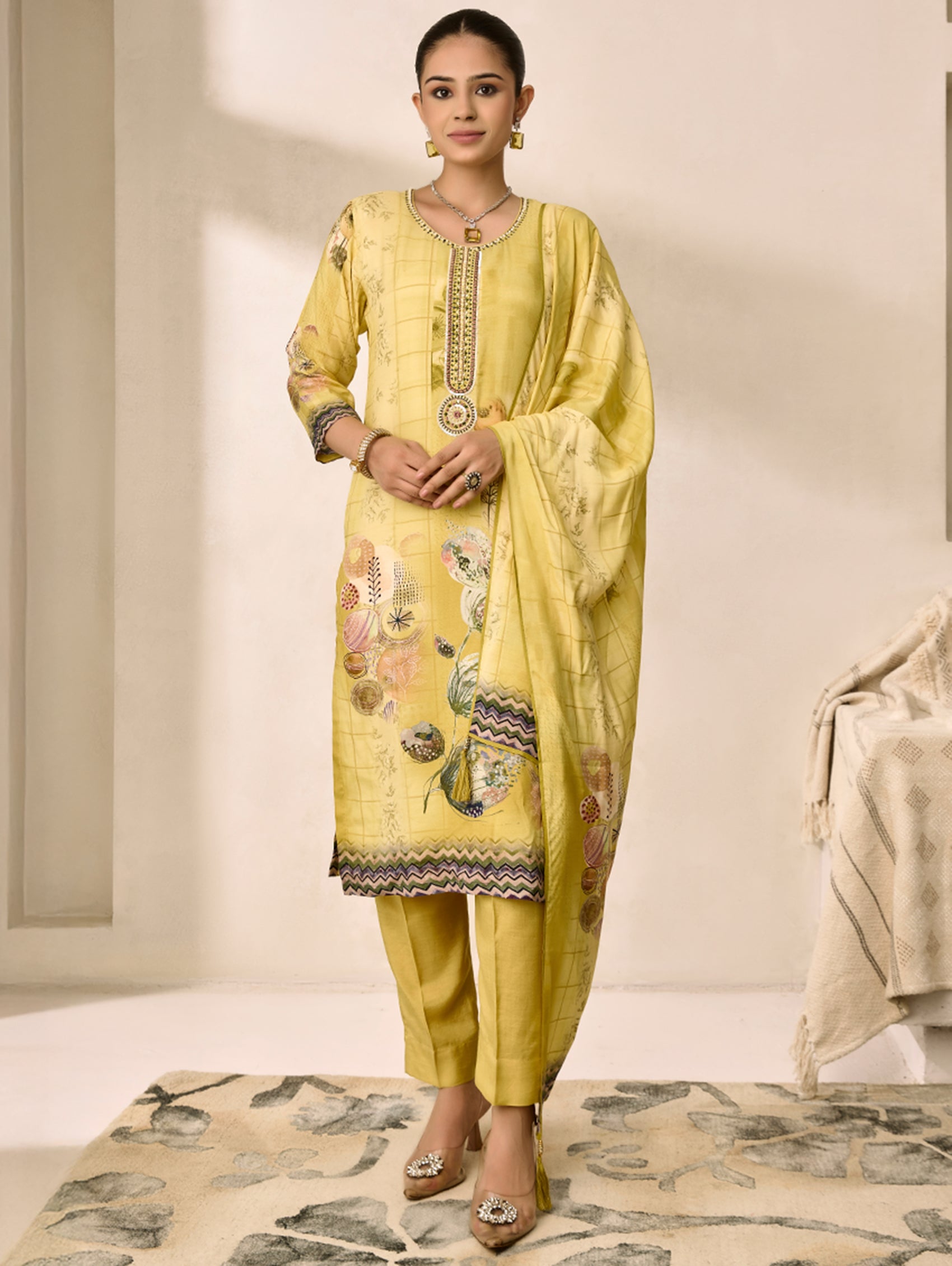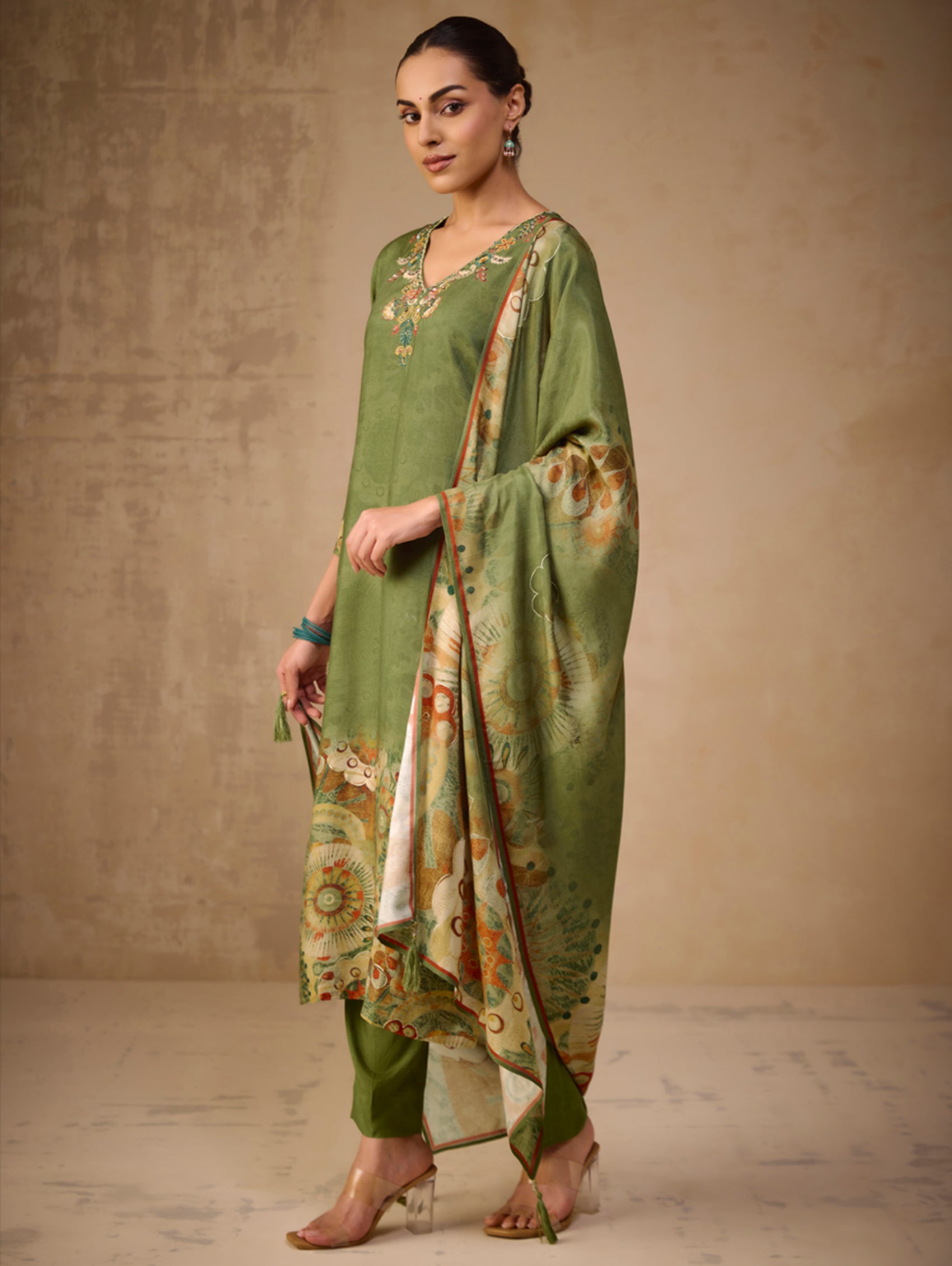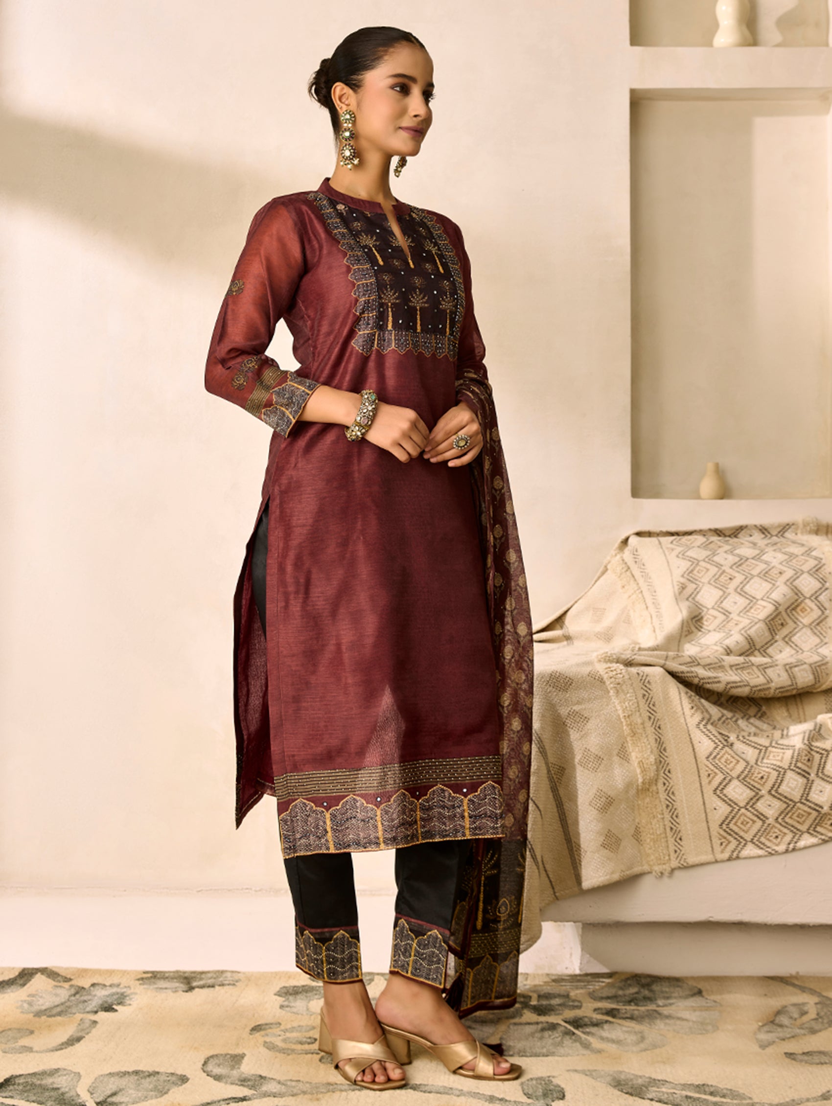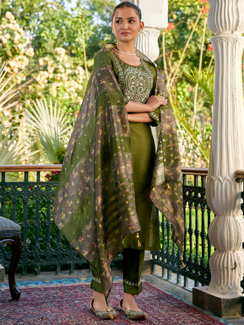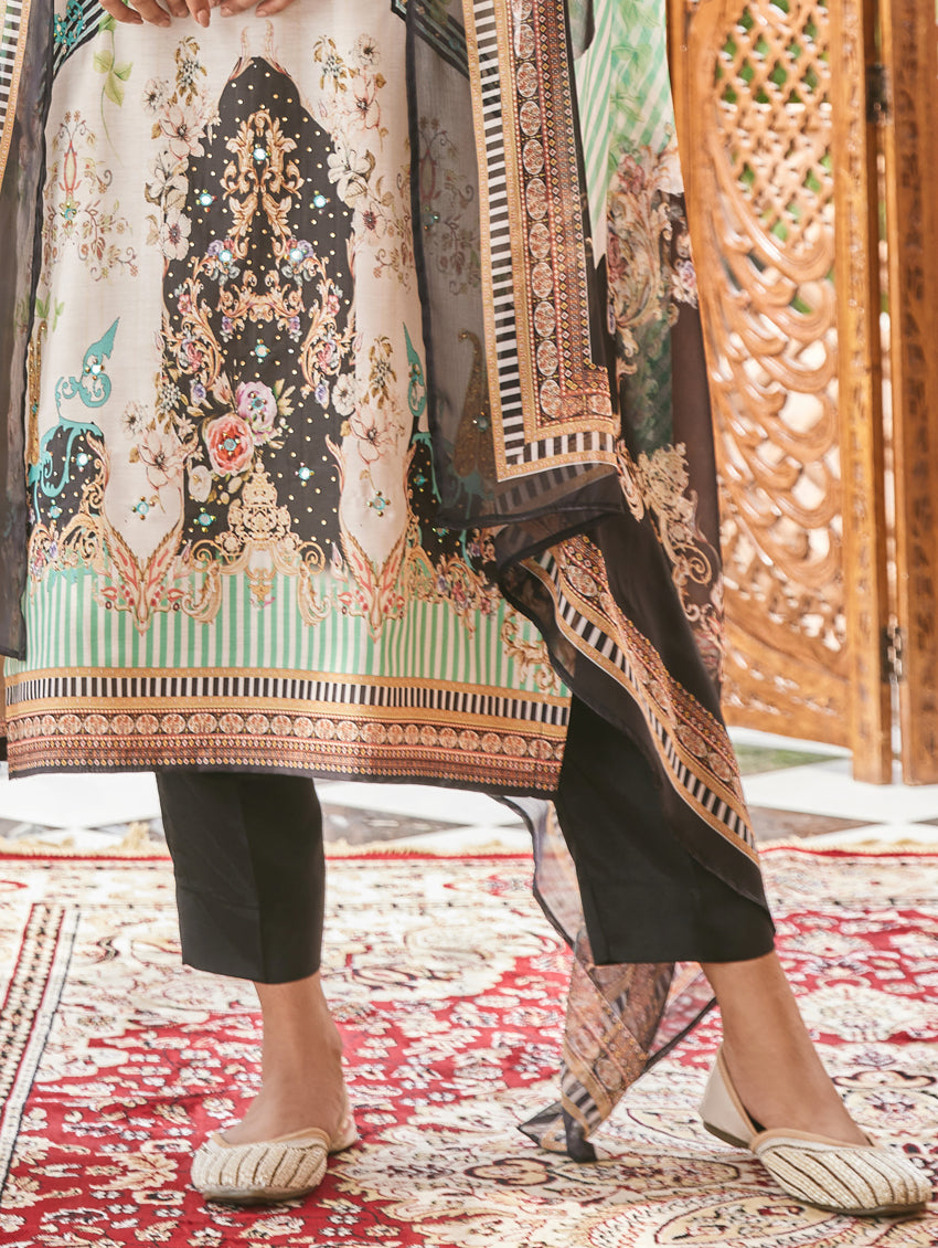 A straight-fit suit set from our latest collection. The set combines a digitally printed silk kurta with computerized thread embroidery, hand embroidery, straight pants, and a digitally printed silk dupatta.