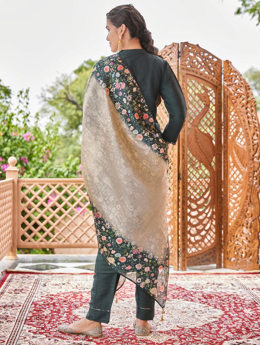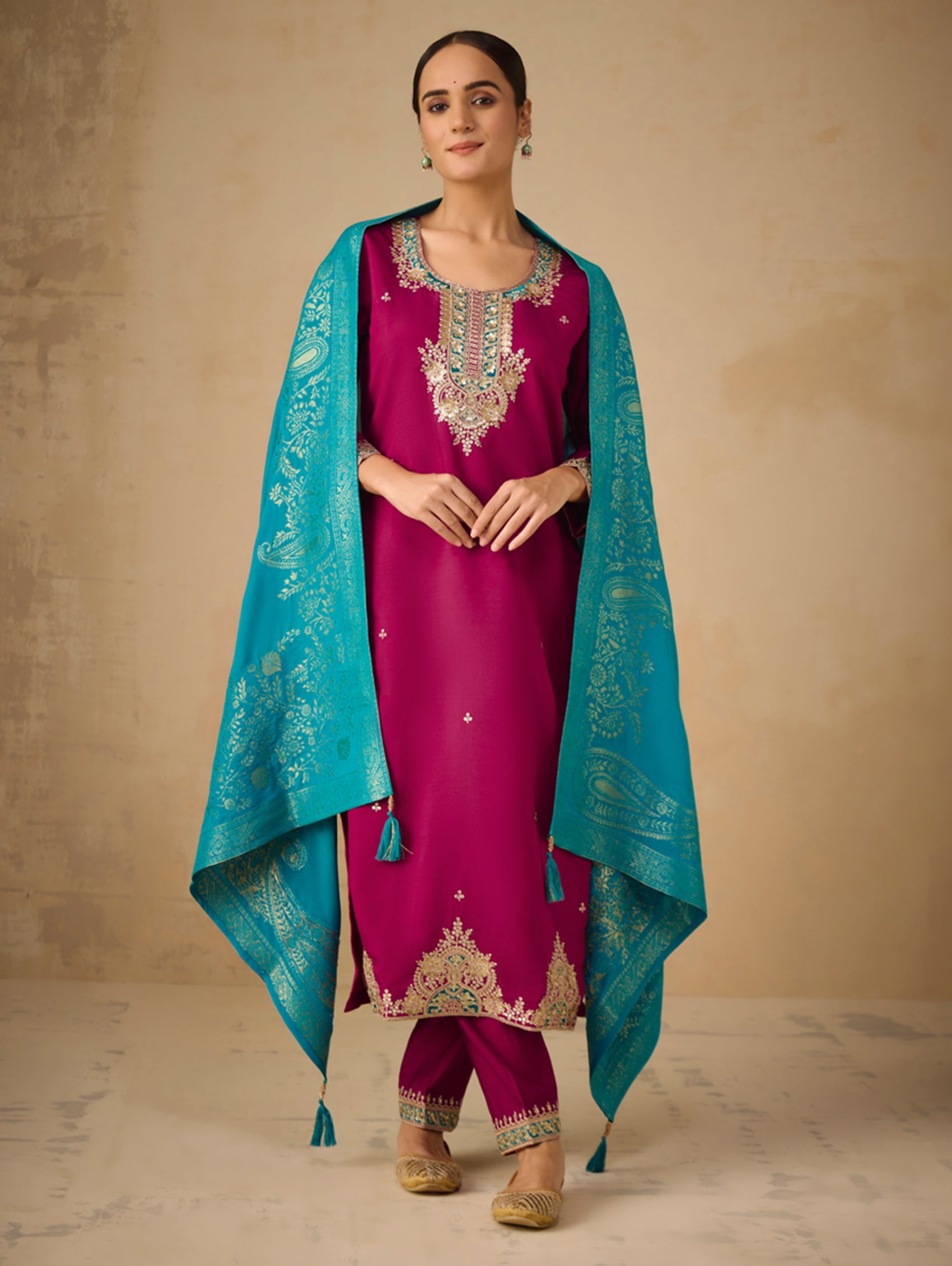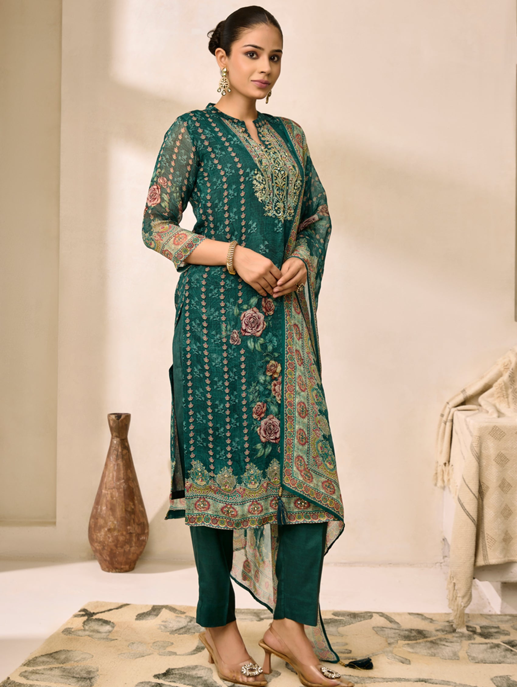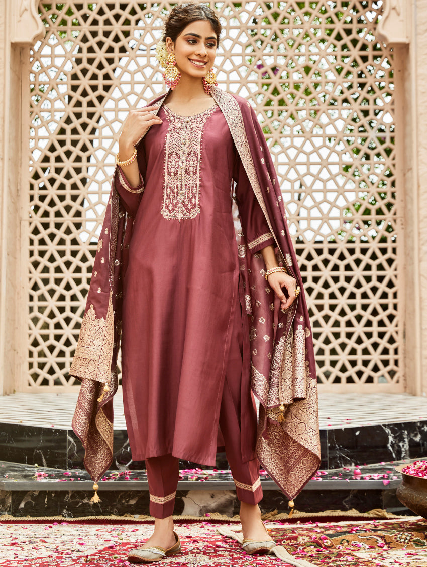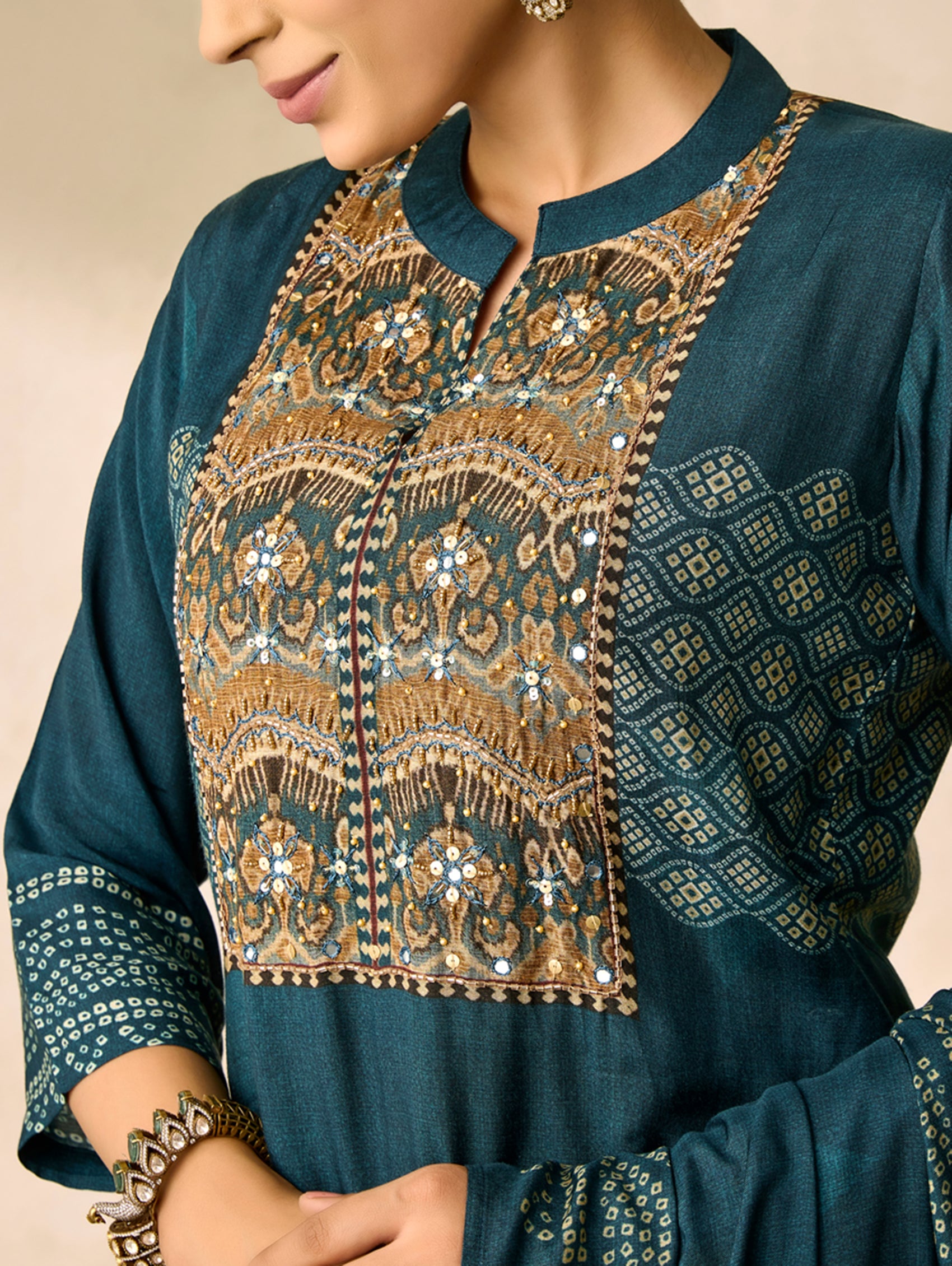 A straight-fit suit set from our latest collection. The set combines a digitally printed silk kurta with computerized thread embroidery, hand embroidery, straight pants, and a digitally printed silk dupatta.