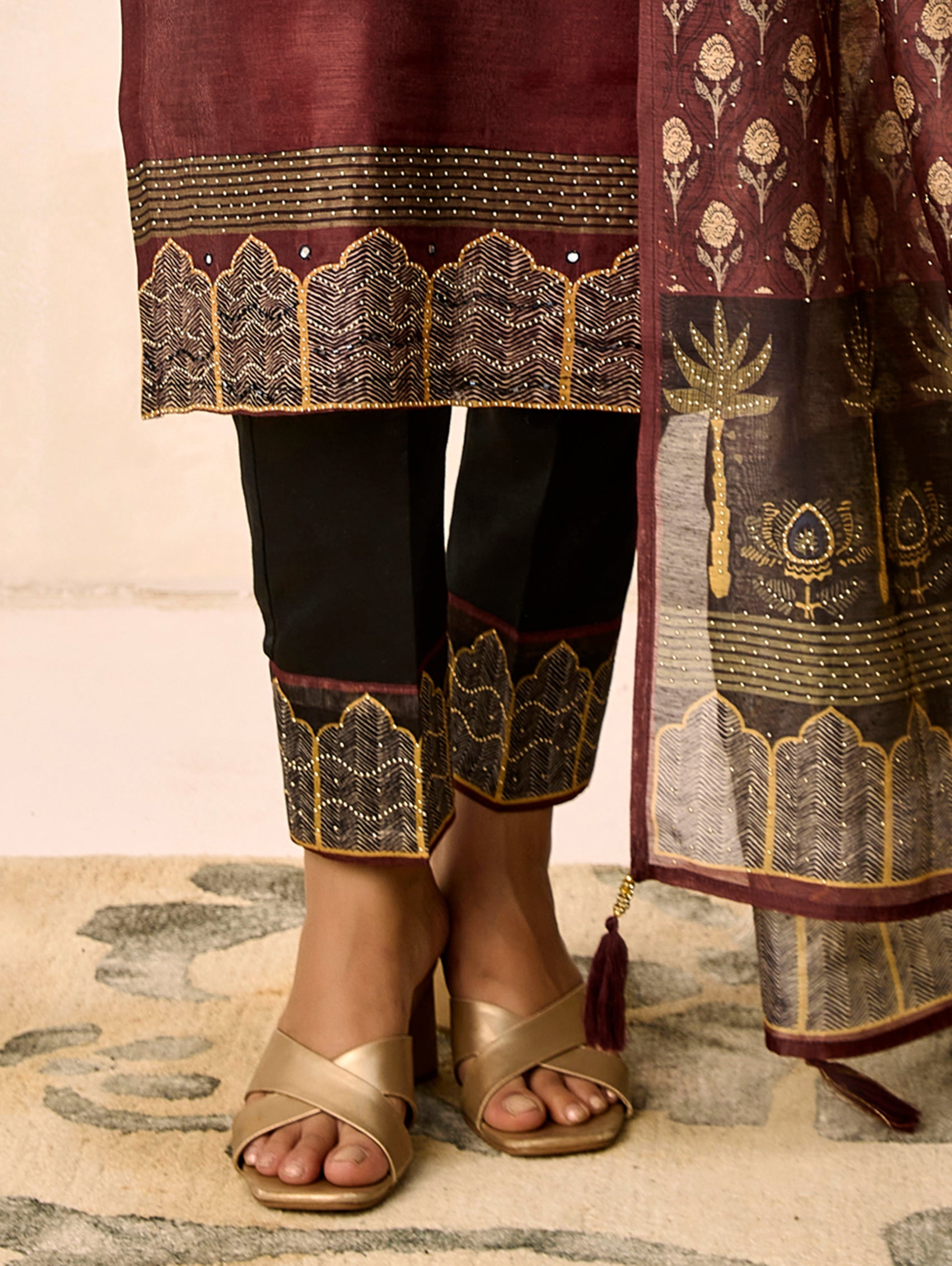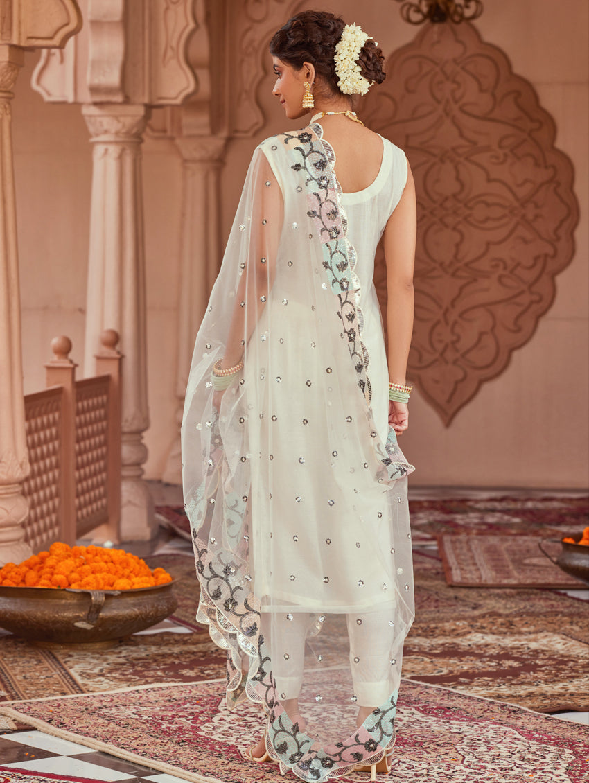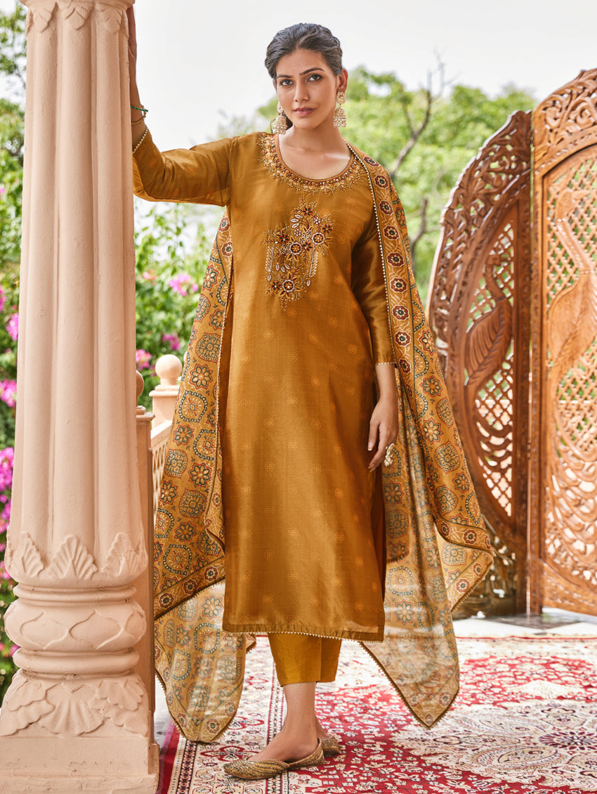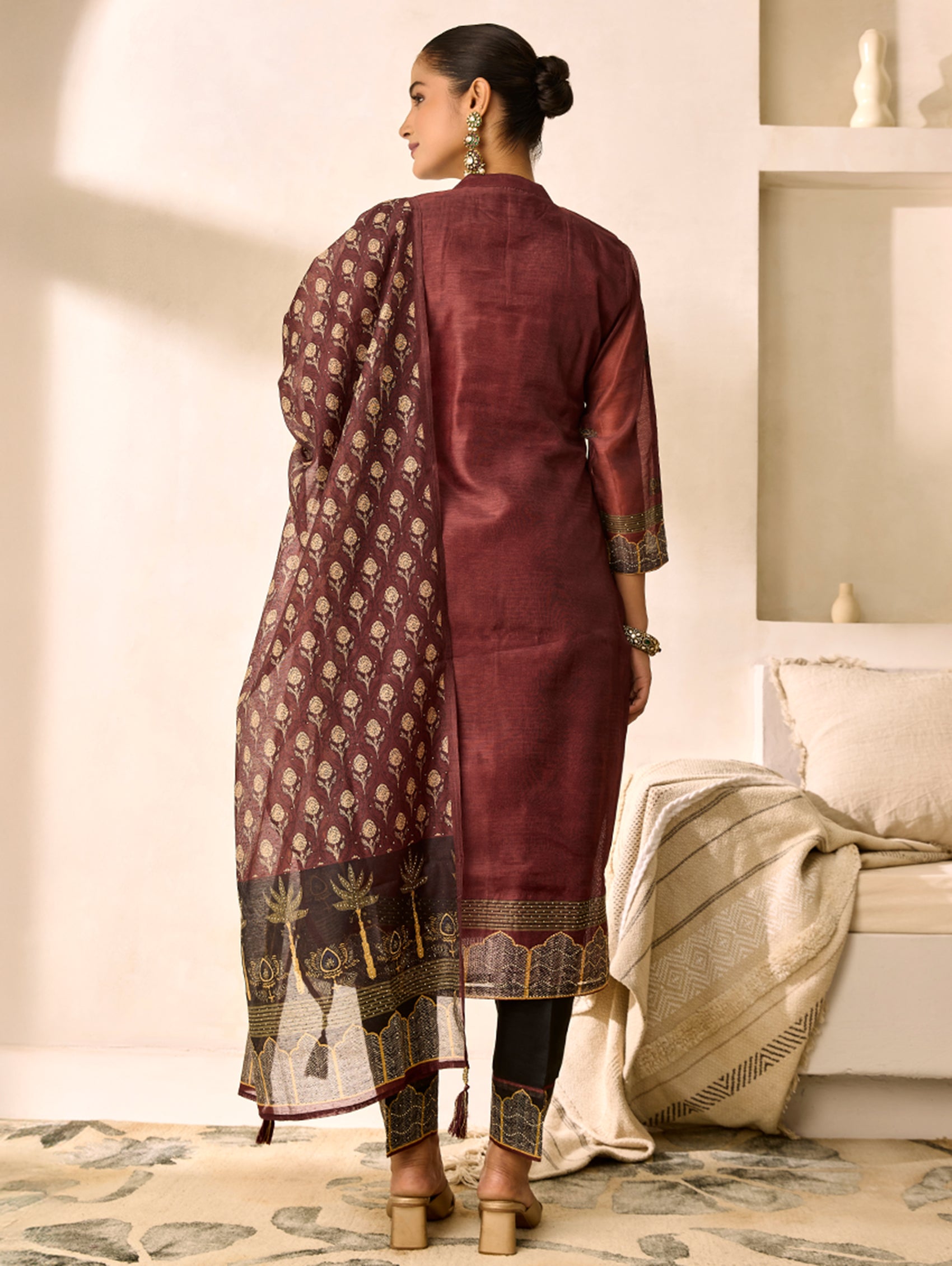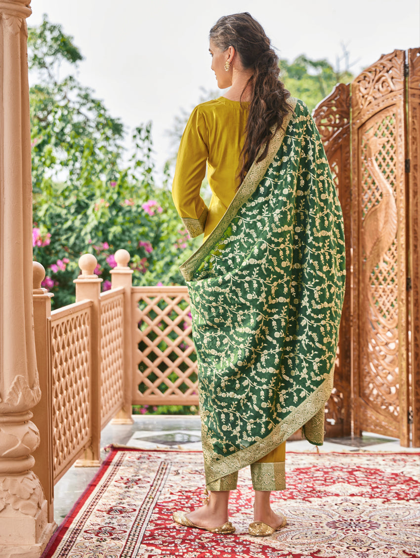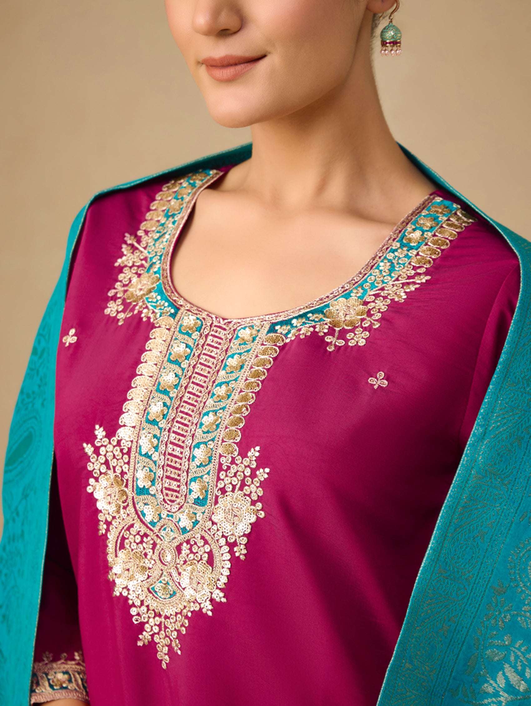 A straight-fit suit set from our latest collection. The set combines a digitally printed silk kurta with computerized thread embroidery, hand embroidery, straight pants, and a digitally printed silk dupatta.