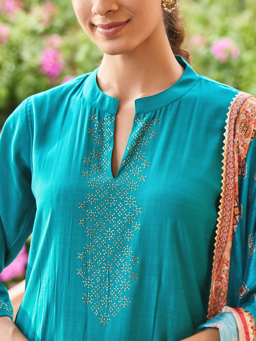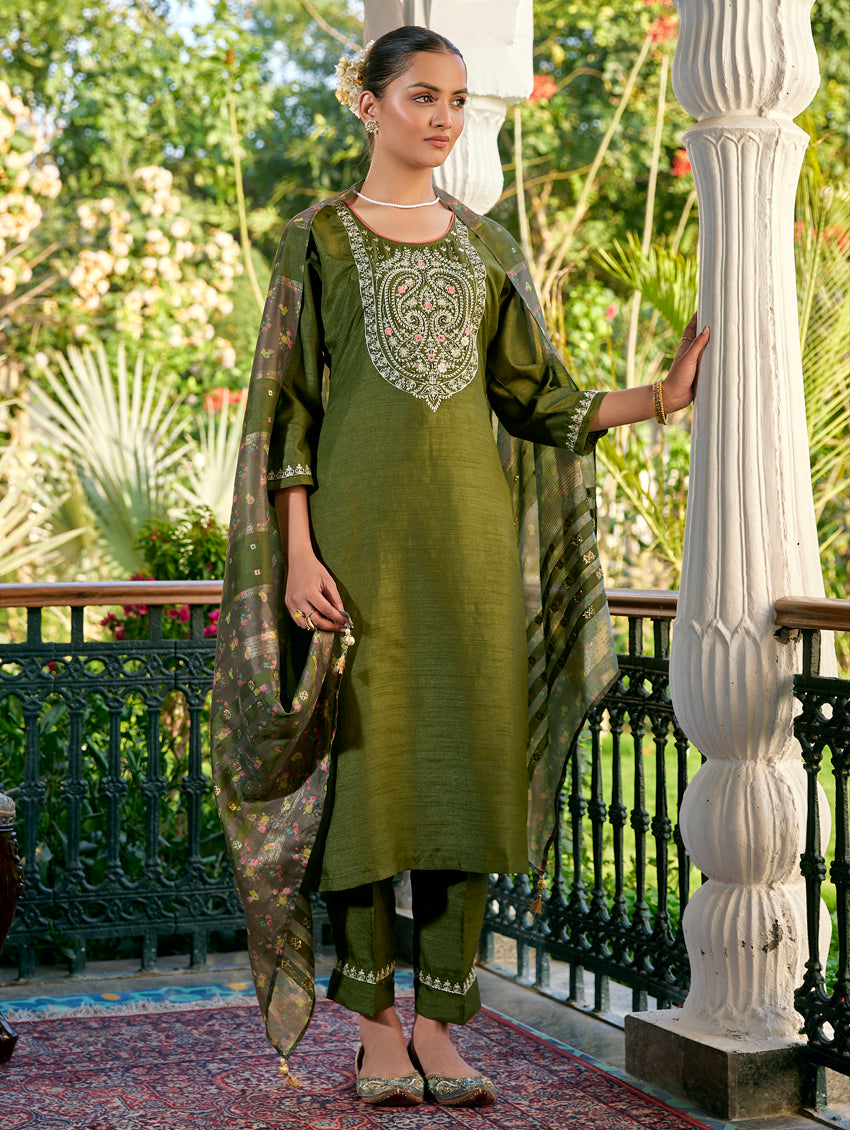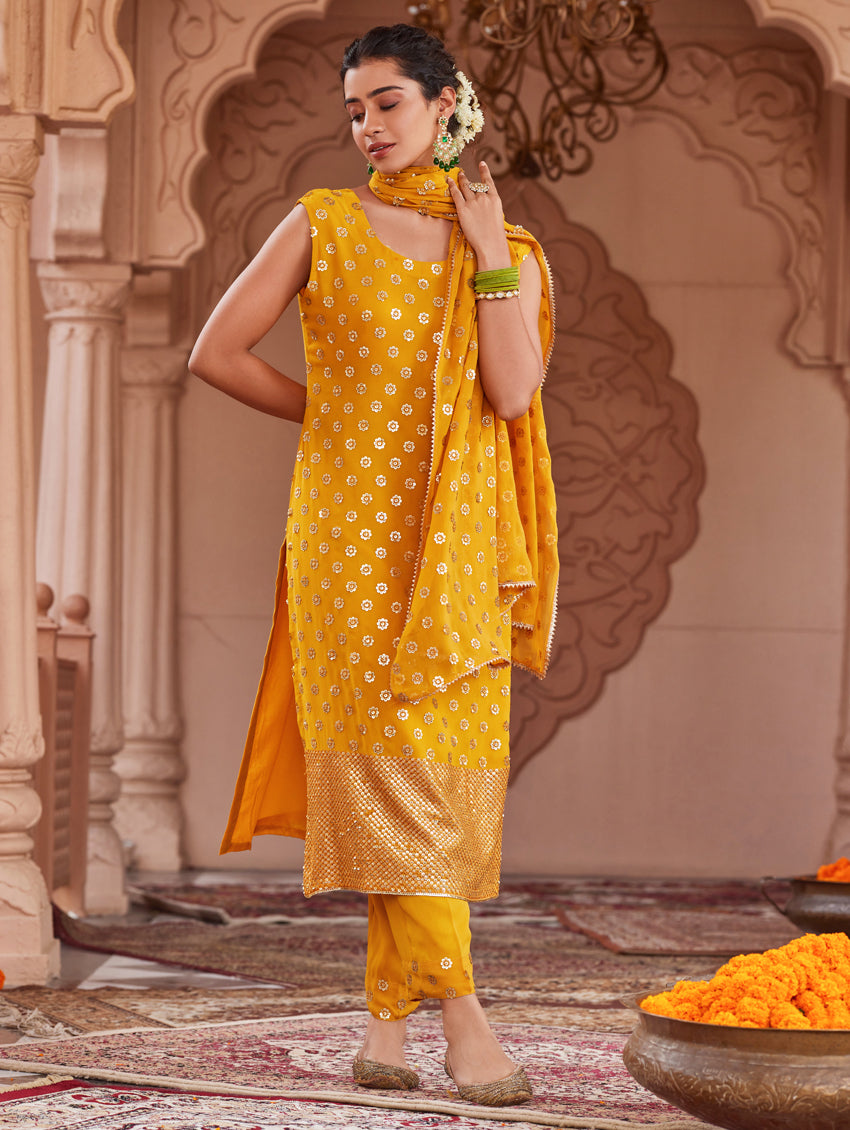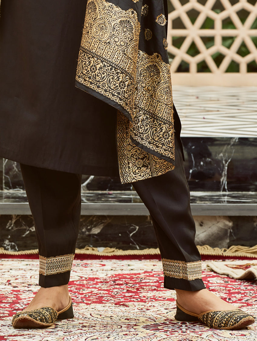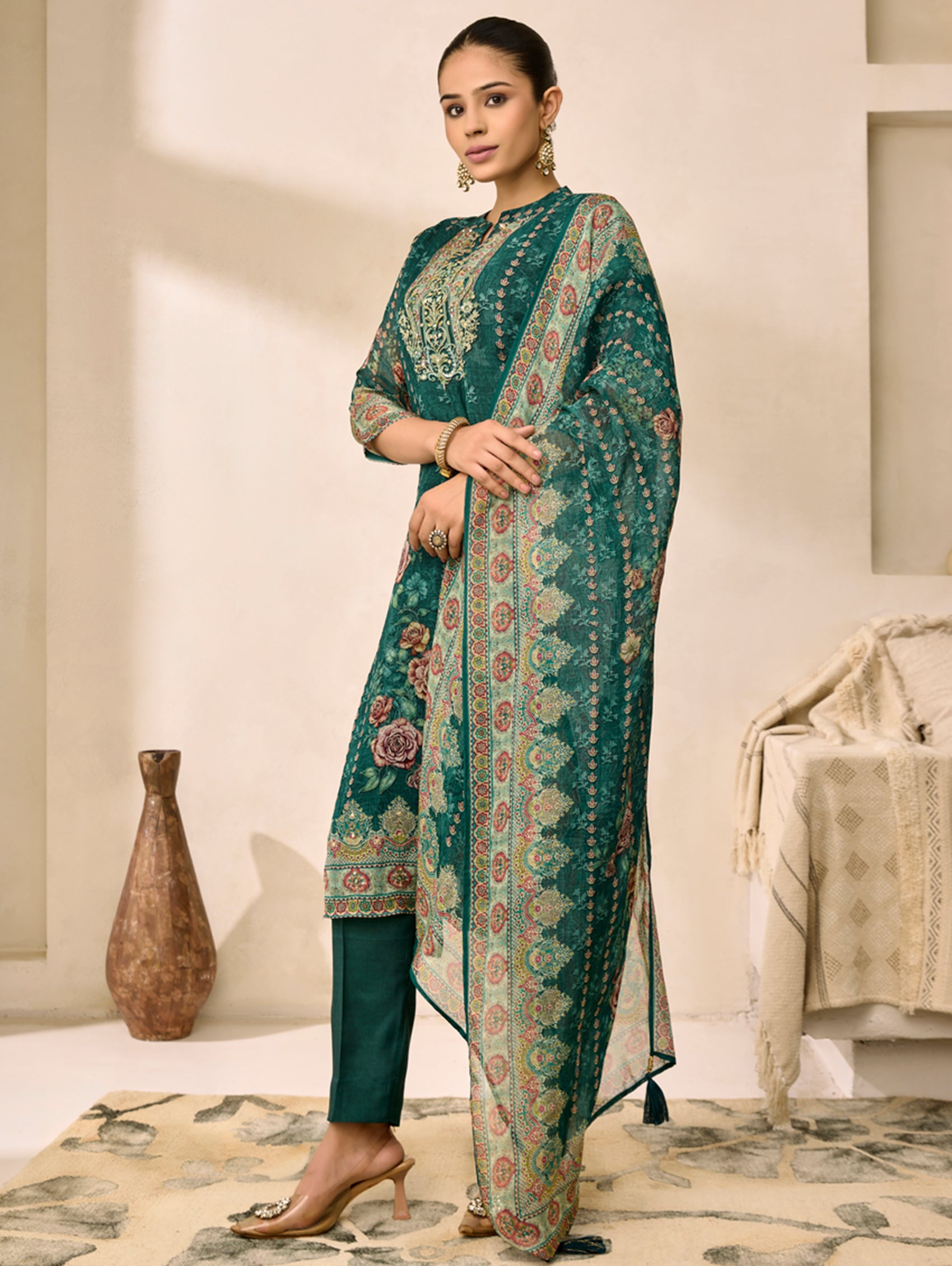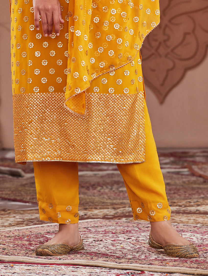 A straight-fit suit set from our latest collection. The set combines a digitally printed silk kurta with computerized thread embroidery, hand embroidery, straight pants, and a digitally printed silk dupatta.