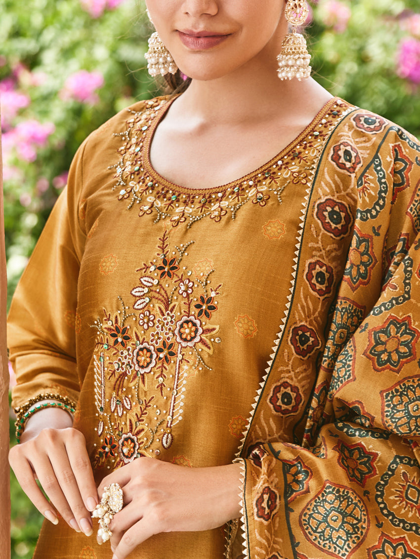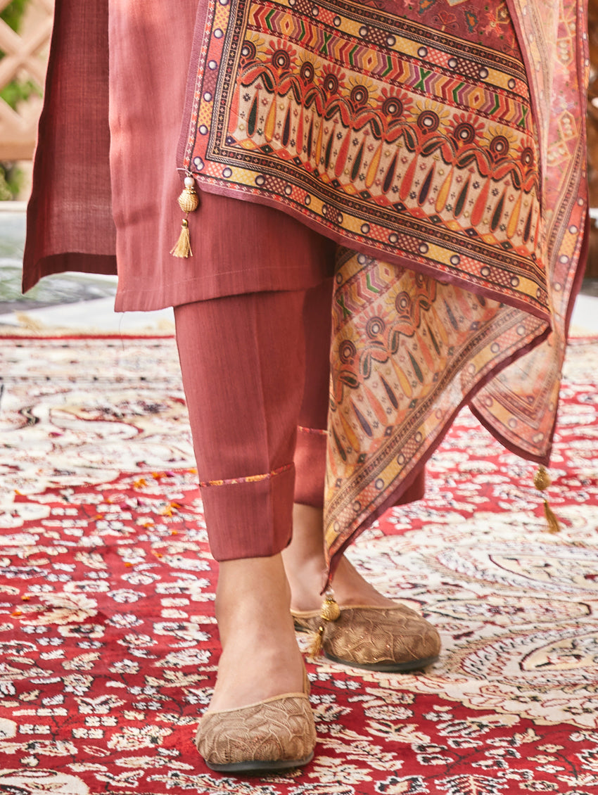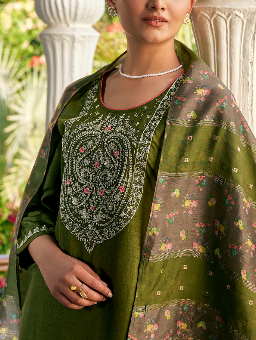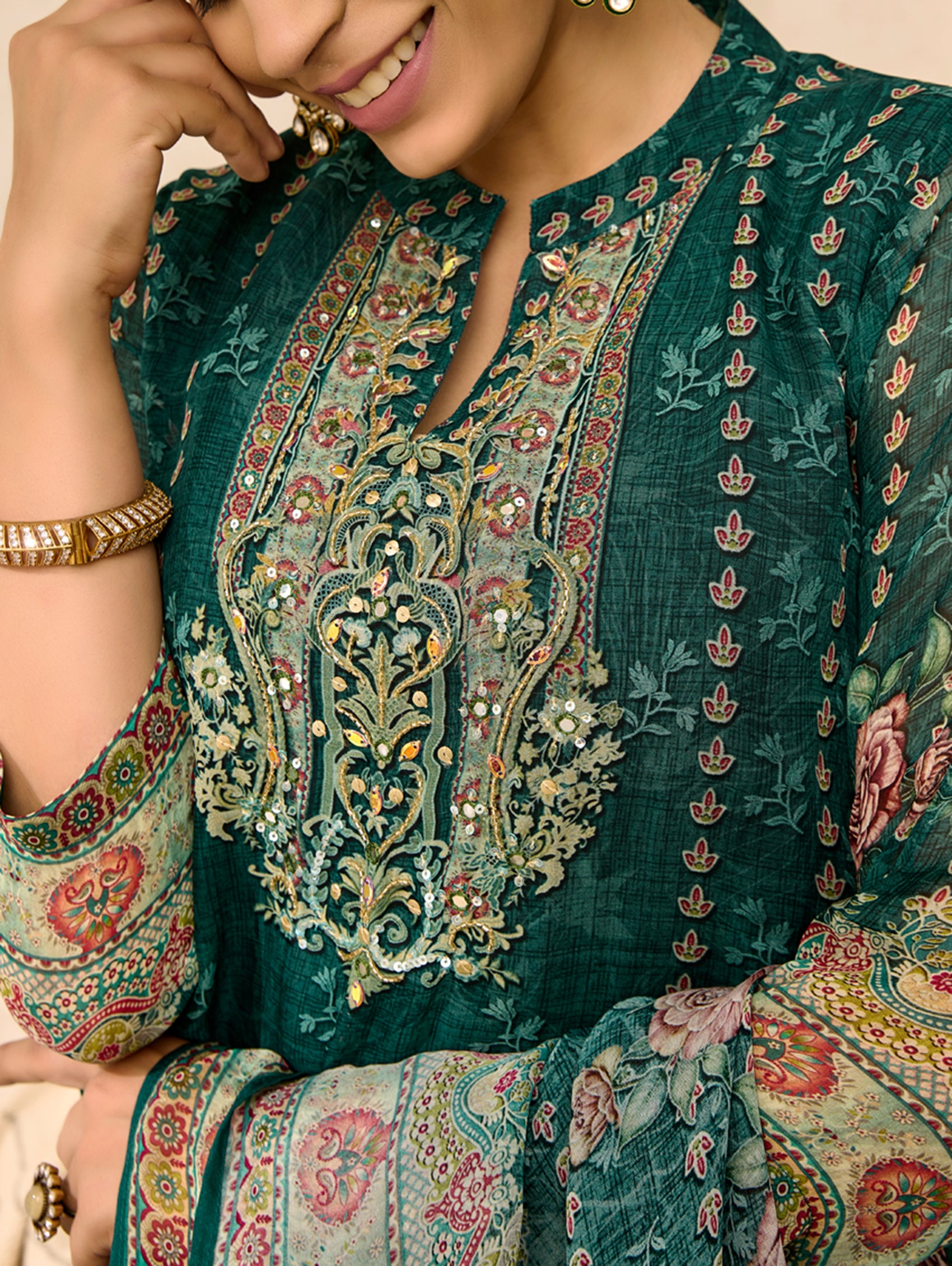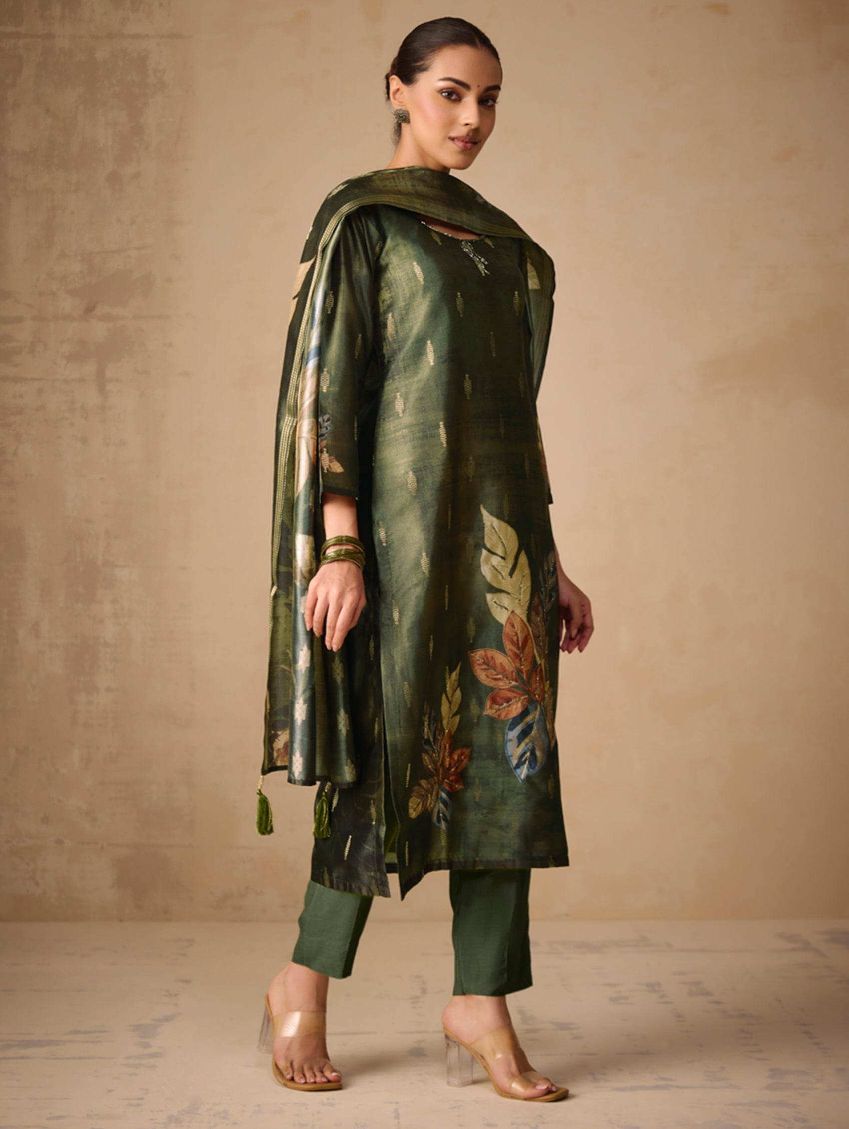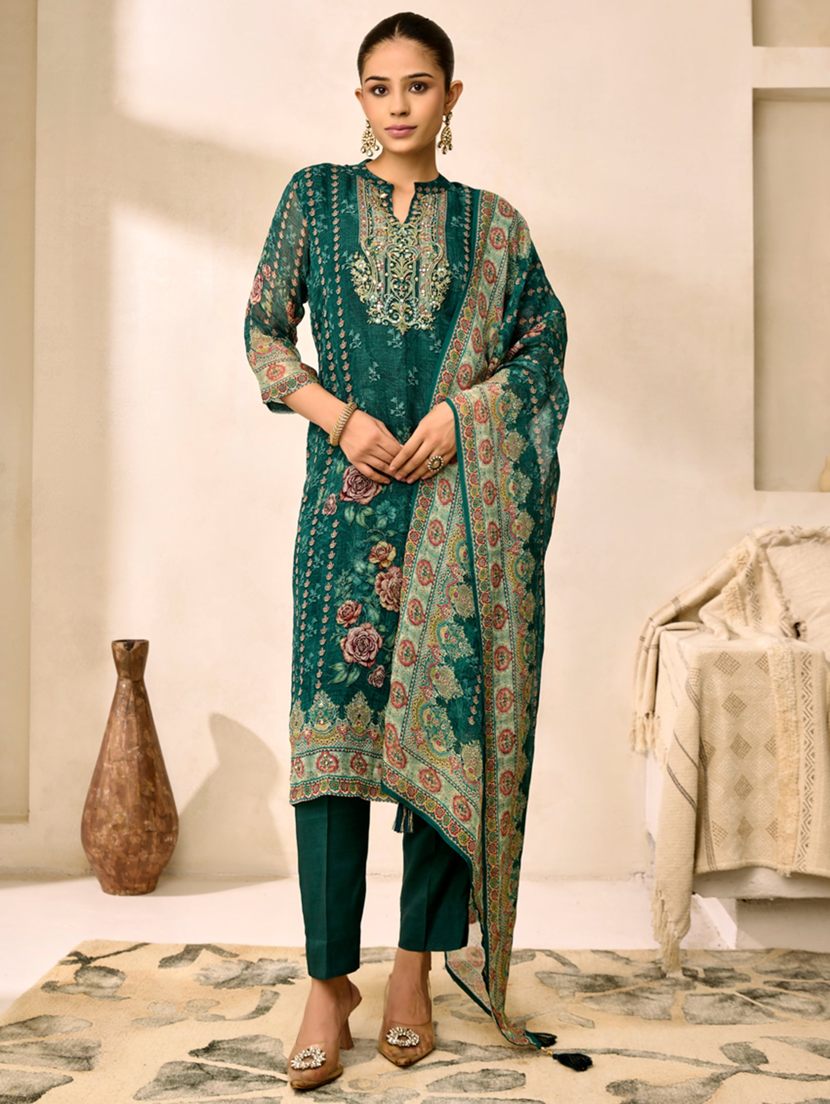 A straight-fit suit set from our latest collection. The set combines a digitally printed silk kurta with computerized thread embroidery, hand embroidery, straight pants, and a digitally printed silk dupatta.