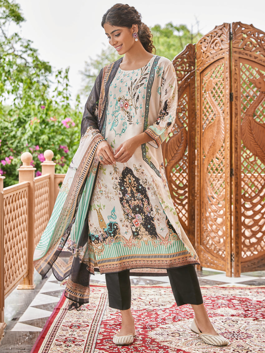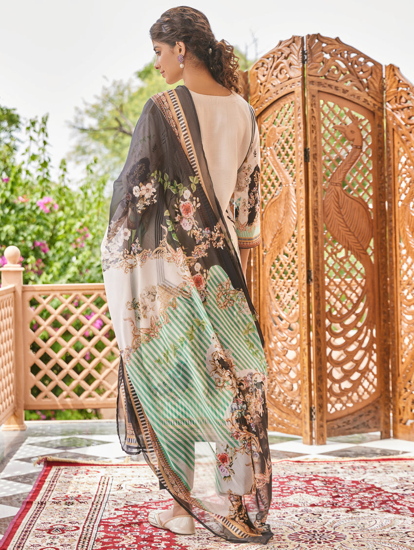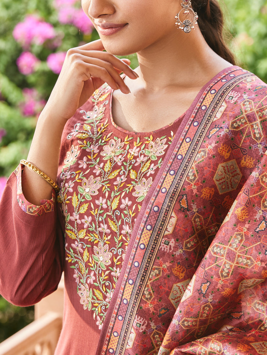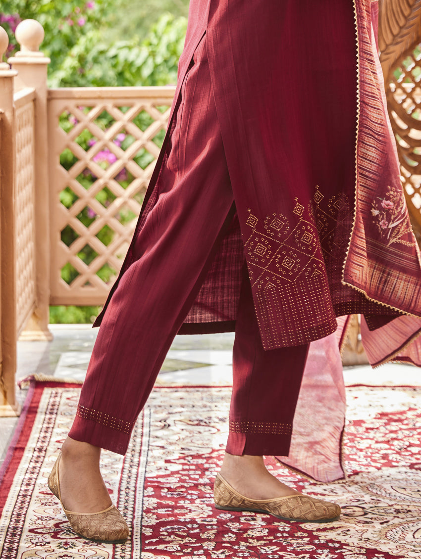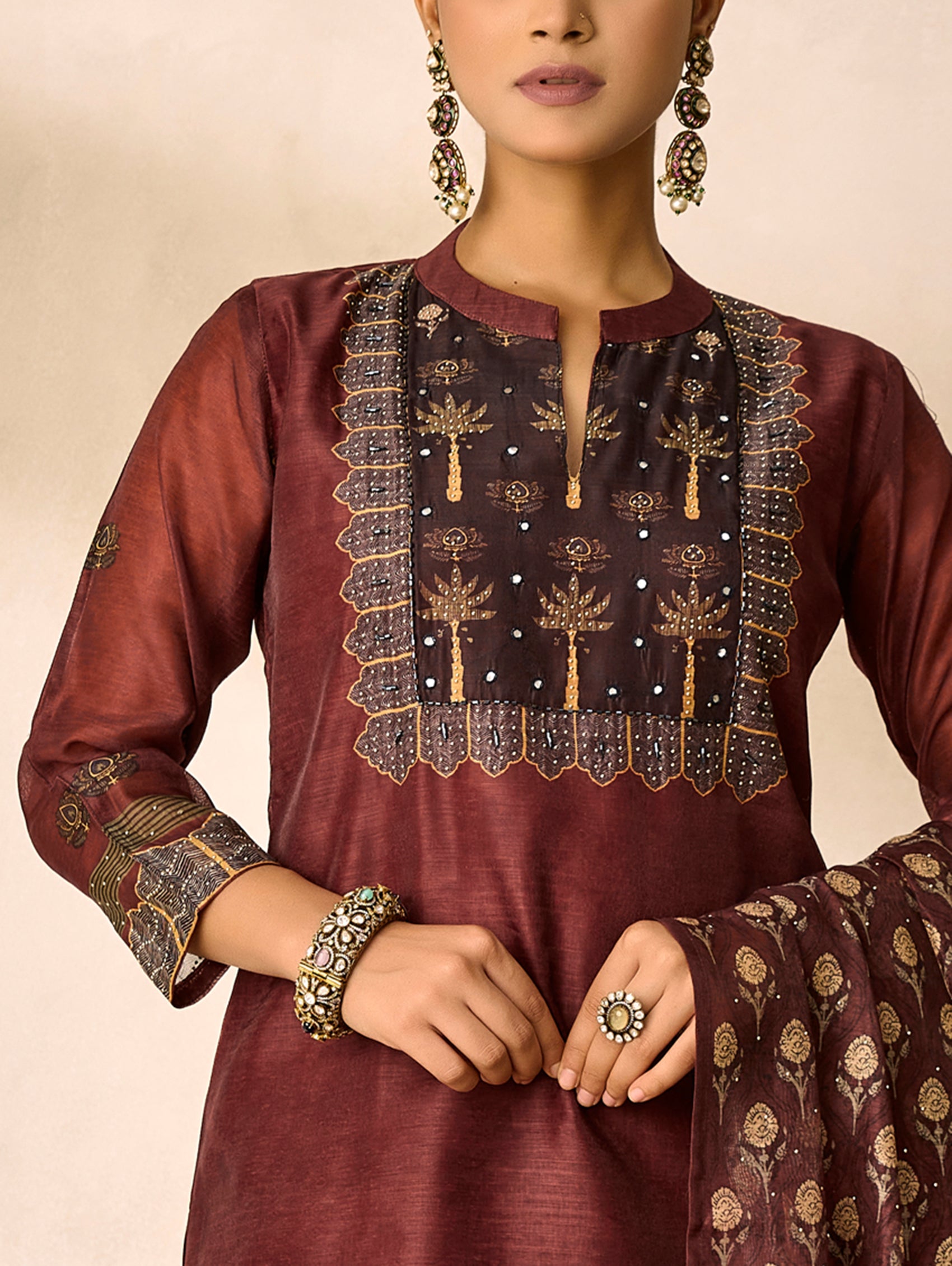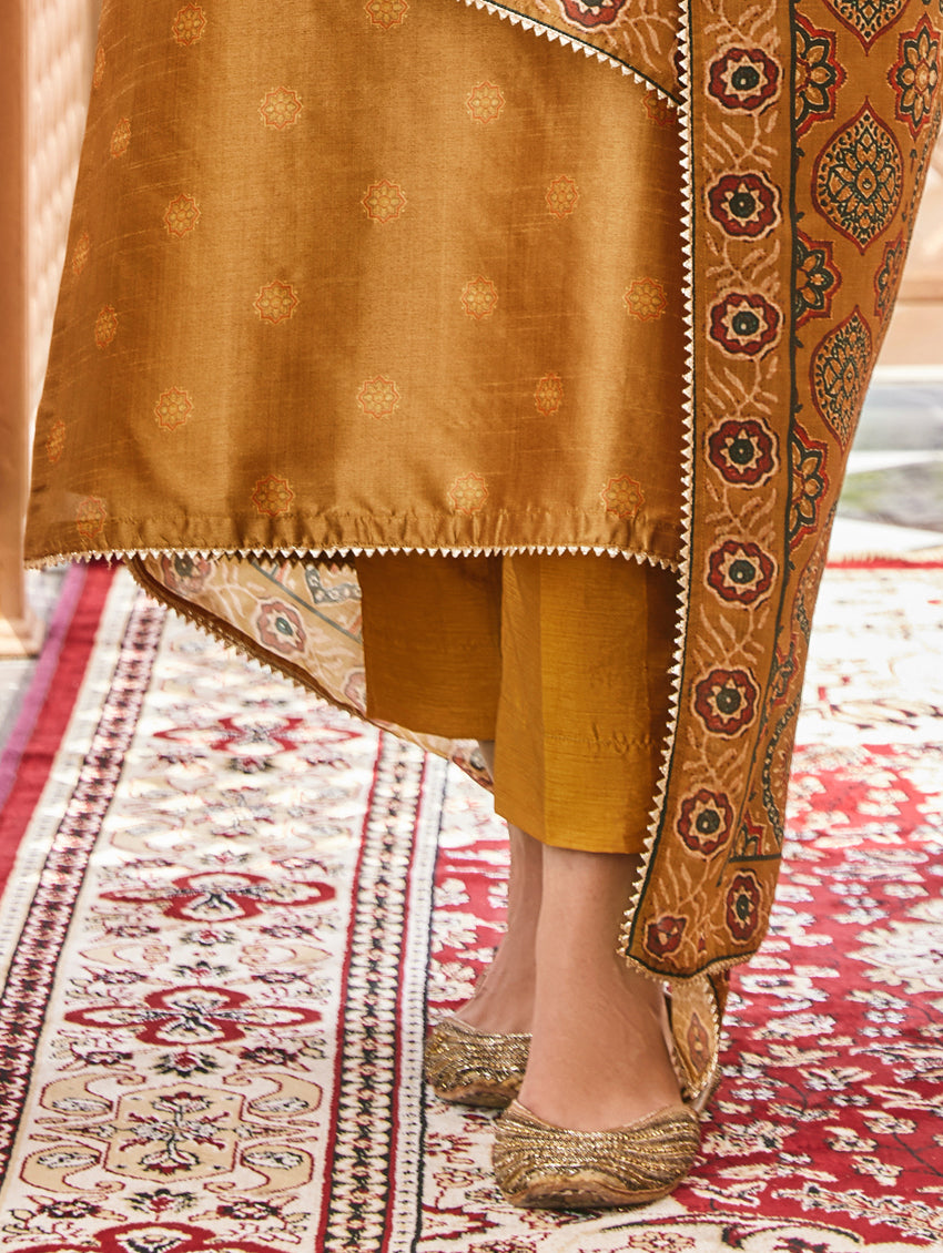 A straight-fit suit set from our latest collection. The set combines a digitally printed silk kurta with computerized thread embroidery, hand embroidery, straight pants, and a digitally printed silk dupatta.
