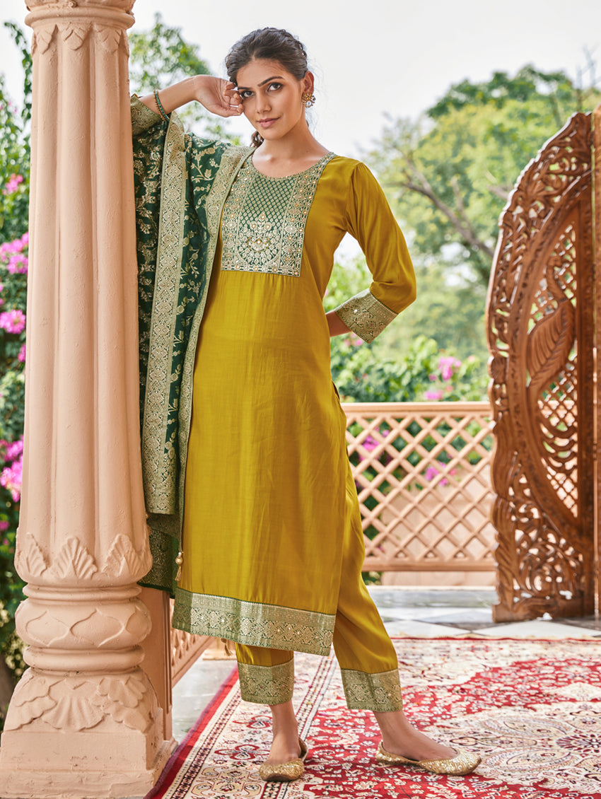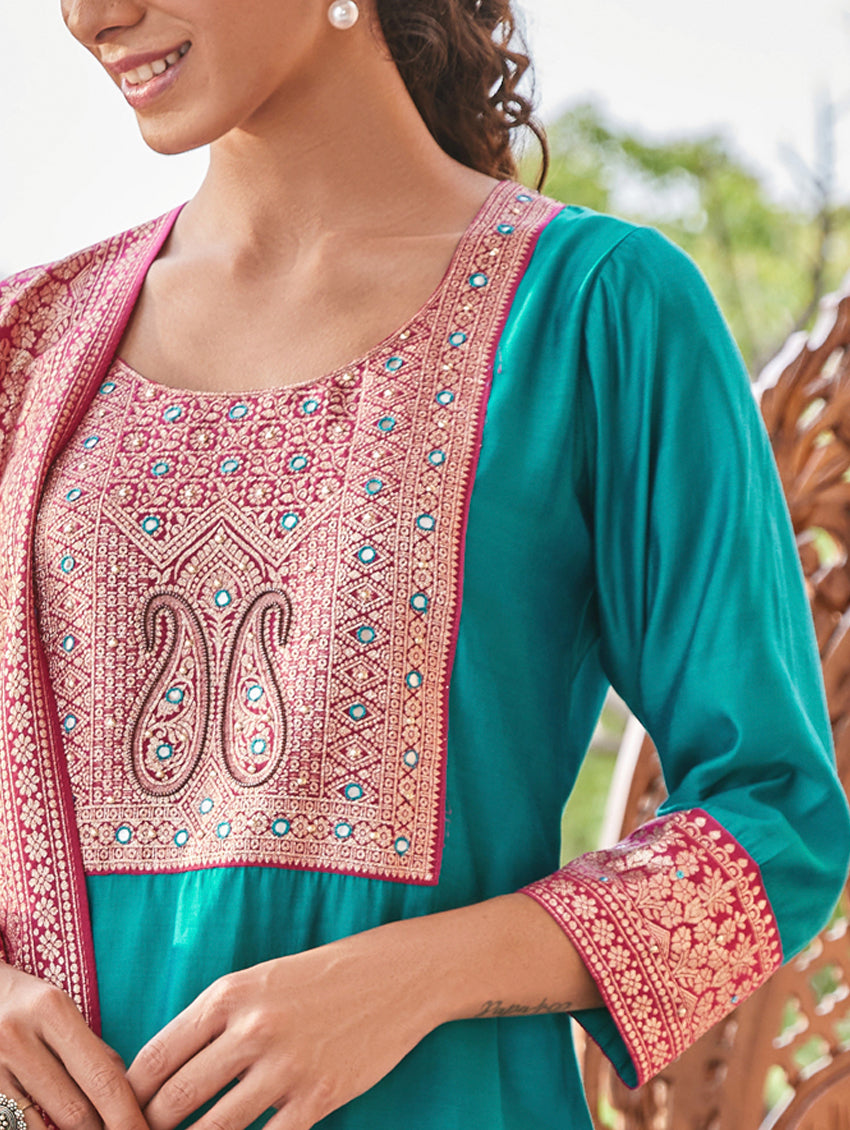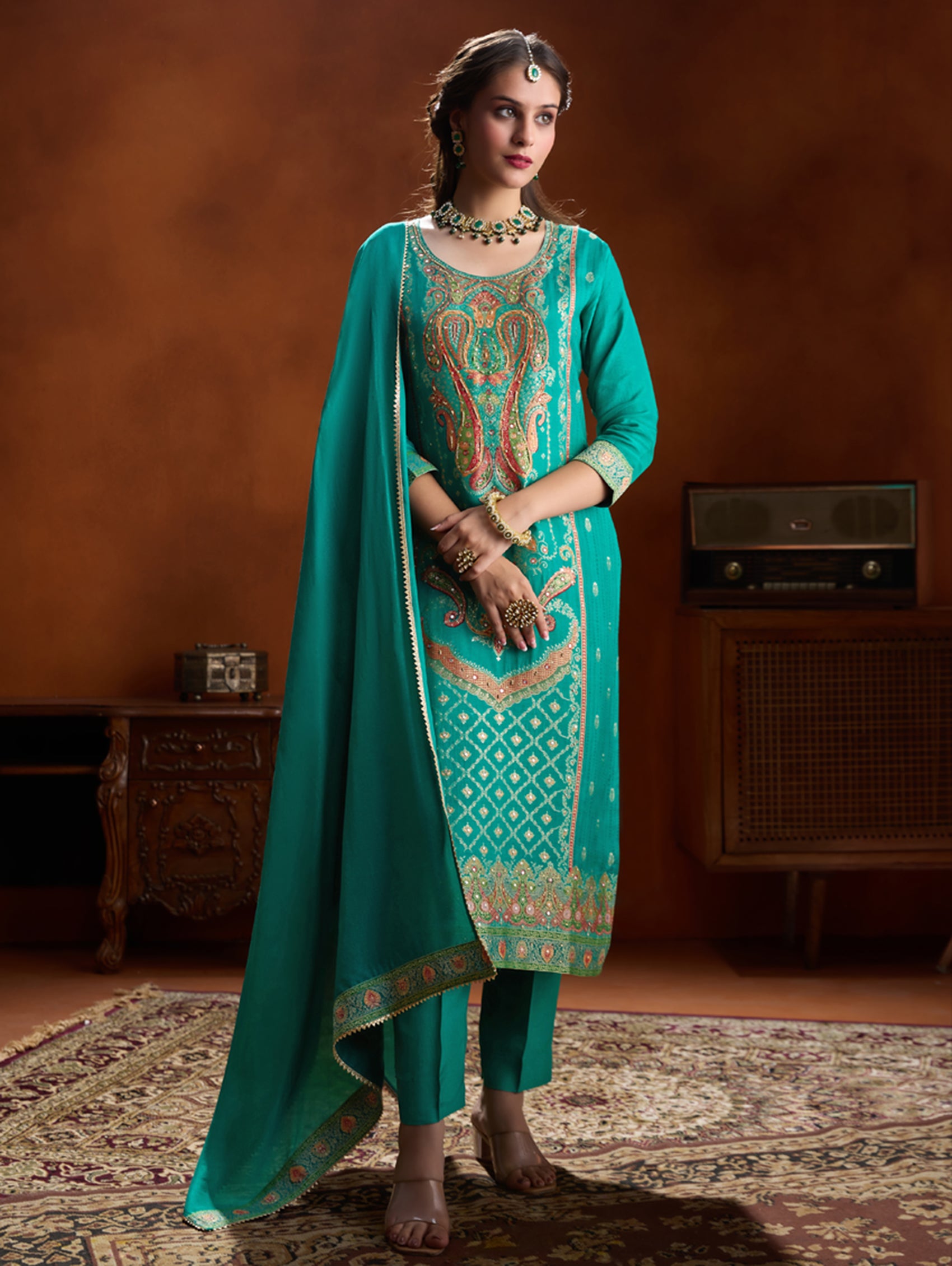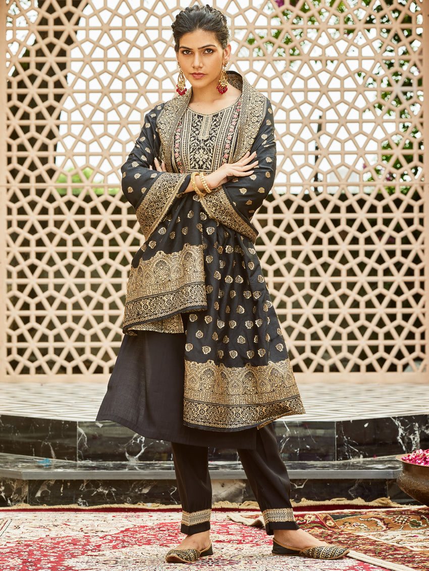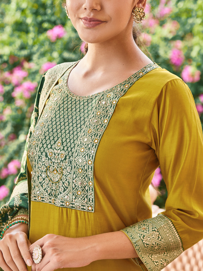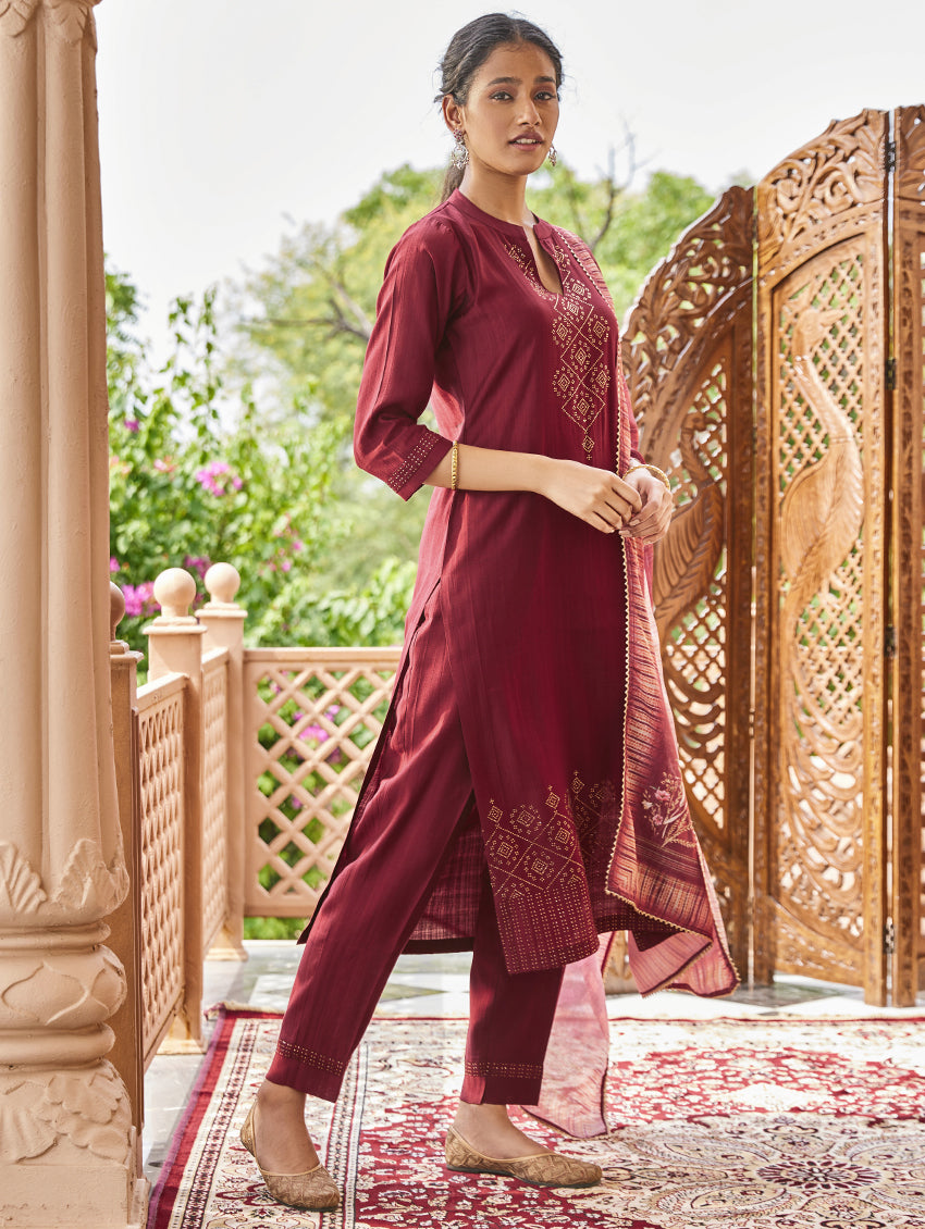 A straight-fit suit set from our latest collection. The set combines a digitally printed silk kurta with computerized thread embroidery, hand embroidery, straight pants, and a digitally printed silk dupatta.