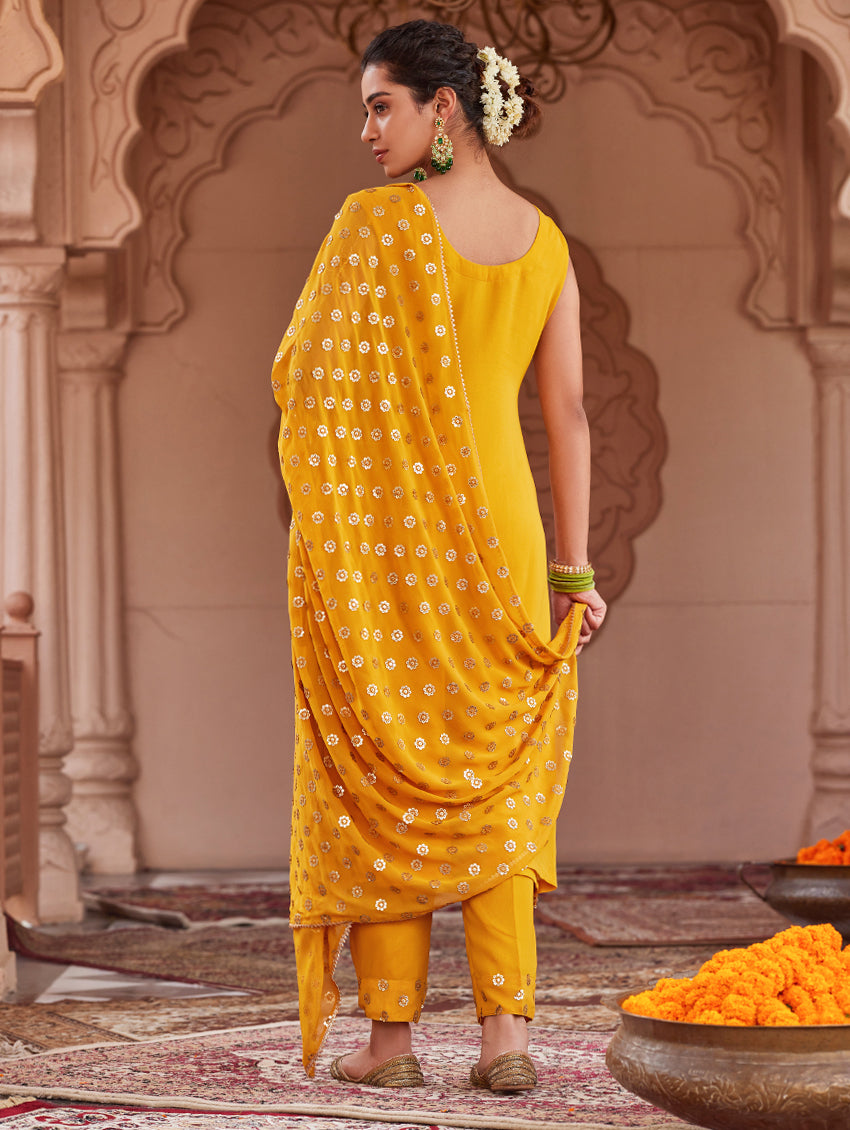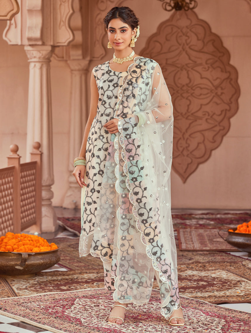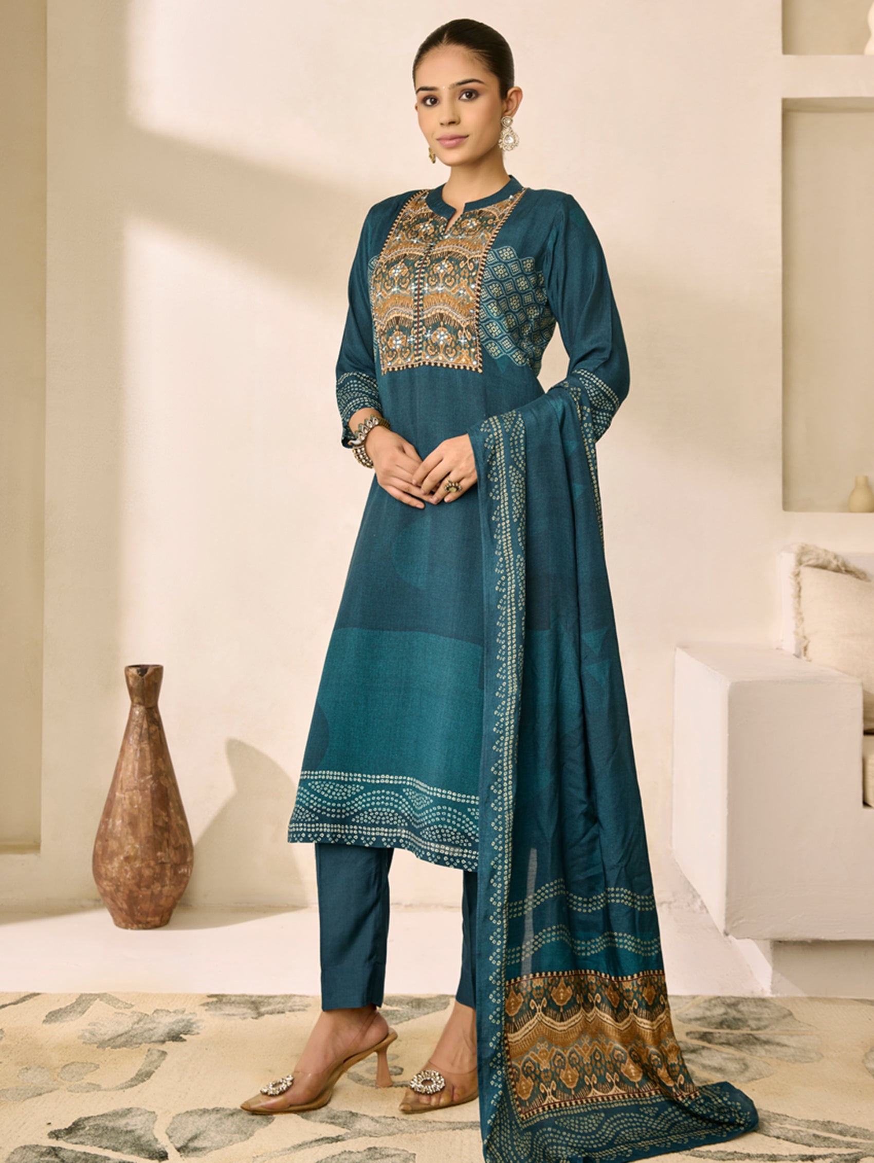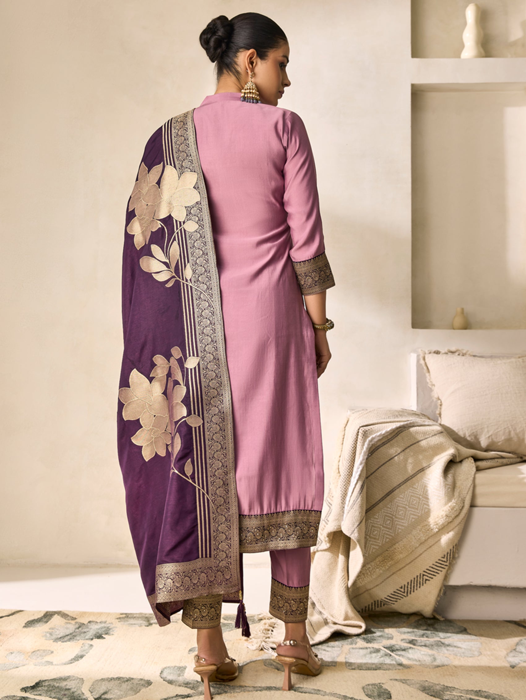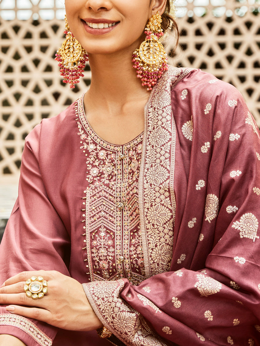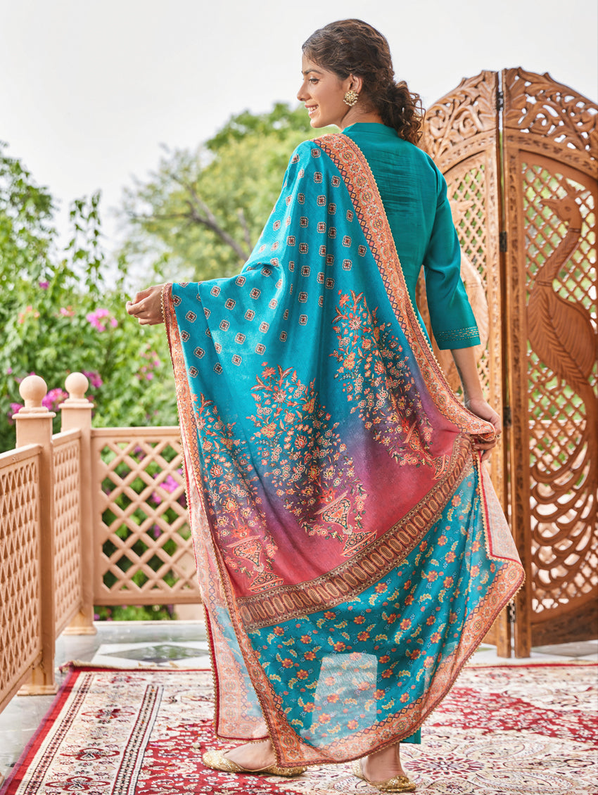 A straight-fit suit set from our latest collection. The set combines a digitally printed silk kurta with computerized thread embroidery, hand embroidery, straight pants, and a digitally printed silk dupatta.