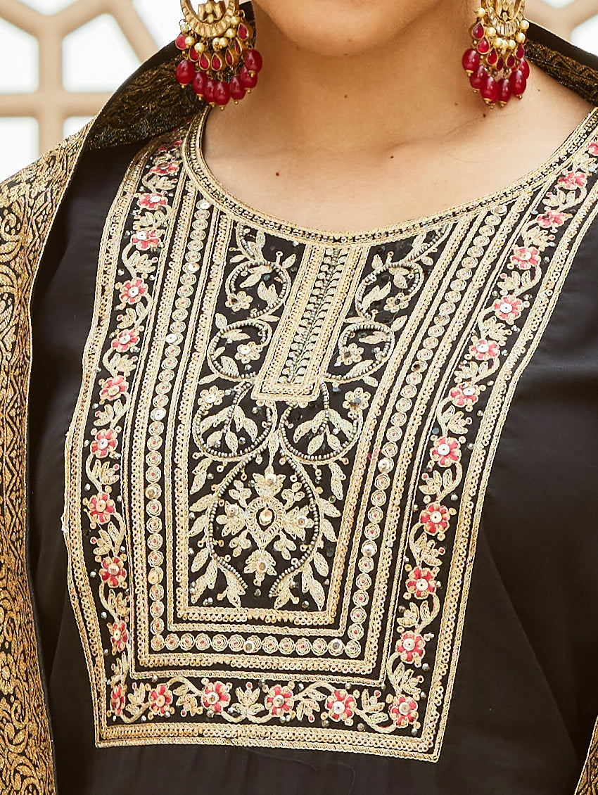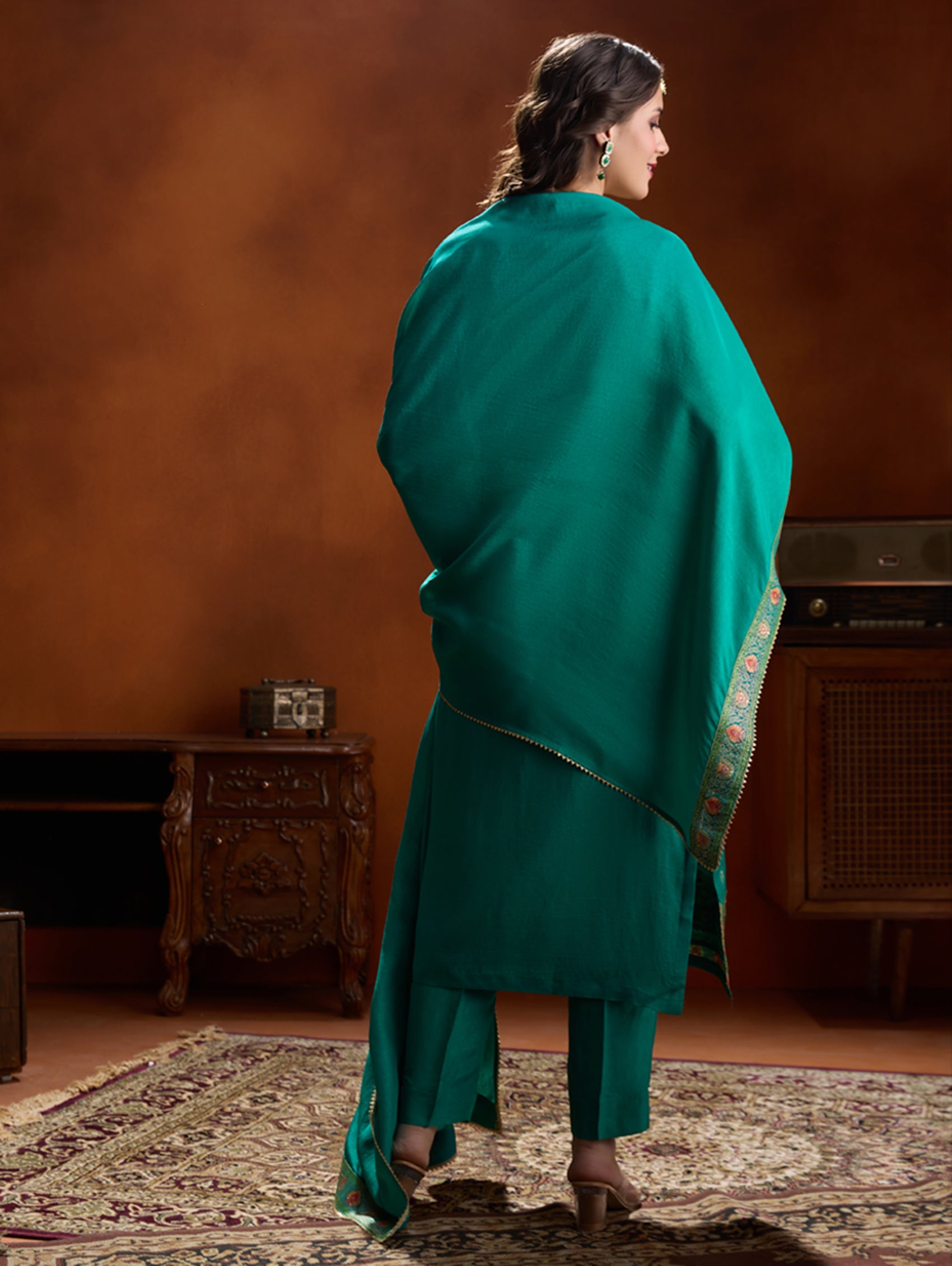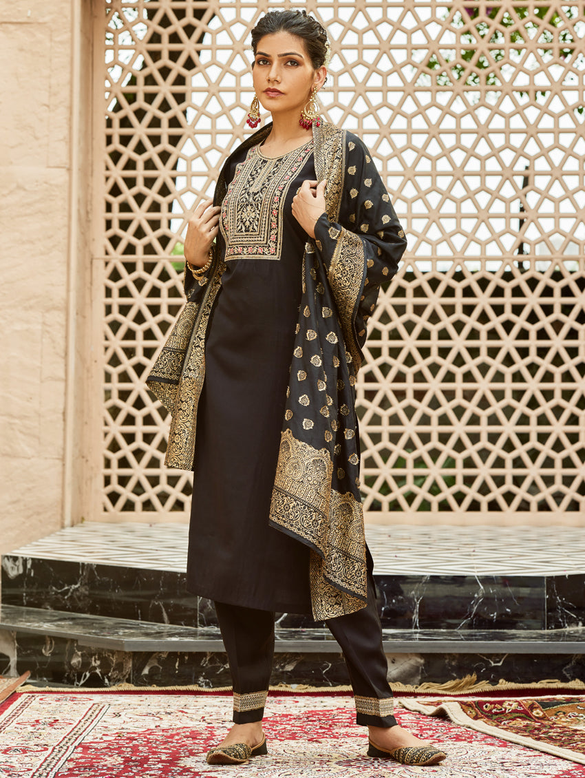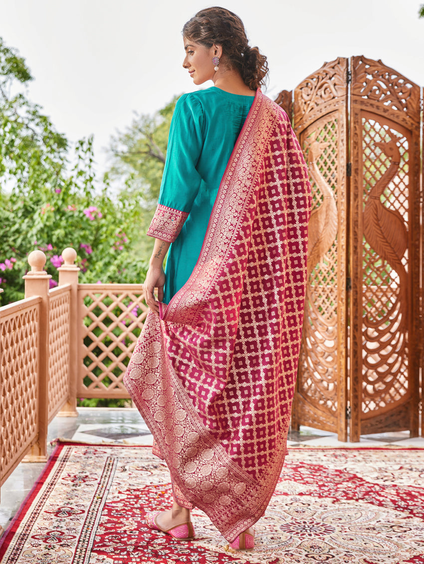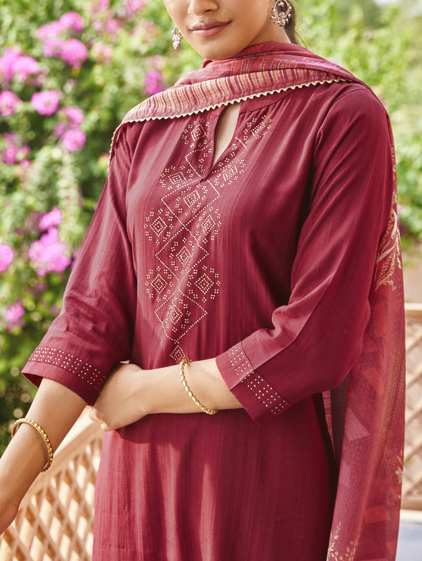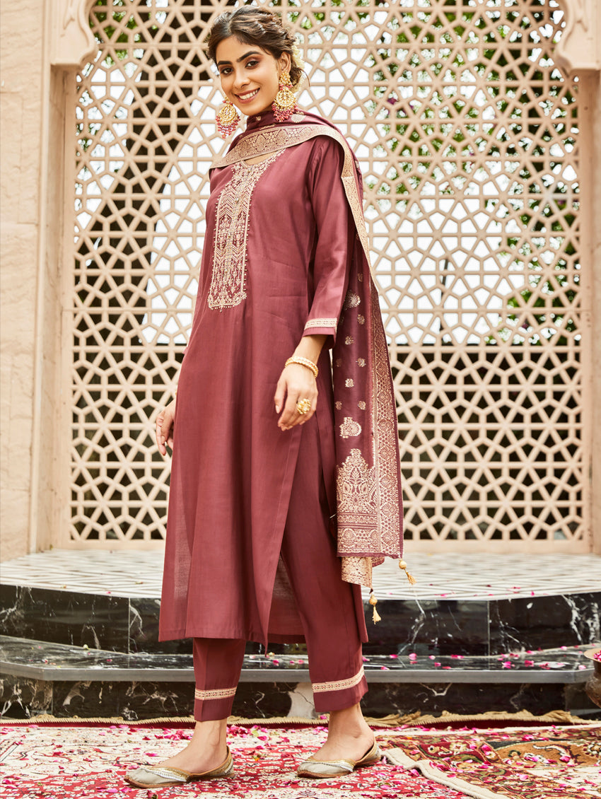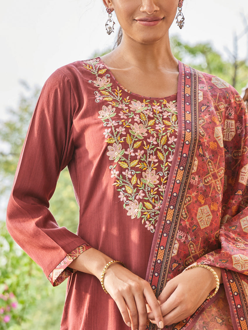 A straight-fit suit set from our latest collection. The set combines a digitally printed silk kurta with computerized thread embroidery, hand embroidery, straight pants, and a digitally printed silk dupatta.