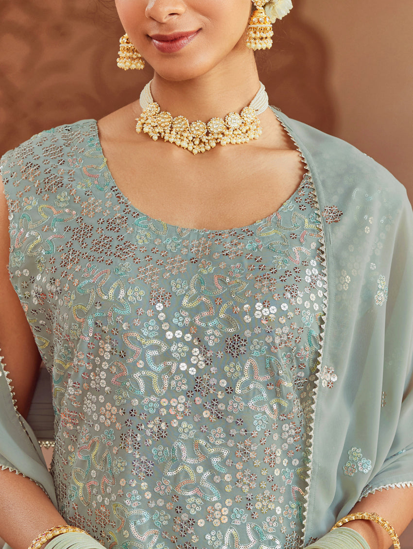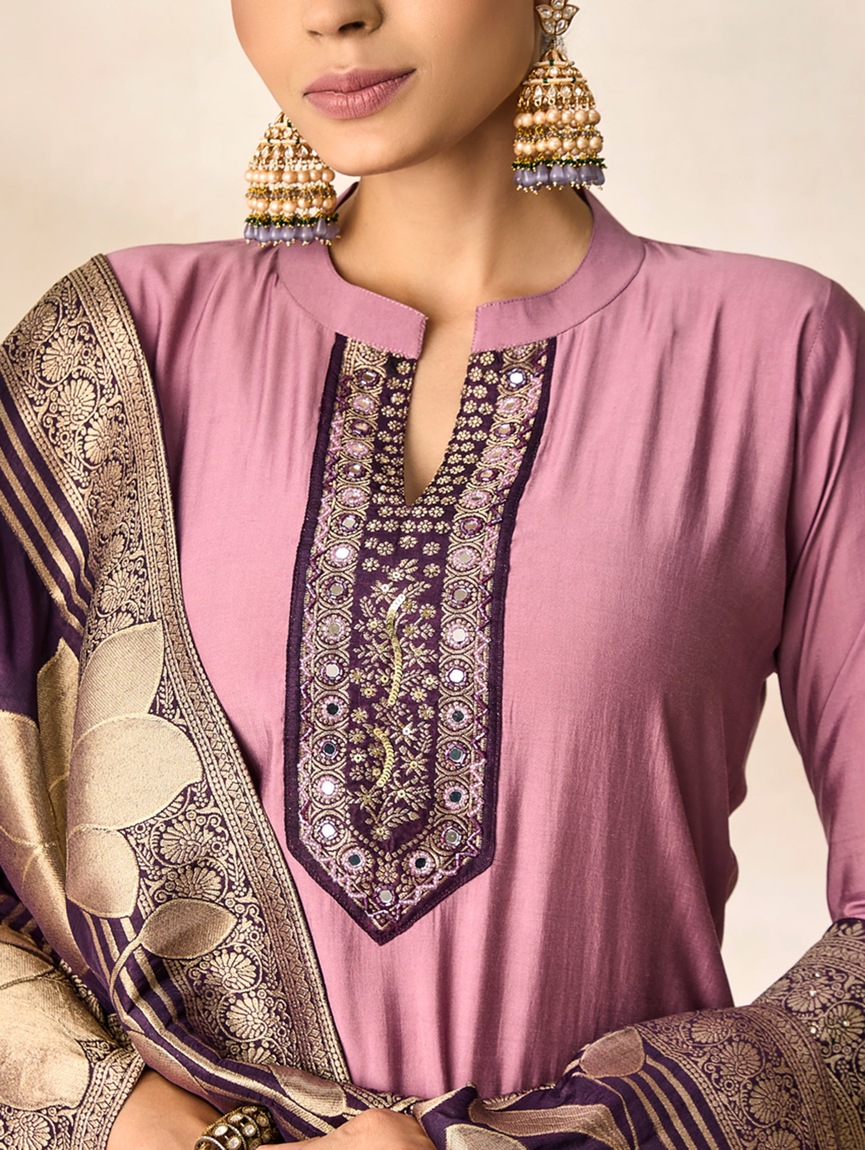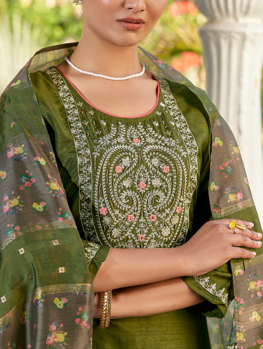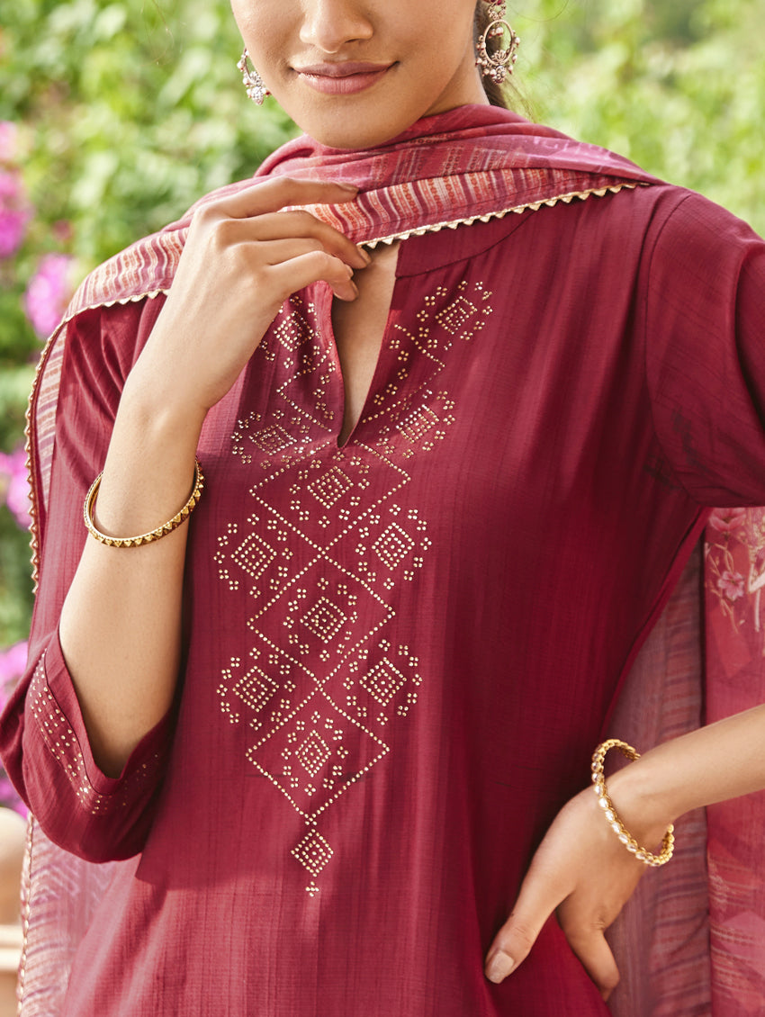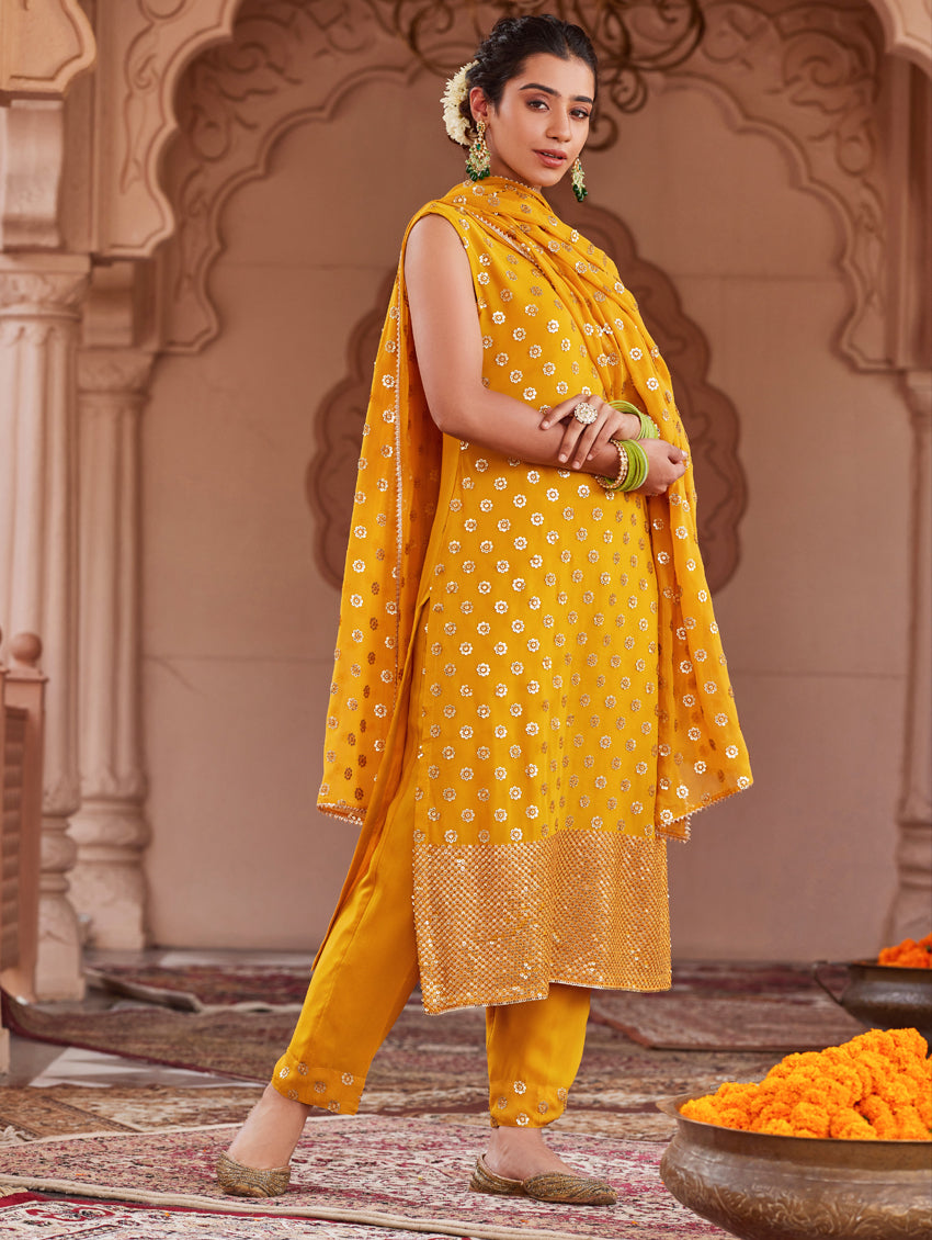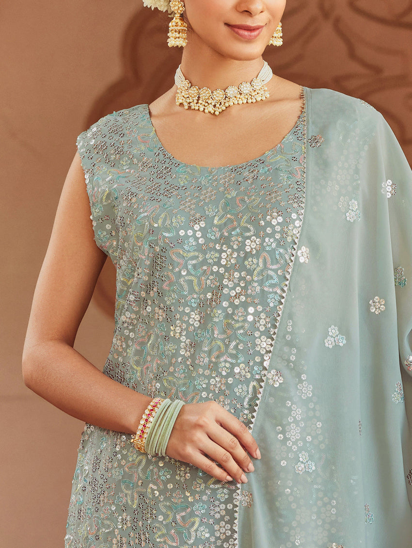 A straight-fit suit set from our latest collection. The set combines a digitally printed silk kurta with computerized thread embroidery, hand embroidery, straight pants, and a digitally printed silk dupatta.