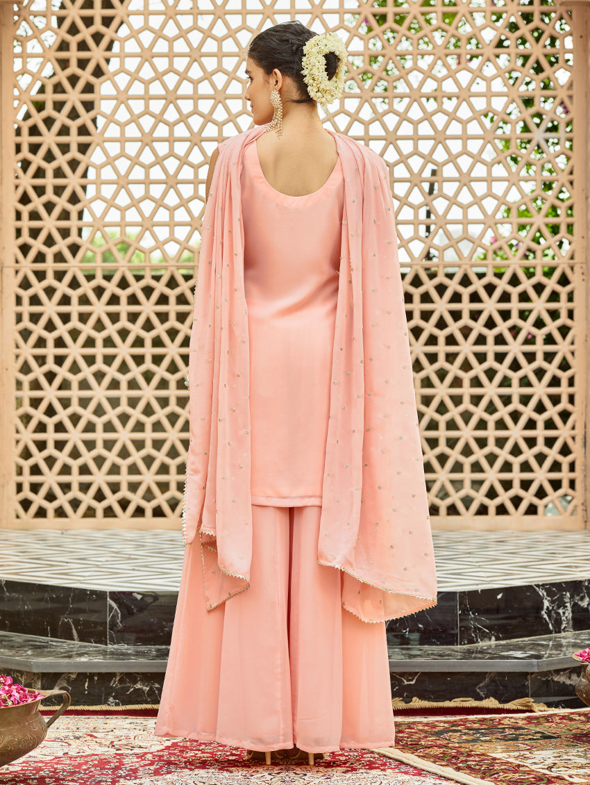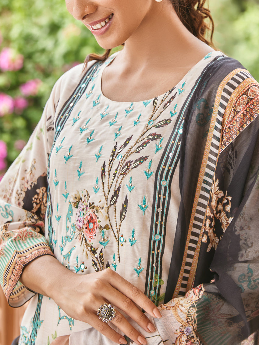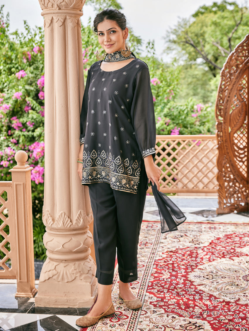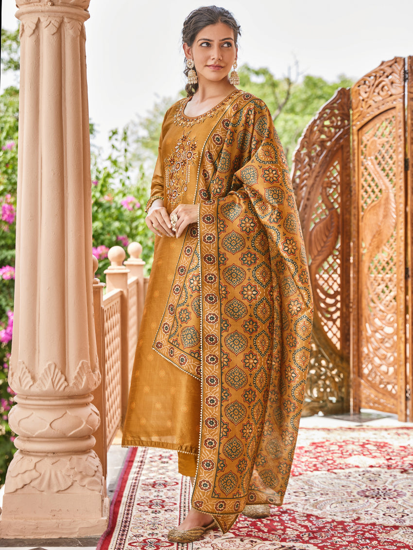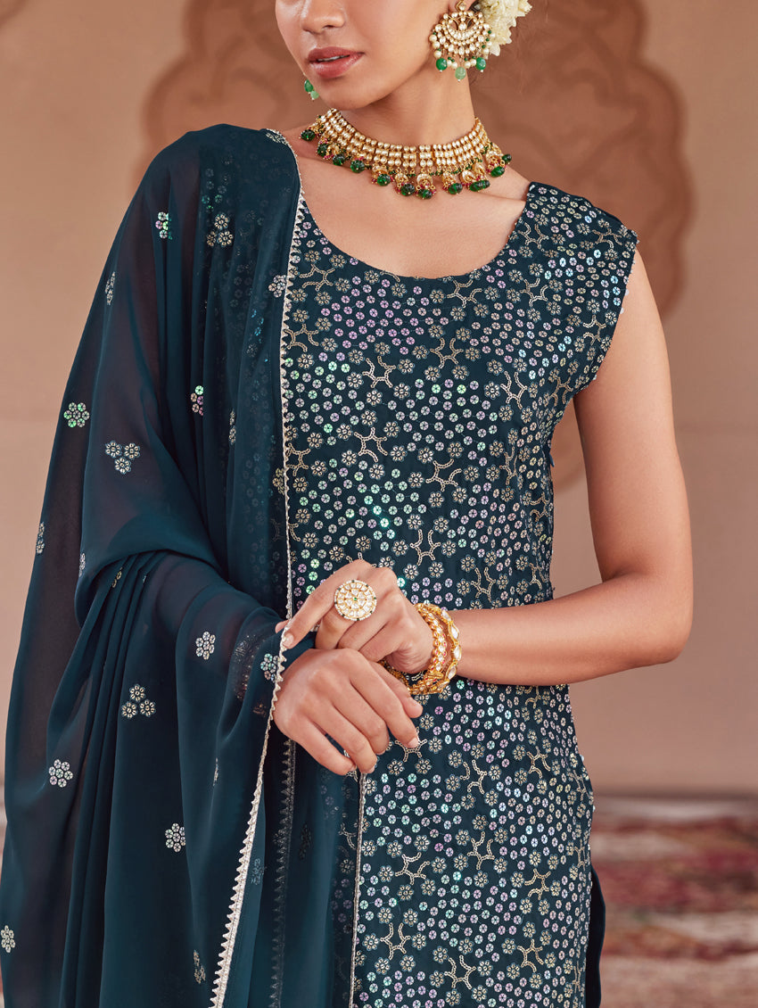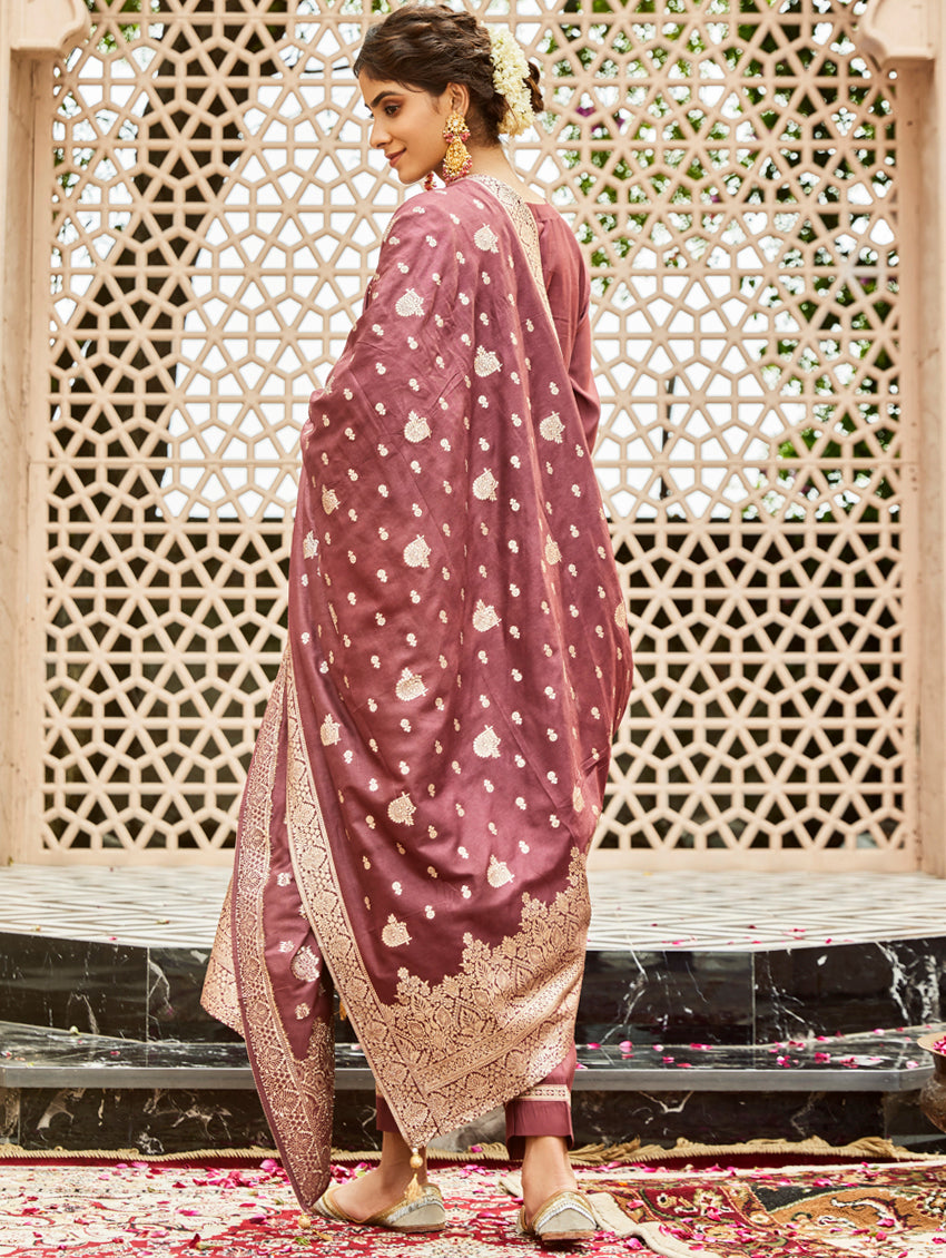 A straight-fit suit set from our latest collection. The set combines a digitally printed silk kurta with computerized thread embroidery, hand embroidery, straight pants, and a digitally printed silk dupatta.