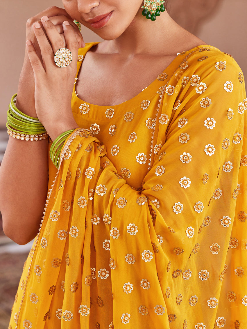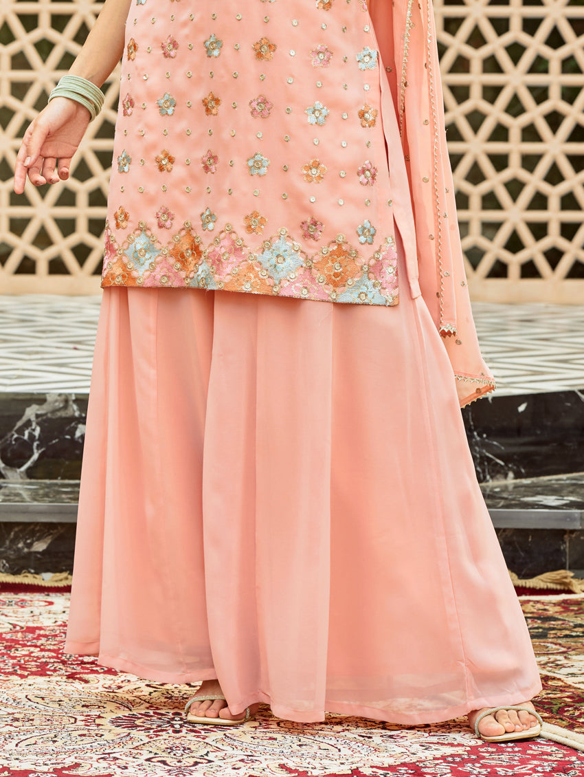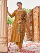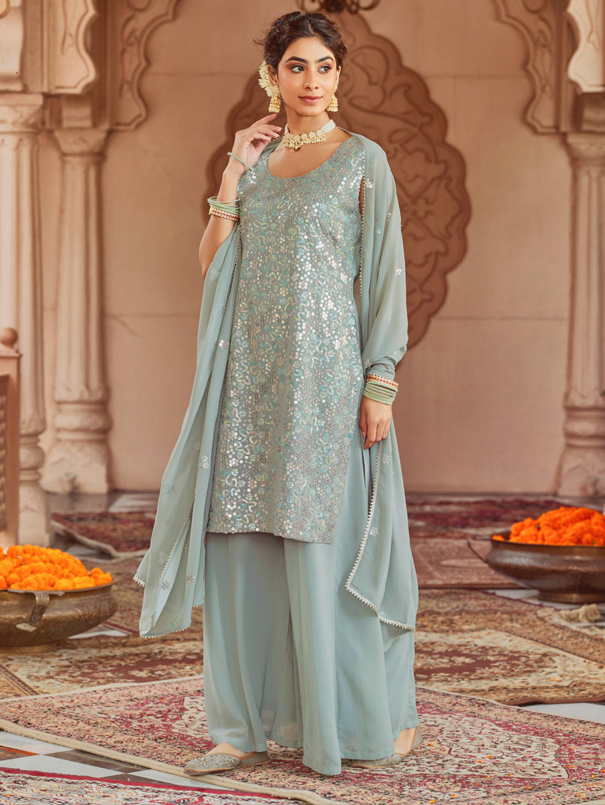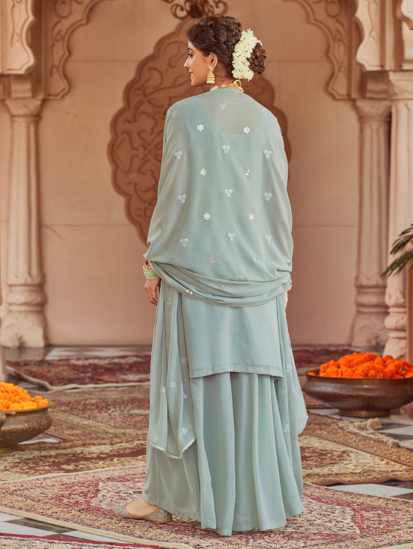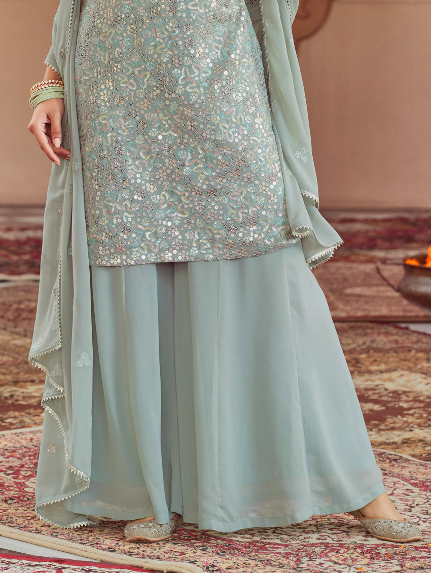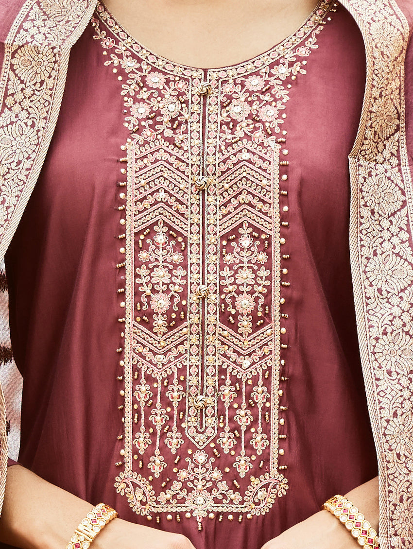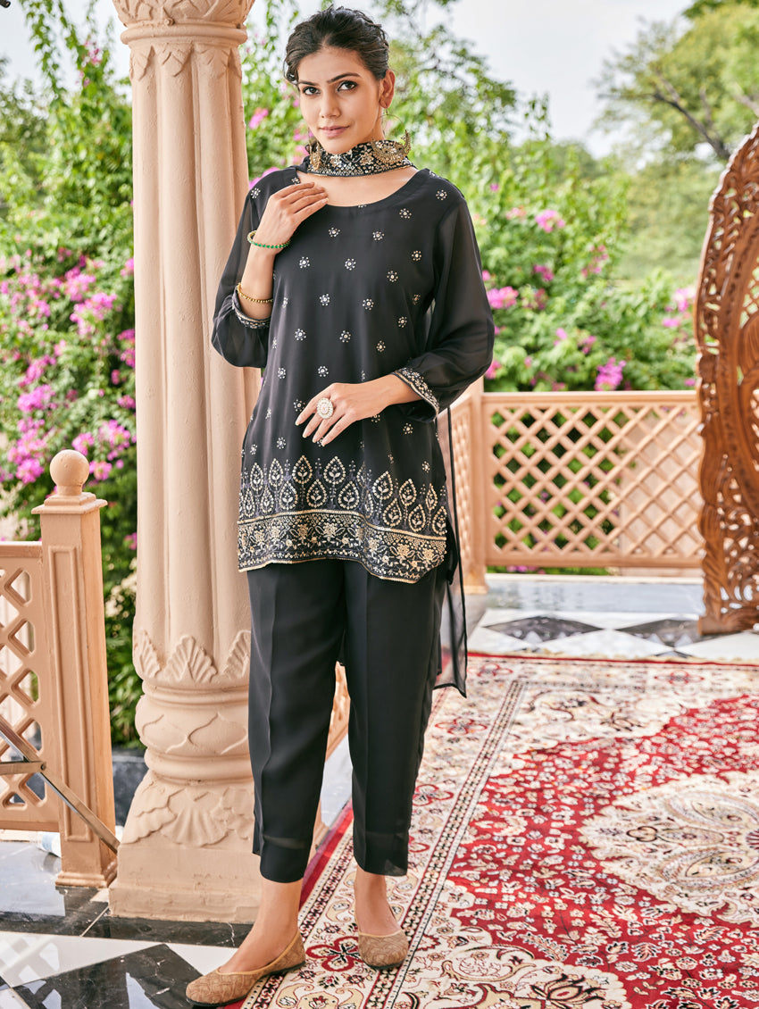 A straight-fit suit set from our latest collection. The set combines a digitally printed silk kurta with computerized thread embroidery, hand embroidery, straight pants, and a digitally printed silk dupatta.