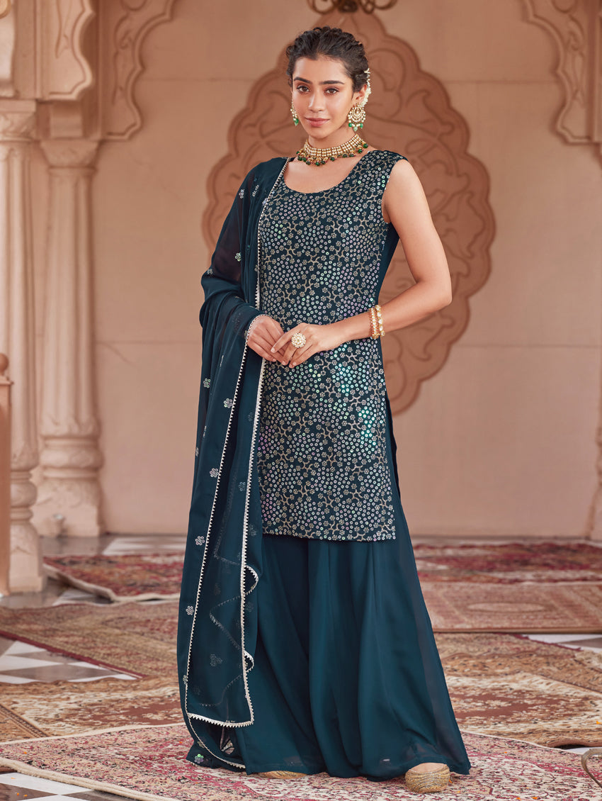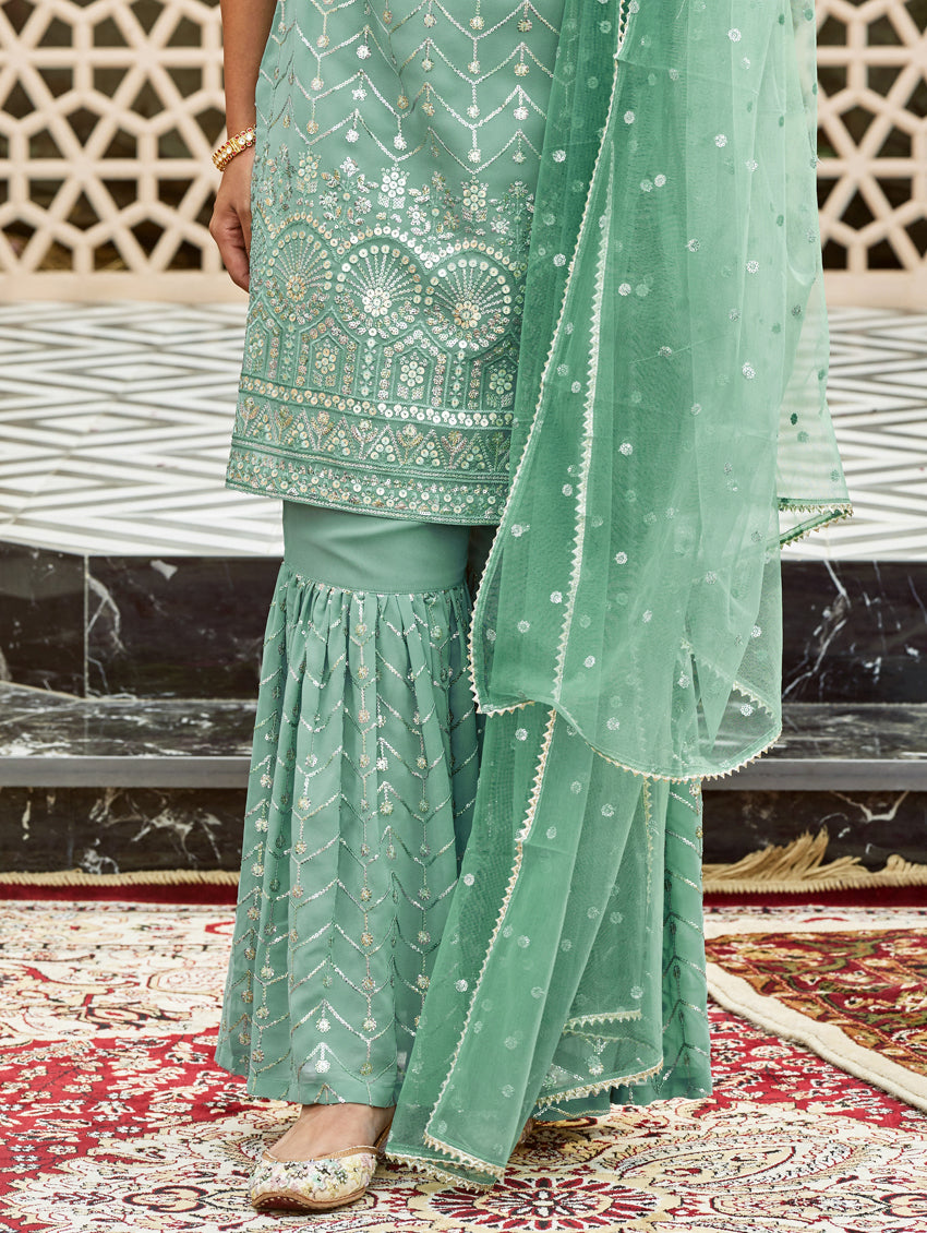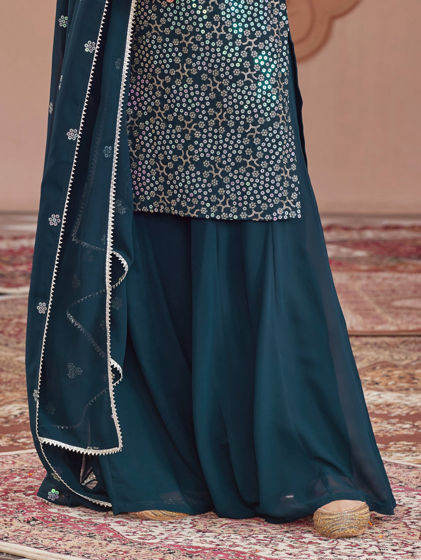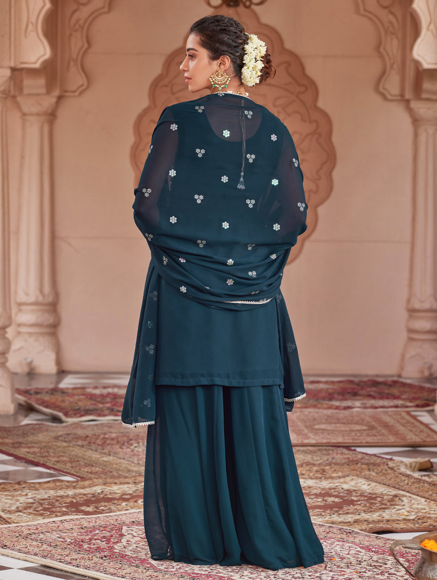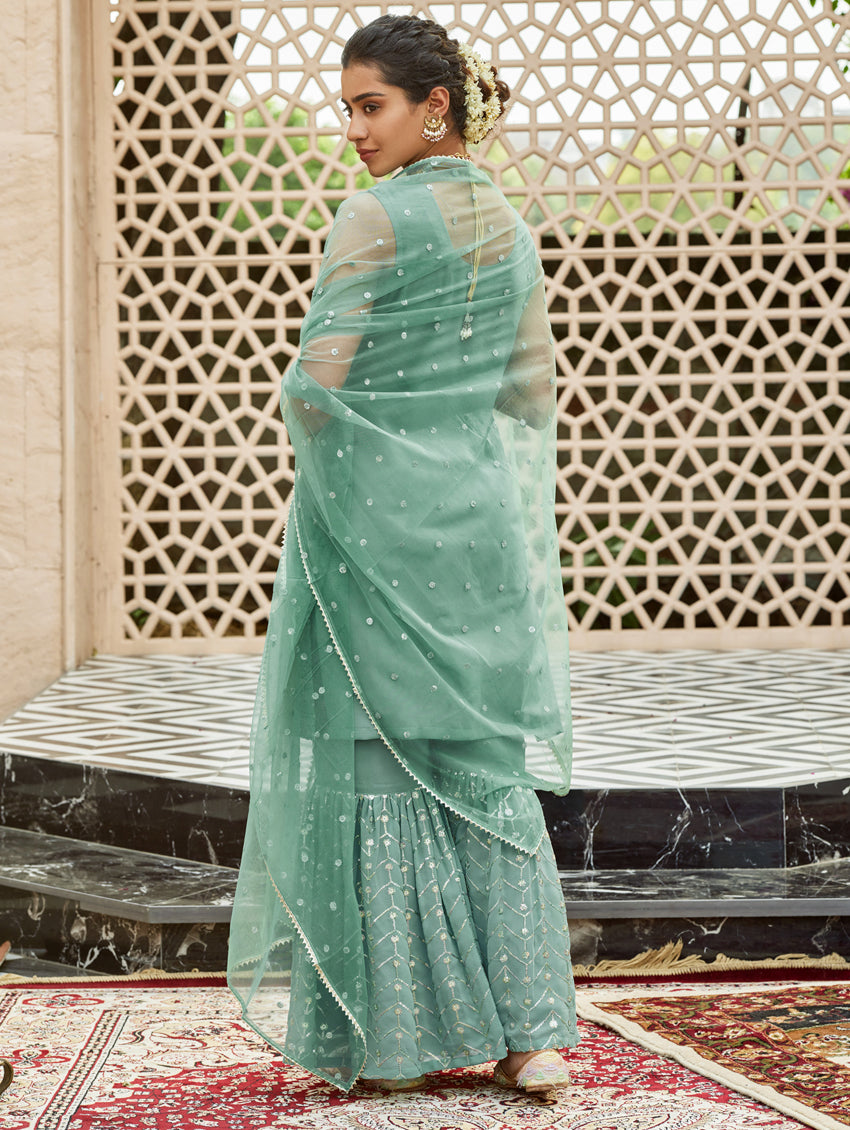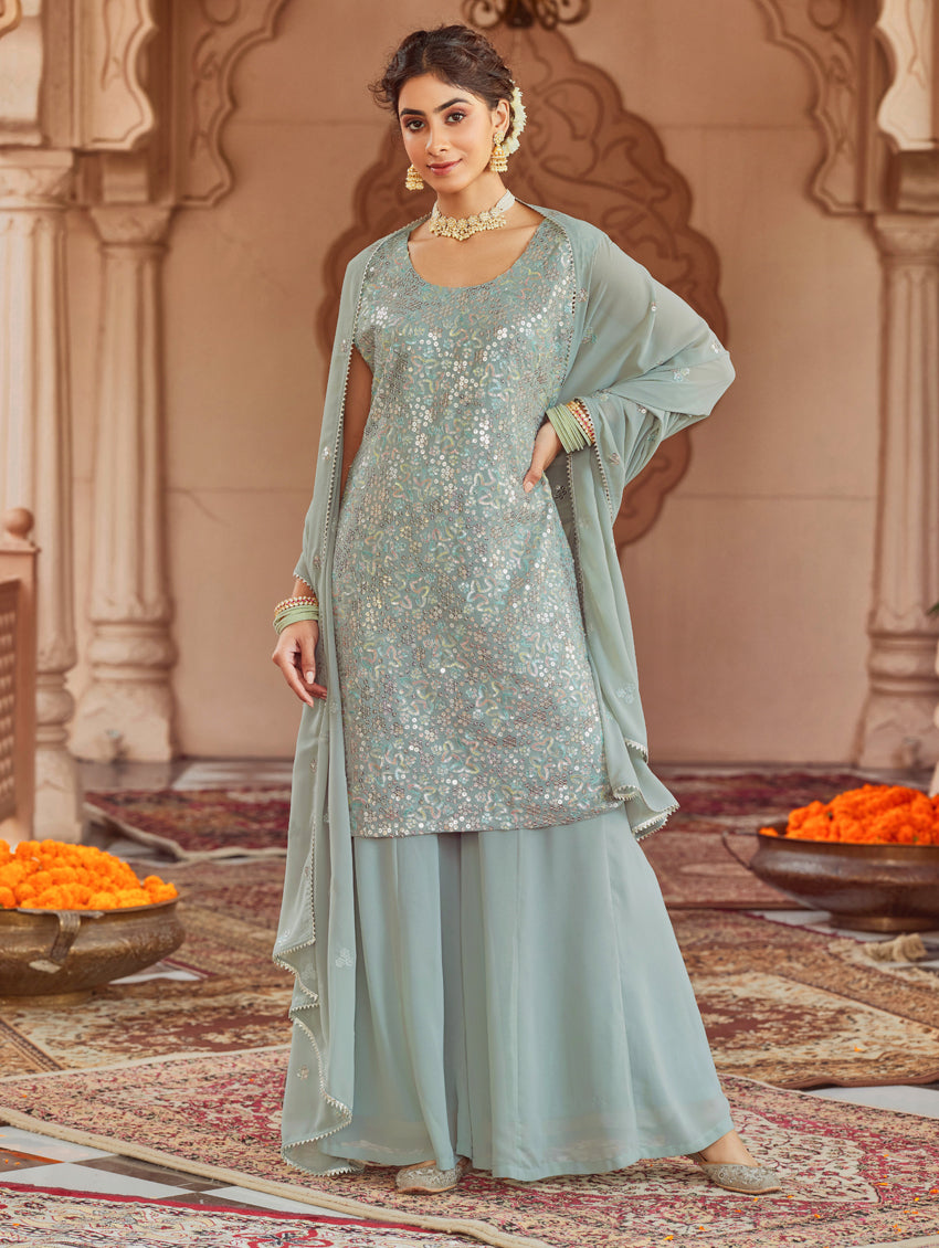 A straight-fit suit set from our latest collection. The set combines a digitally printed silk kurta with computerized thread embroidery, hand embroidery, straight pants, and a digitally printed silk dupatta.