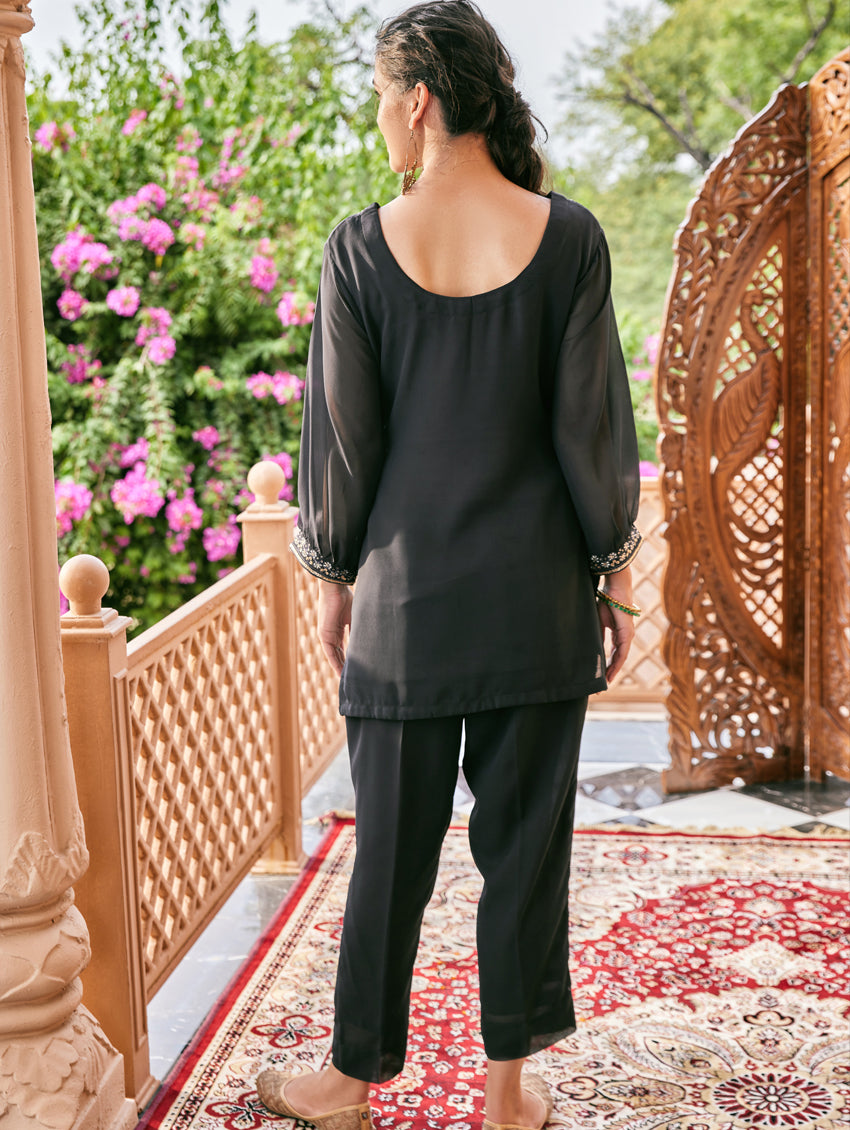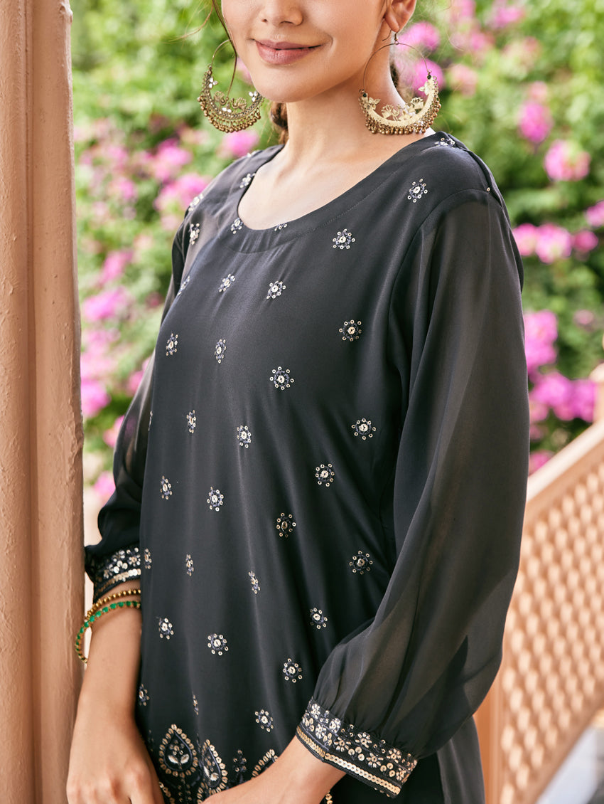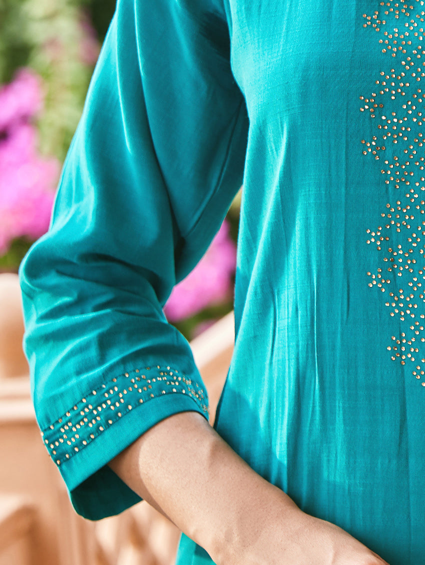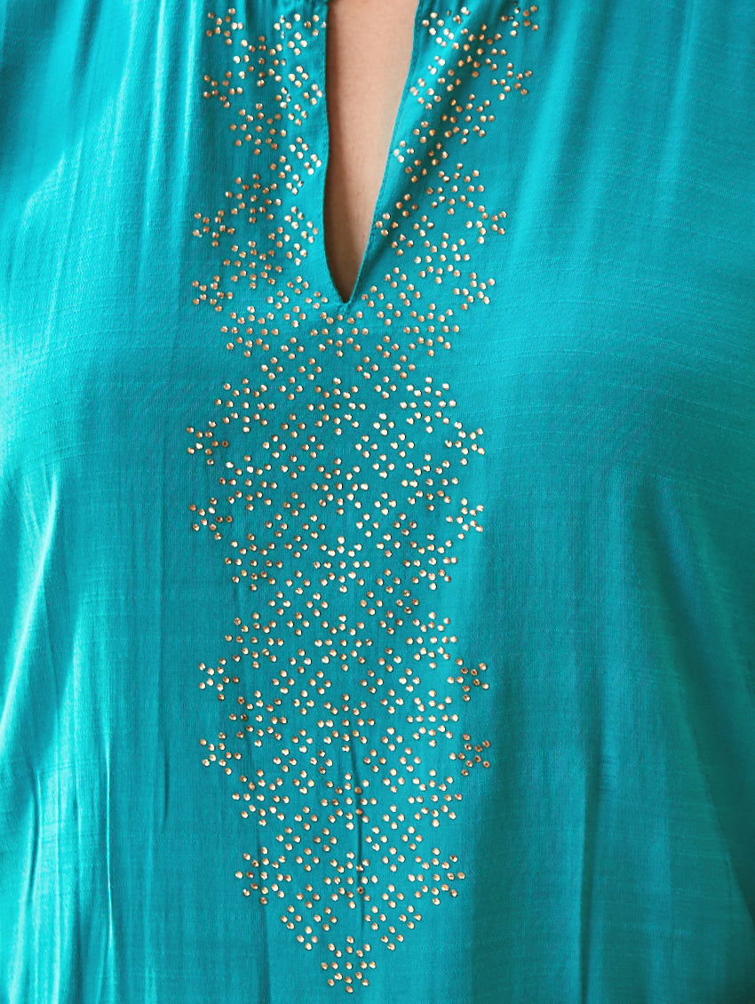 • Kurta with round neckline, three-fourth sleeves, and side slits open