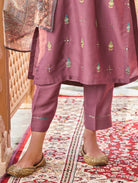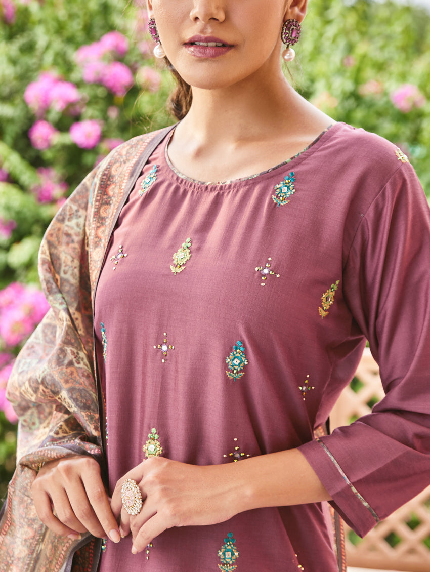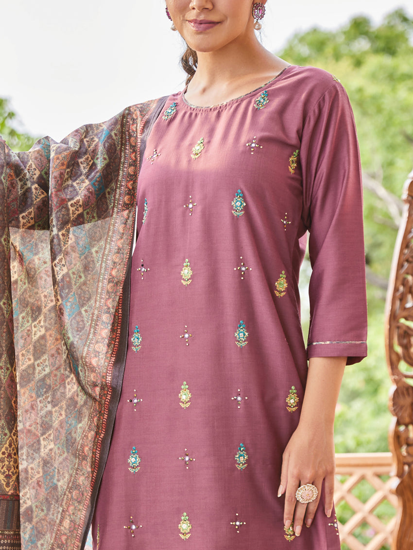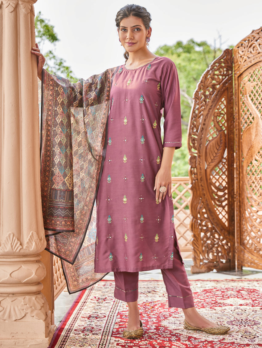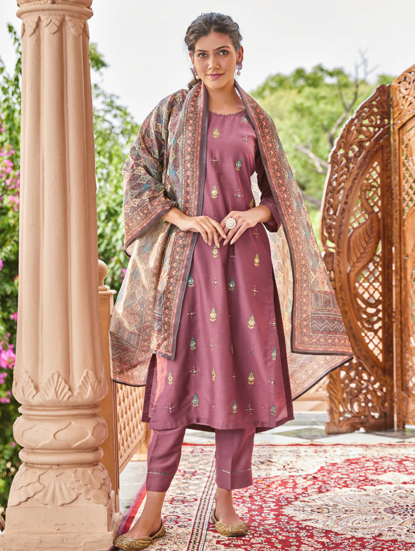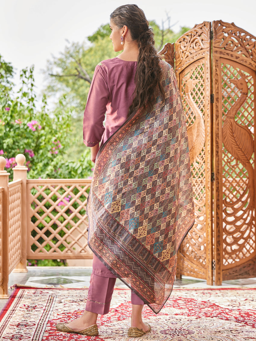 Update your casual collection with this suit set from our latest collection. The set includes a straight-fit silk kurta with computerized thread and hand embroidery, regular pants, and a digitally printed chanderi silk dupatta.