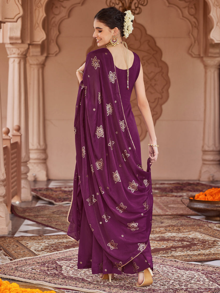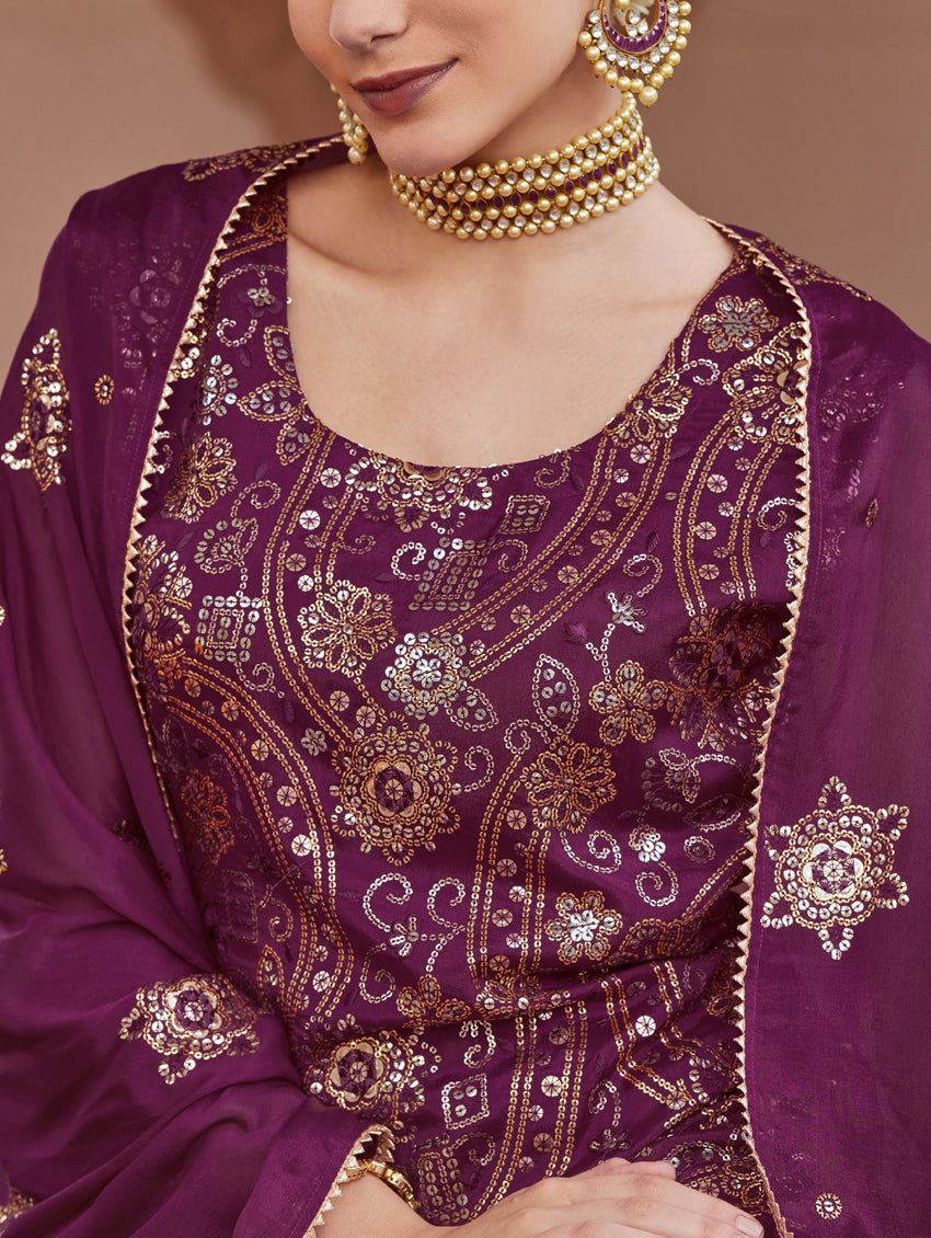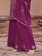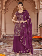 A straight-fit suit set from our latest festive collection. The set combines a kurta and sharara and a dupatta in Pure Viscose Chinnon fabric. Kurta and dupatta come accentuated with computerised thread embroidery along with sequence work.