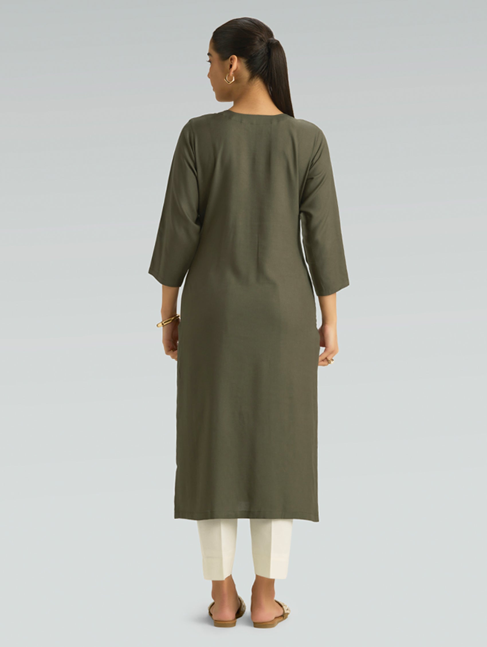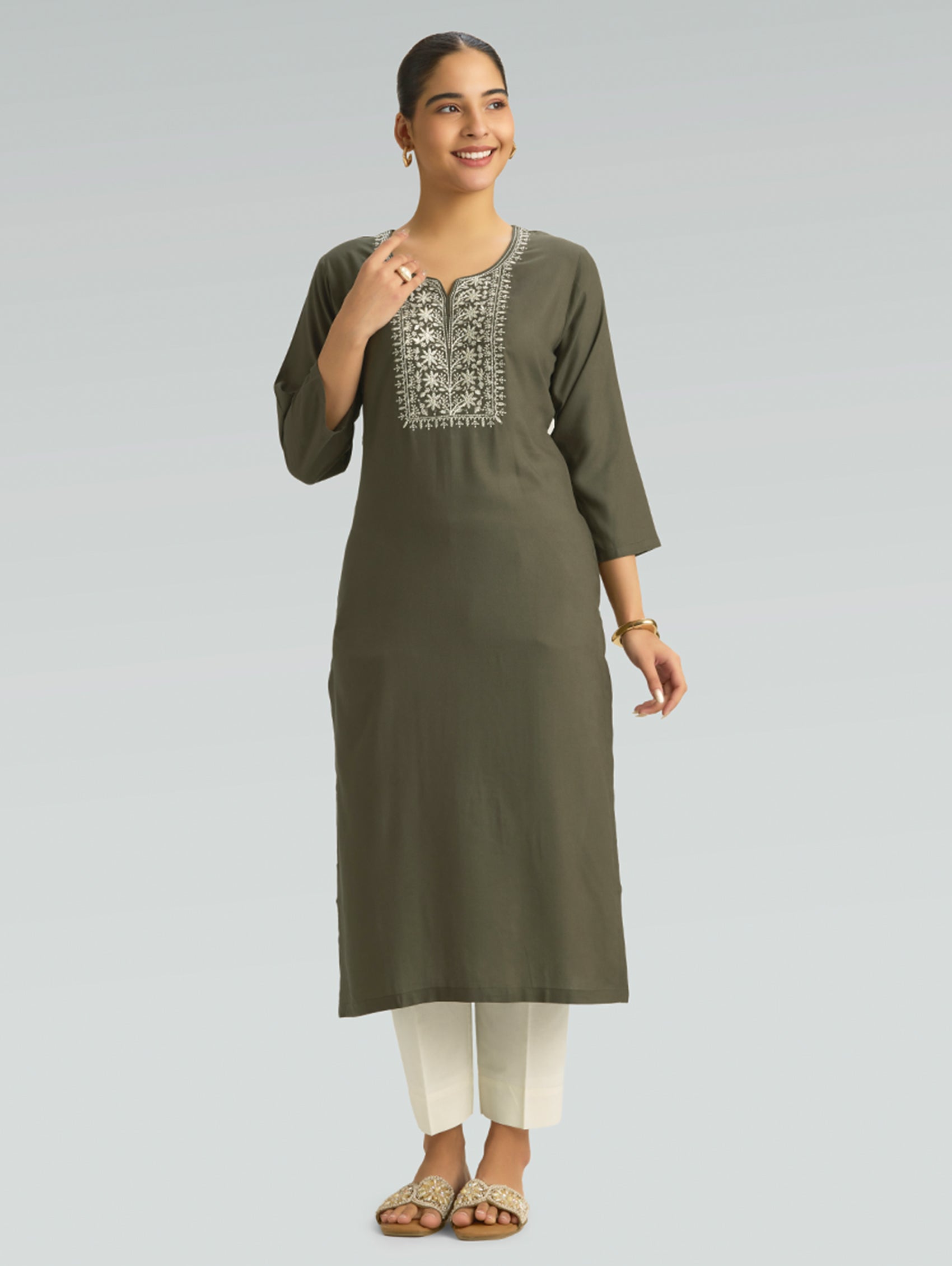 Experience understated elegance with this viscose rayon kurta, crafted for modern comfort. The computerised thread embroidery adorns the notched round neckline, while three-fourth sleeves and convenient side slits create a flattering silhouette. Breathable and soft, this kurta keeps you cool and comfortable throughout the day, making it an essential addition to your everyday wardrobe.