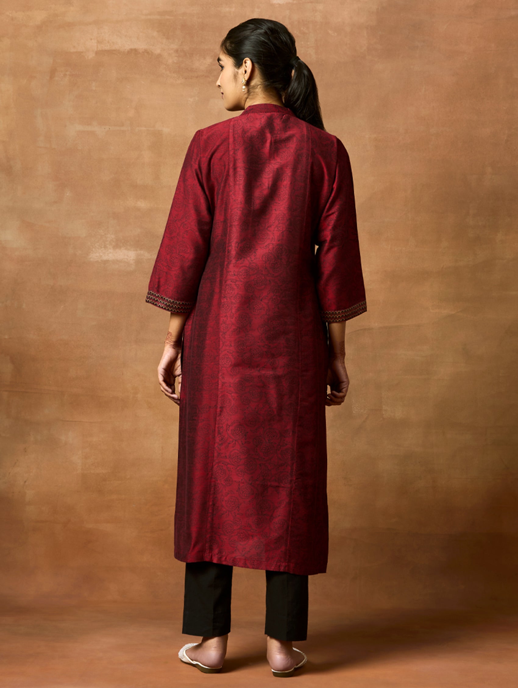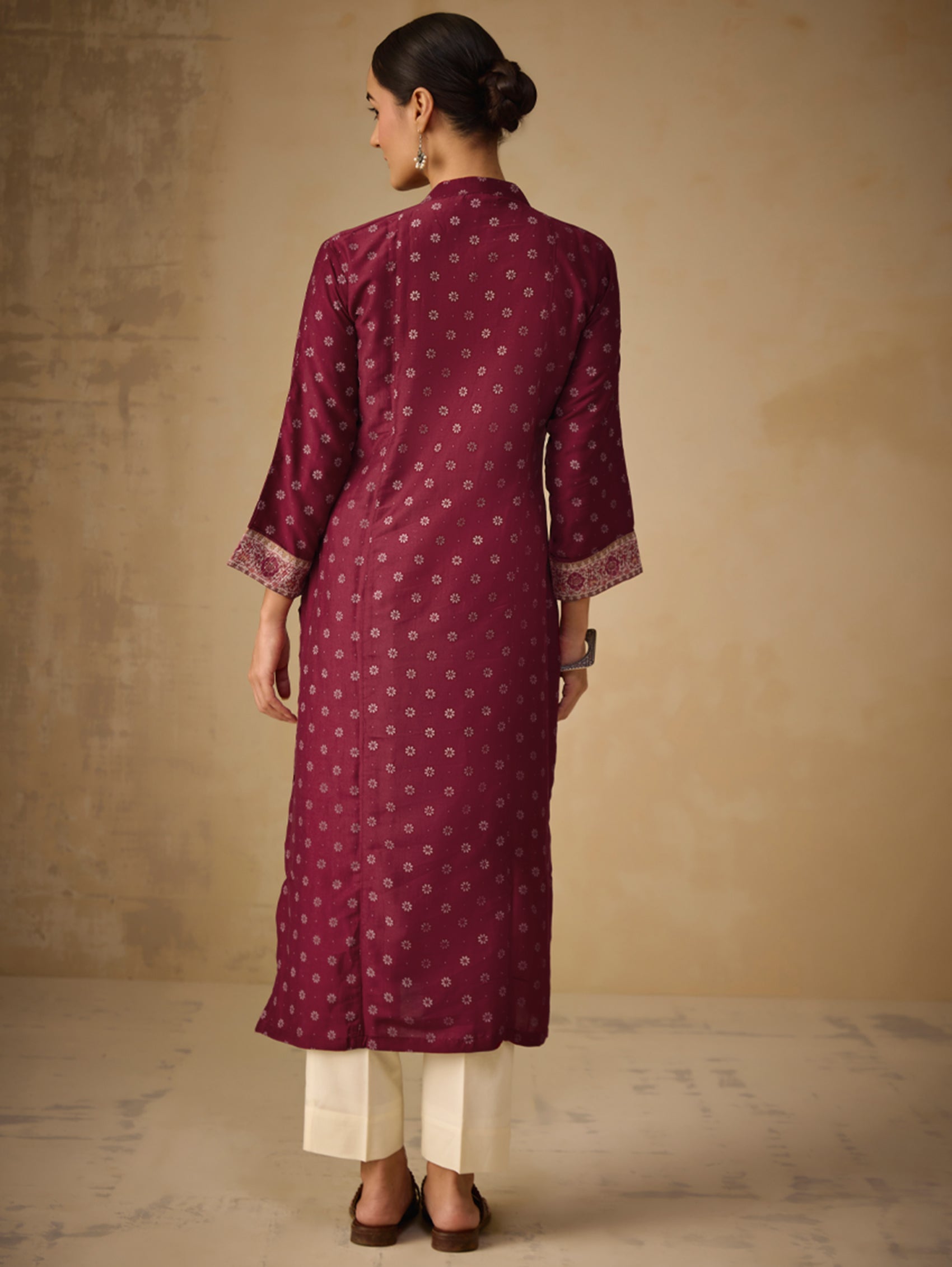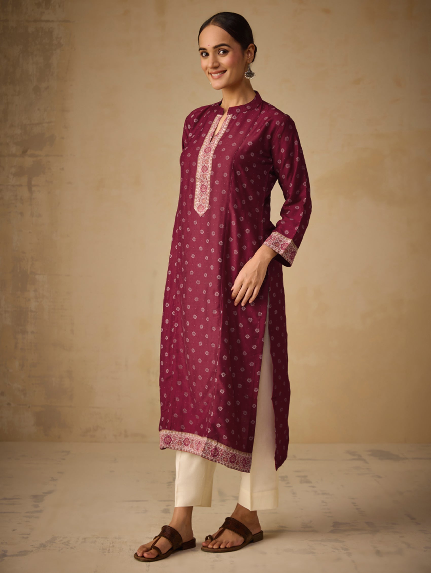 Discover the graceful charm of our Printed Silk Blend Kurta. Designed by Women Plus, this kurta offers a stylish round neckline, comfortable three-quarter sleeves, and open side slits for a flattering fit and easy movement. Embrace elegance with simplicity.