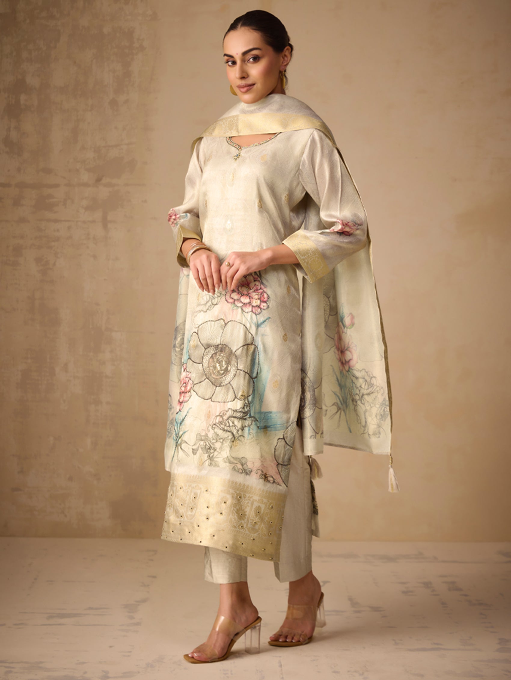 • Kurta with pants and digitally printed jacquard shimmer silk dupatta
