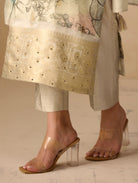 Discover refined sophistication with this stunning jacquard shimmer silk suit set, featuring an intricately hand-embroidered kurta paired with digitally printed pants and a coordinating digitally printed dupatta. The luxurious silk fabric catches light beautifully, creating an ethereal shimmer that elevates any occasion. Ideal for the discerning woman who appreciates quality craftsmanship and timeless design, this ensemble seamlessly blends traditional artistry with contemporary elegance. Invest in a piece that celebrates your refined taste and becomes a cherished staple in your wardrobe.