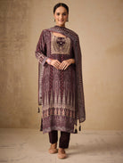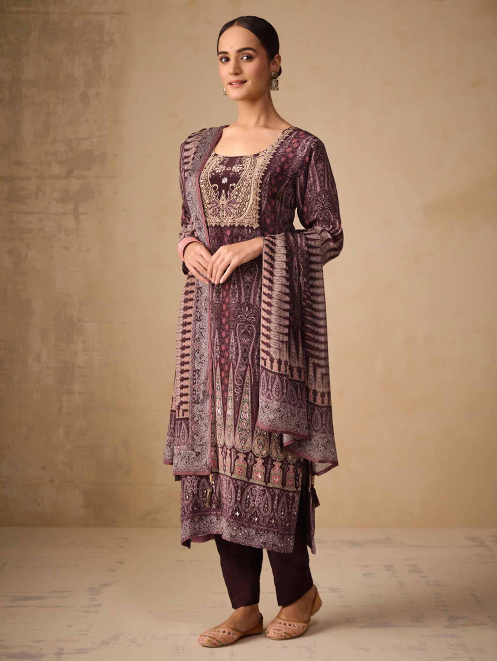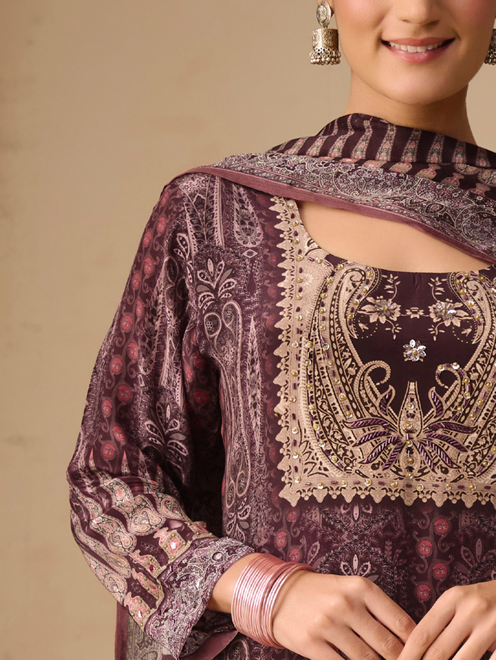 Discover refined sophistication with this digitally printed pure natural crepe suit set, featuring an intricately hand-embroidered kurta paired with coordinating pants and a matching dupatta. Crafted from premium natural crepe fabric, this ensemble delivers timeless elegance with contemporary flair. The meticulous digital printing and delicate embroidery details create a striking visual appeal that elevates any occasion. Invest in a versatile piece that seamlessly transitions from celebrations to everyday wear, offering you unmatched quality and enduring style that truly stands out.