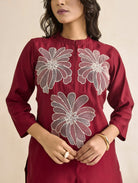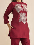 Transform your daily wardrobe with this exquisite embroidered viscose silk co-ord set that marries timeless elegance with modern comfort. The intricately embroidered kurti features a sophisticated ban collar and breathable three-quarter sleeves, while the accompanying pants provide practical convenience with their adjustable waistband and generous pockets. Designed for women who refuse to compromise between style and functionality, this ensemble transitions effortlessly from office to evening gatherings.