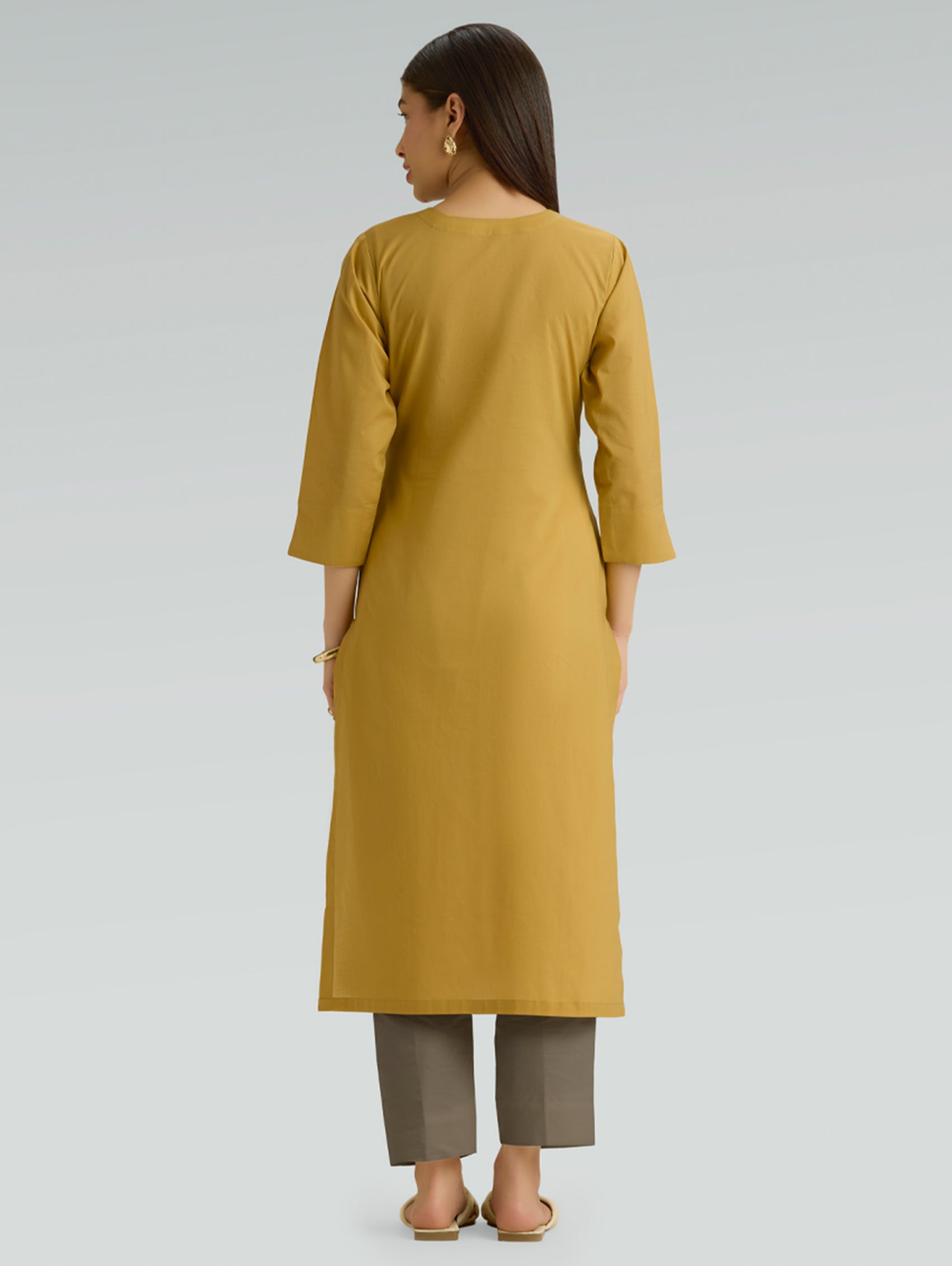 • Kurta with round neckline, three-fourth sleeves, and side slits open.