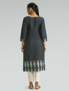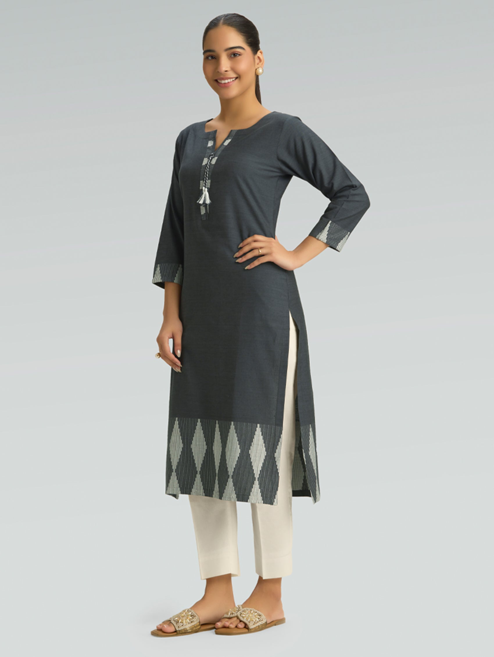 • Kurta with notch-round neckline, three-fourth sleeves, and side slits open.