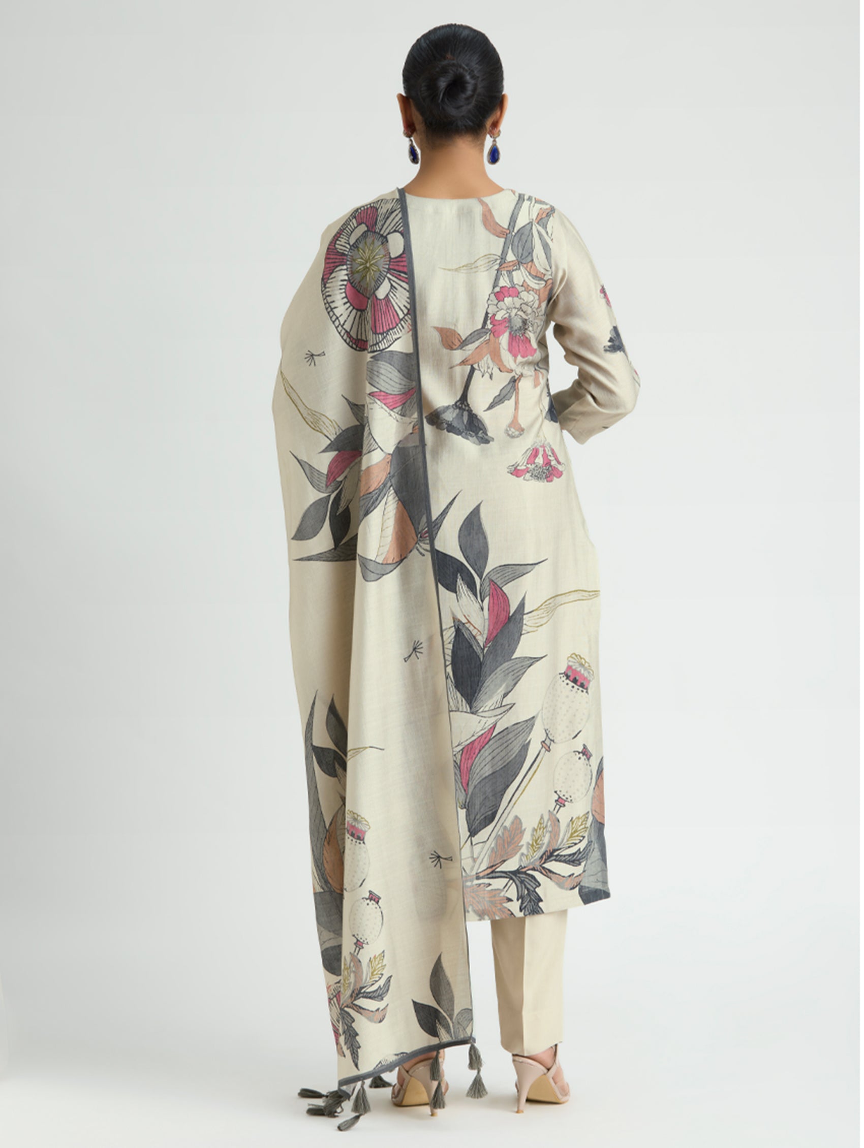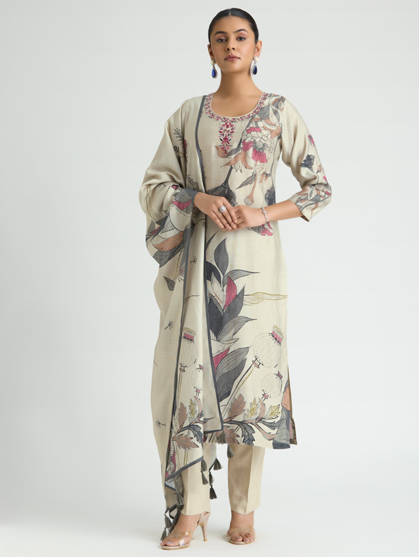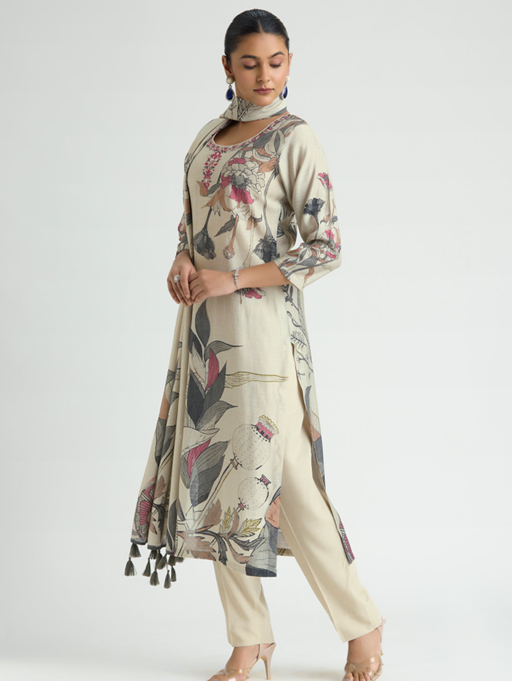 Indulge in timeless elegance with this exquisite viscose suit collection that celebrates artisanal detail and modern aesthetics. The kurta features intricate computerised embroidery that adds depth and dimension, while the coordinating digitally printed dupatta and pants complete a cohesive, refined look. Made from soft, breathable viscose, this three-piece set is your go-to choice for everyday wear, office days, and casual gatherings.