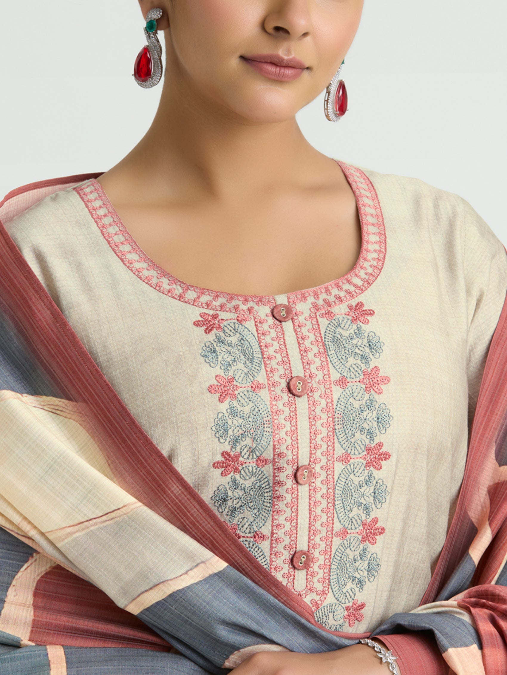 Indulge in timeless elegance with this exquisite viscose suit collection that celebrates artisanal detail and modern aesthetics. The kurta features intricate computerised embroidery that adds depth and dimension, while the coordinating digitally printed dupatta and pants complete a cohesive, refined look. Made from soft, breathable viscose, this three-piece set is your go-to choice for everyday wear, office days, and casual gatherings.