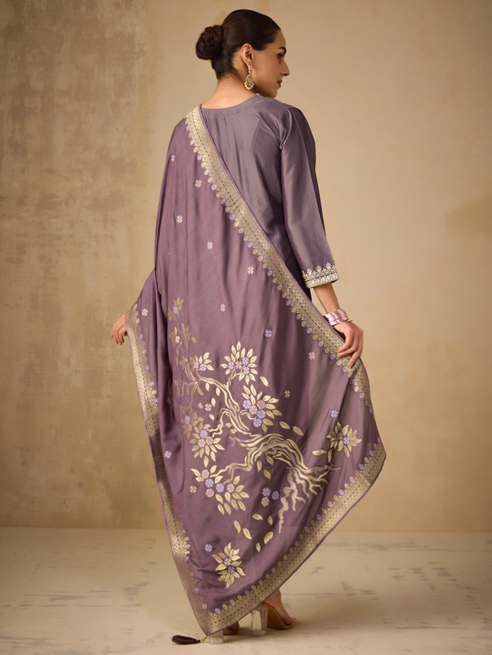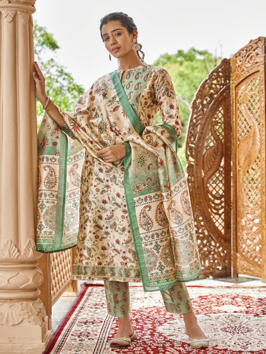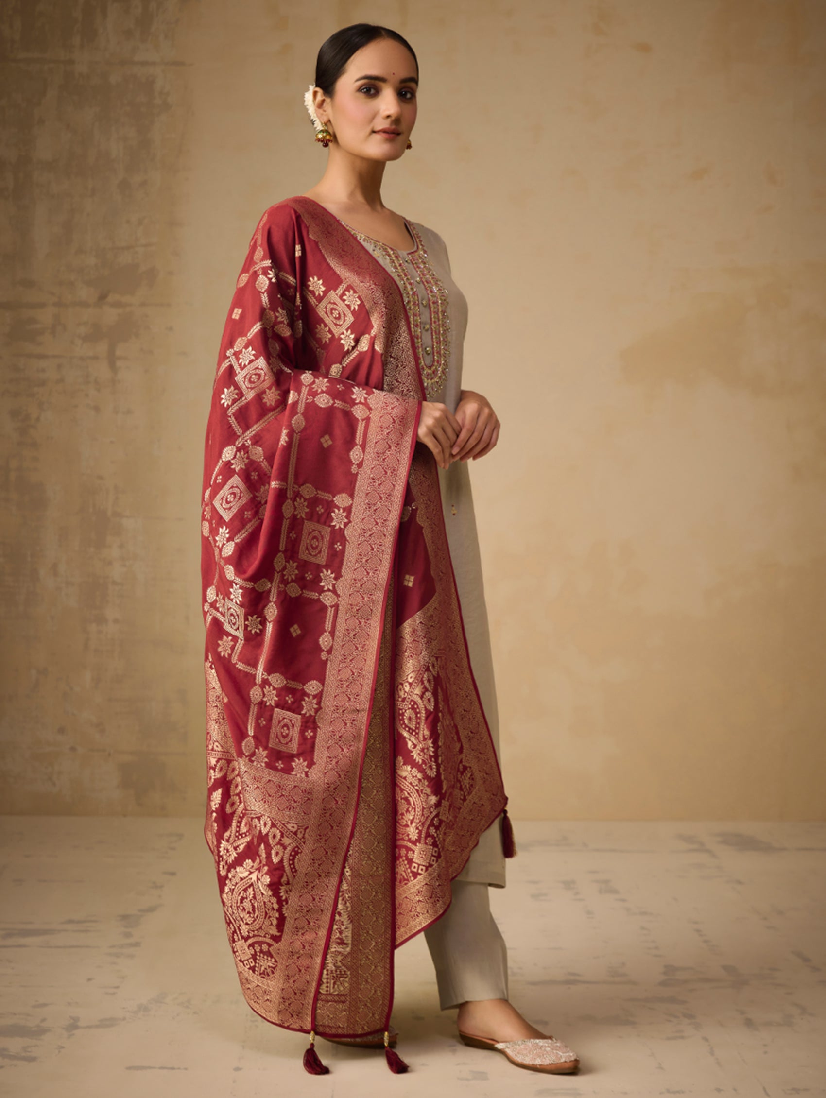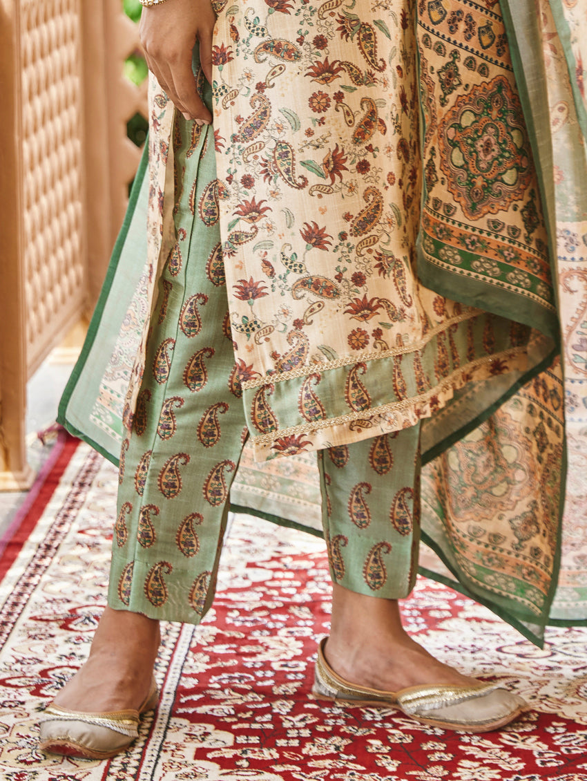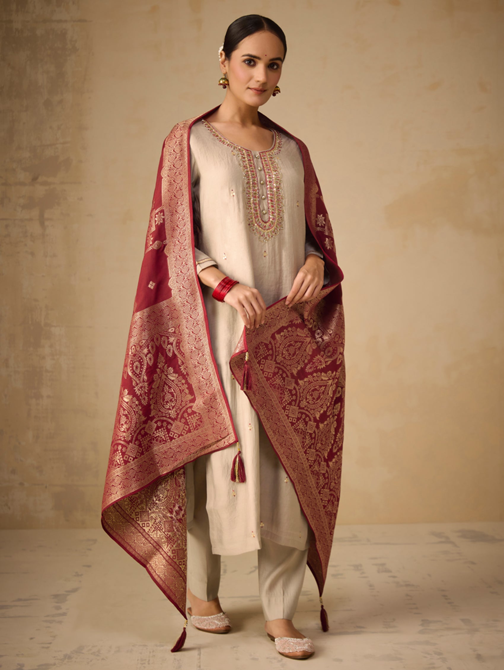 • Kurta with pants and digitally printed jacquard weave silk dupatta