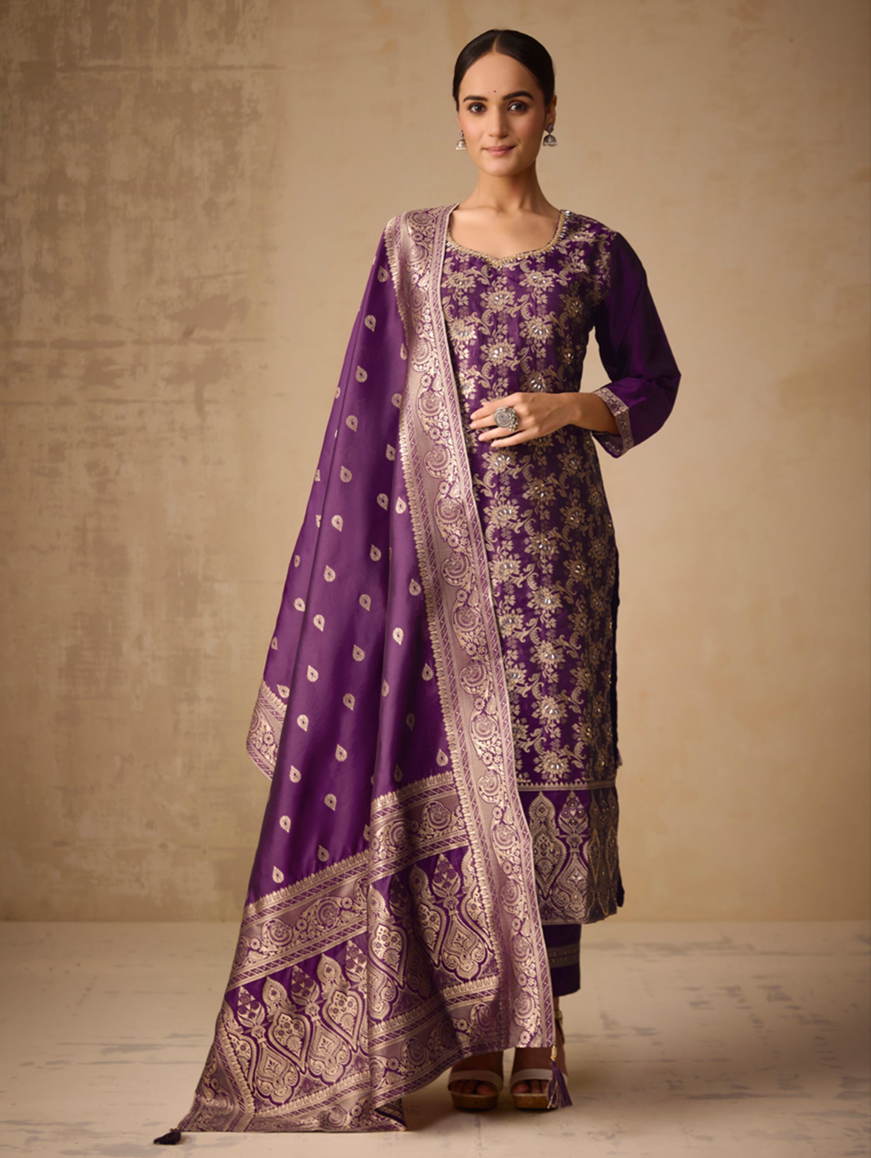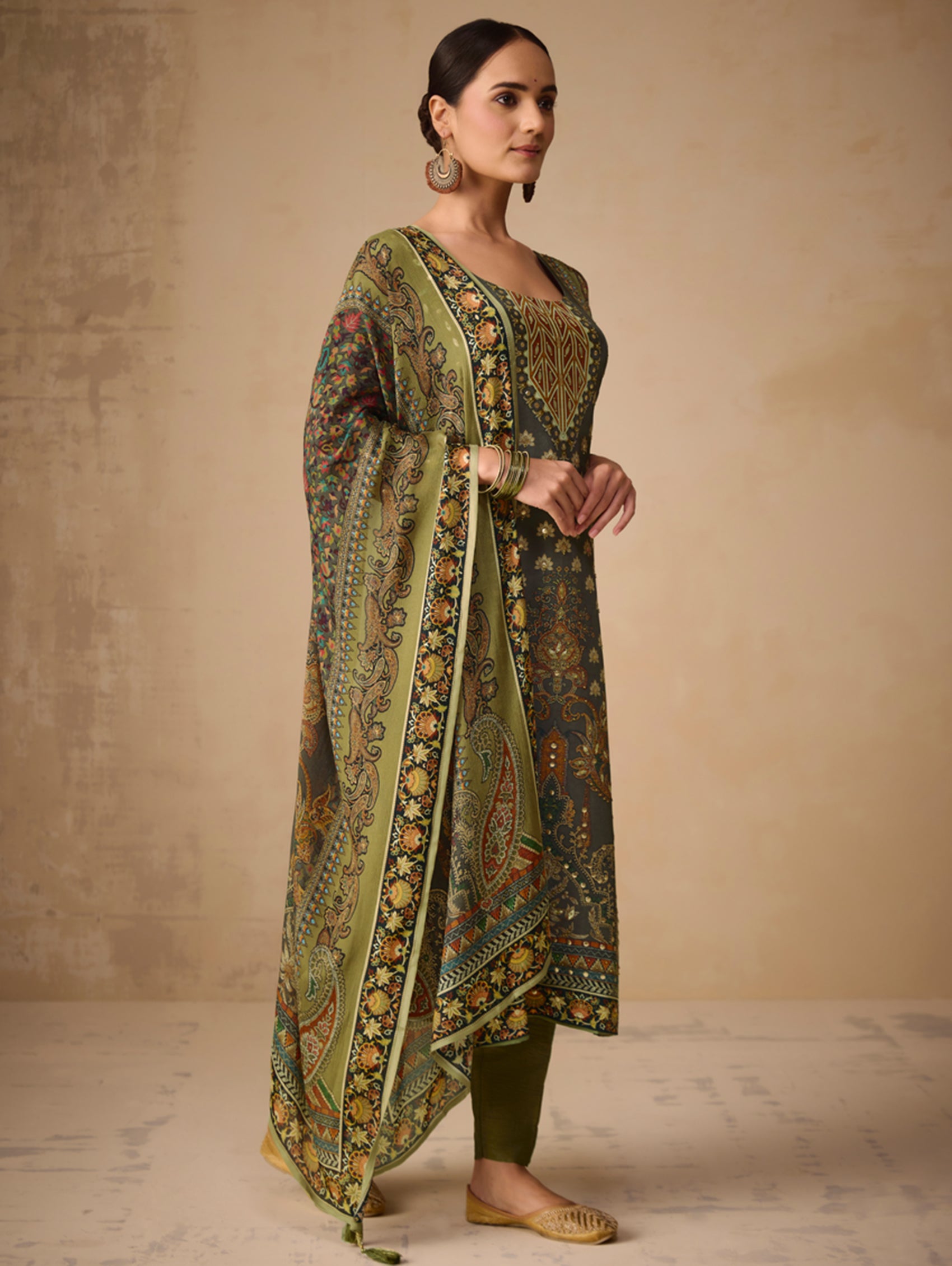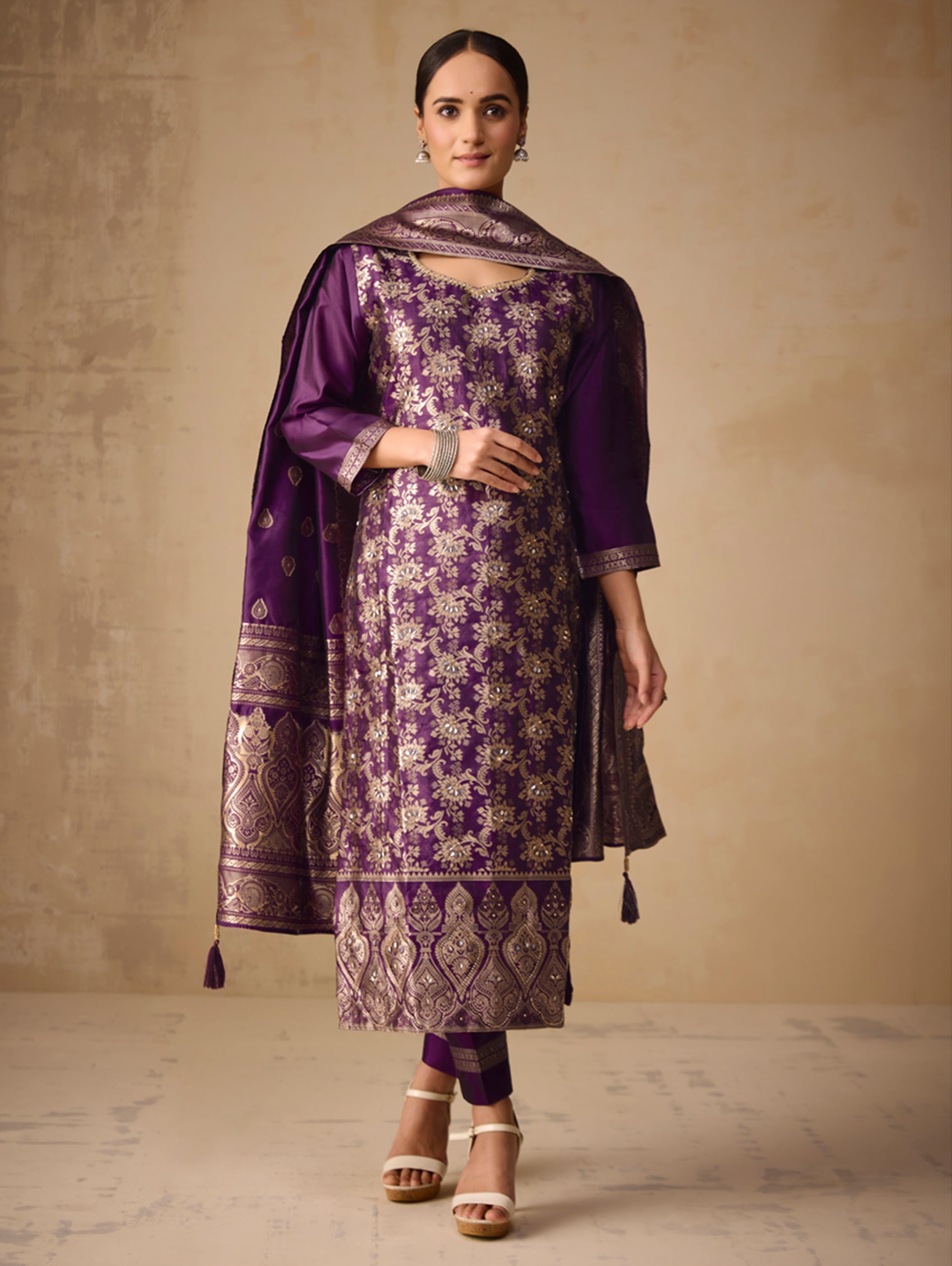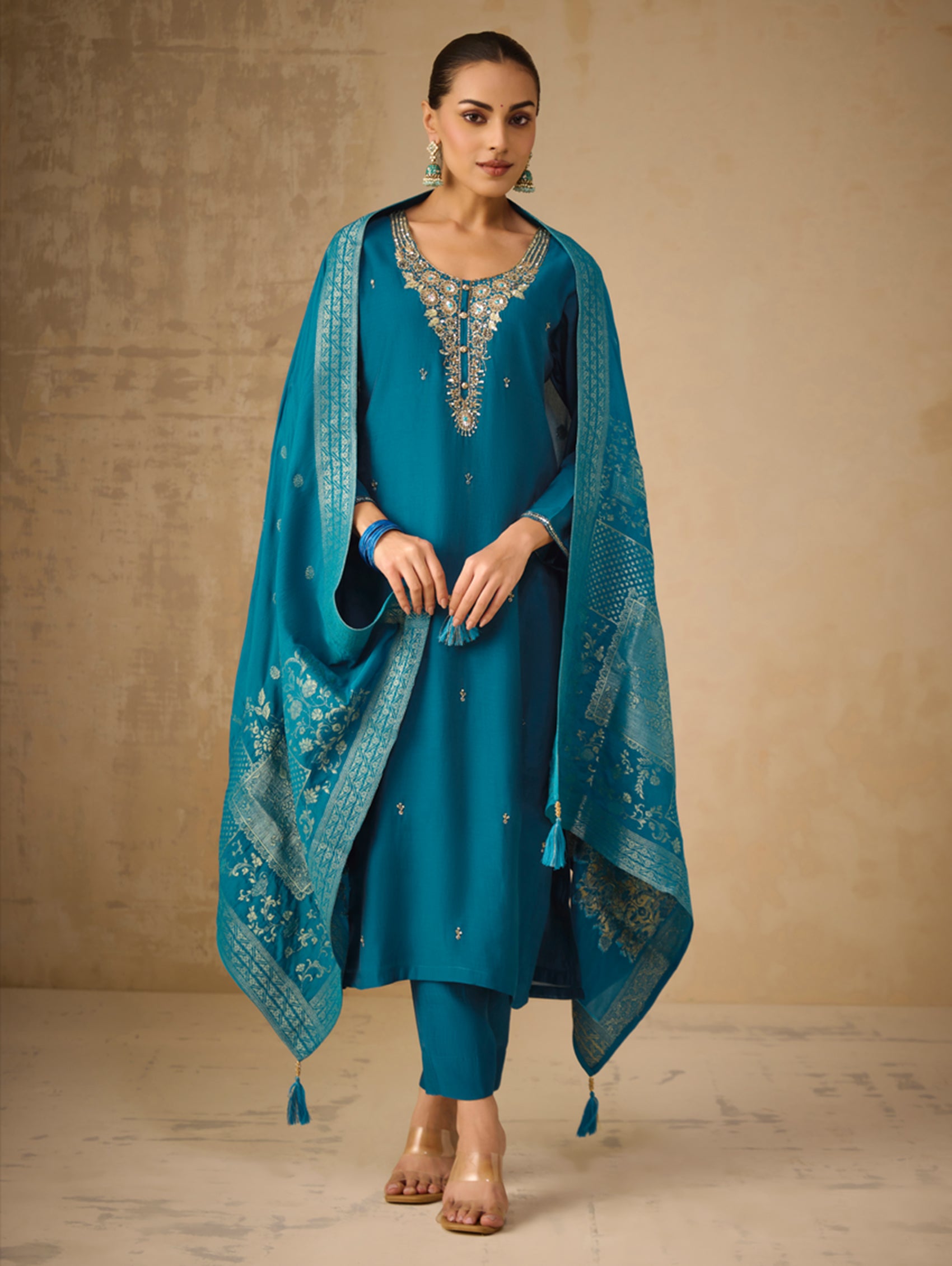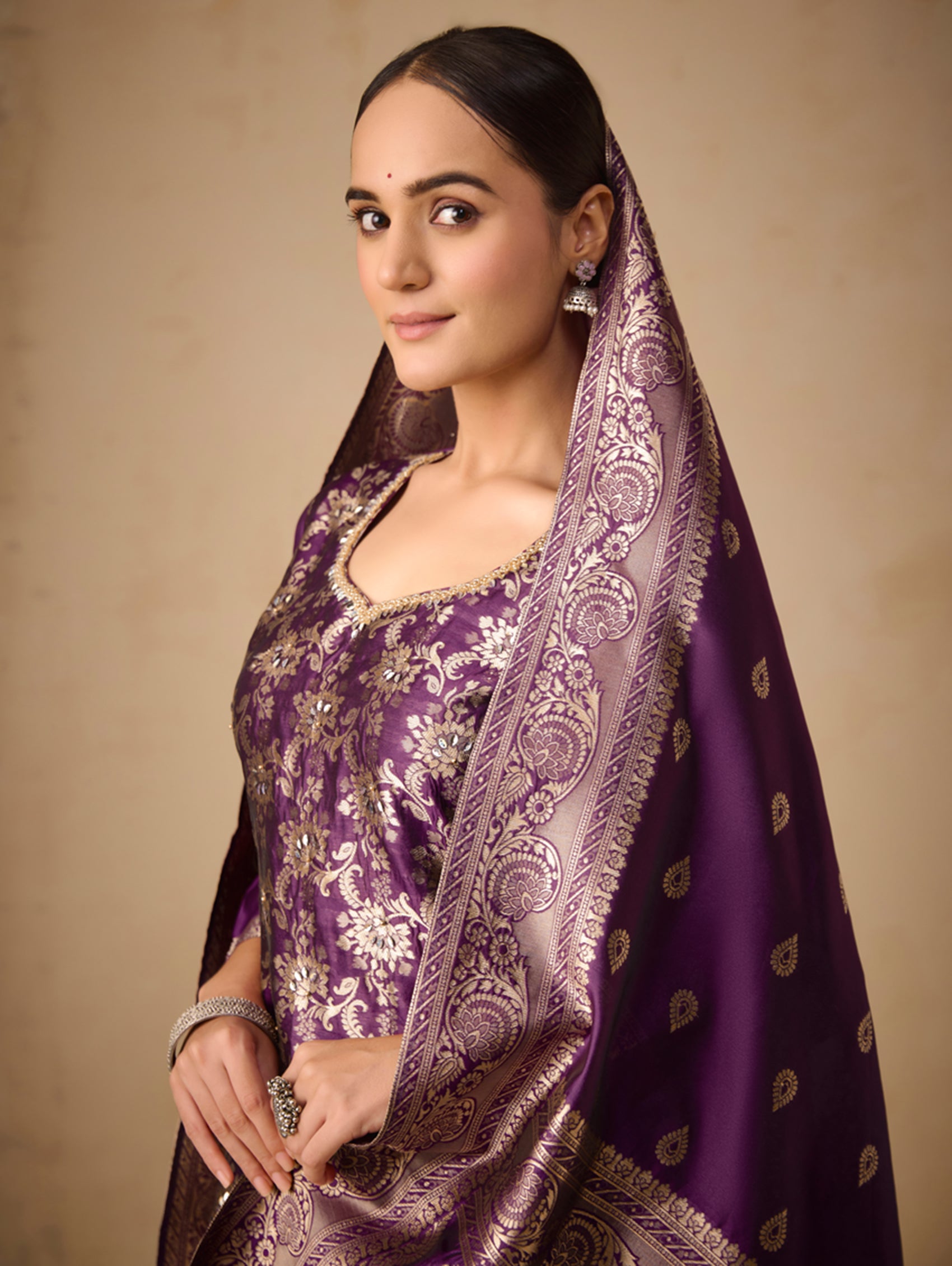 Experience the elegance of this digitally printed jacquard weave silk suit set, highlighted by a beautifully hand-embroidered kurta, traditional pants, and a matching digitally printed jacquard silk dupatta. Perfect for those who value sophisticated fashion, this exquisite ensemble adds a touch of timeless grace to your collection. Don’t miss the chance to own this distinctive and stylish outfit—shop now!