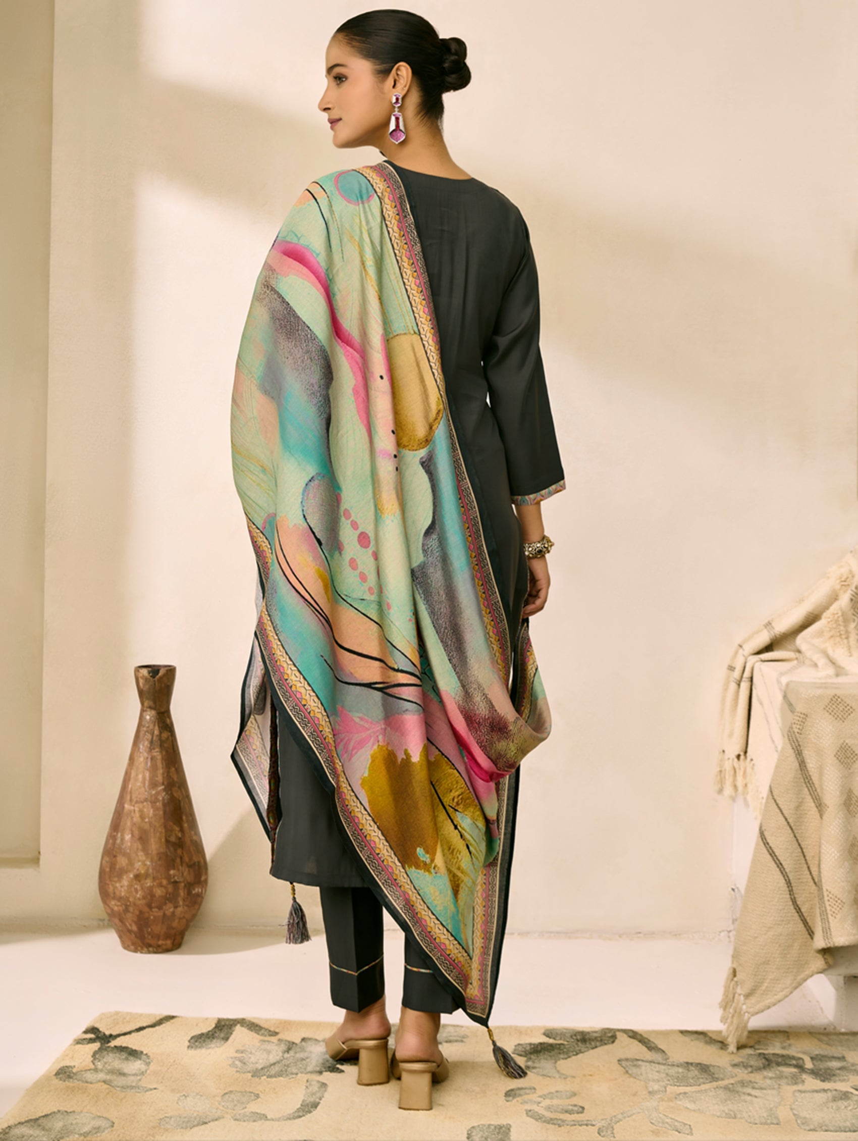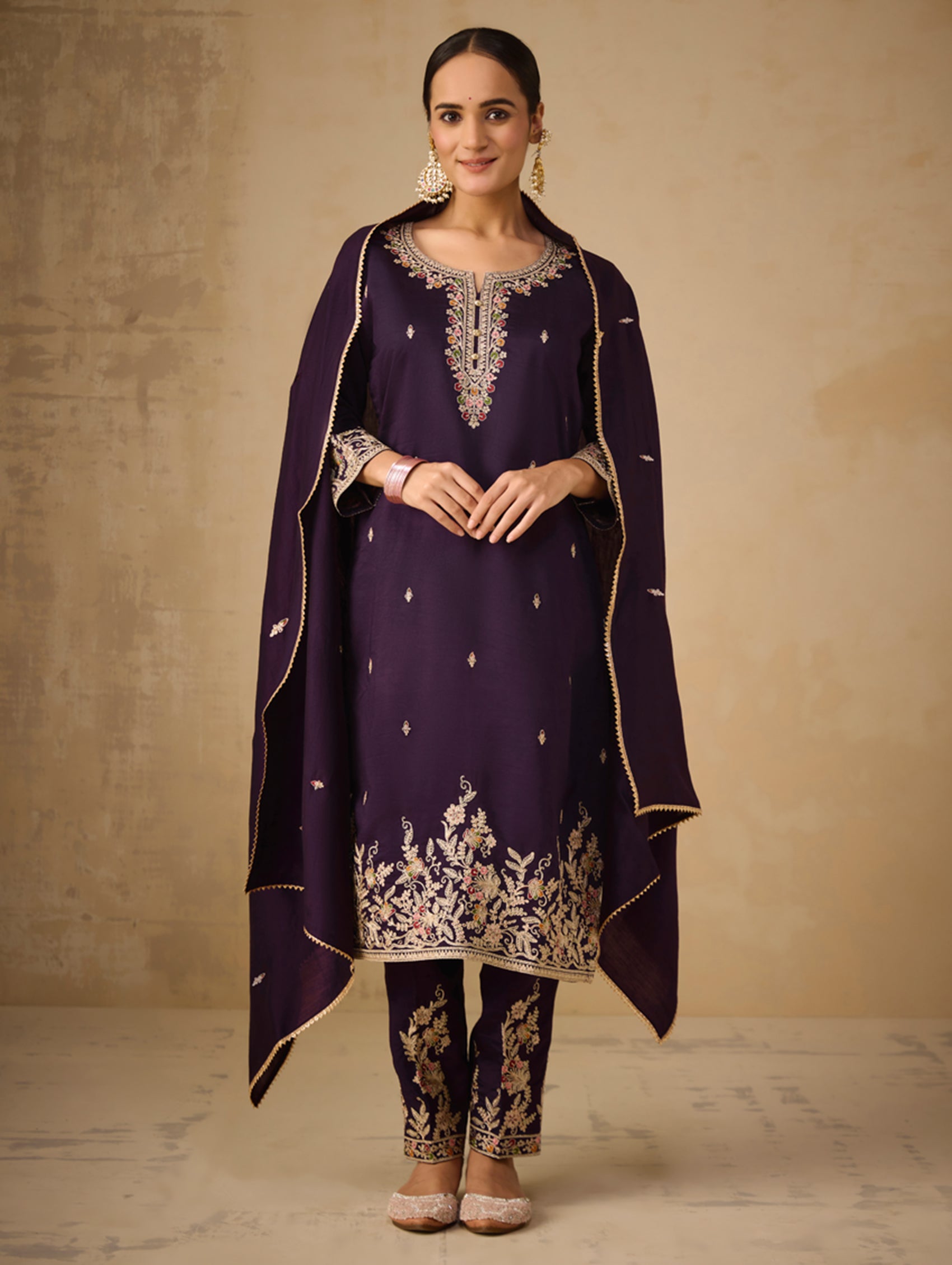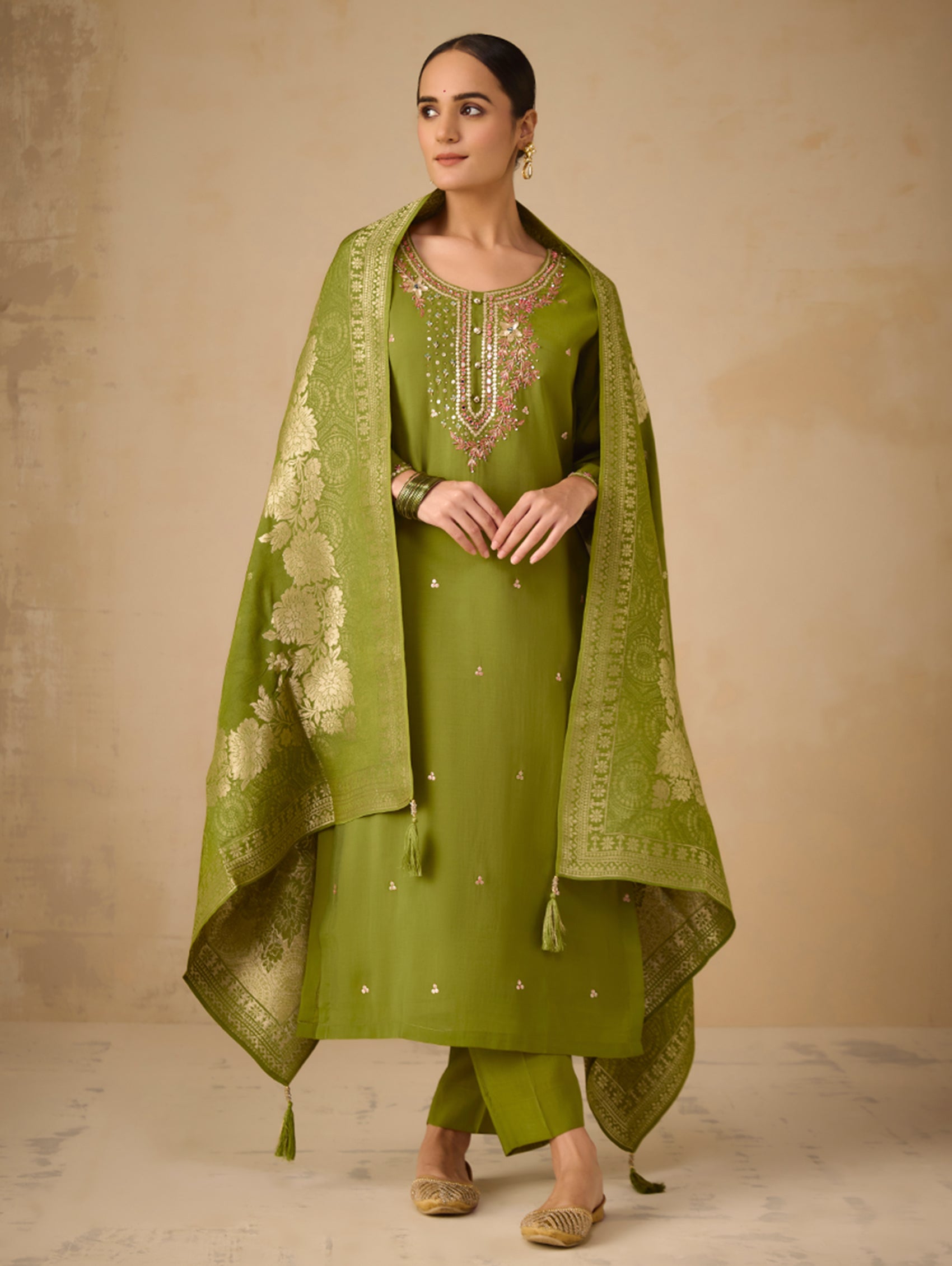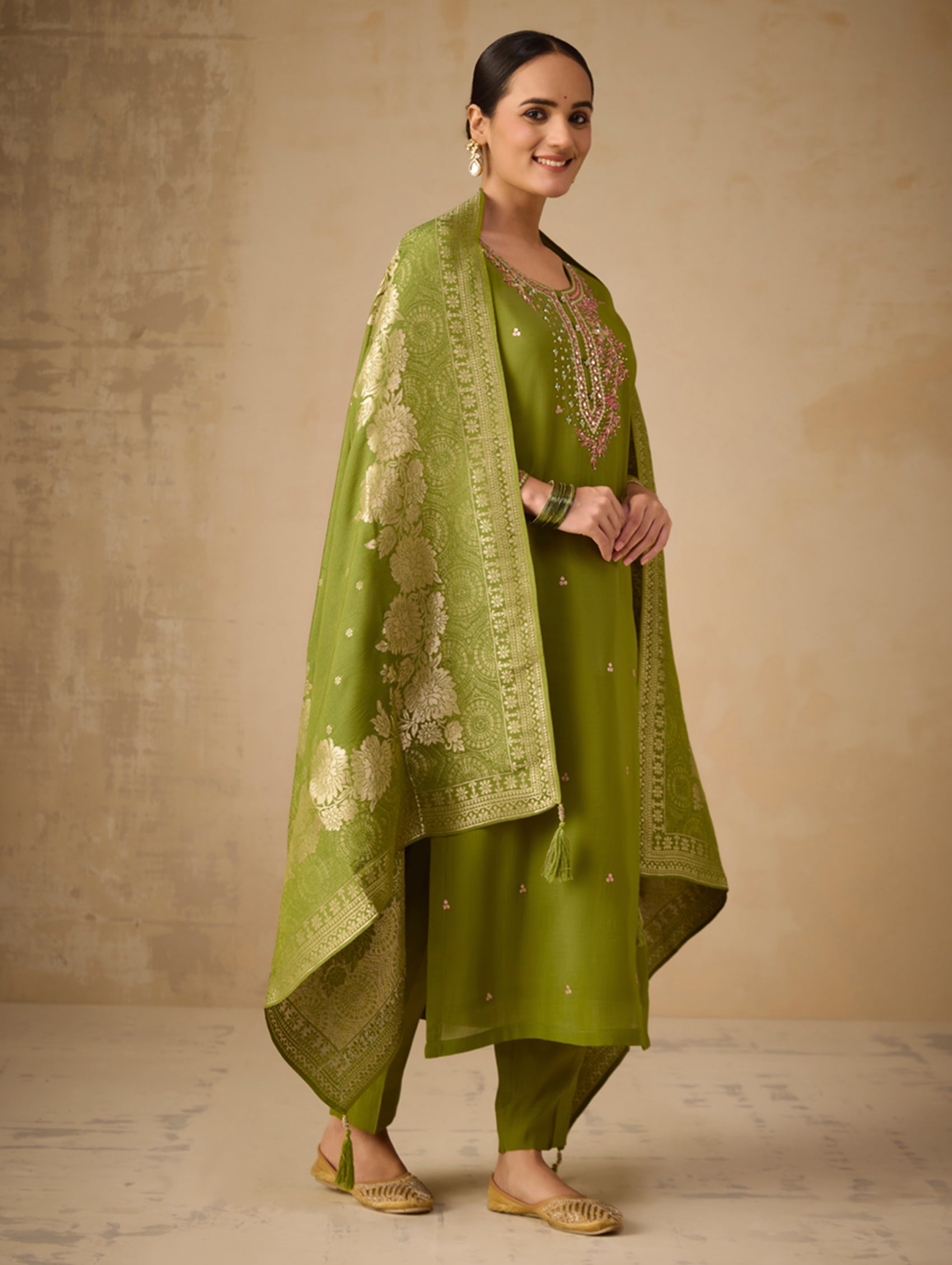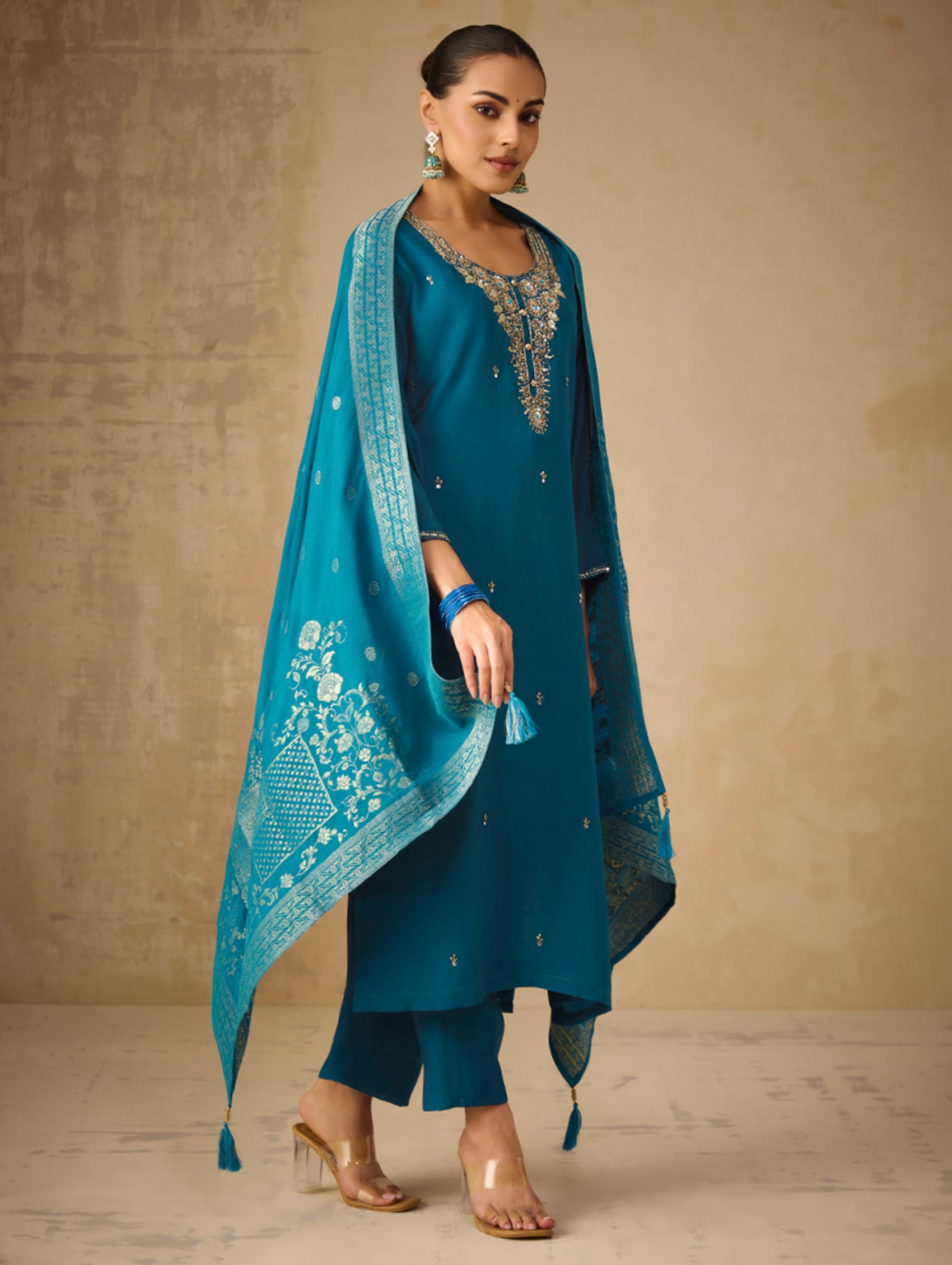 Experience the elegance of this digitally printed jacquard weave silk suit set, highlighted by a beautifully hand-embroidered kurta, traditional pants, and a matching digitally printed jacquard silk dupatta. Perfect for those who value sophisticated fashion, this exquisite ensemble adds a touch of timeless grace to your collection. Don’t miss the chance to own this distinctive and stylish outfit—shop now!