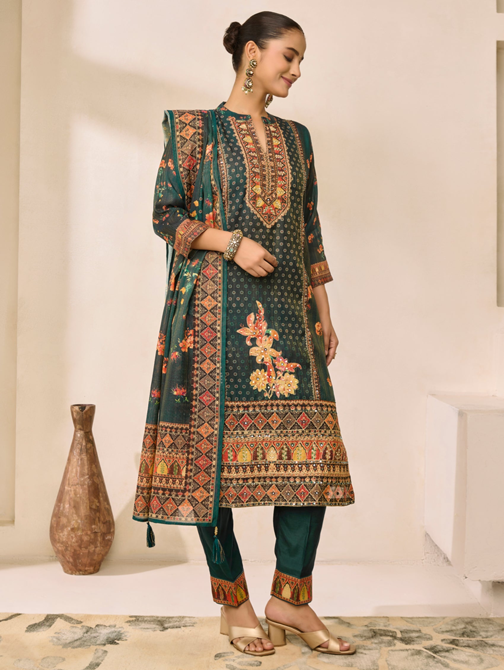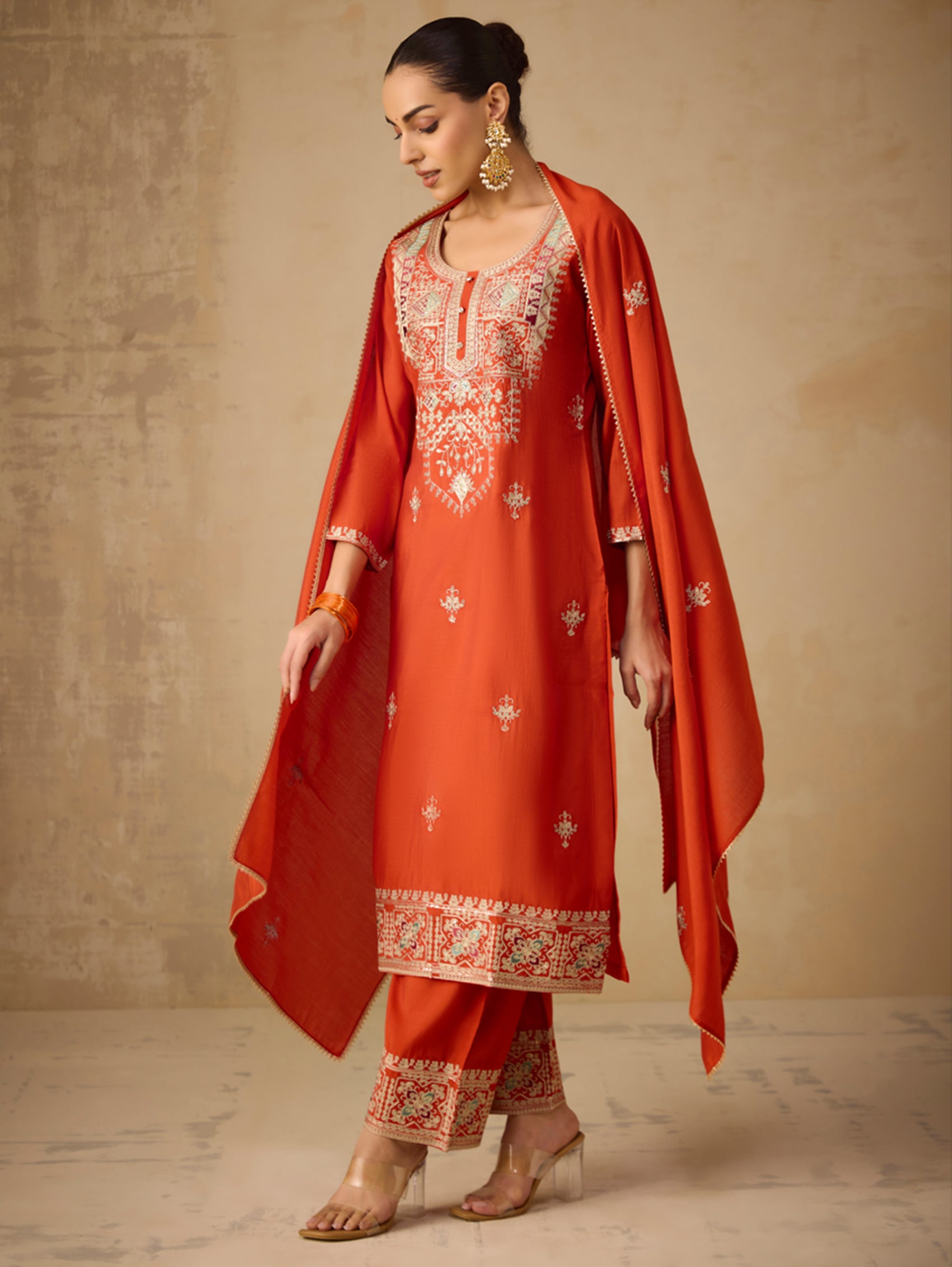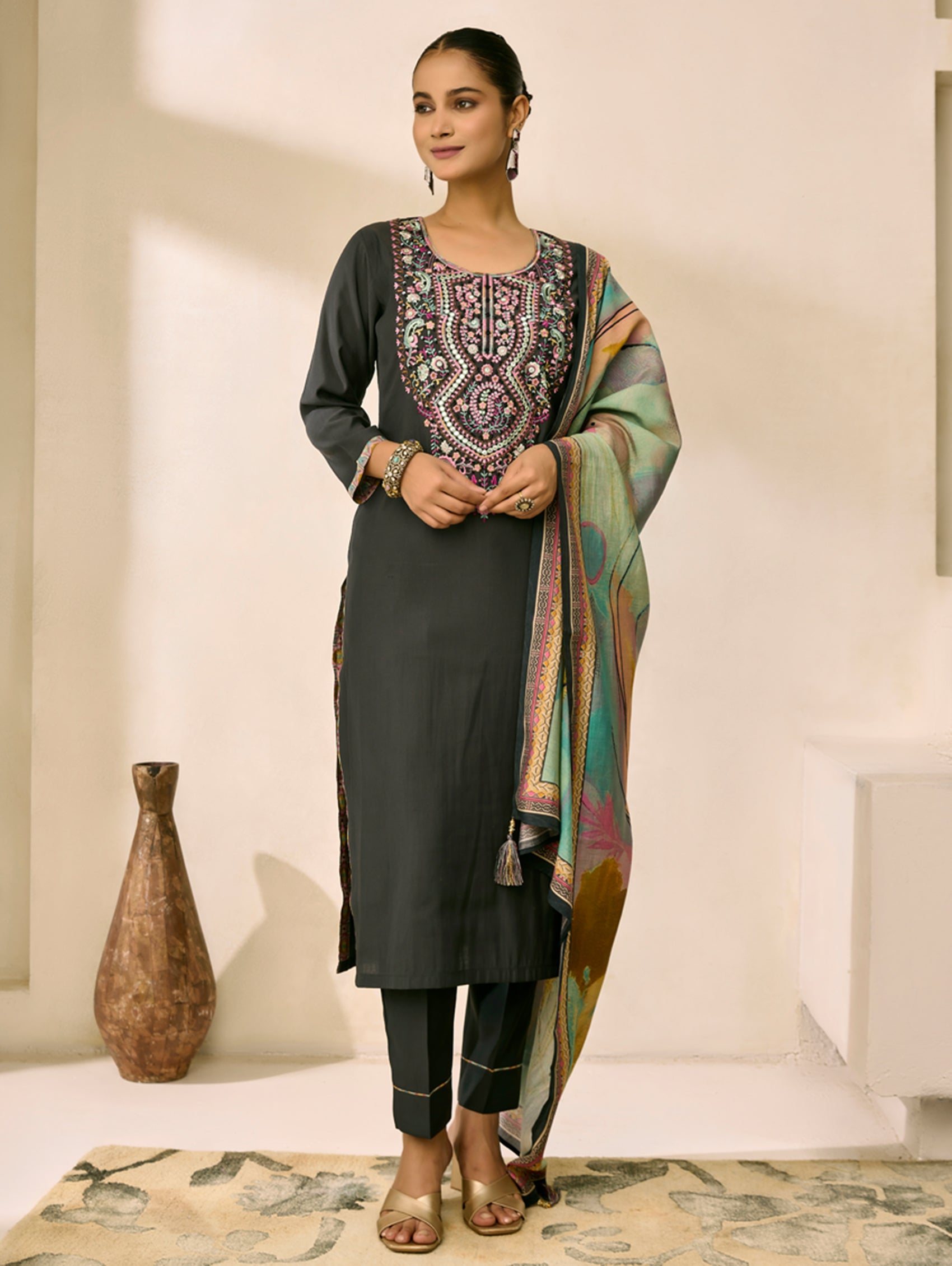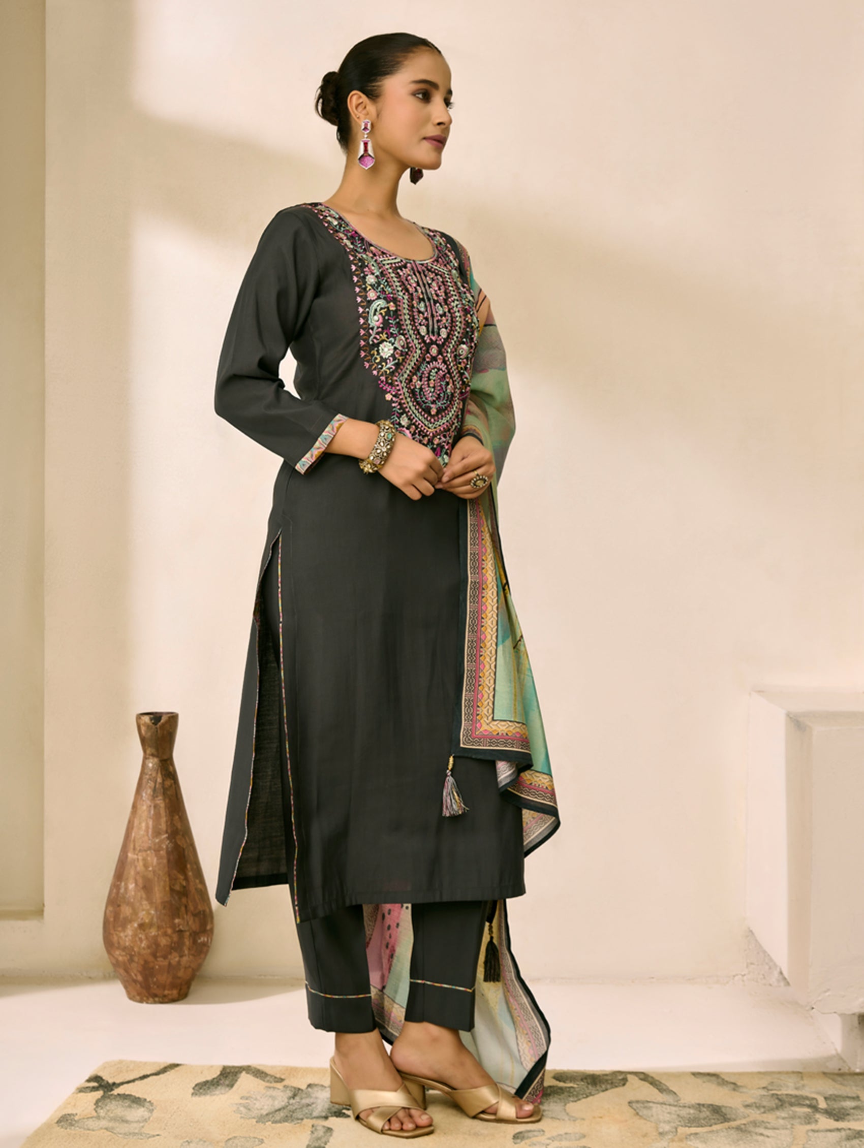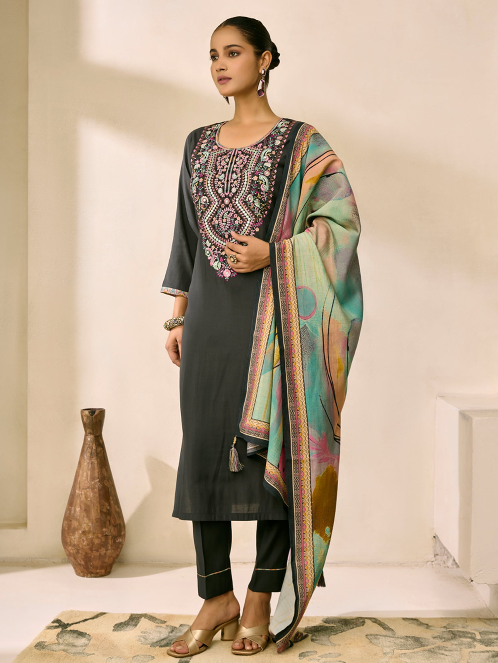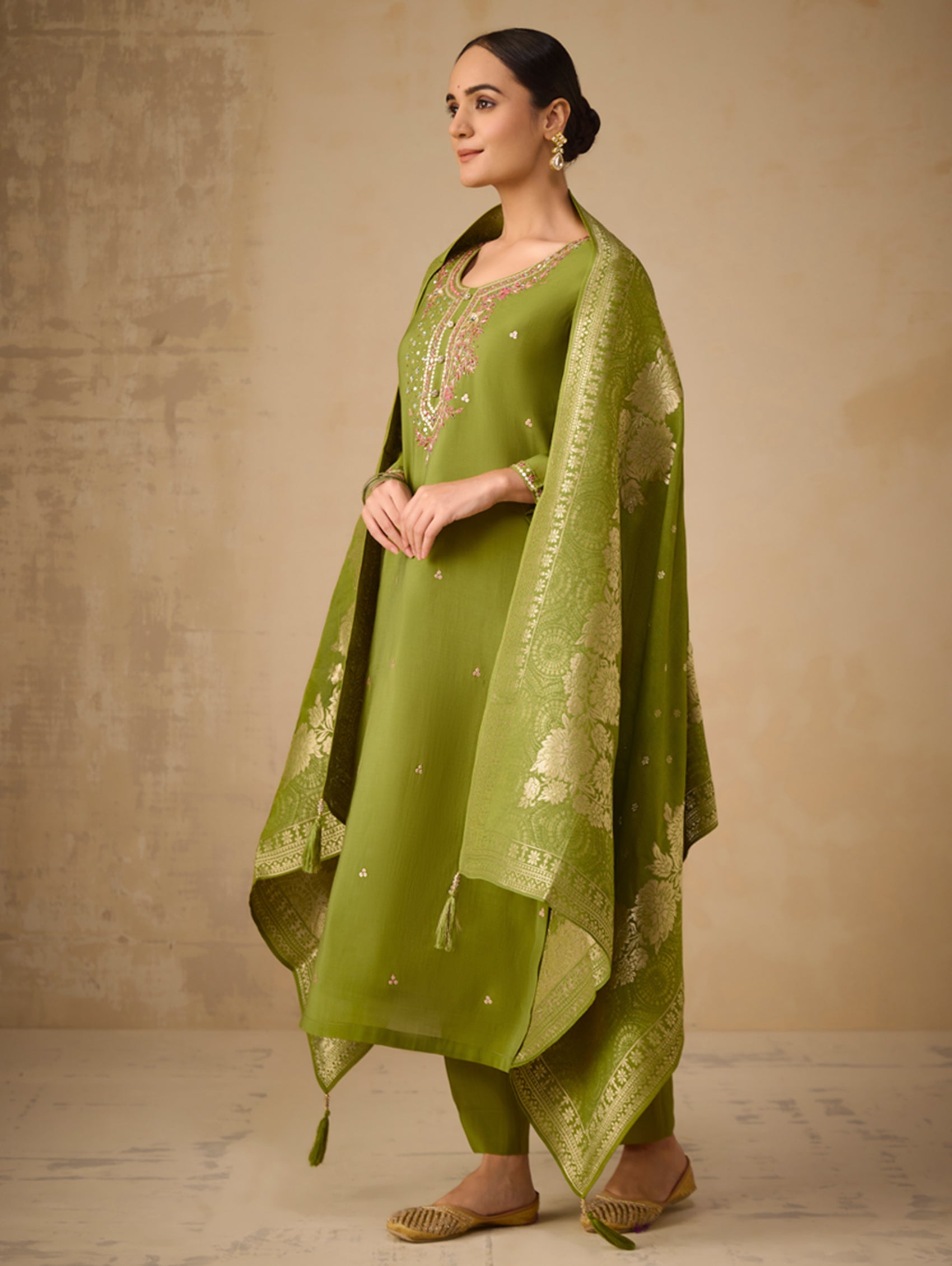 Experience the elegance of this digitally printed jacquard weave silk suit set, highlighted by a beautifully hand-embroidered kurta, traditional pants, and a matching digitally printed jacquard silk dupatta. Perfect for those who value sophisticated fashion, this exquisite ensemble adds a touch of timeless grace to your collection. Don’t miss the chance to own this distinctive and stylish outfit—shop now!
