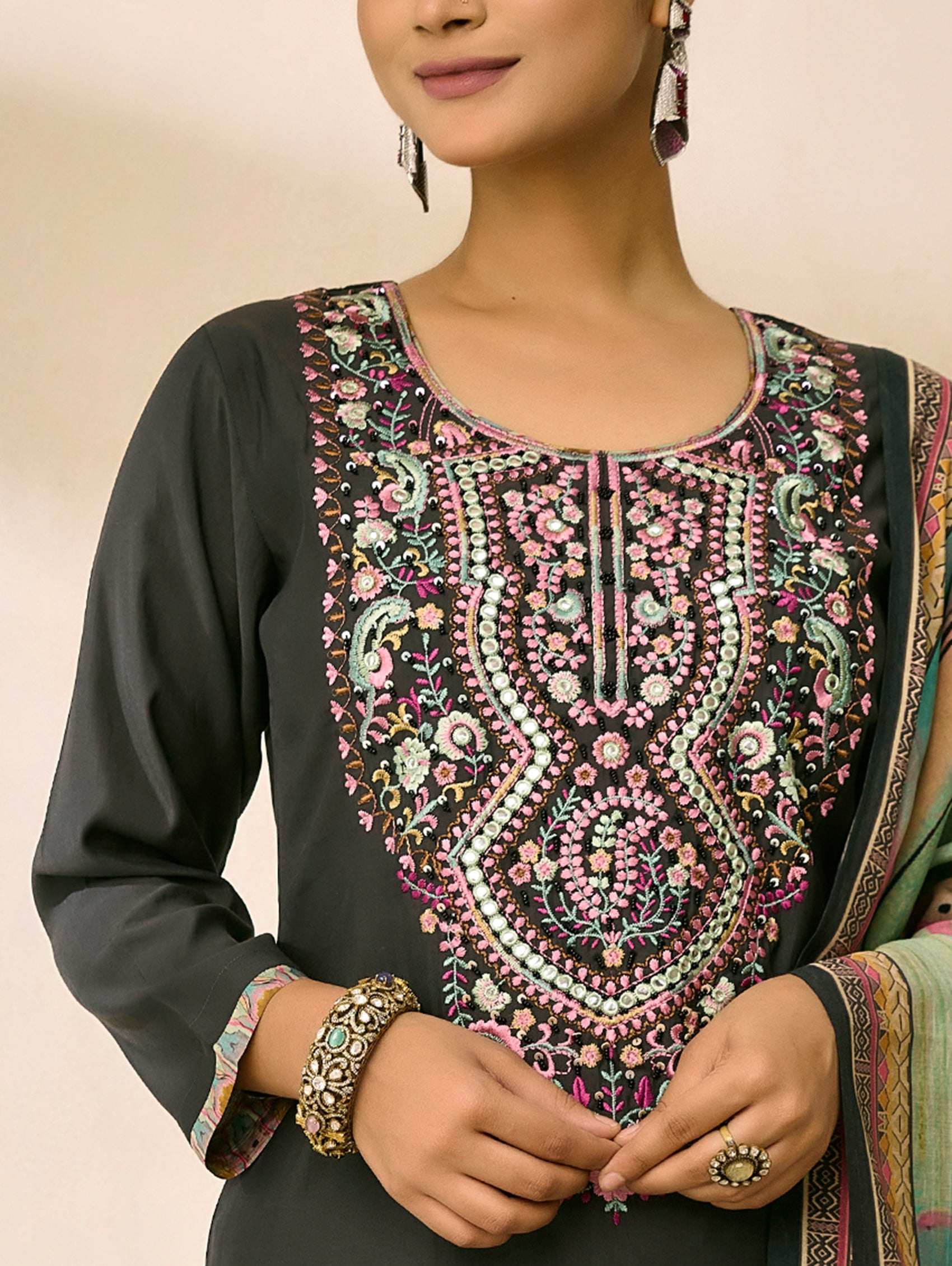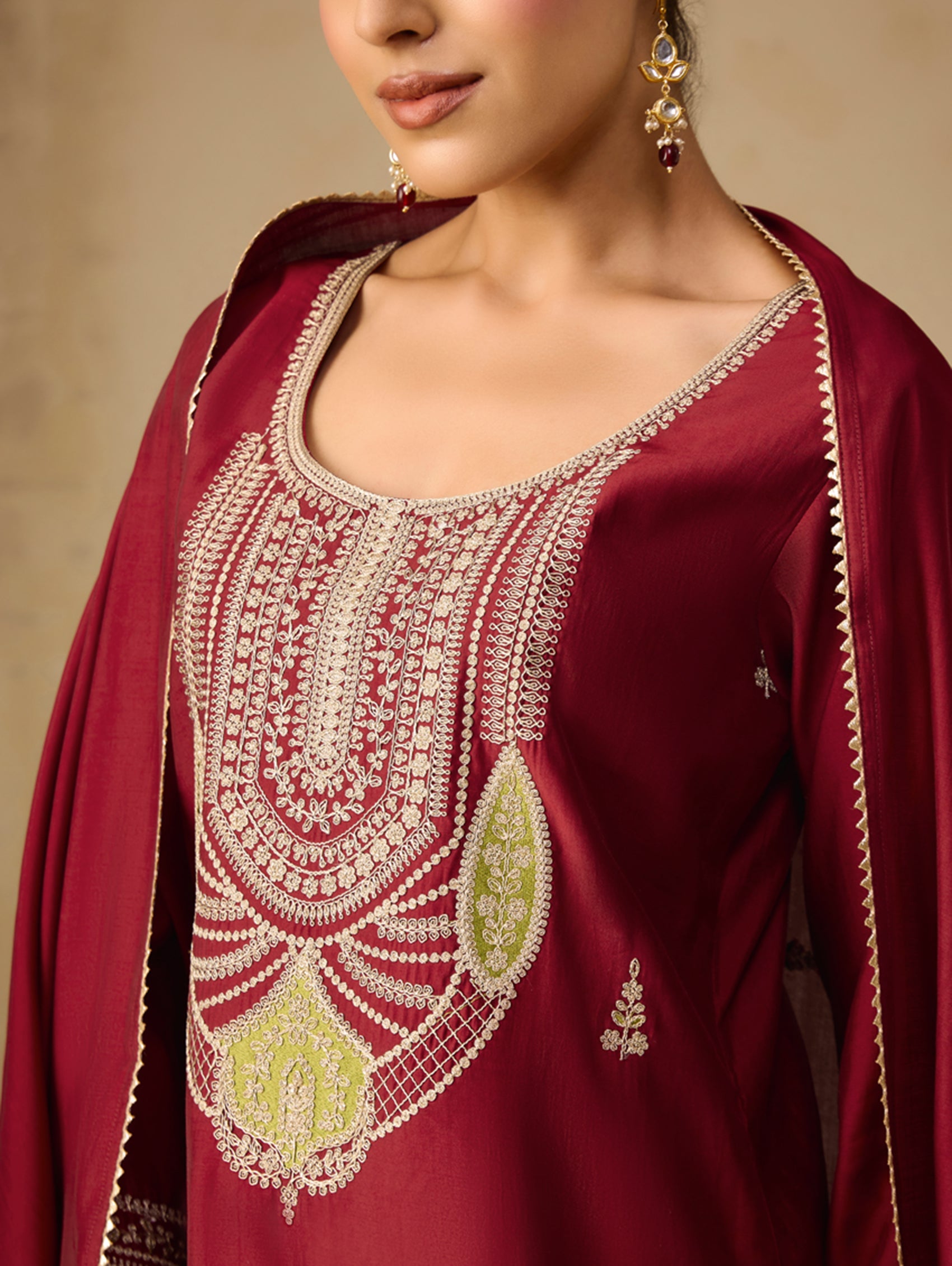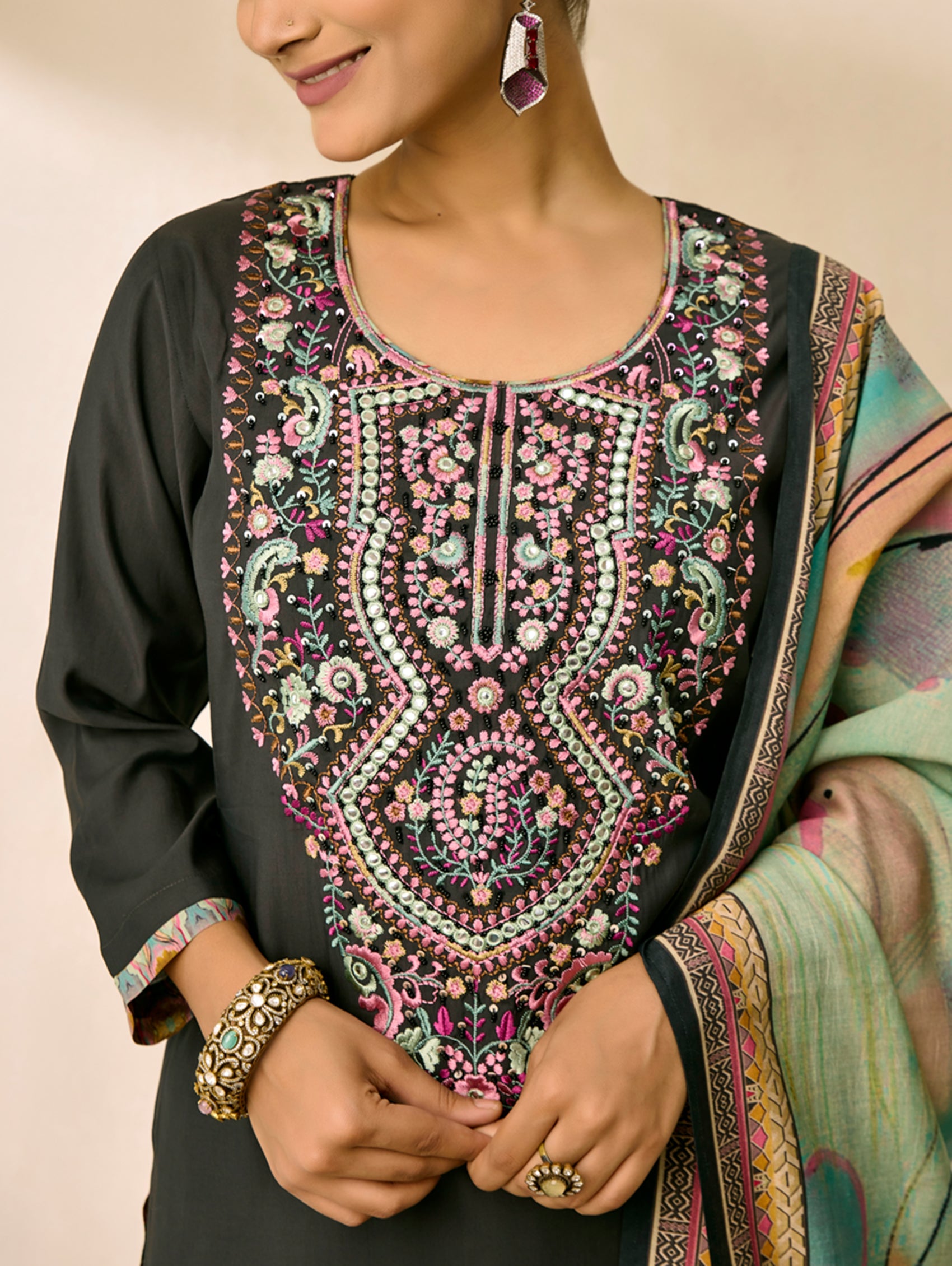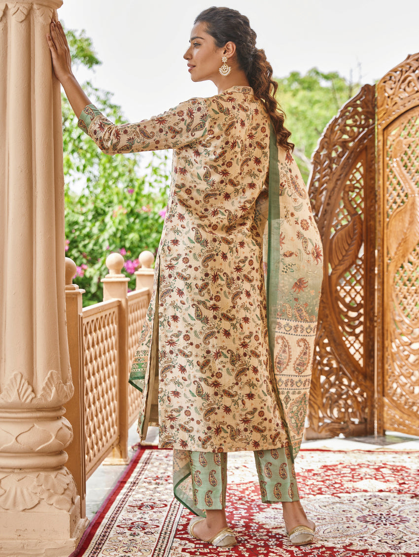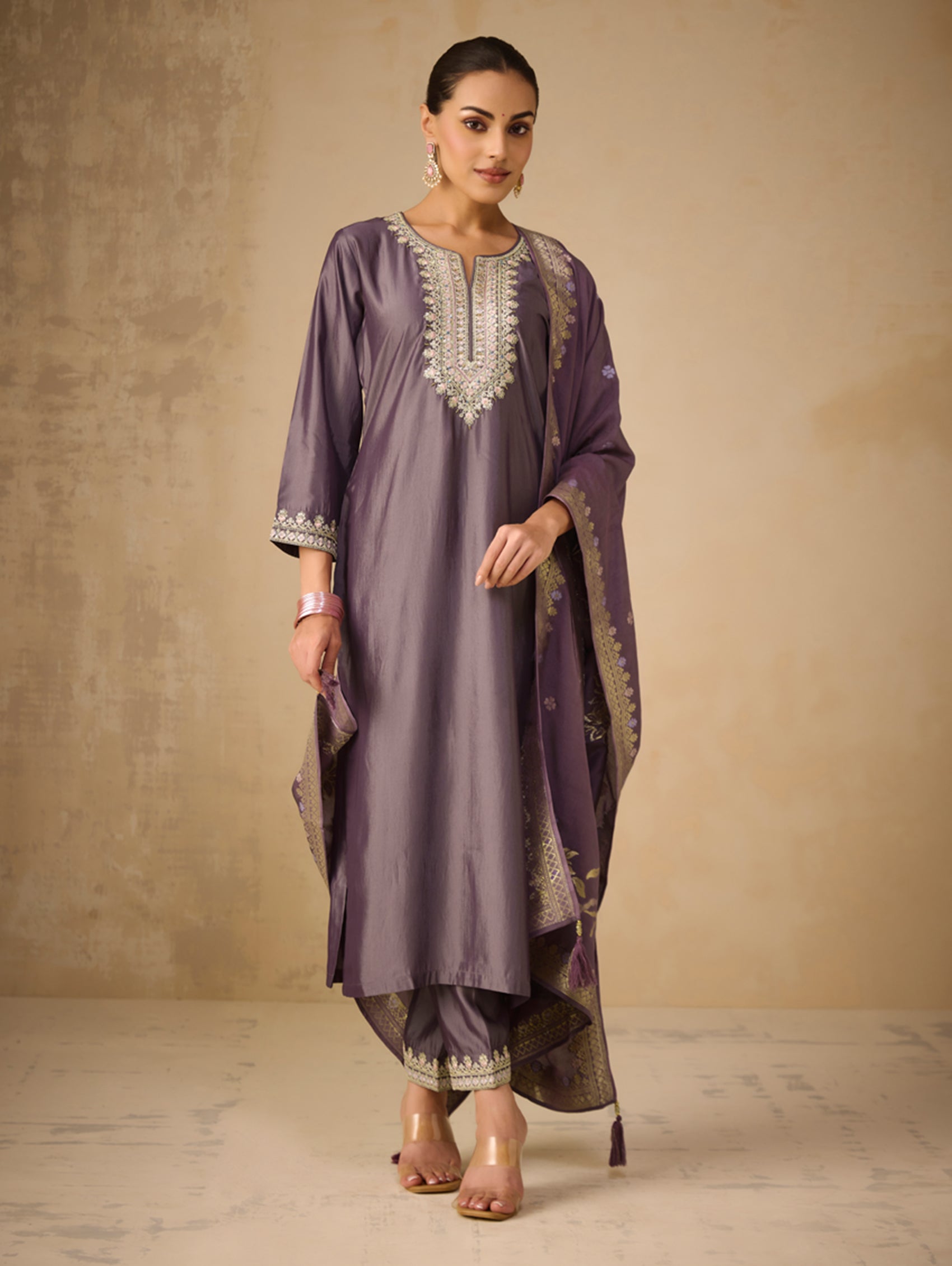 Experience the elegance of this digitally printed jacquard weave silk suit set, highlighted by a beautifully hand-embroidered kurta, traditional pants, and a matching digitally printed jacquard silk dupatta. Perfect for those who value sophisticated fashion, this exquisite ensemble adds a touch of timeless grace to your collection. Don’t miss the chance to own this distinctive and stylish outfit—shop now!