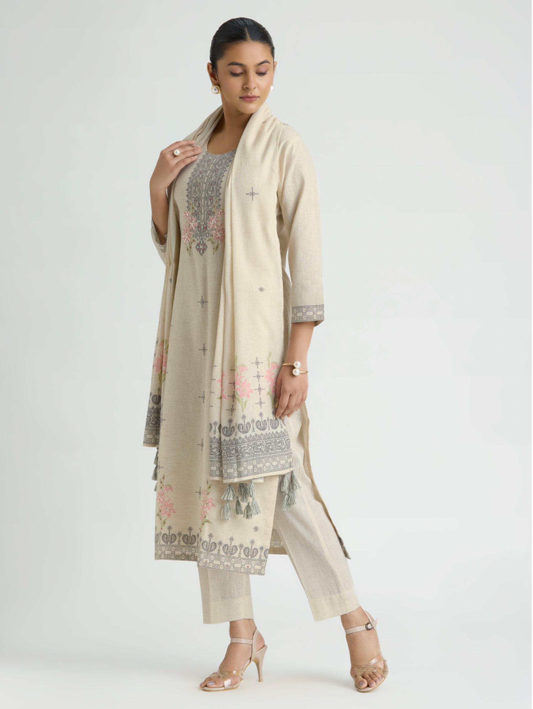 Elevate your ethnic wardrobe with this stunning digitally printed cotton linen flex suit set with dupatta. The intricately designed kurta showcases sophisticated hand embroidery that catches every eye, while the coordinating pants offer comfortable everyday wear. Complete the look with the matching digitally printed dupatta that ties the entire set together seamlessly. Perfect for everyday wear, gatherings, or whenever you want to radiate confidence and grace, this versatile collection lets you express your personal style with effortless elegance and timeless appeal.